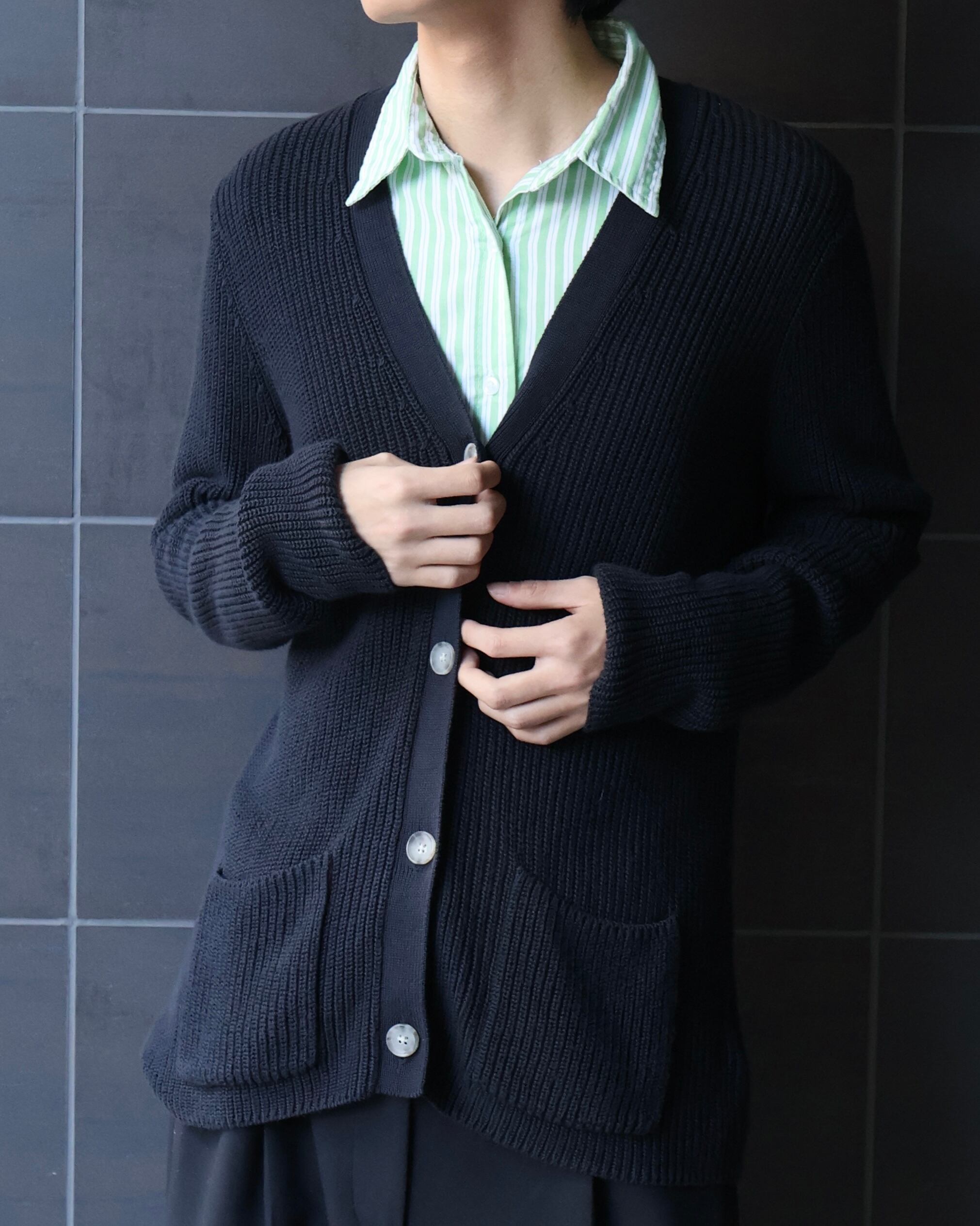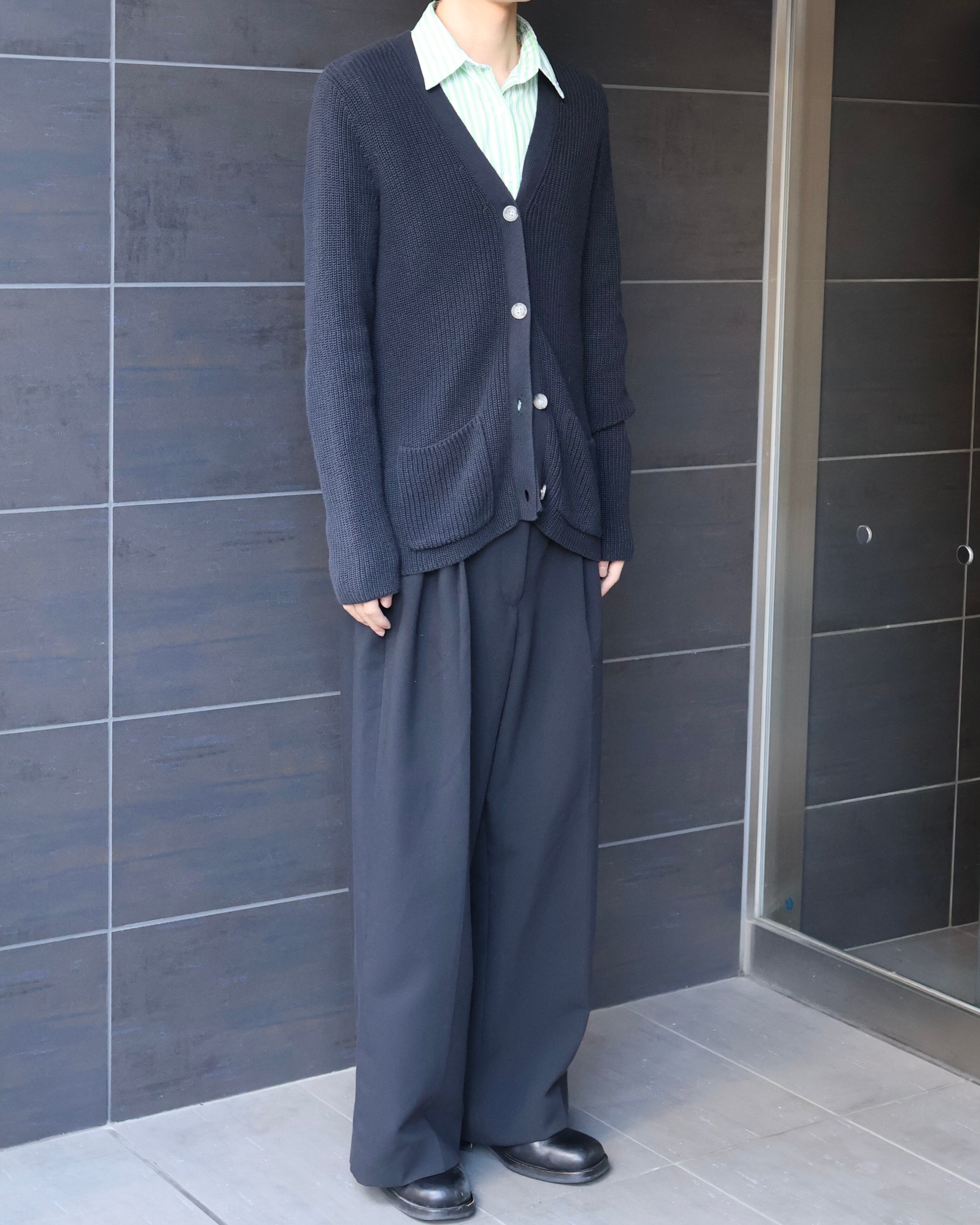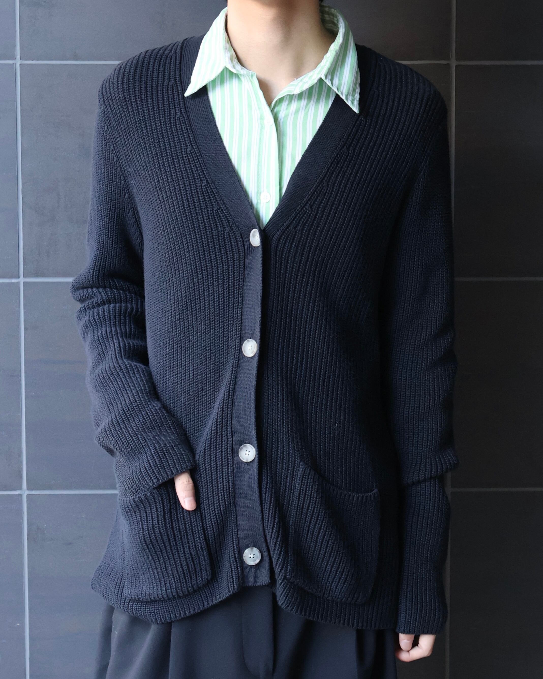 無駄のないシルエットと大ぶりなボタンがクラシックな印象を与えつつ、リラックス感のある着心地に仕上げられています。柔らかな素材感がつくる自然な落ち感が魅力で、シャツとのレイヤードにも最適なアイテム。