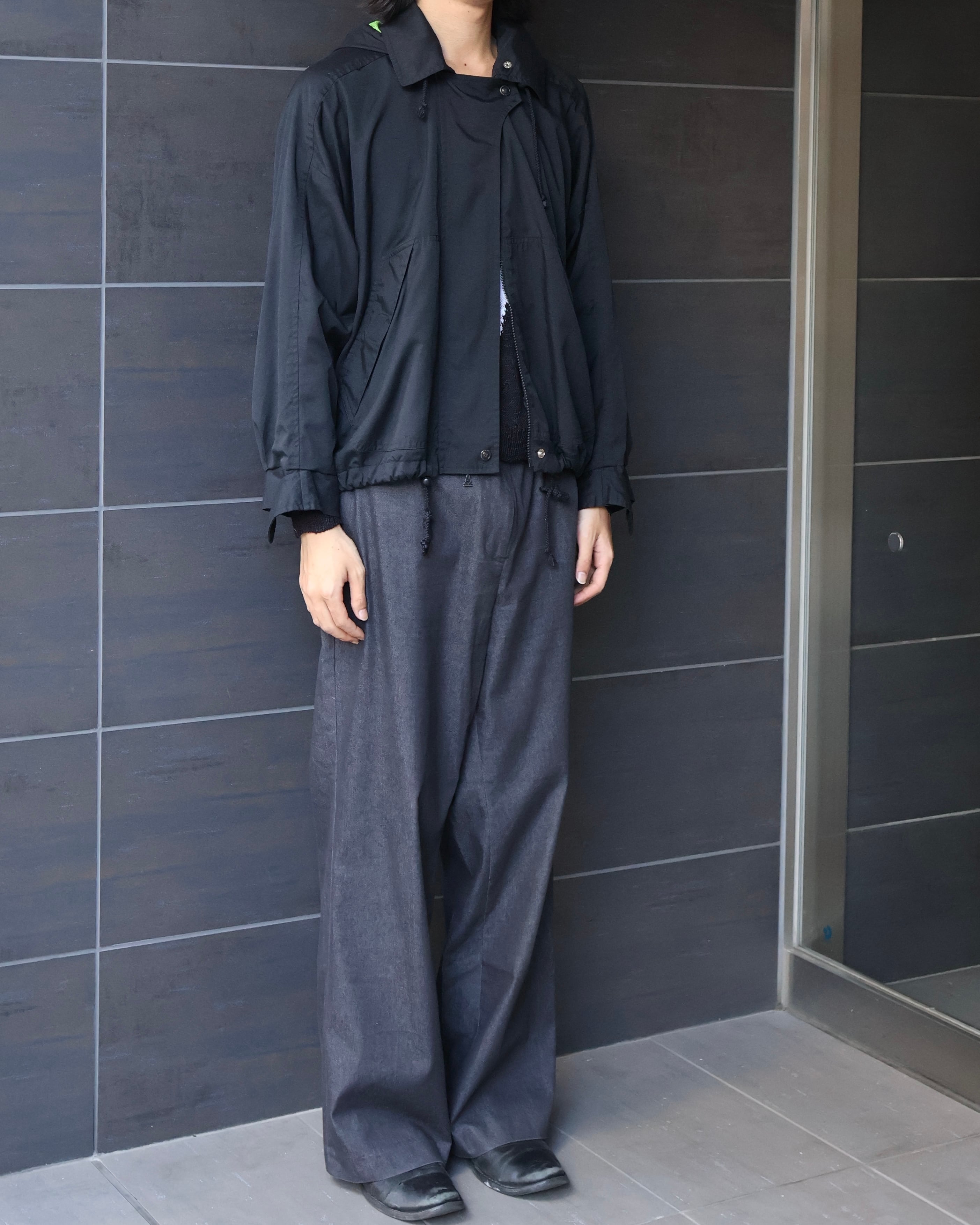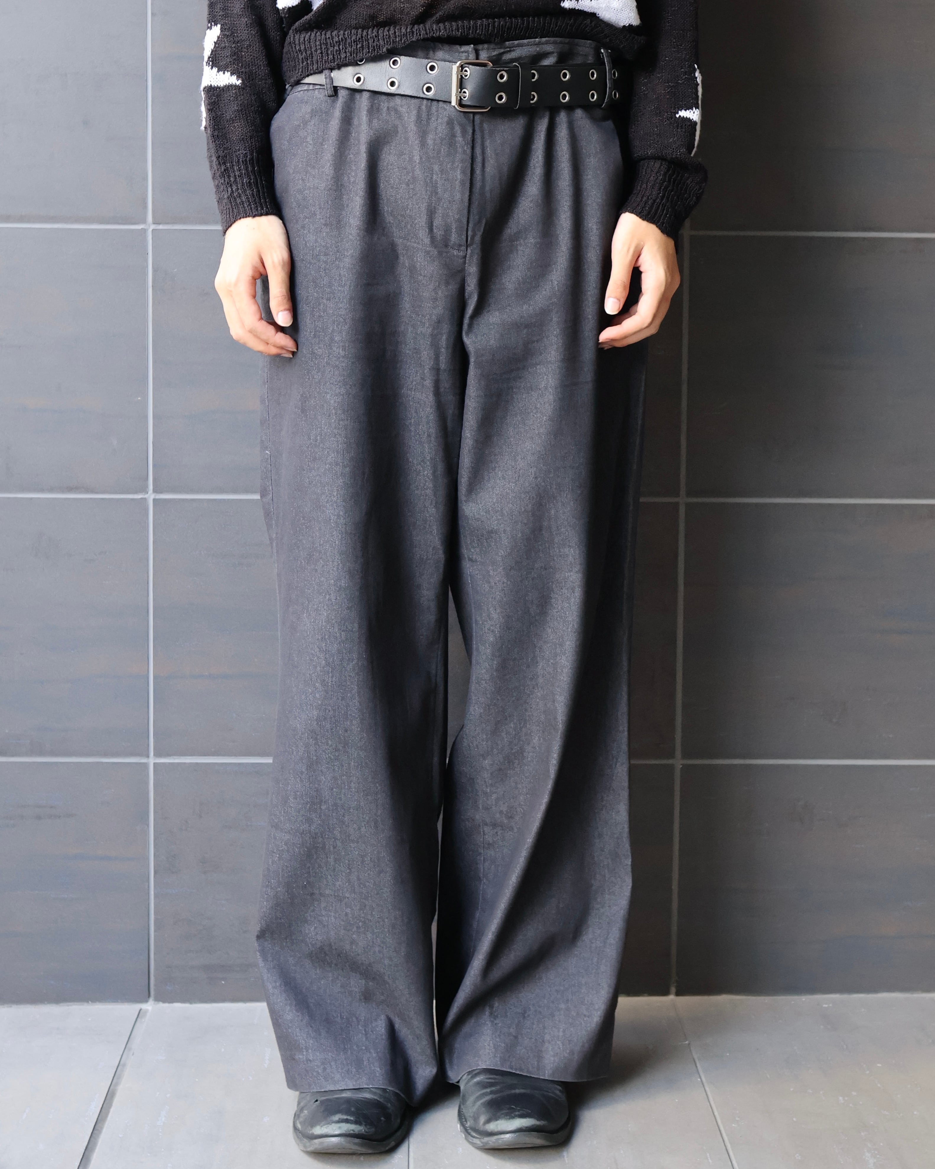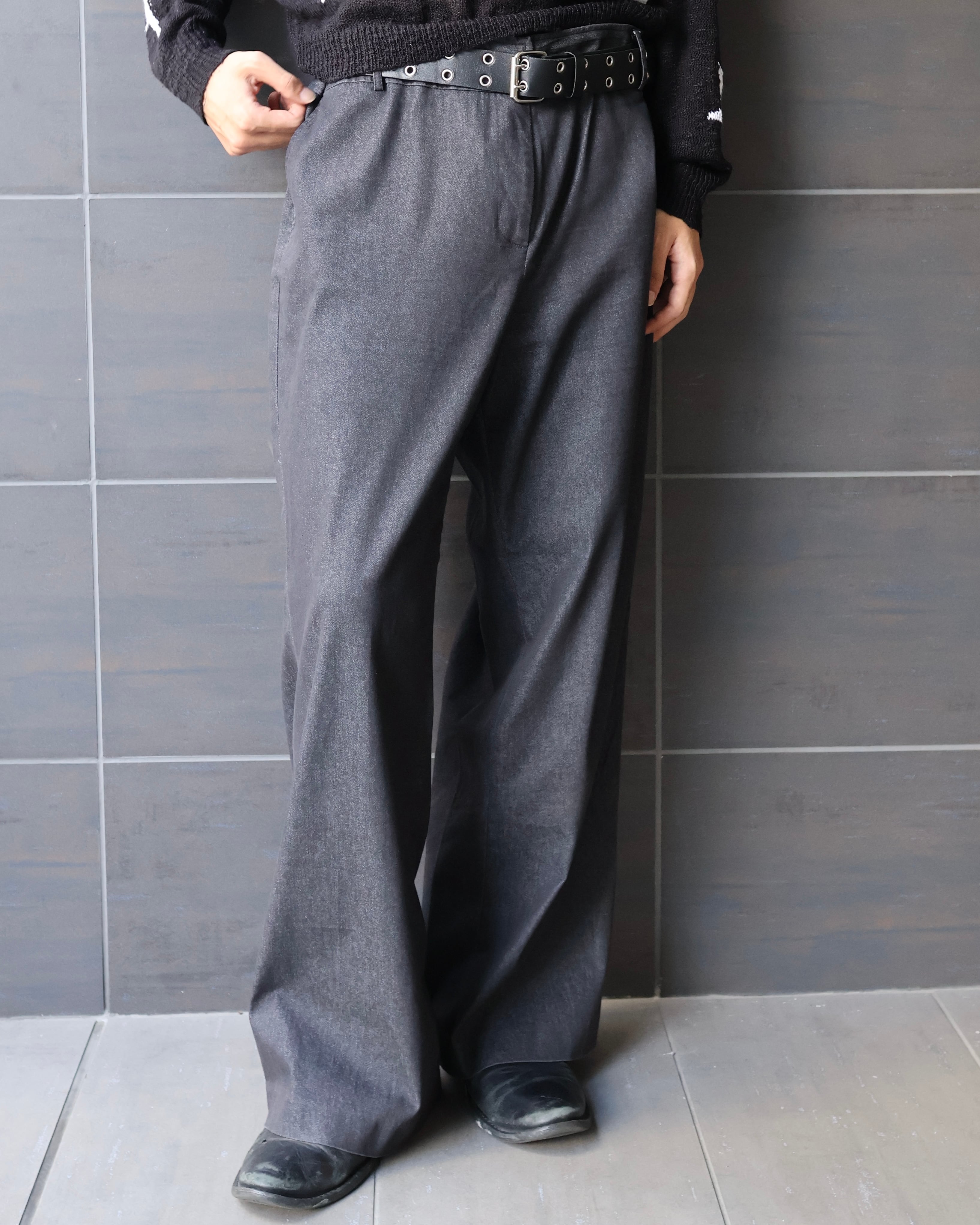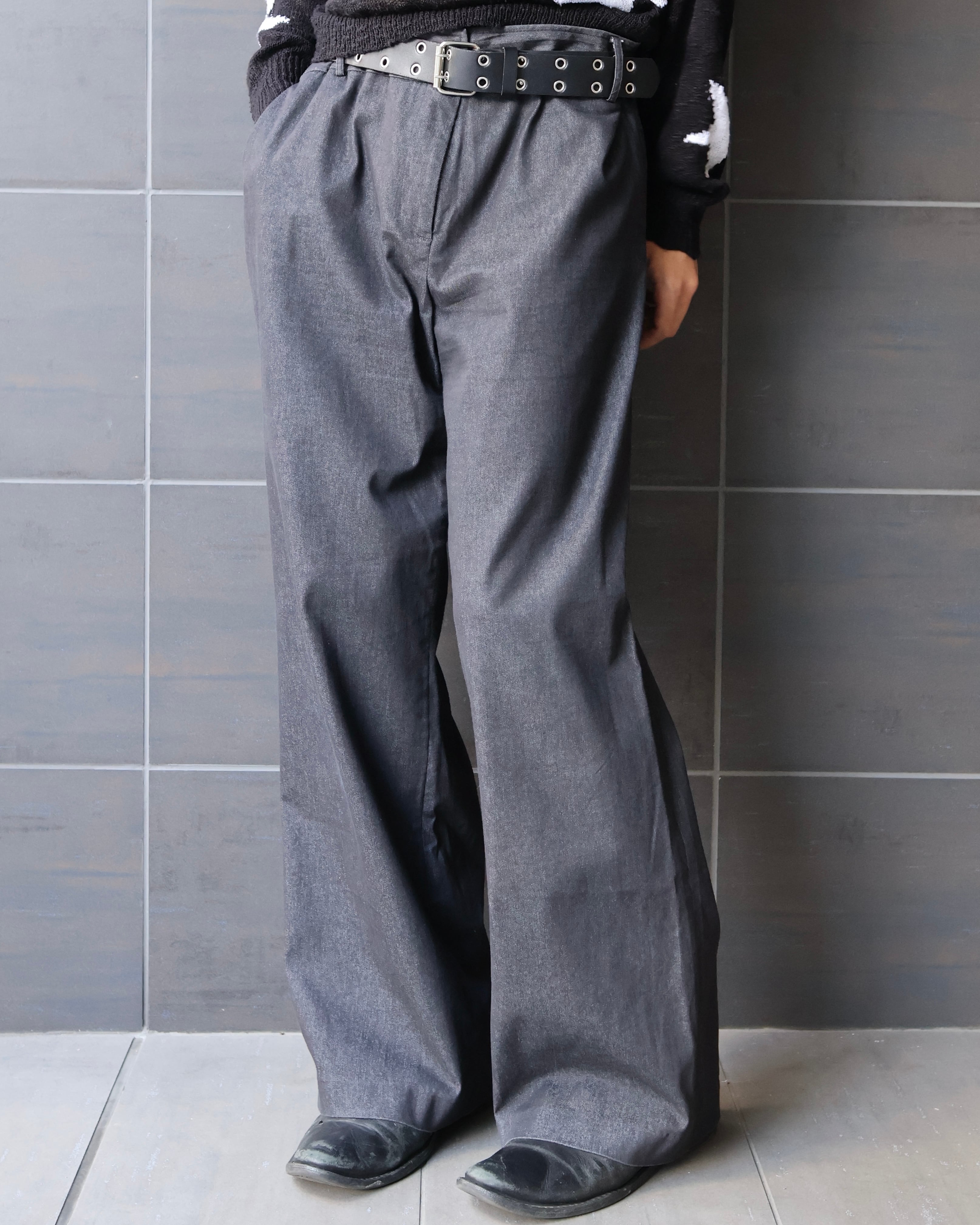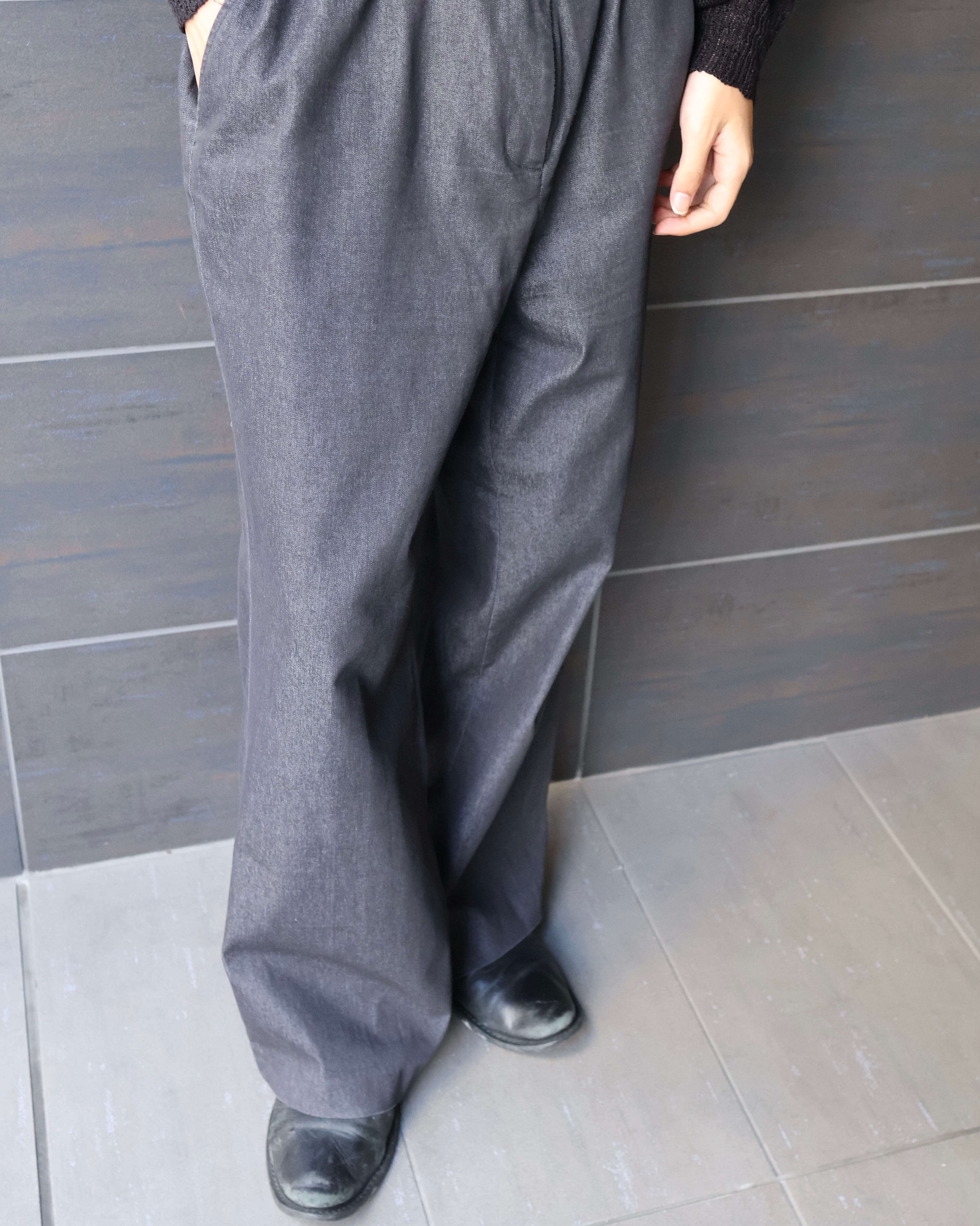 程よく光沢を抑えたチャコールグレーのワイドスラックス