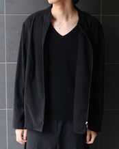 深いブラックの色味が、素材の質感と直線的なシルエットを際立たせている1着。インナー次第でモードにもカジュアルにも振れる、万能なアイテム。