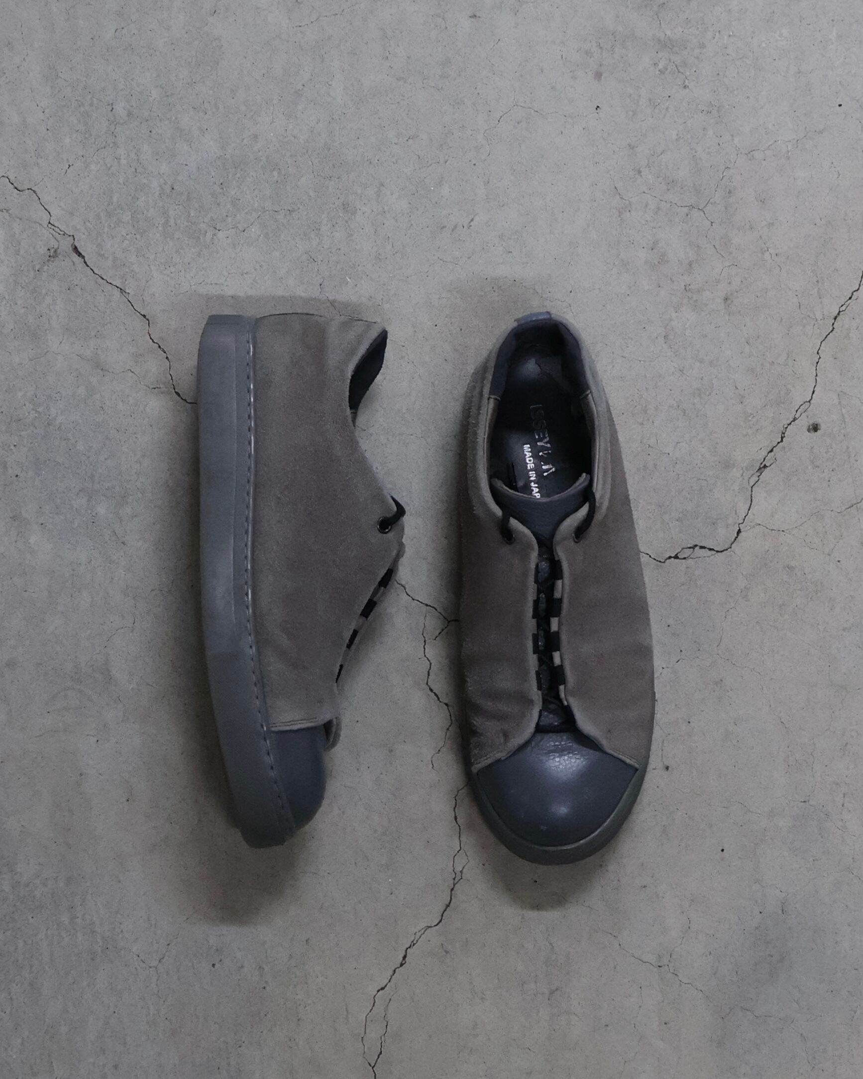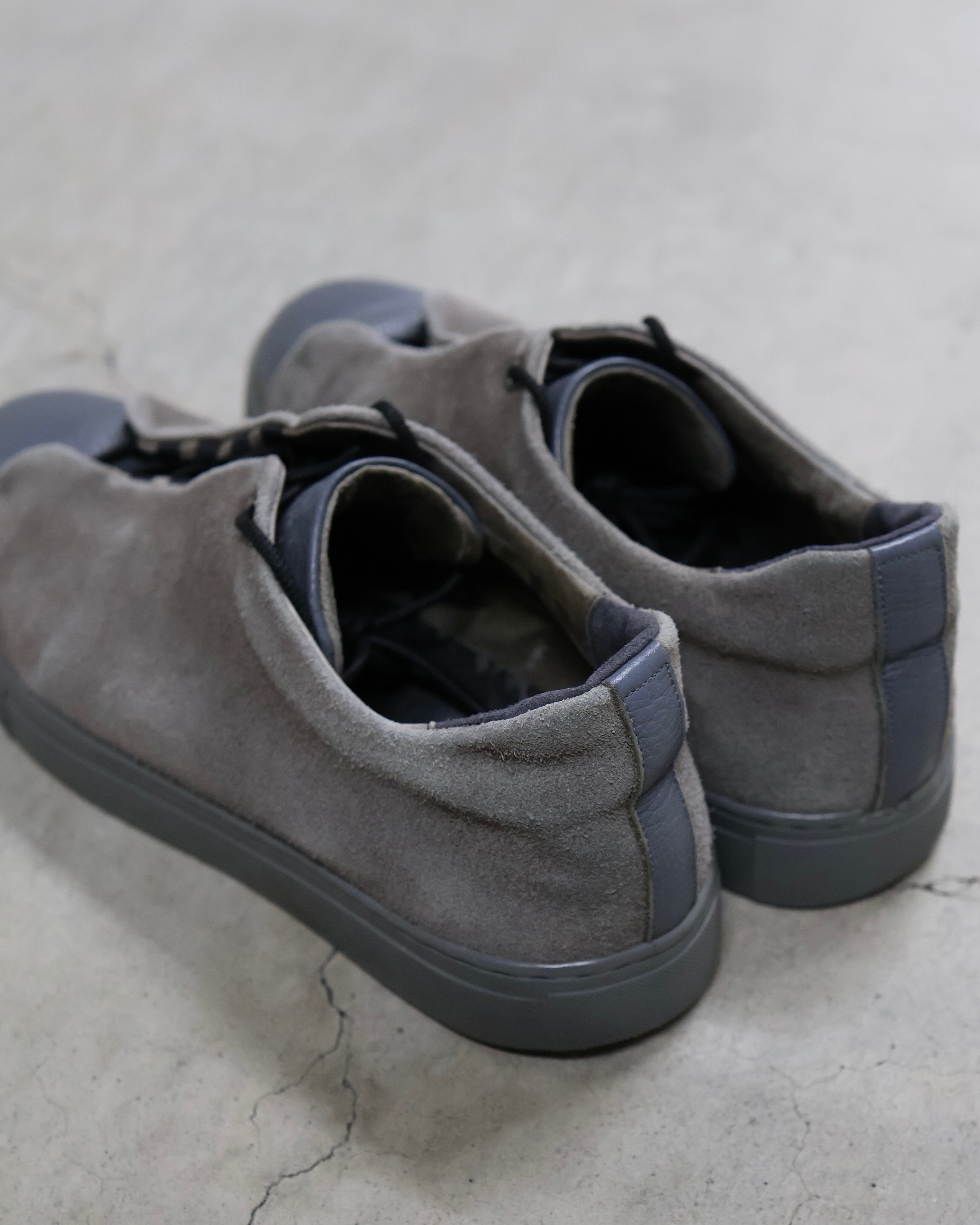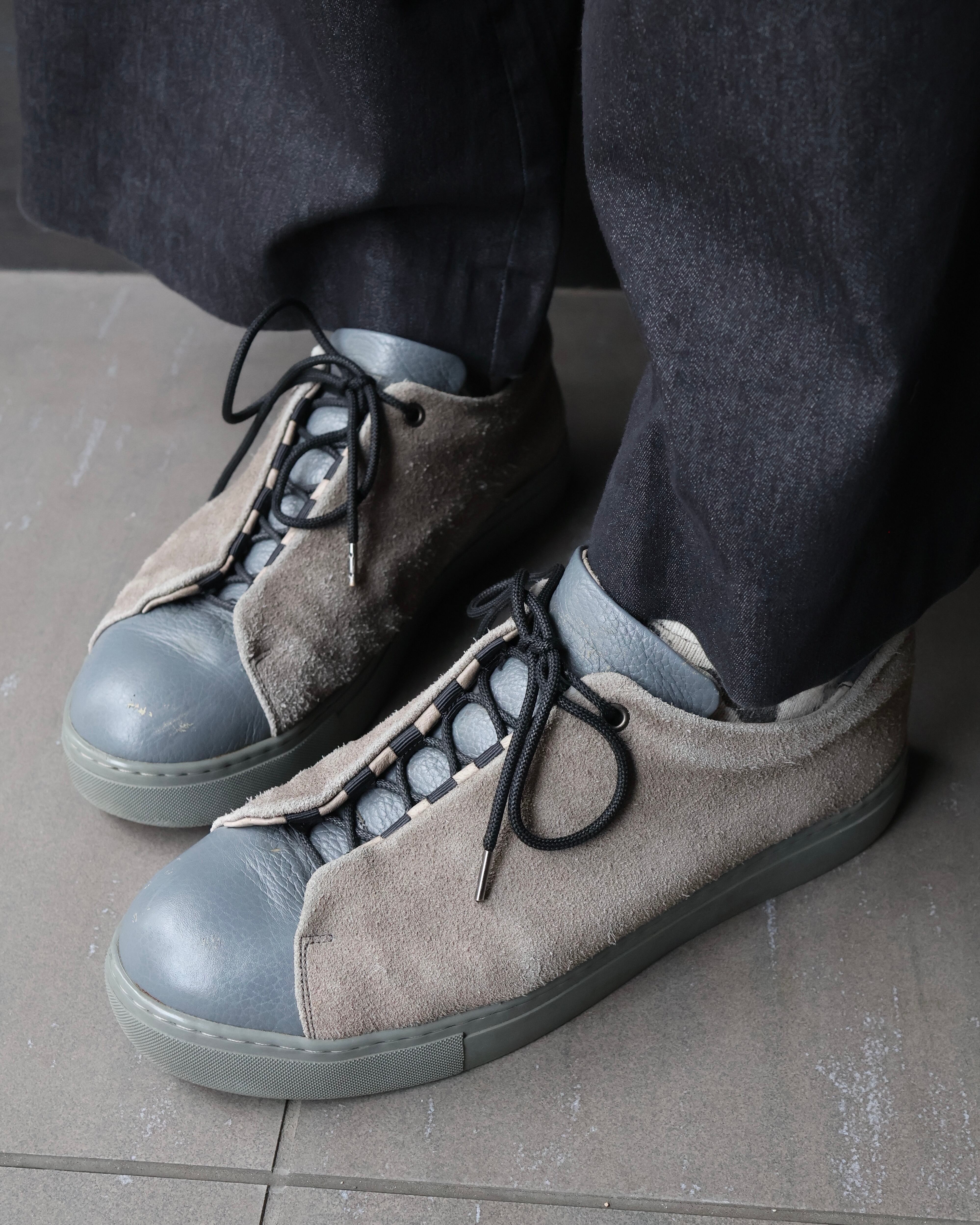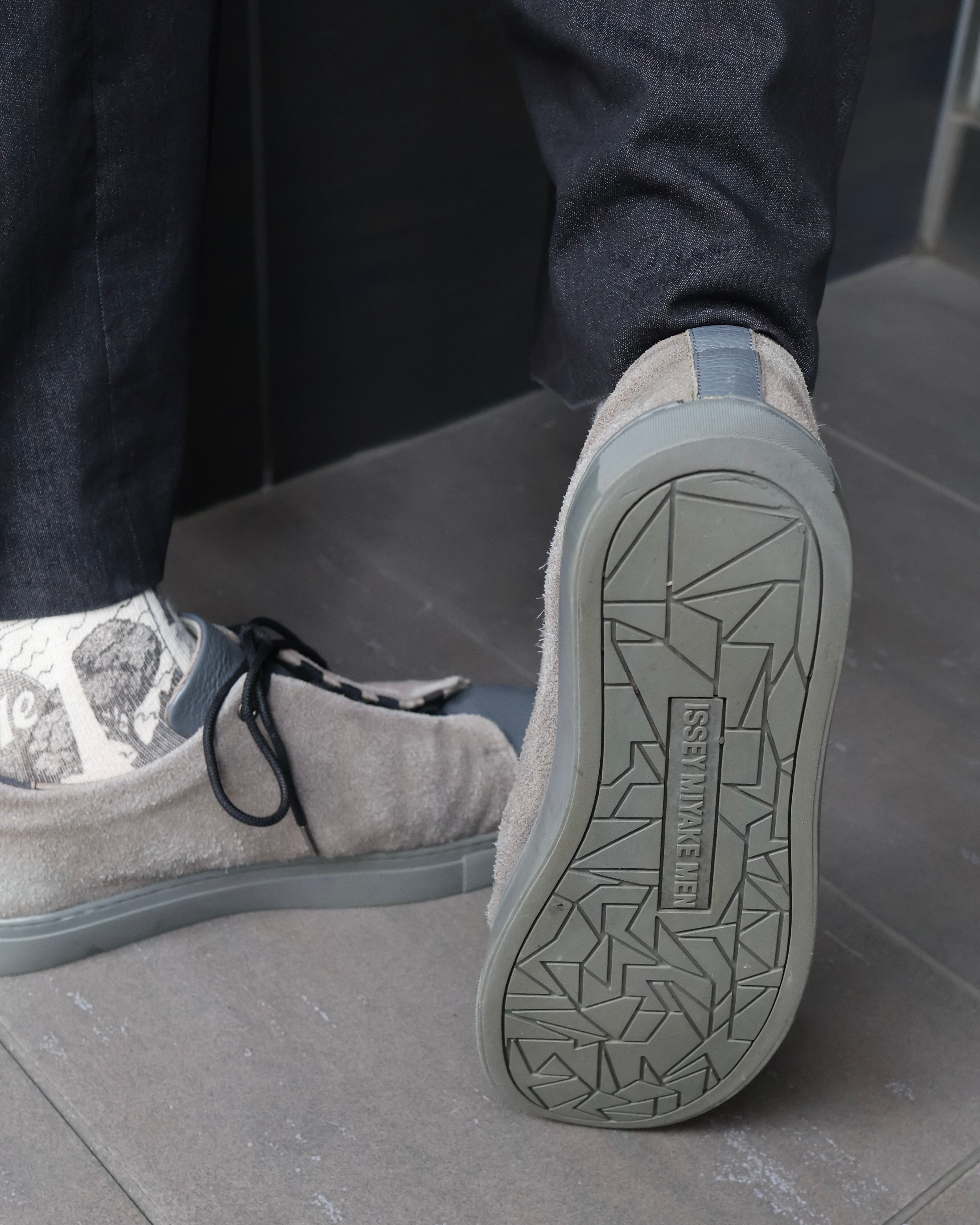 落ち着いたグレートーンのコントラストが奥行きを生み、素材の表情を引き立てるデザイン。アッパーの素材切り替えと、ソールまで統一されたカラーリングがモードな印象を強調。アートピースのような造形美と、実用性を両立したISSEY MIYAKEらしい一足。
