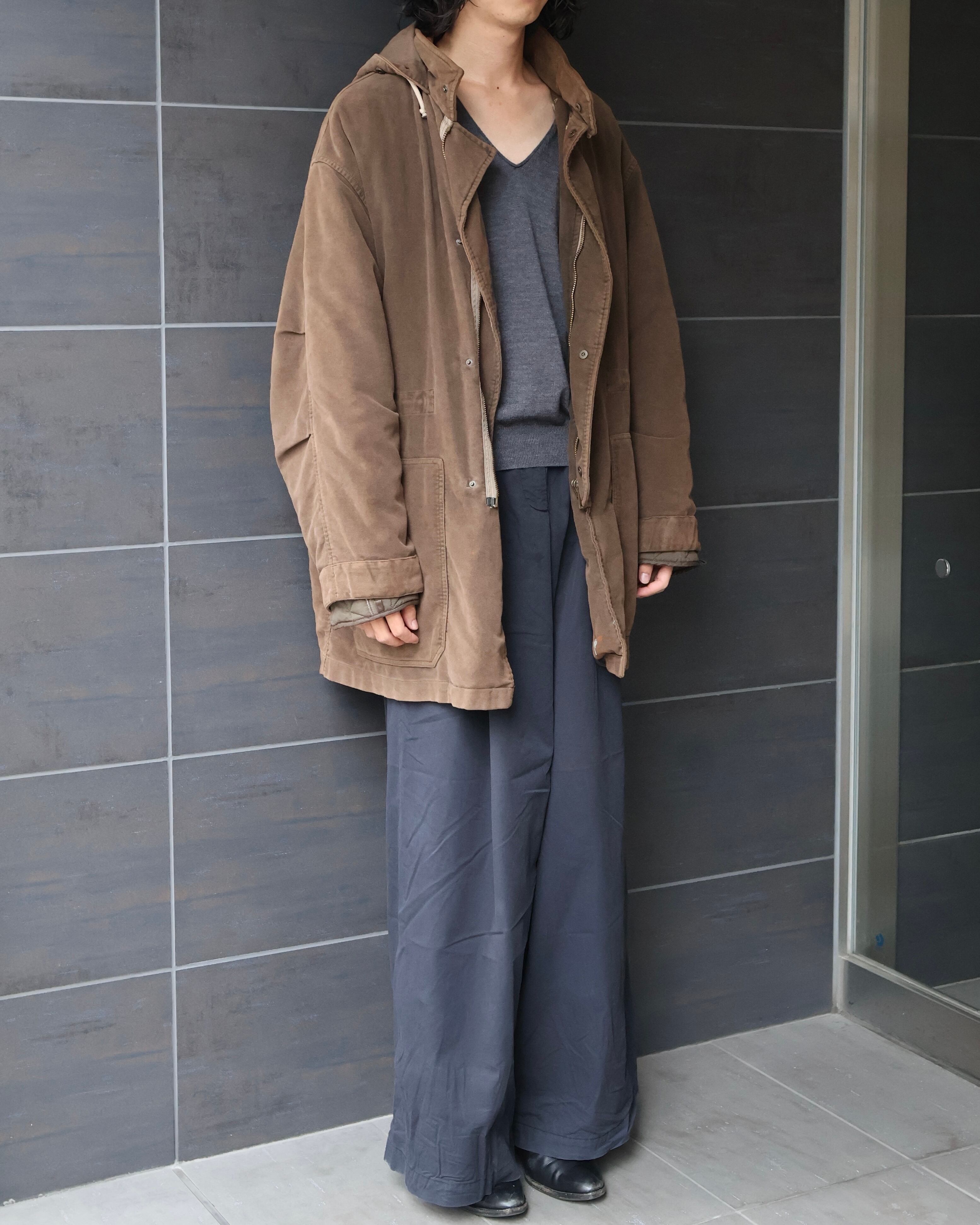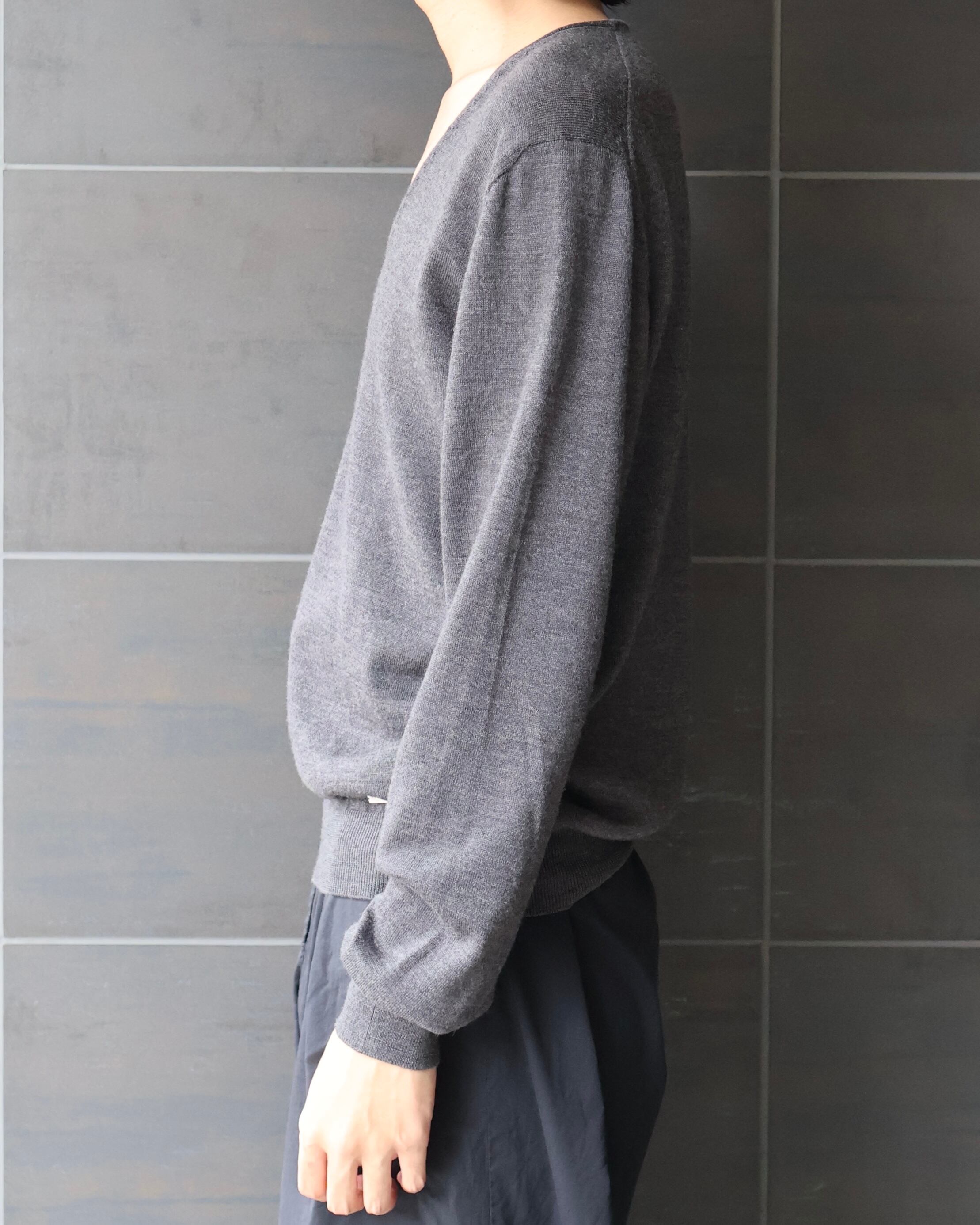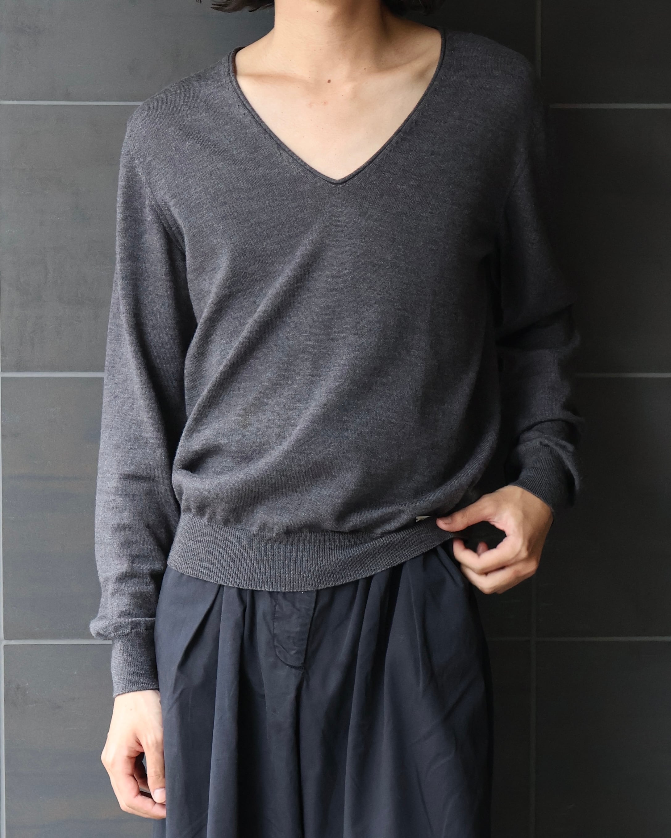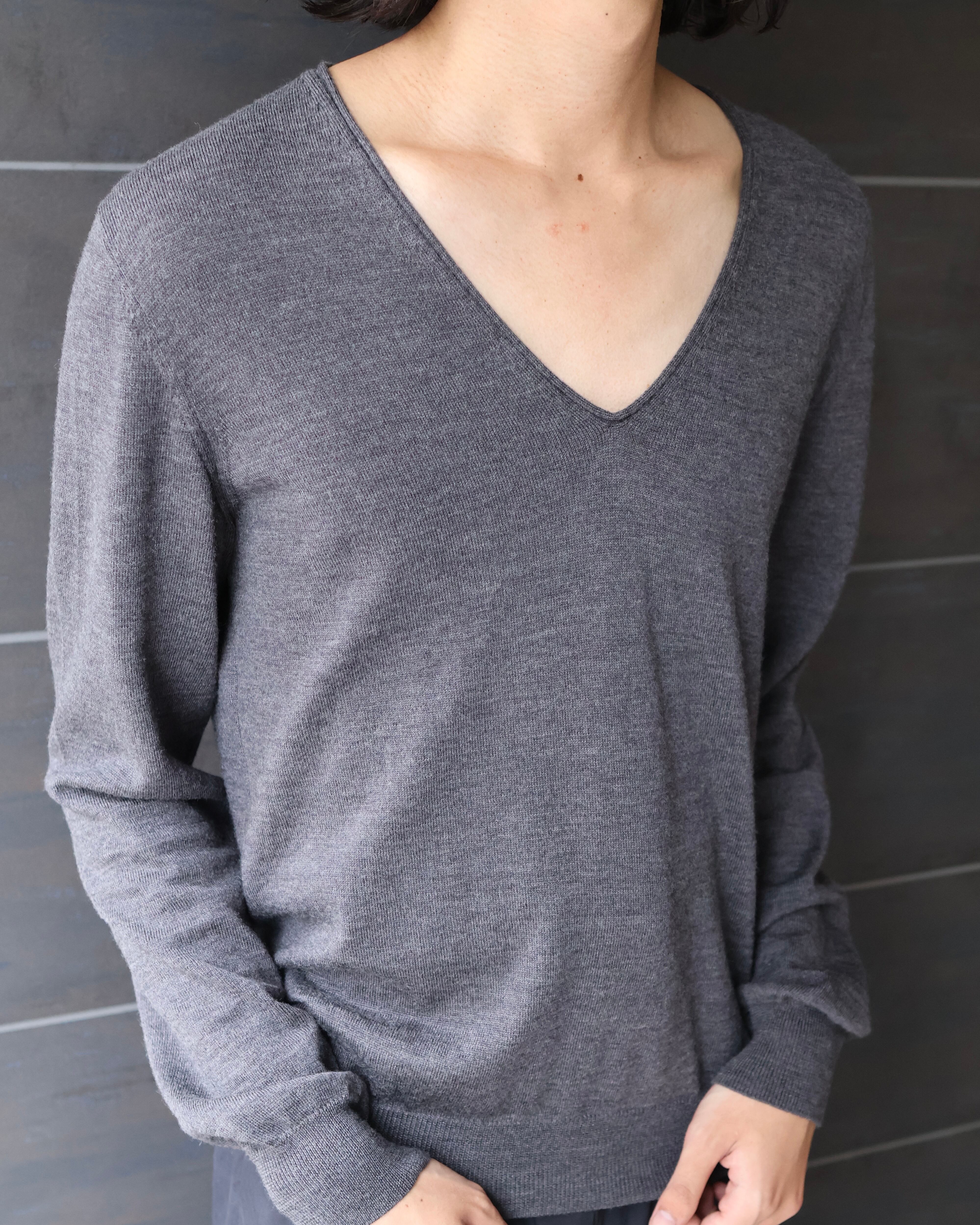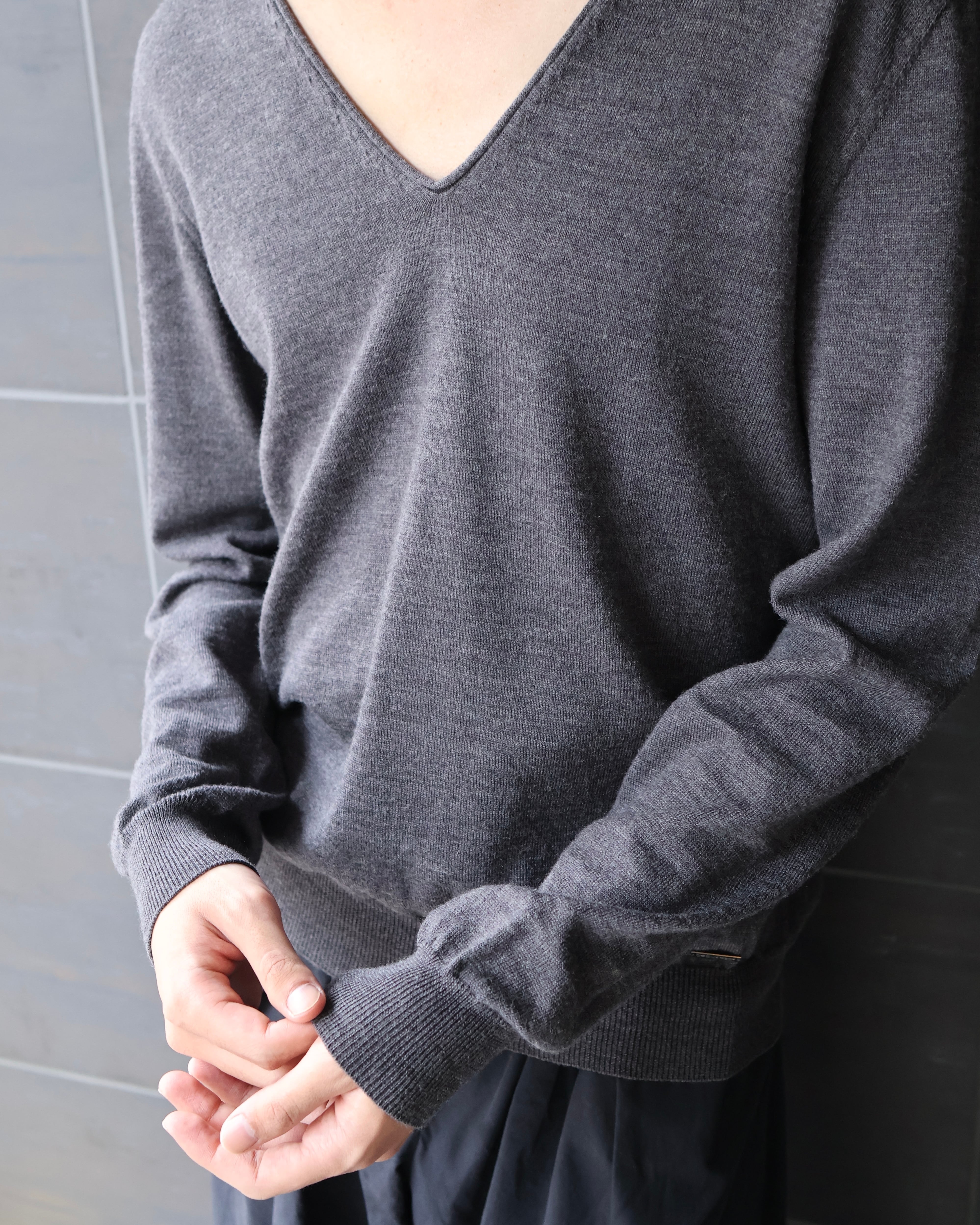 程よい光沢と滑らかな肌触りが特徴で、薄手ながら保温性もあるアイテム。深めのVラインが首元を美しく見せ、インナーとのレイヤードにも映えるバランス。無駄のないシルエットにブランド特有の洗練されたモード感も宿した一着。