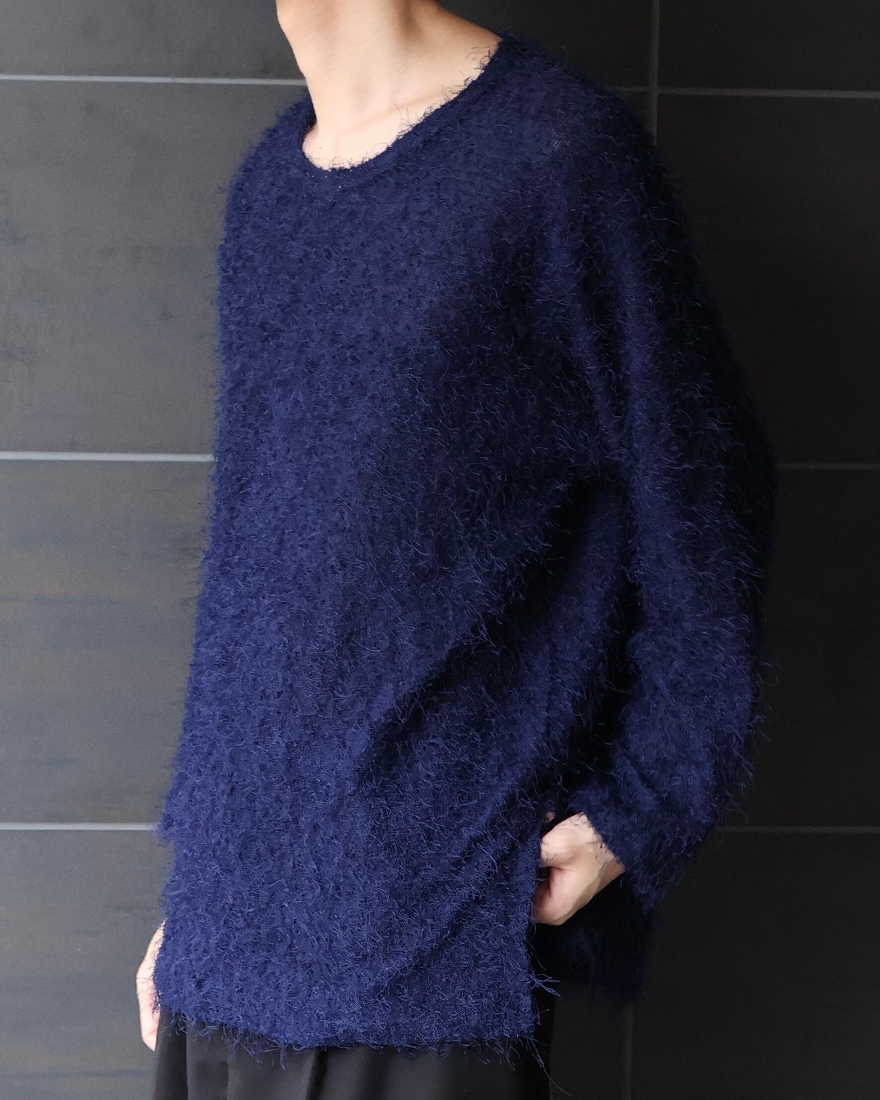 深みのあるネイビーカラーに、ふわりとした毛足が特徴のシャギーニット