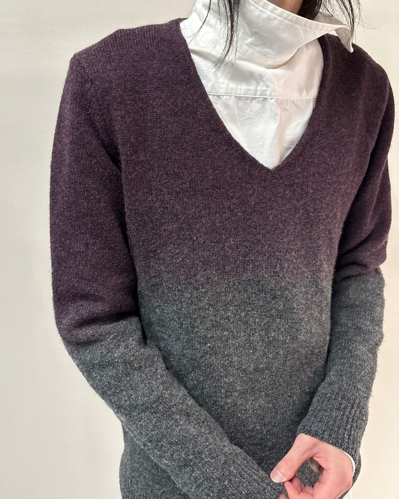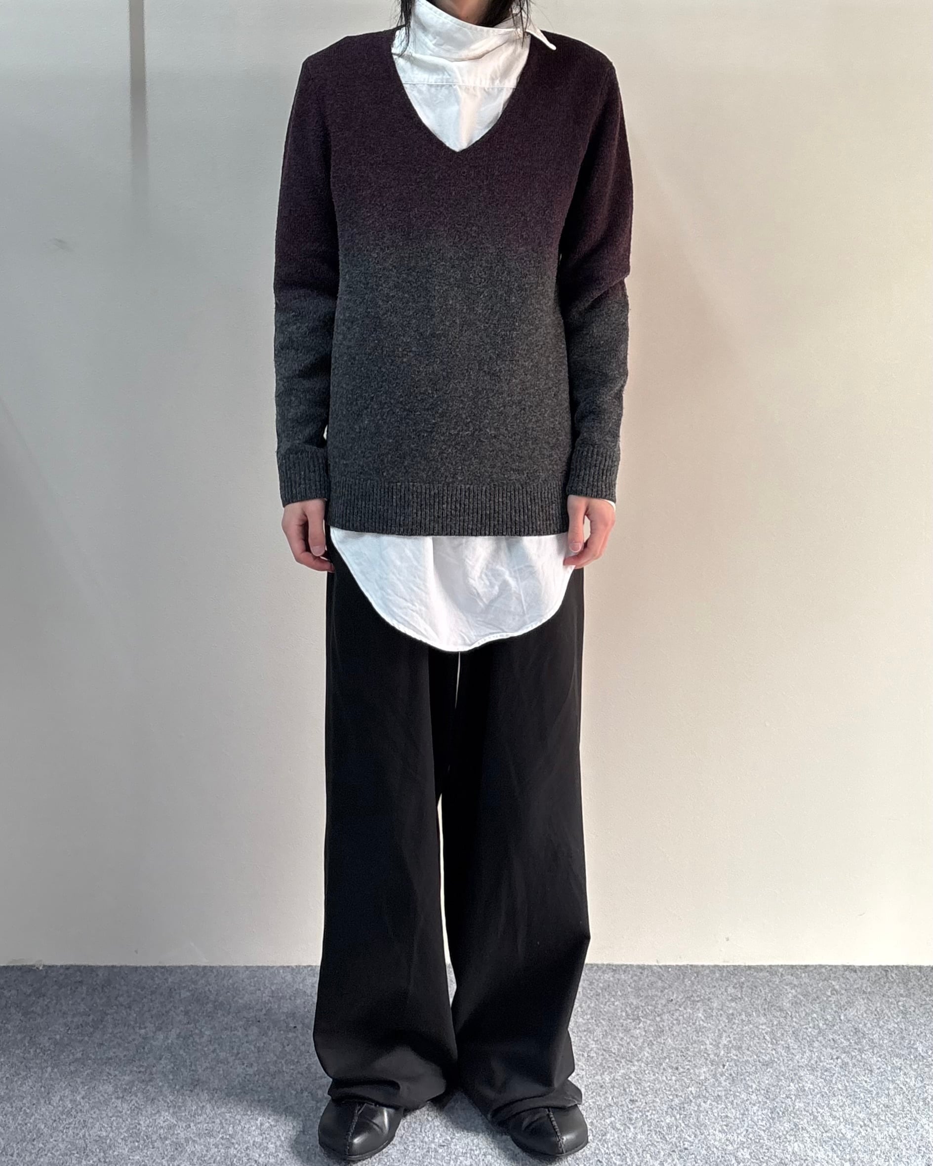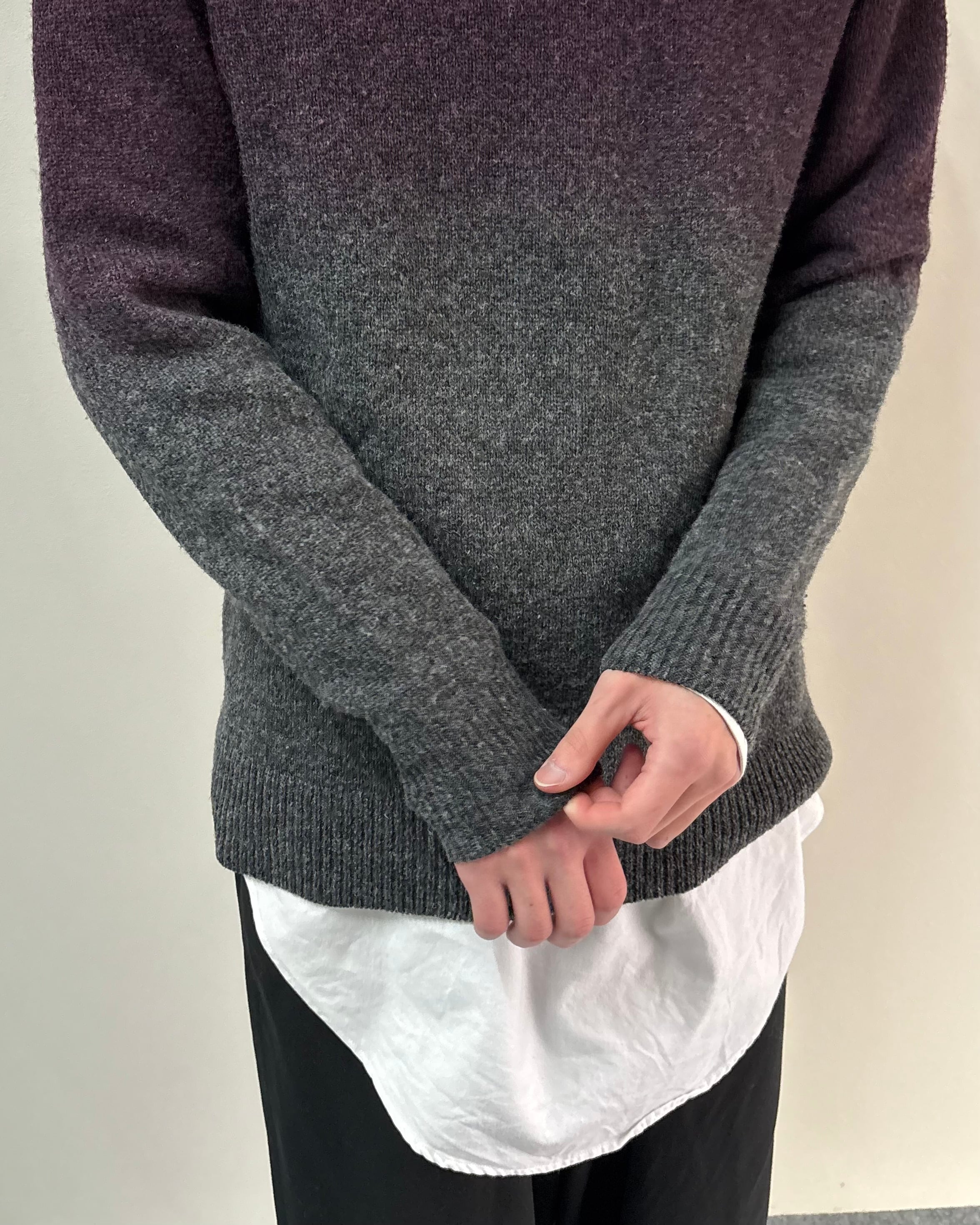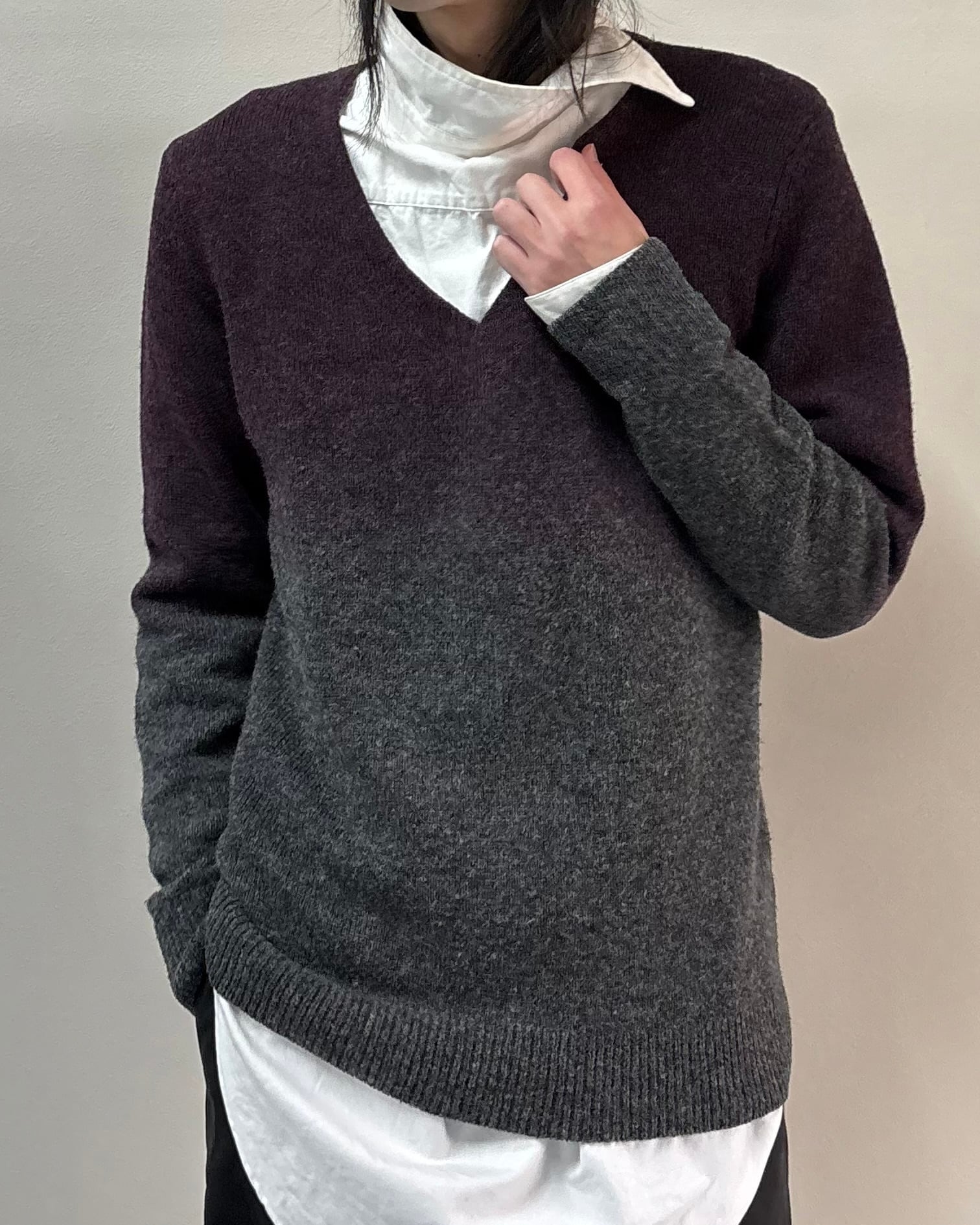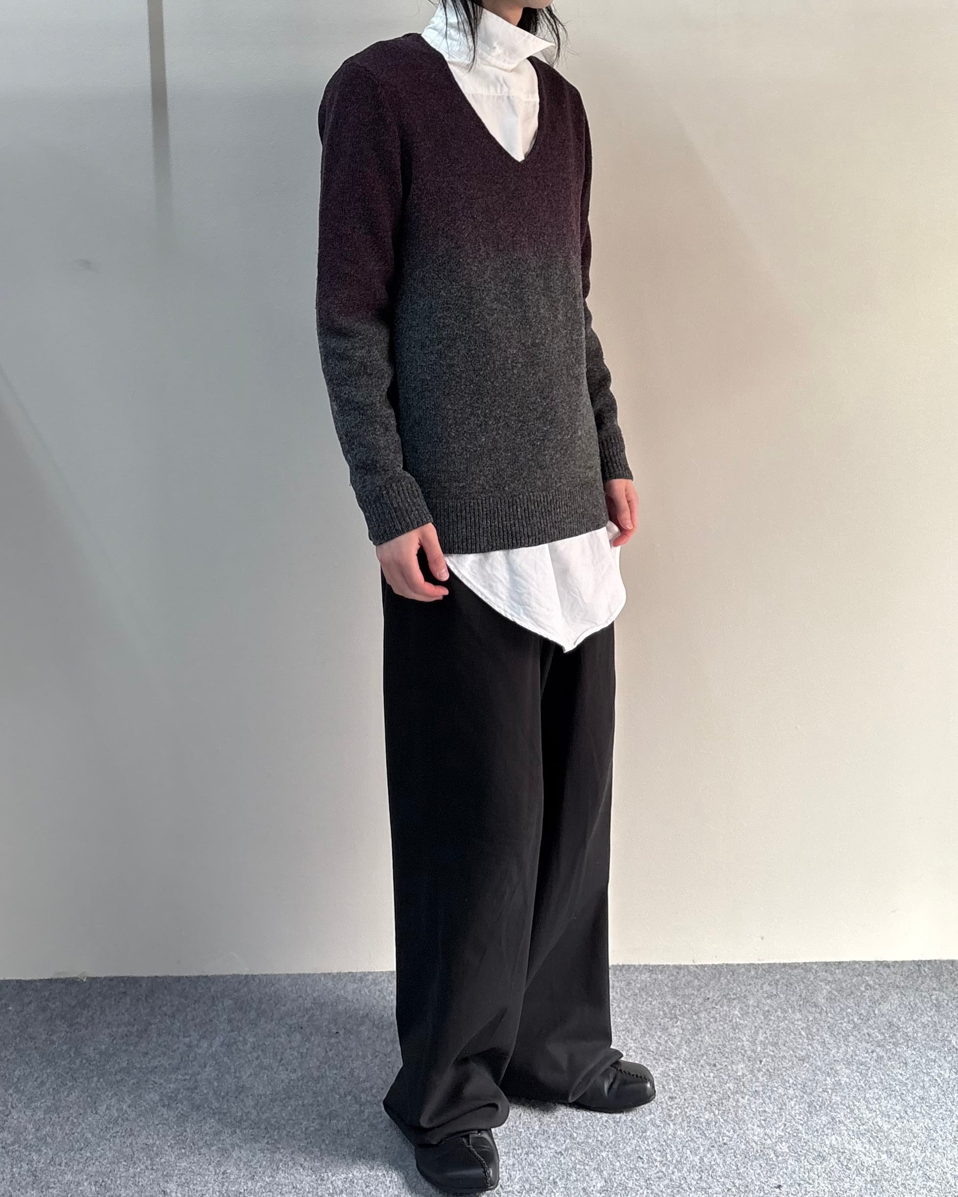 深みのあるバーガンディからチャコールグレーへと移り変わる色調が、落ち着いた中にも個性を感じるアイテム。シャツとのレイヤードでモードなニュアンスを加えたスタイルにも最適な一枚。