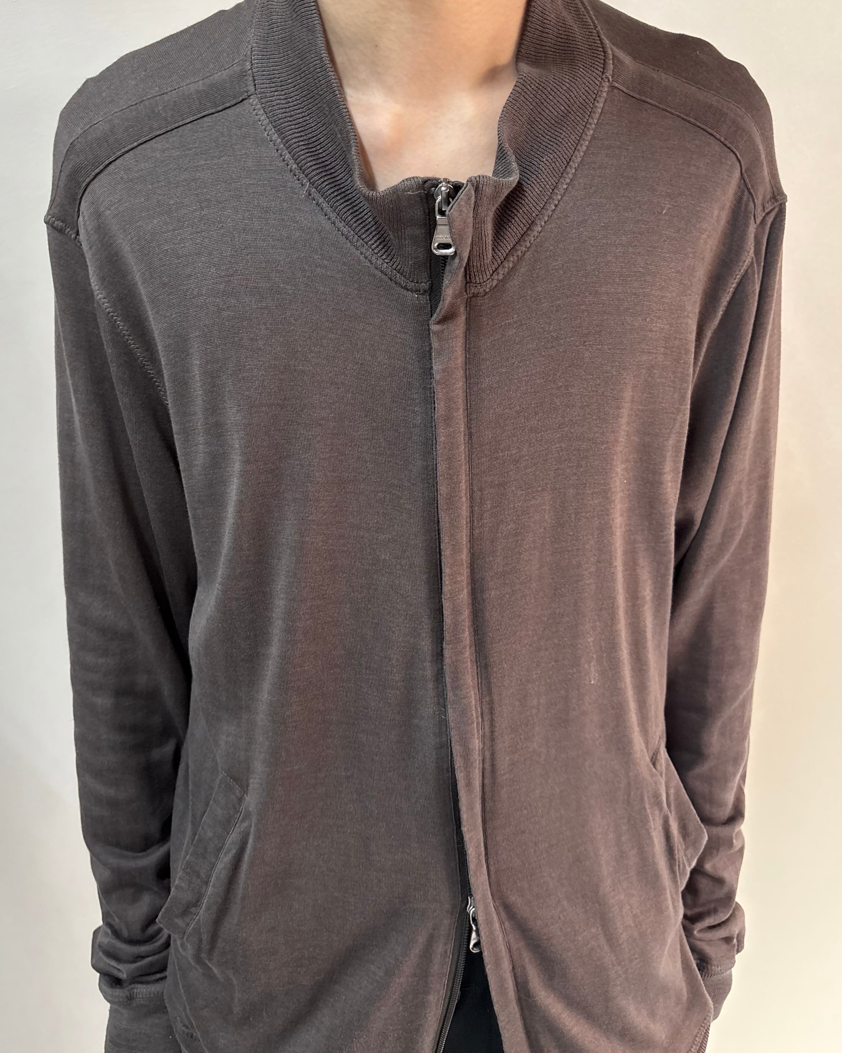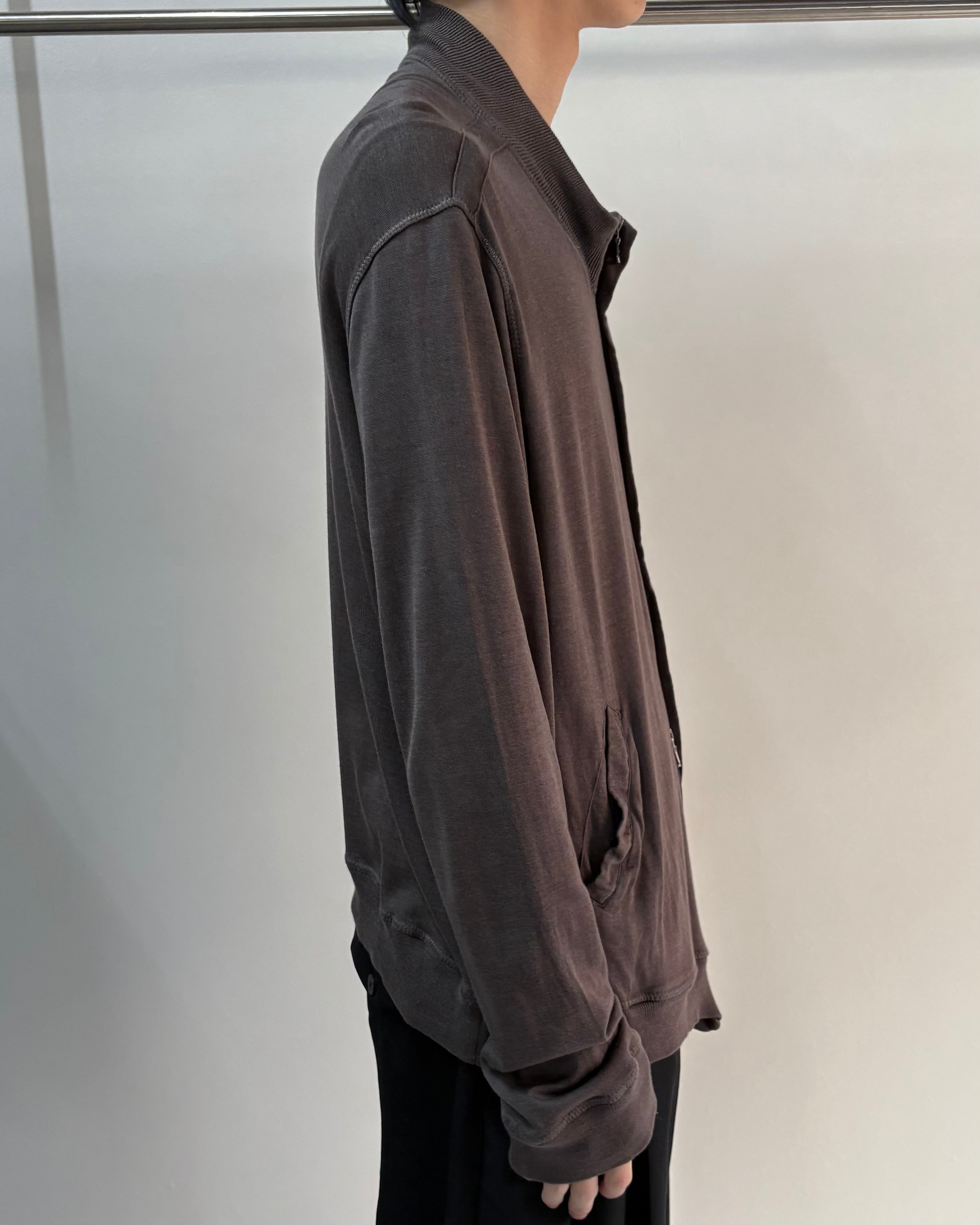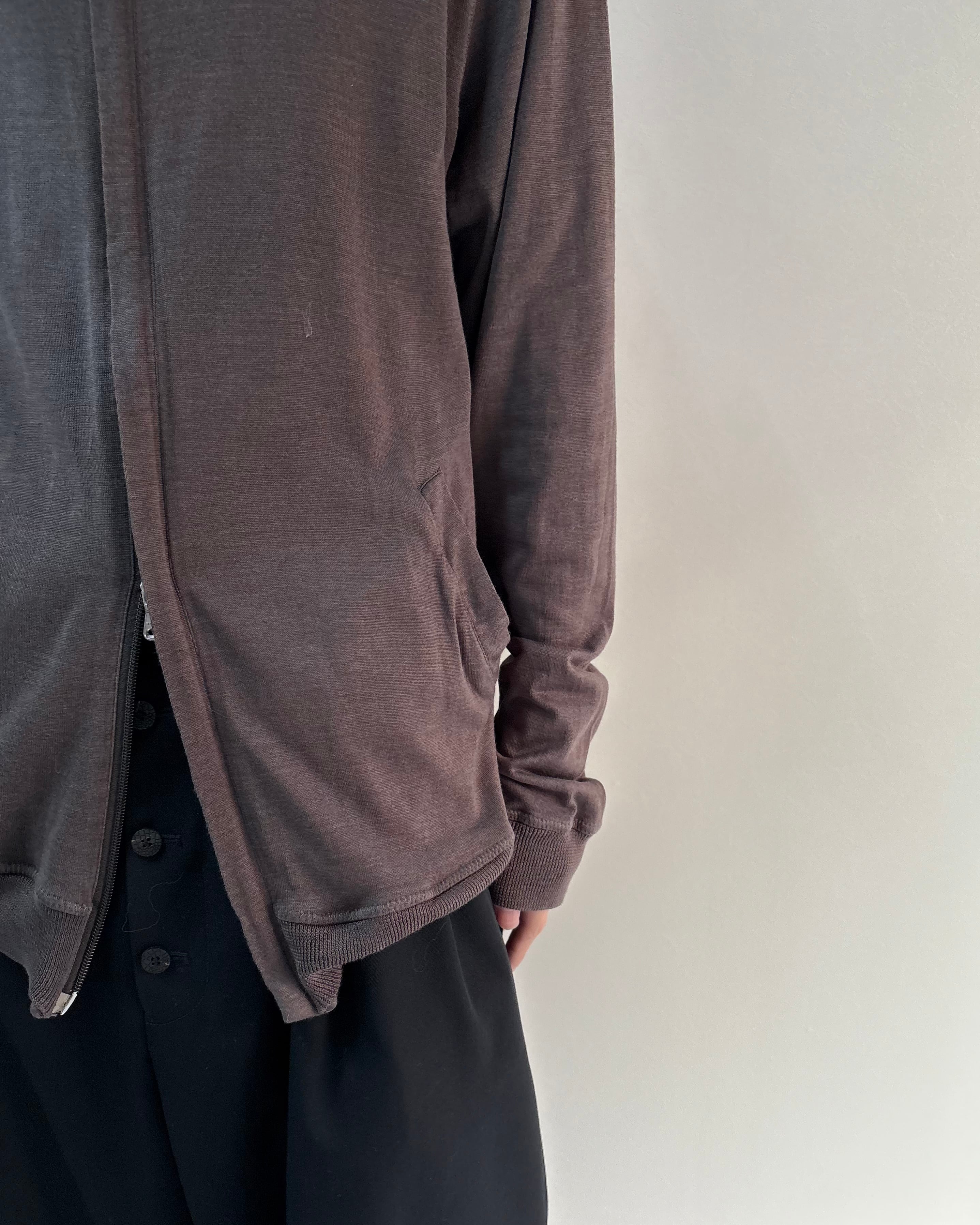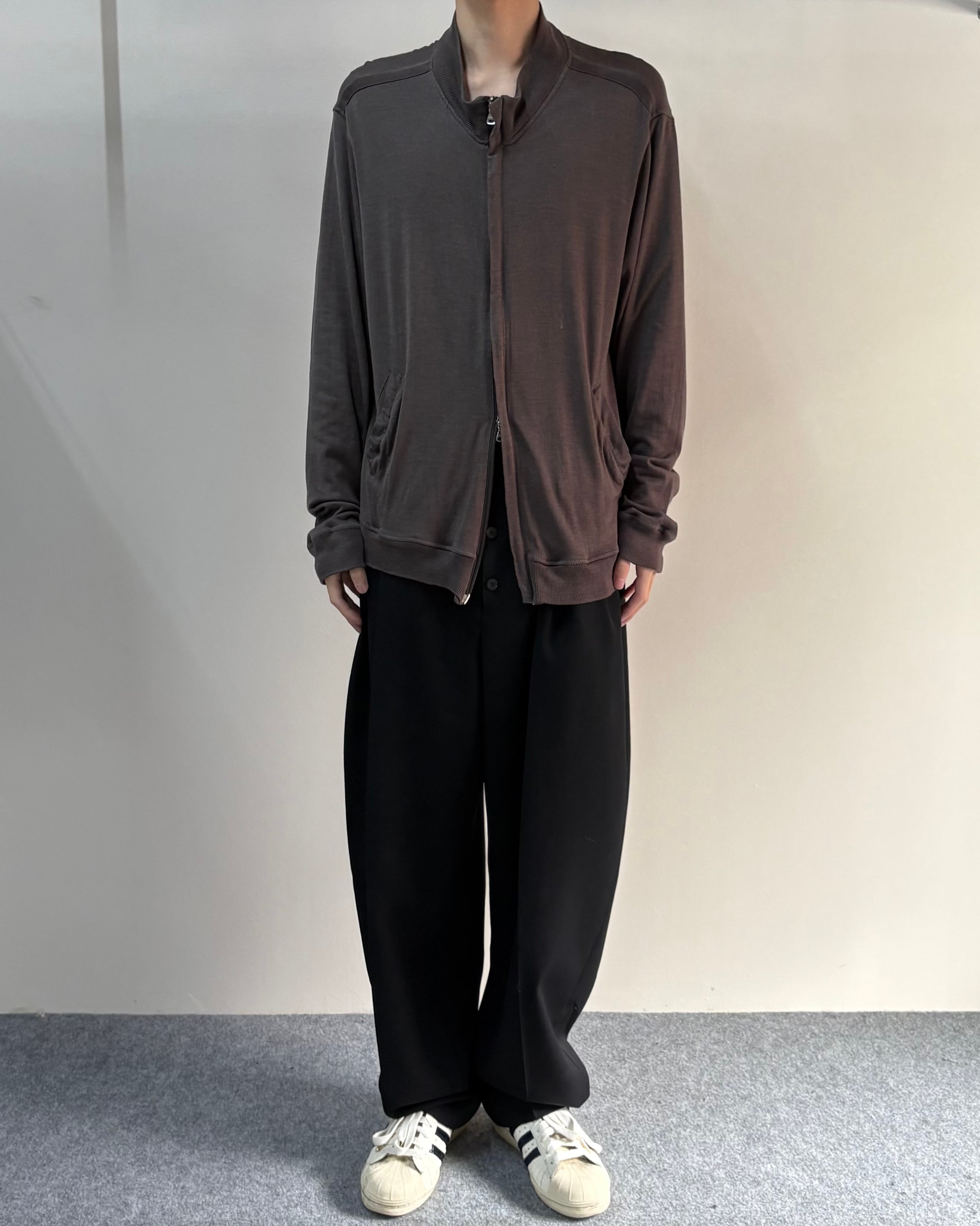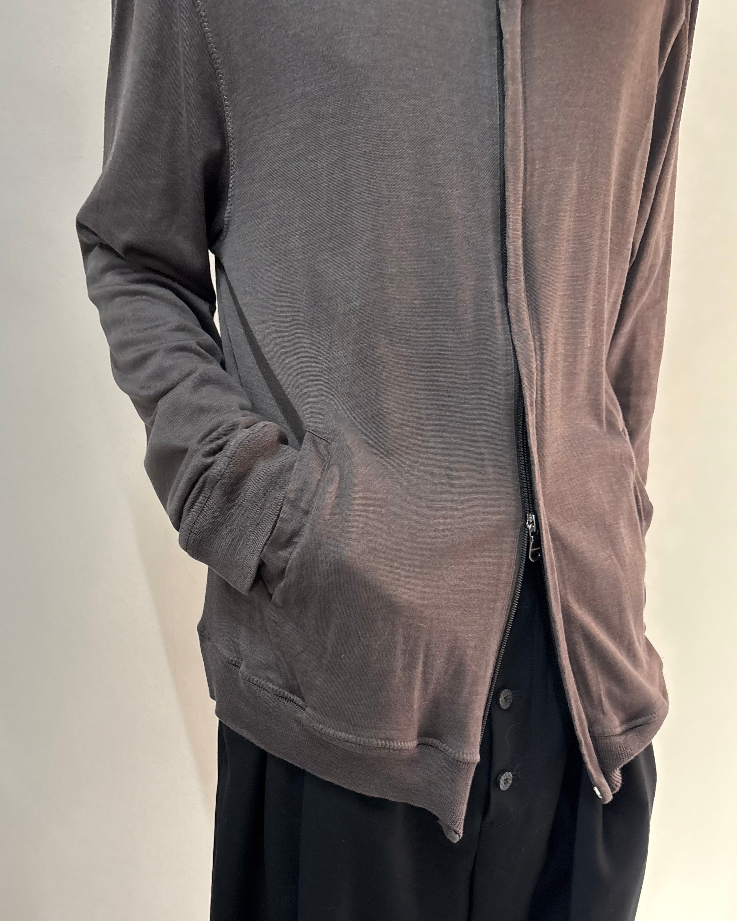 フロントは比翼仕様でミニマルなデザイン。サラッとした着心地でカーディガンのように着用可能。ダブルジップのためインナーをレイヤードするスタイルもおすすめ。