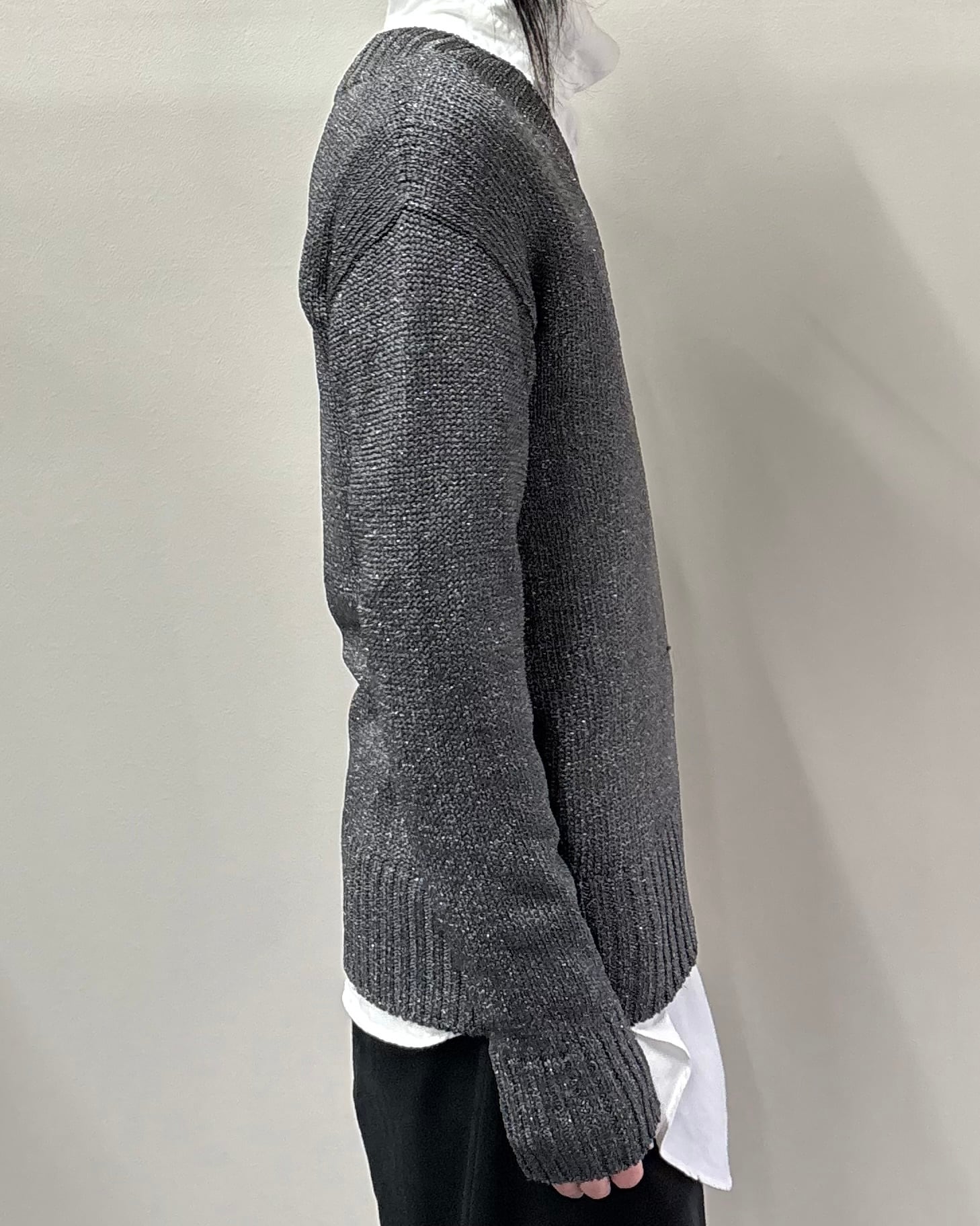 全体的にラメ加工が施された、1枚でもインナーとしても幅広く活躍が可能。コーデのアクセントになる1着。