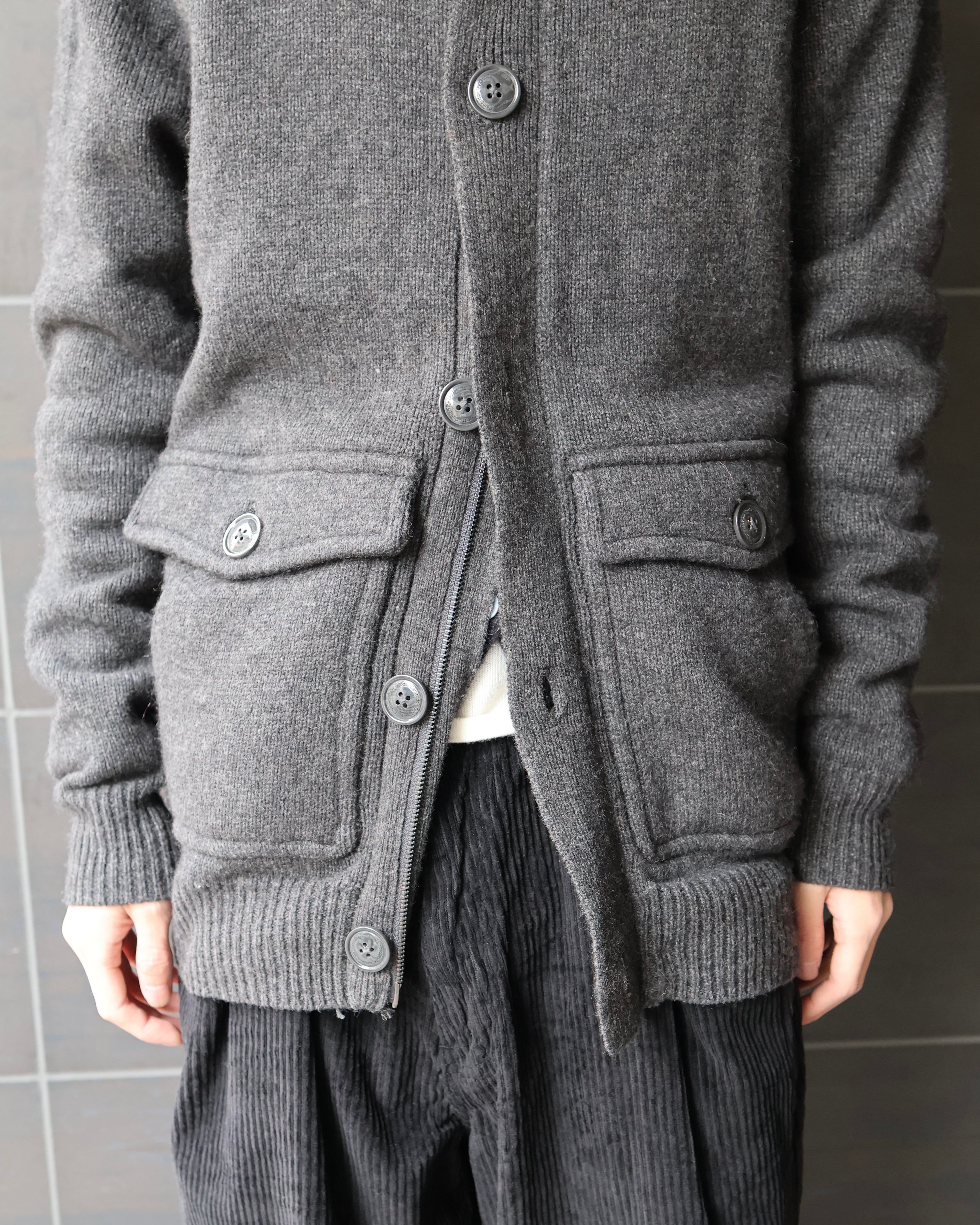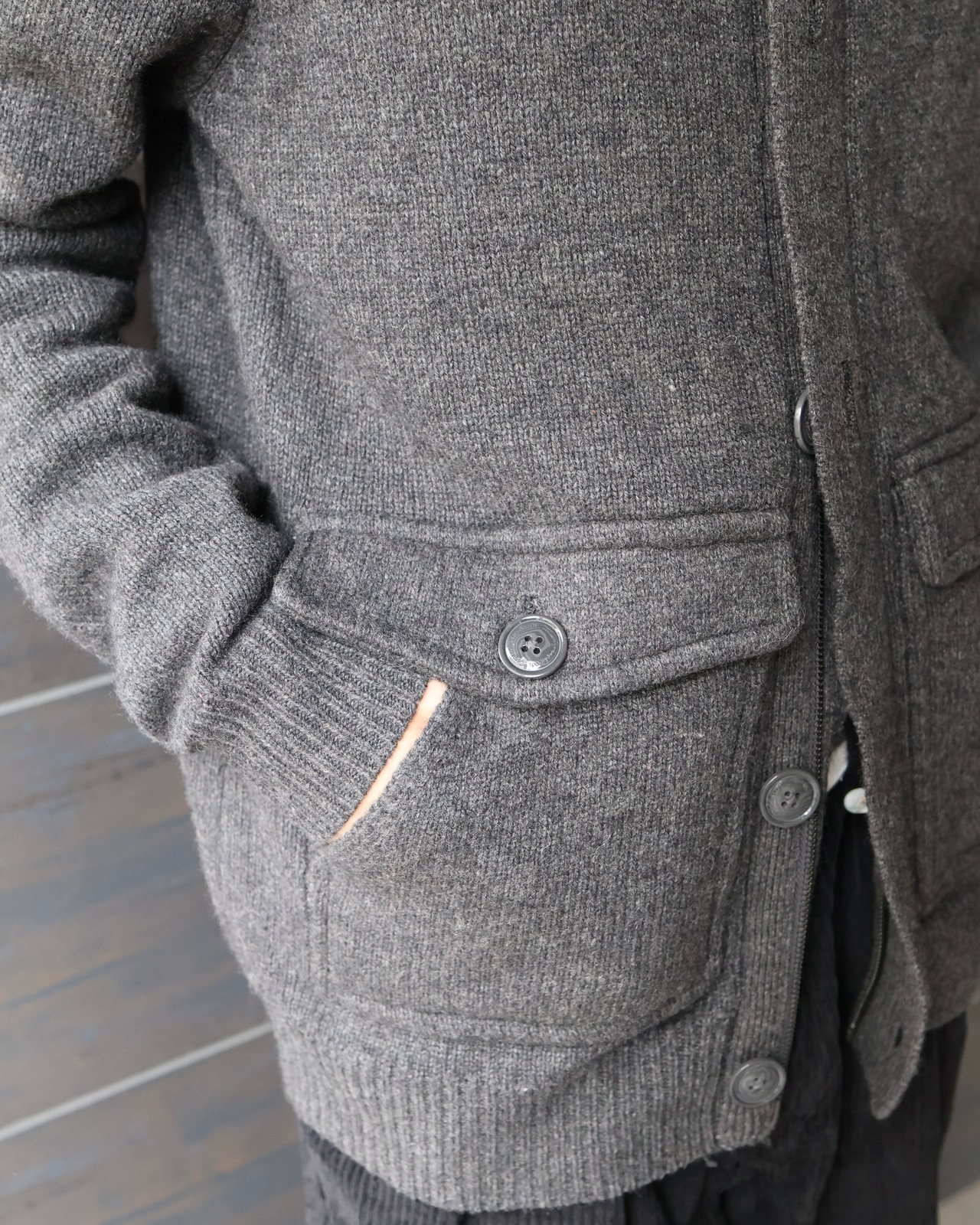 しっかりとしたリブ編みの襟と袖口、大きめのボタンとダブルジップが特徴。やや長めの着丈とフラップ付きポケットがデザインのアクセントとなり、一枚でもアウターとして着用可能。