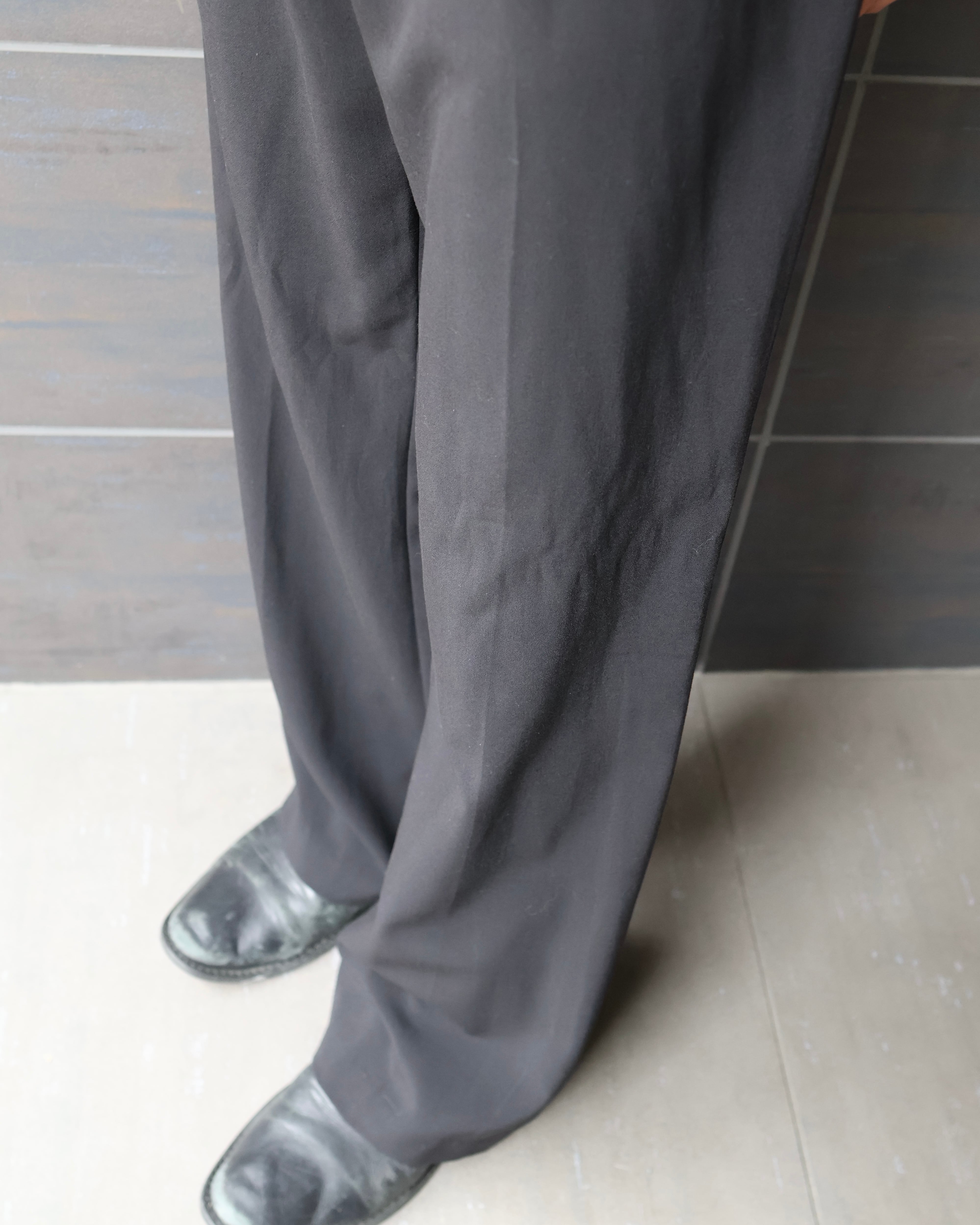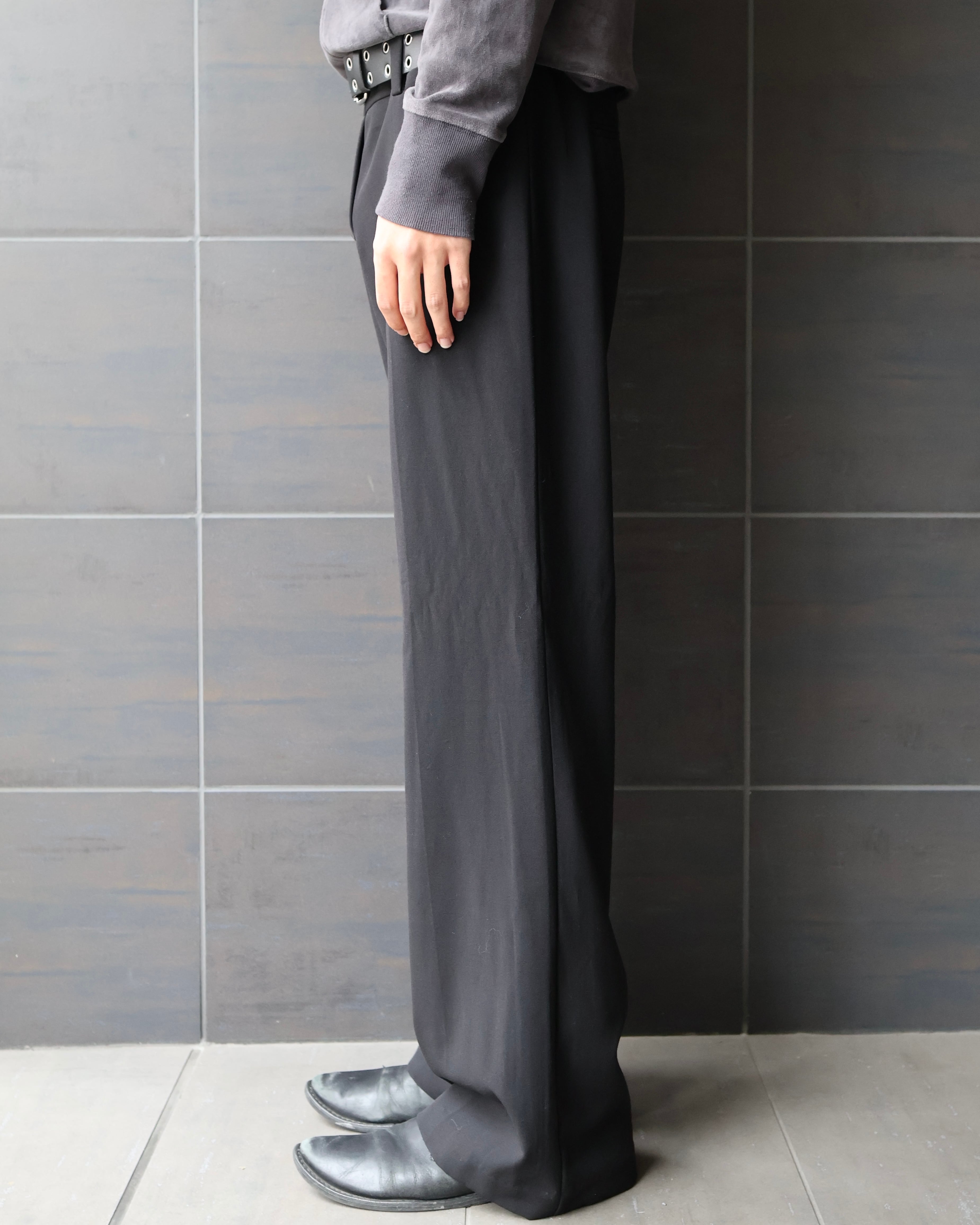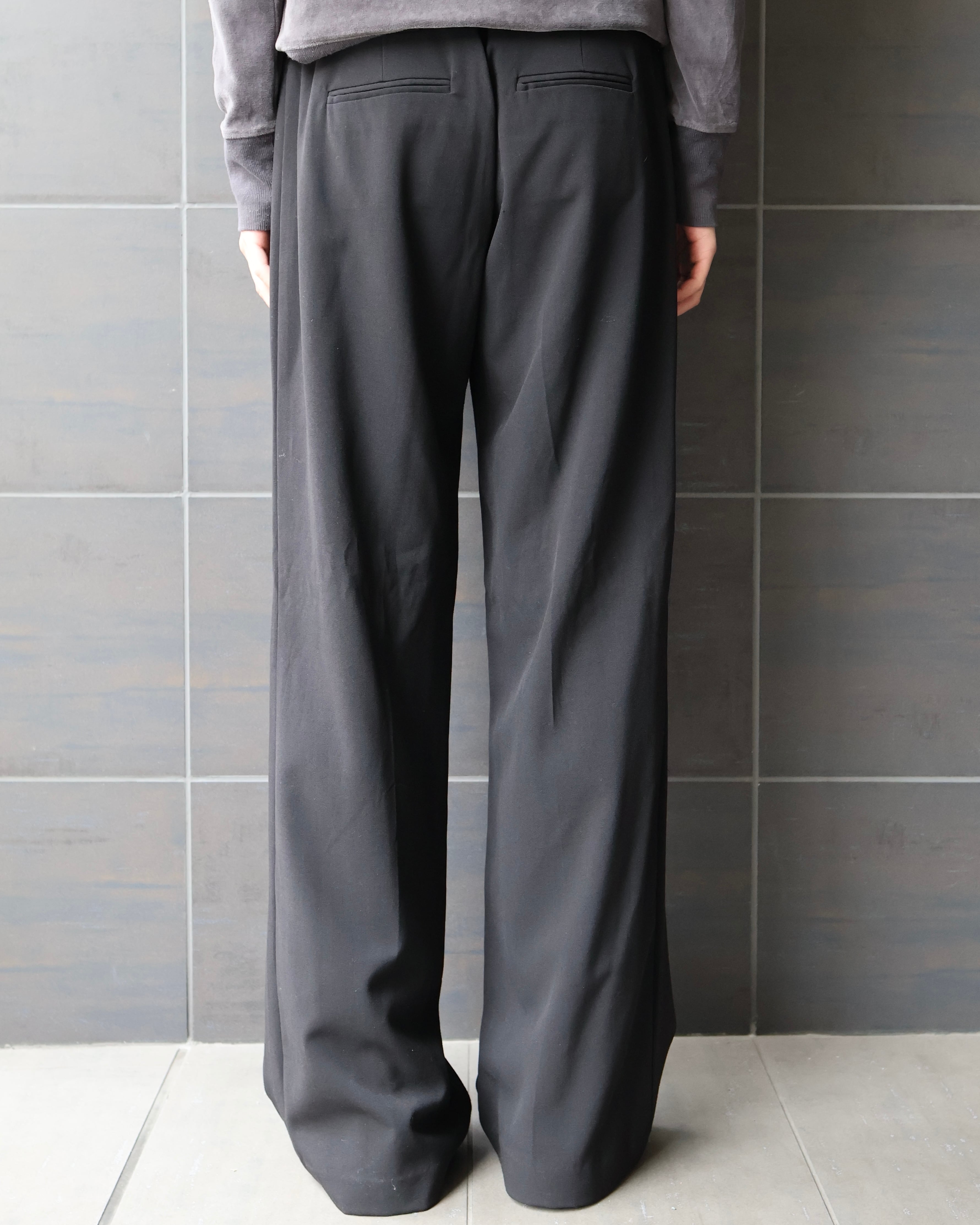 ワイド過ぎないサイズ感と、ノータックでストンと落ちるシルエットがクラシックにもモードにも合わせやすい一本。