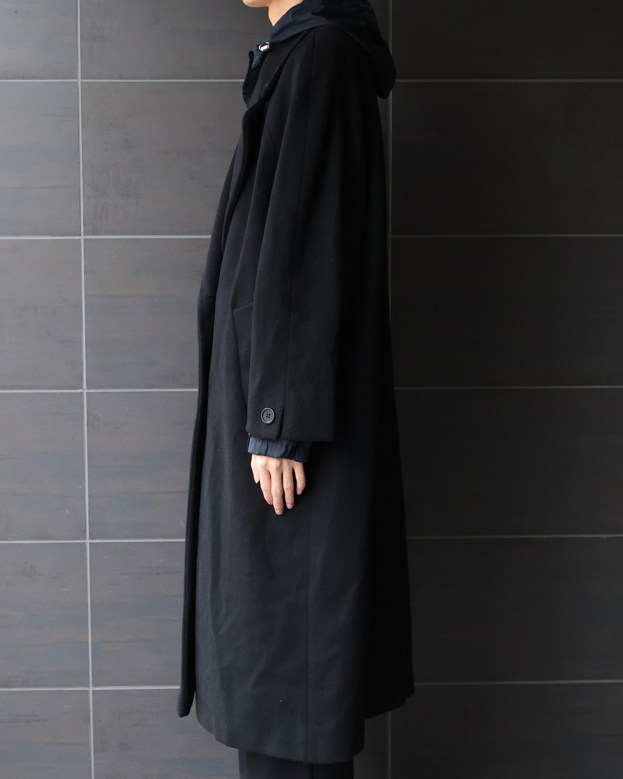 しっかりとした厚みがありながらも、しなやかな落ち感が特徴で、上品なシルエットを演出。ややオーバーサイズな為、インナーに厚手のニットやフーディを重ねても快適。フォーマルにもカジュアルにも対応できる、汎用性の高い一着。
