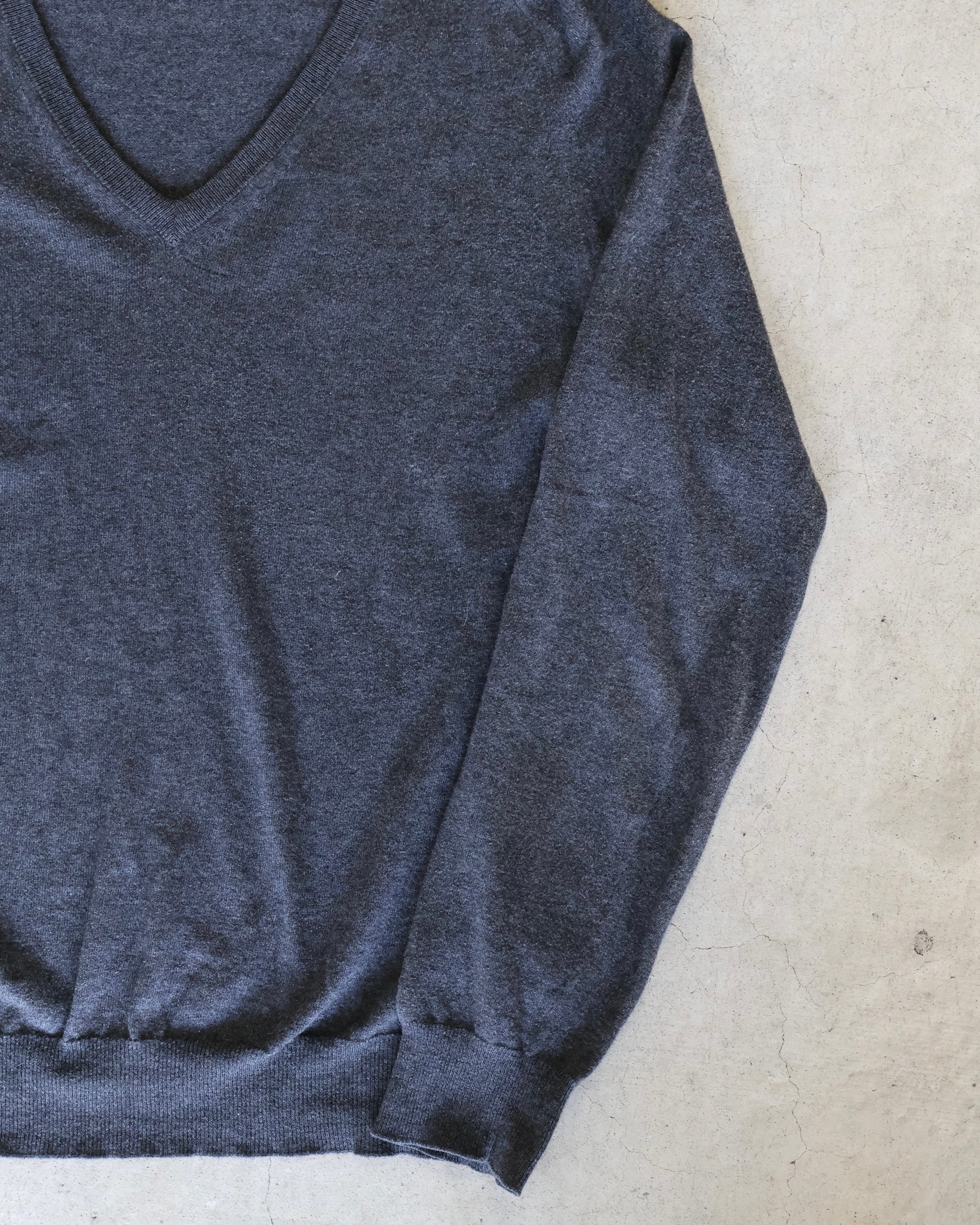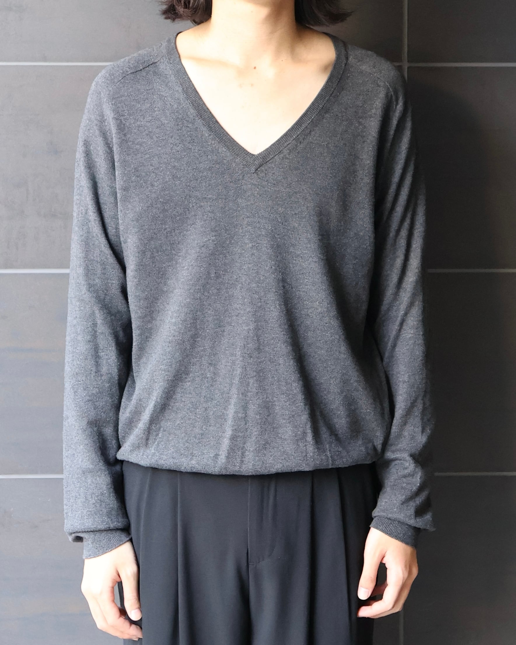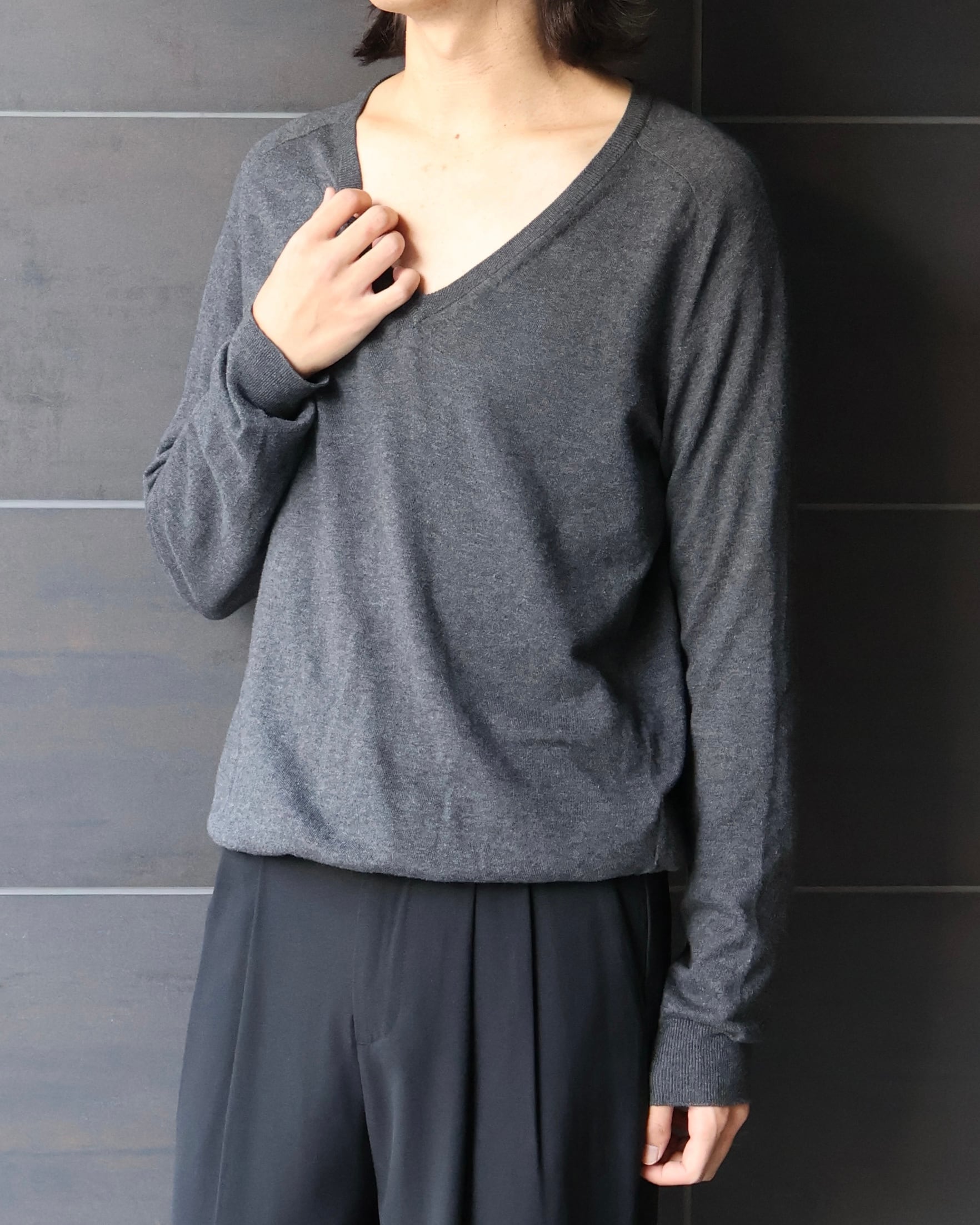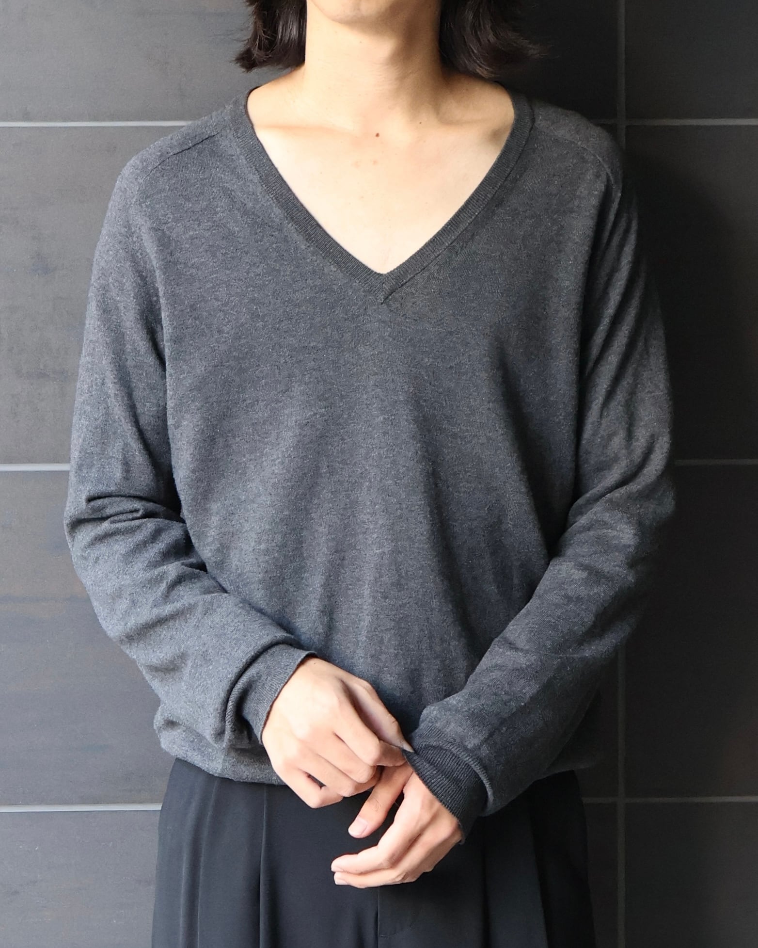 コットンカシミヤで上質で柔らかなニット。深めのVゾーンが洋服の持つ色気や、レイヤードできる遊び心を併せ持つ。1着で様々なコーディネートができる万能ニット。