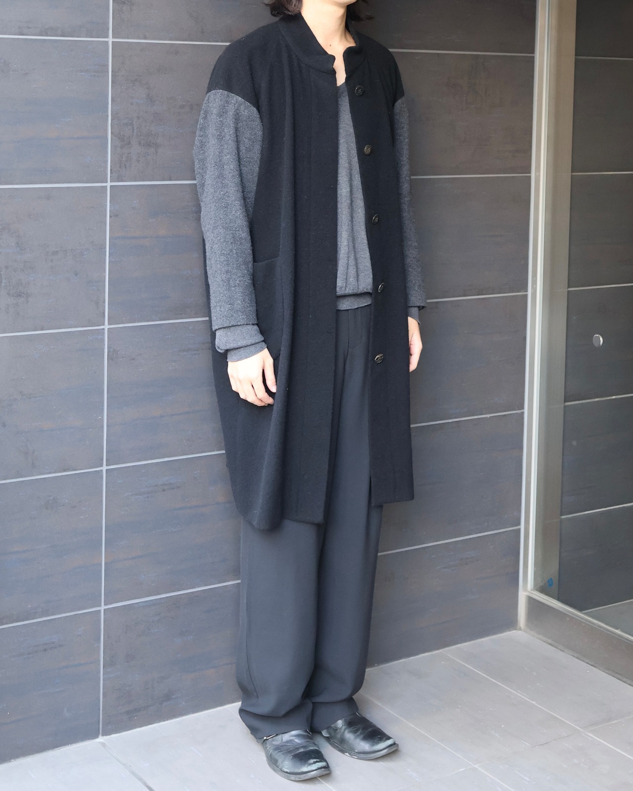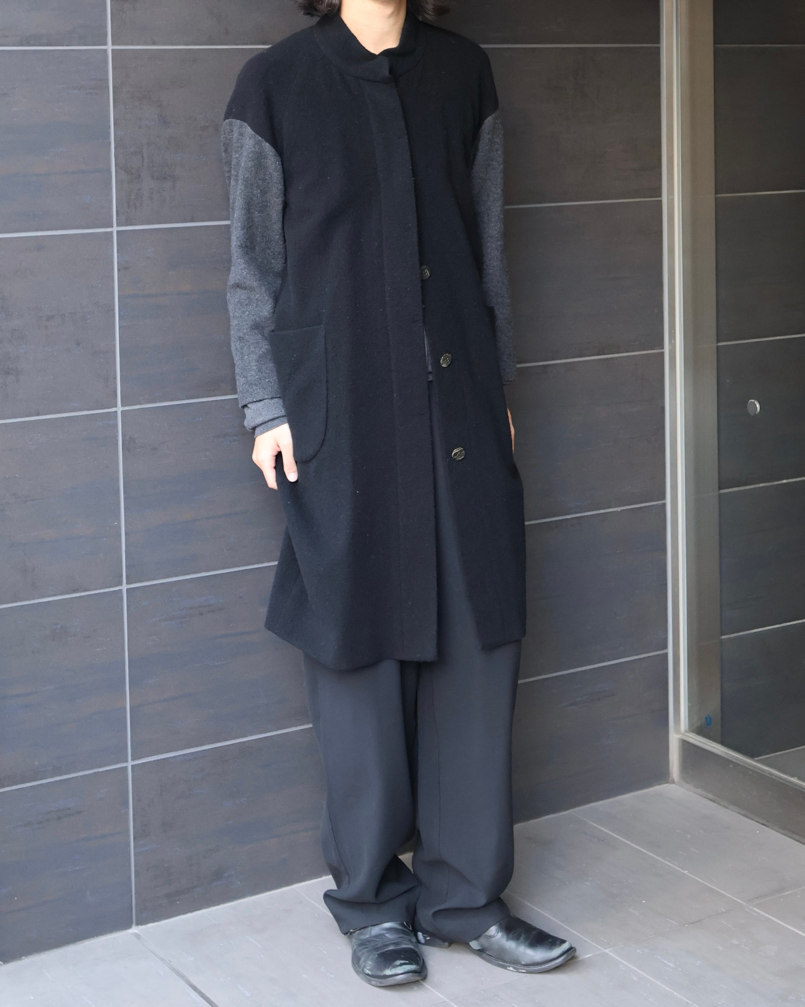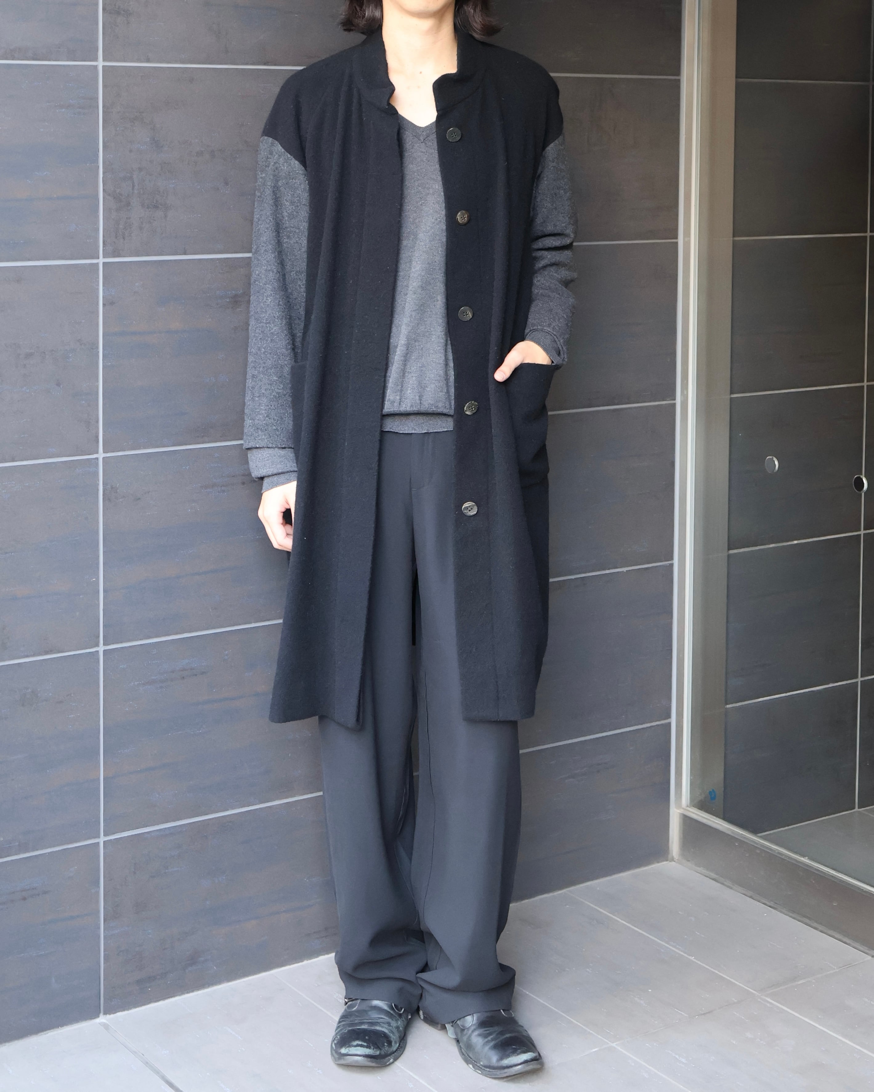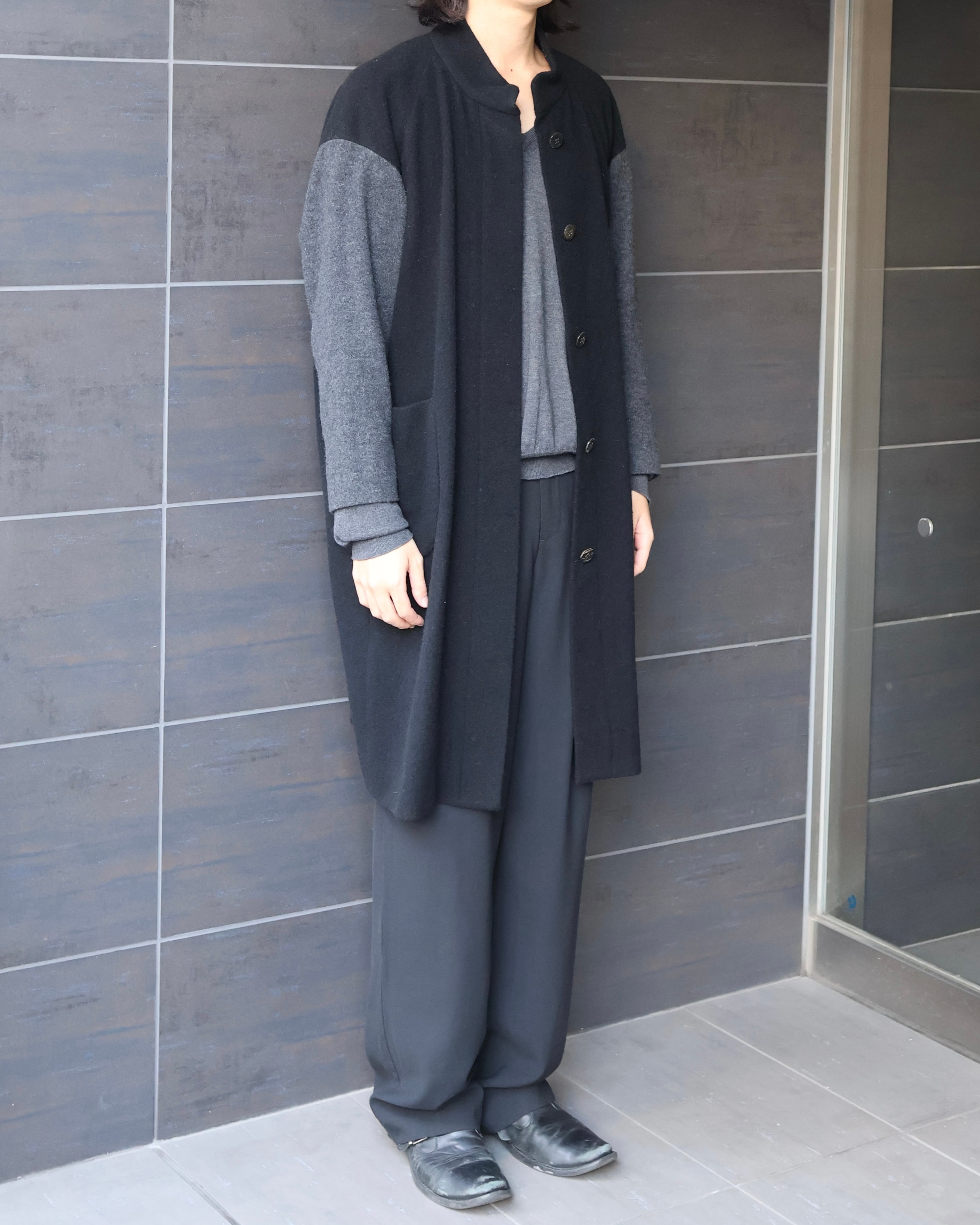 y'sらしいミニマルながらも構築的なデザイン。カラーも絶妙でクリーンでモードな印象に。着るというよりは纏うような軽やかで、かつ重厚的な1着。