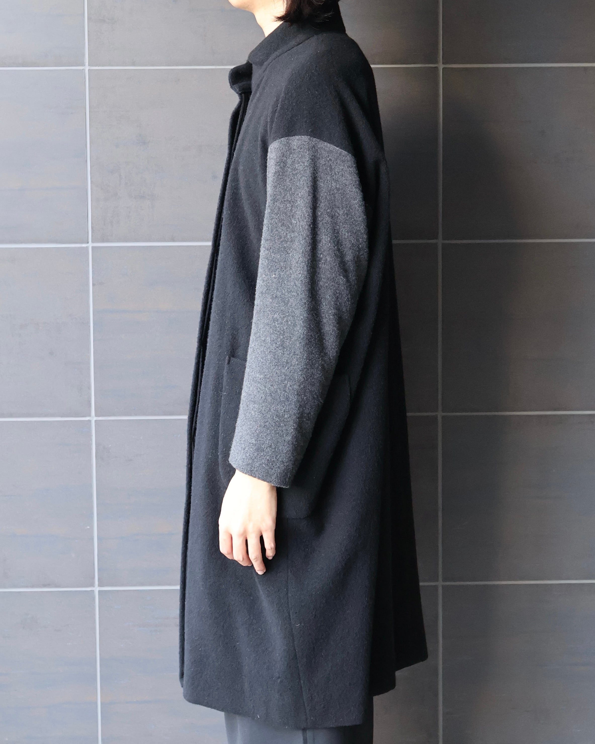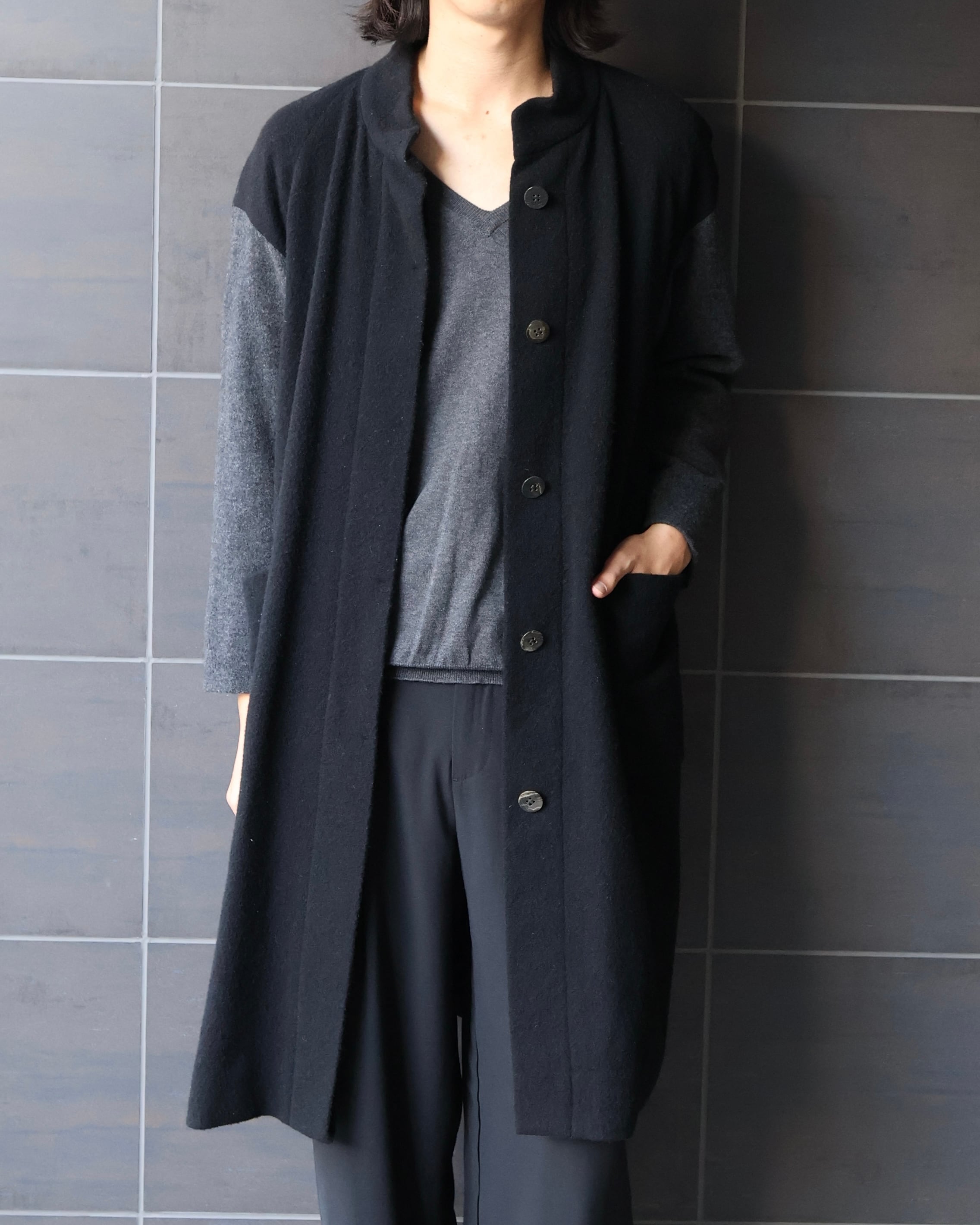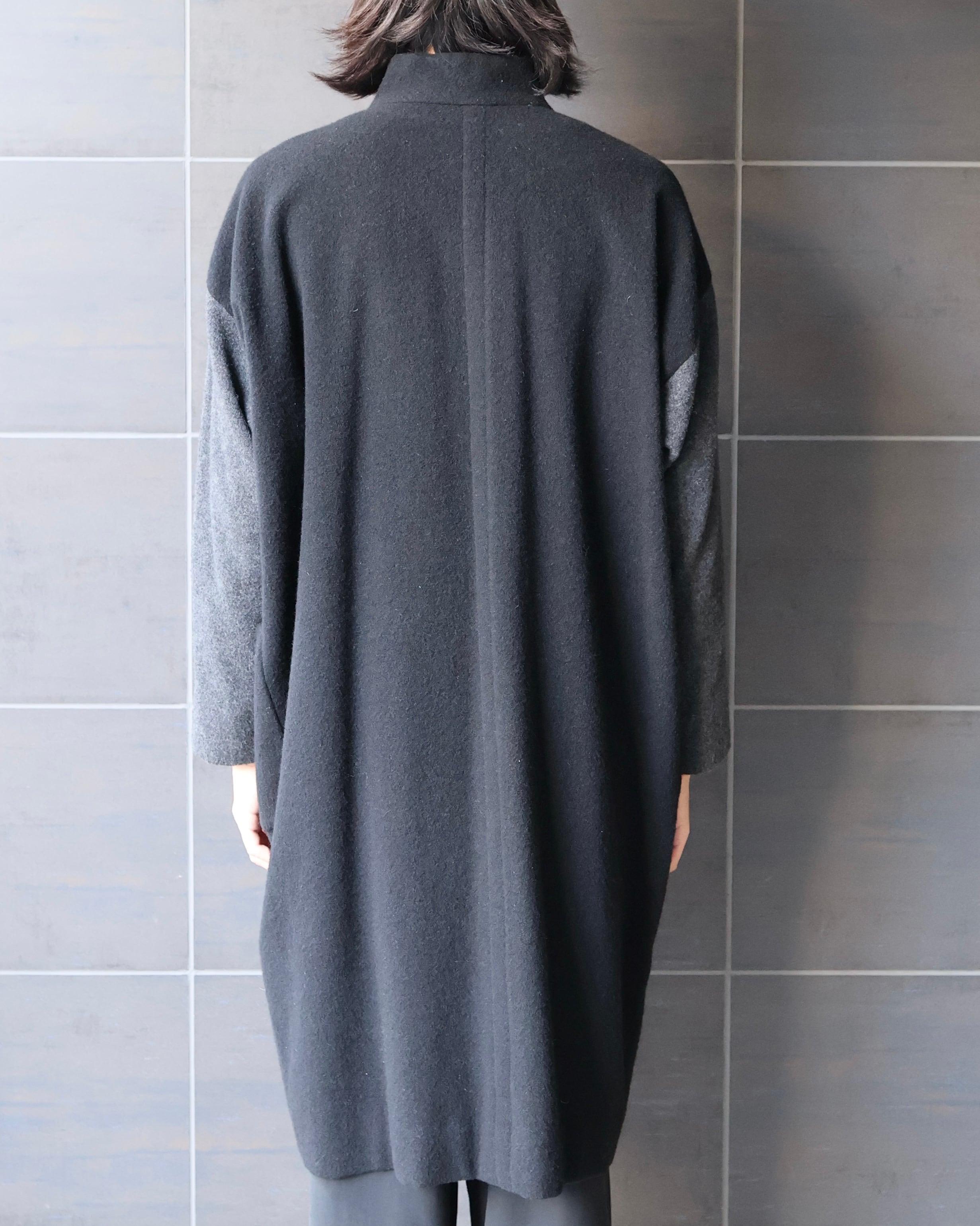 y'sらしいミニマルながらも構築的なデザイン。カラーも絶妙でクリーンでモードな印象に。着るというよりは纏うような軽やかで、かつ重厚的な1着。