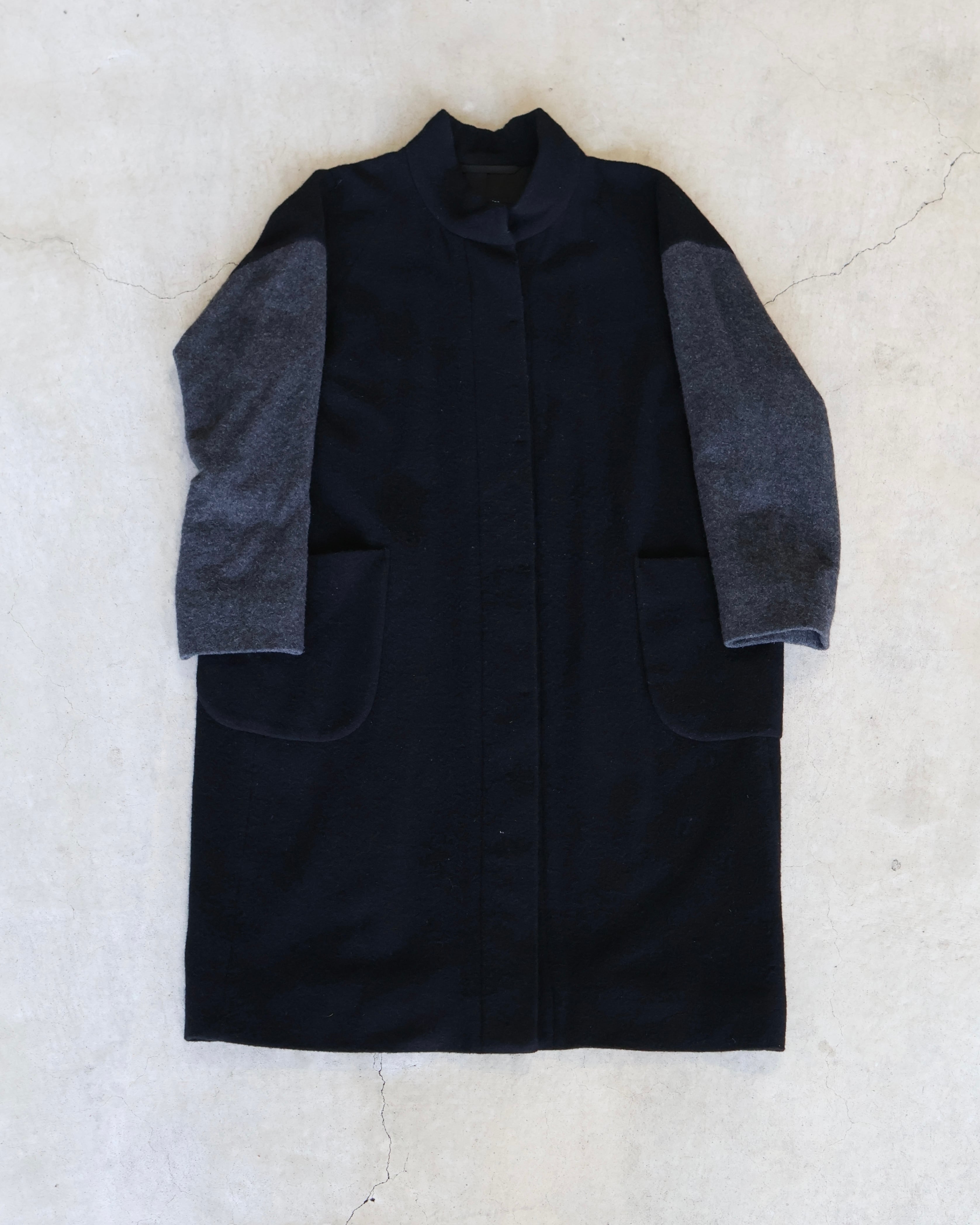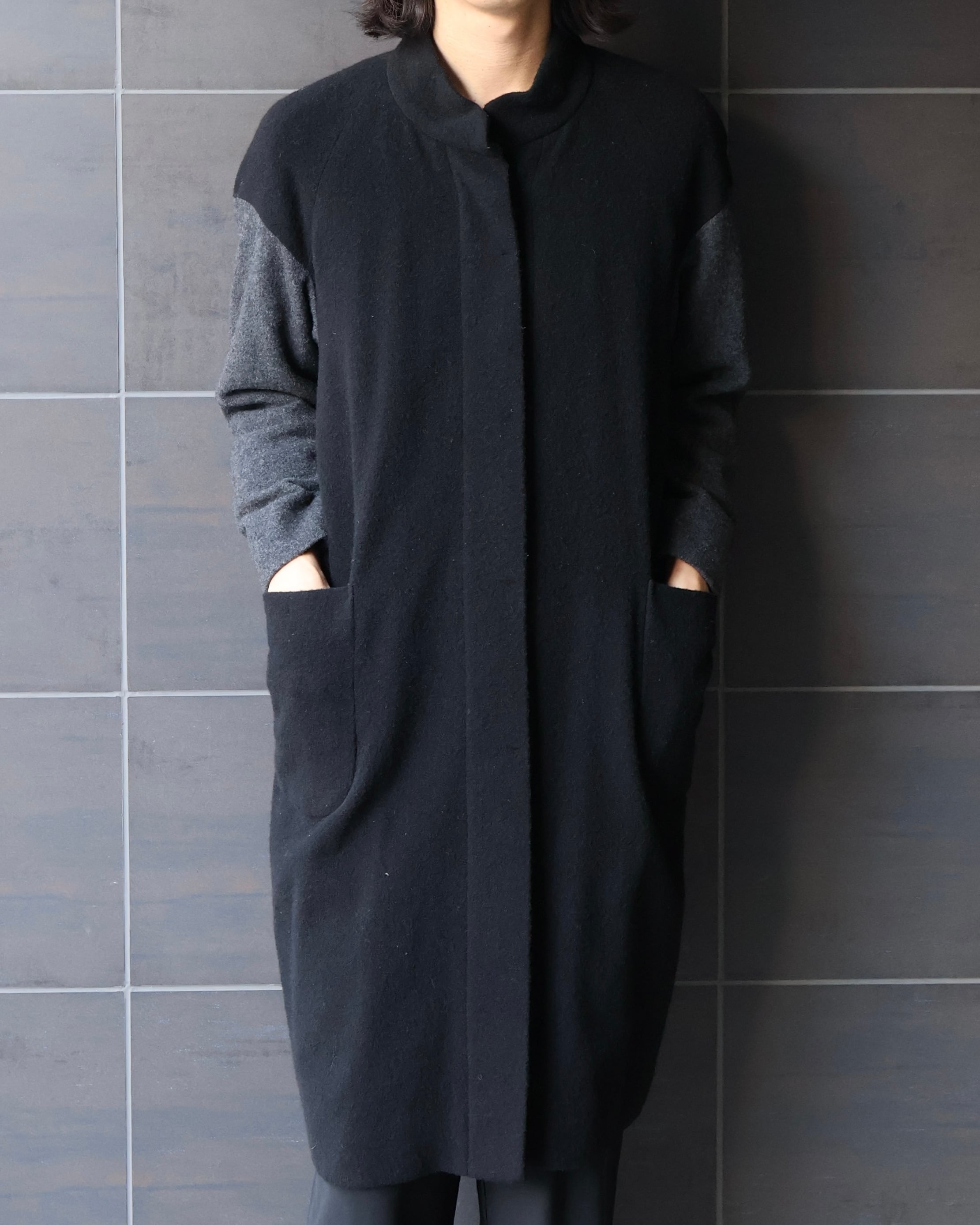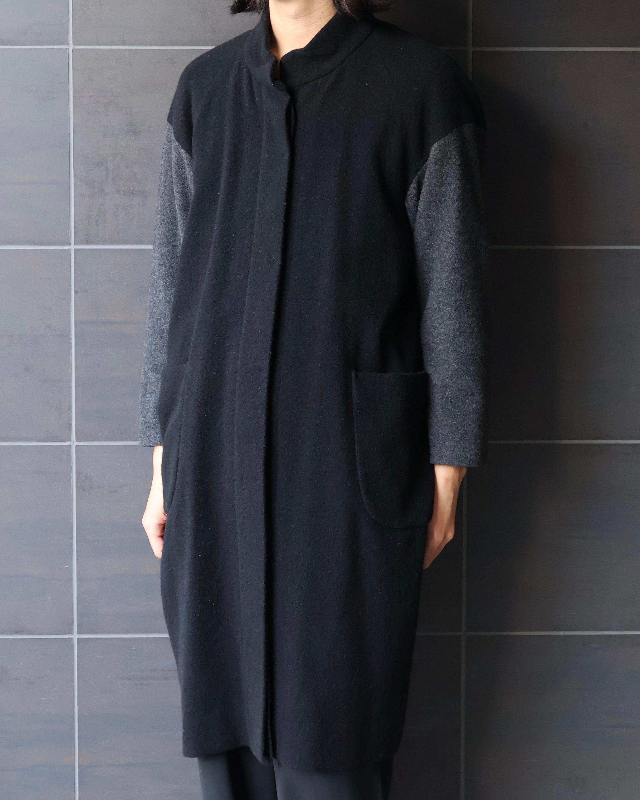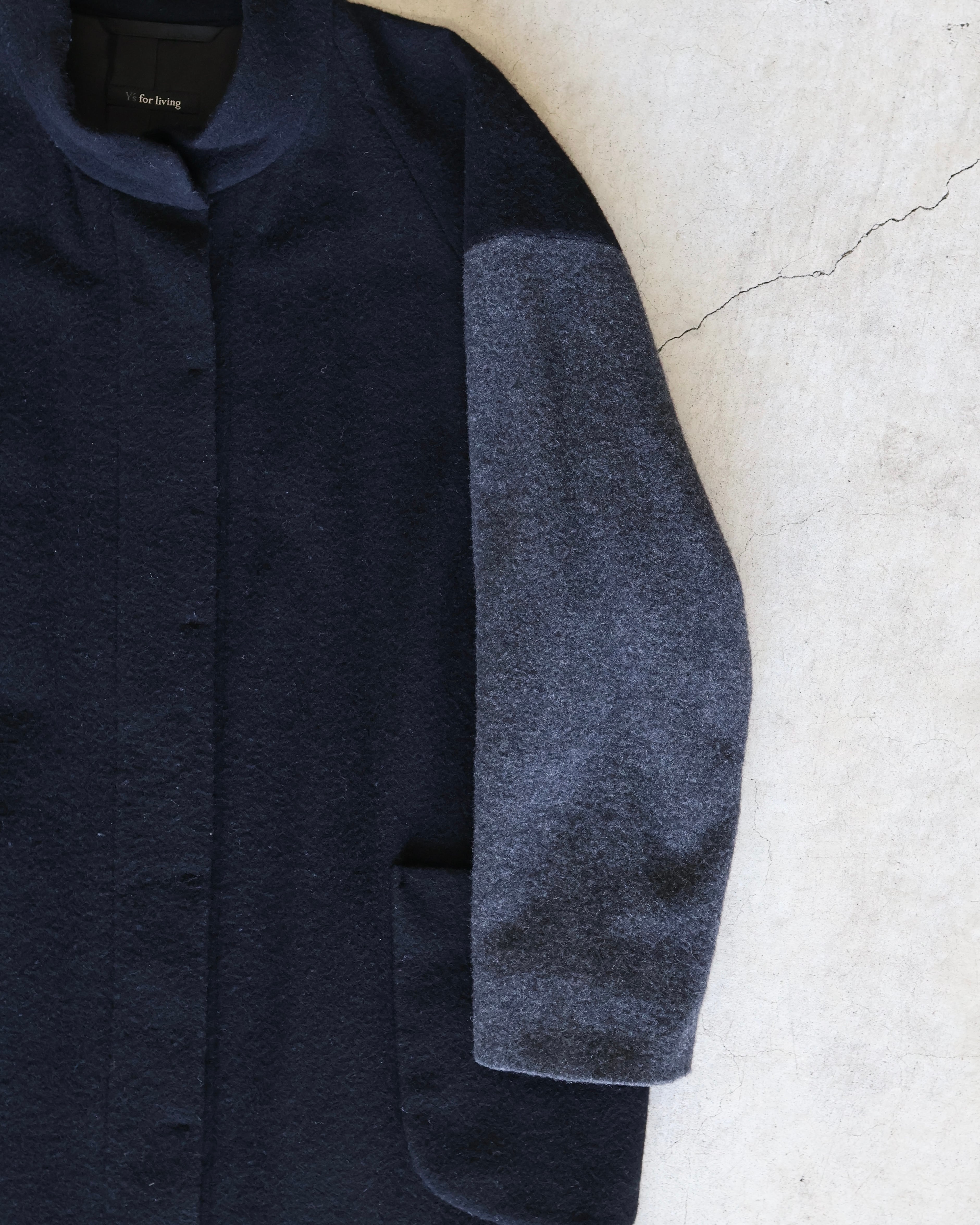 y'sらしいミニマルながらも構築的なデザイン。カラーも絶妙でクリーンでモードな印象に。着るというよりは纏うような軽やかで、かつ重厚的な1着。