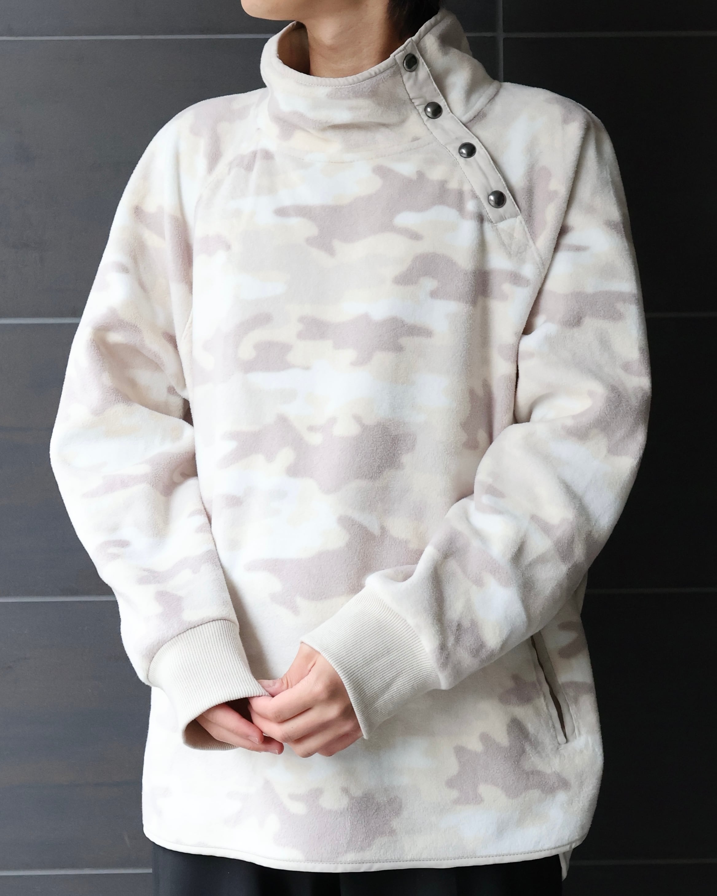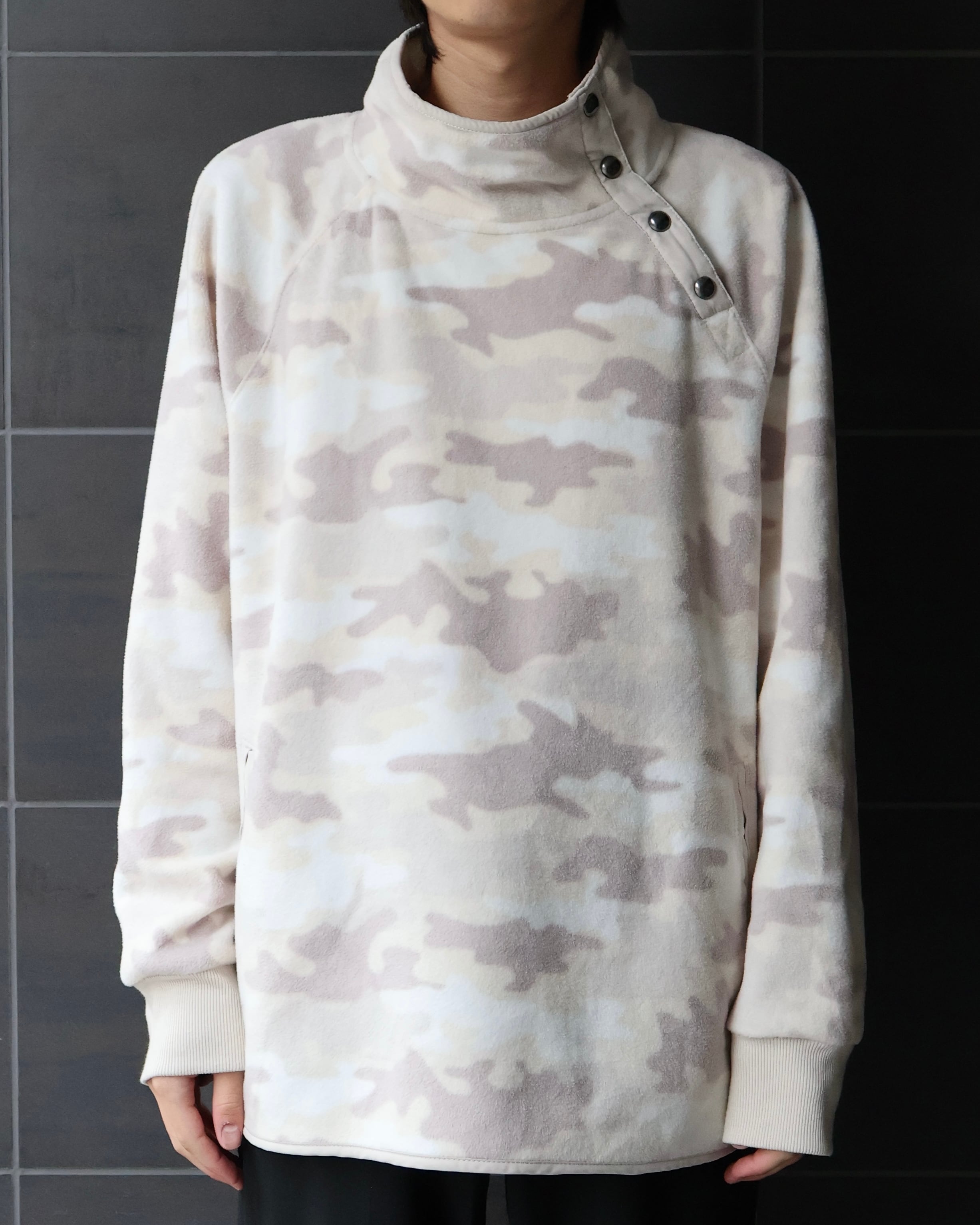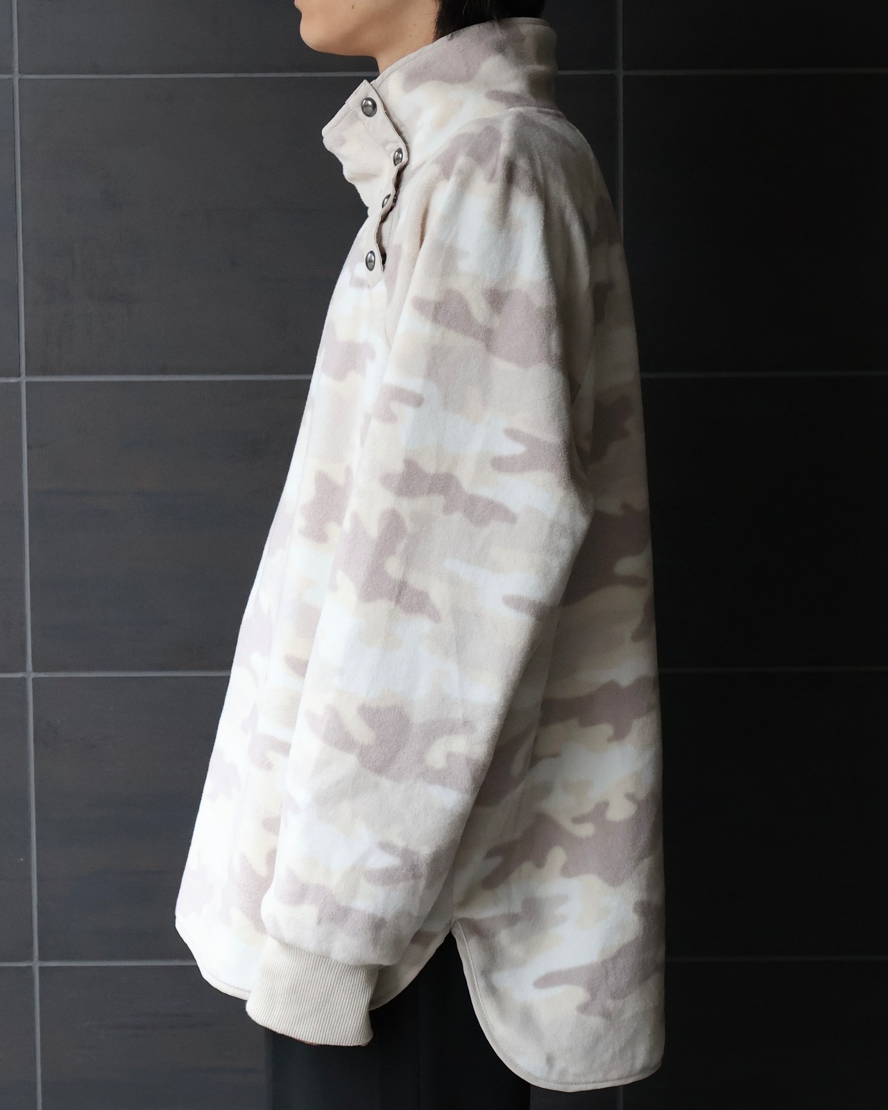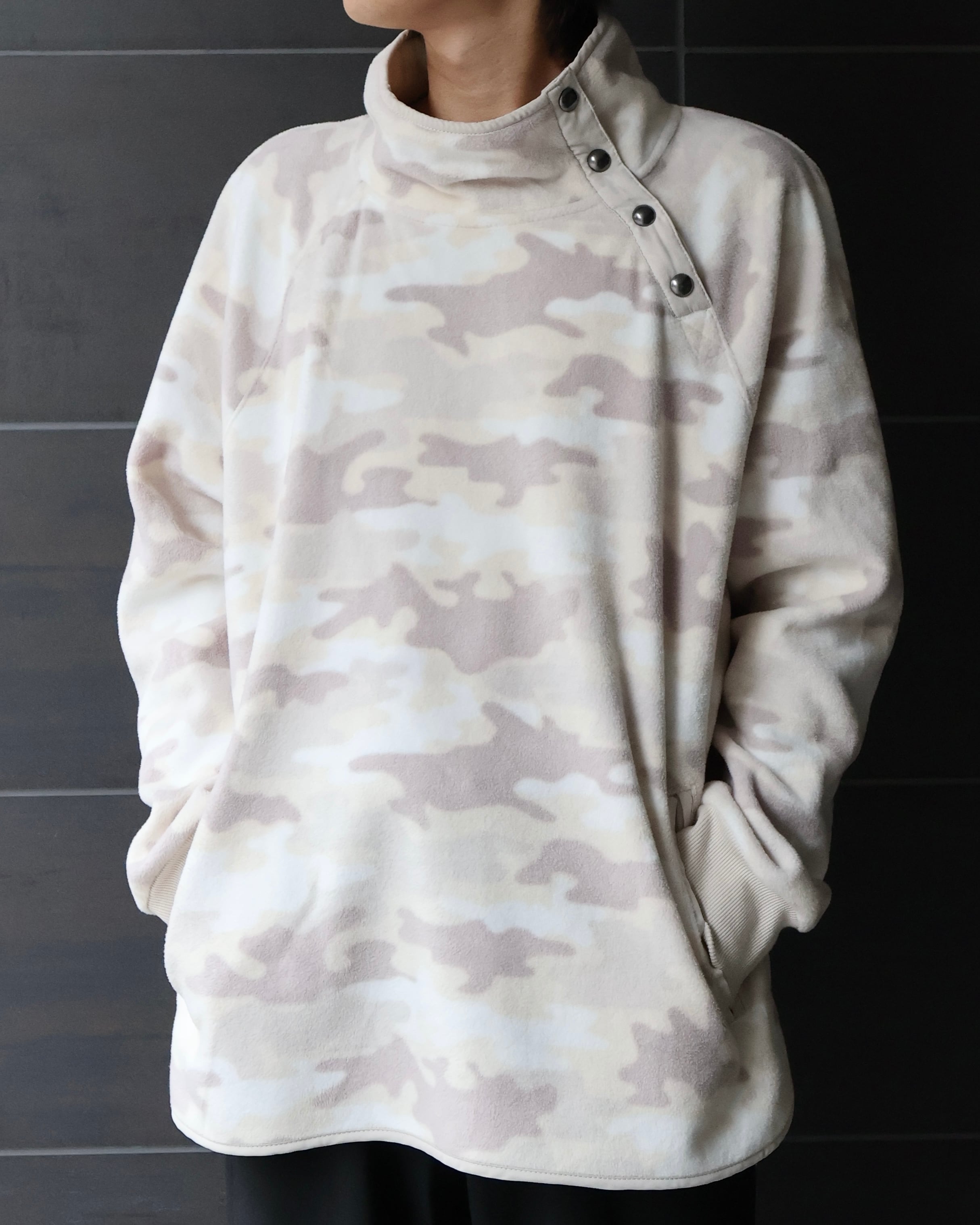 ベージュとホワイトを基調にした淡いカモフラージュ柄が、ミリタリー感を抑えた優しい印象。首元のスナップボタンで開閉できるデザインでシルエットの調整も可能。ゆったりとしたサイズ感で、アウターのインナーとしても一枚着としても使える万能アイテム。