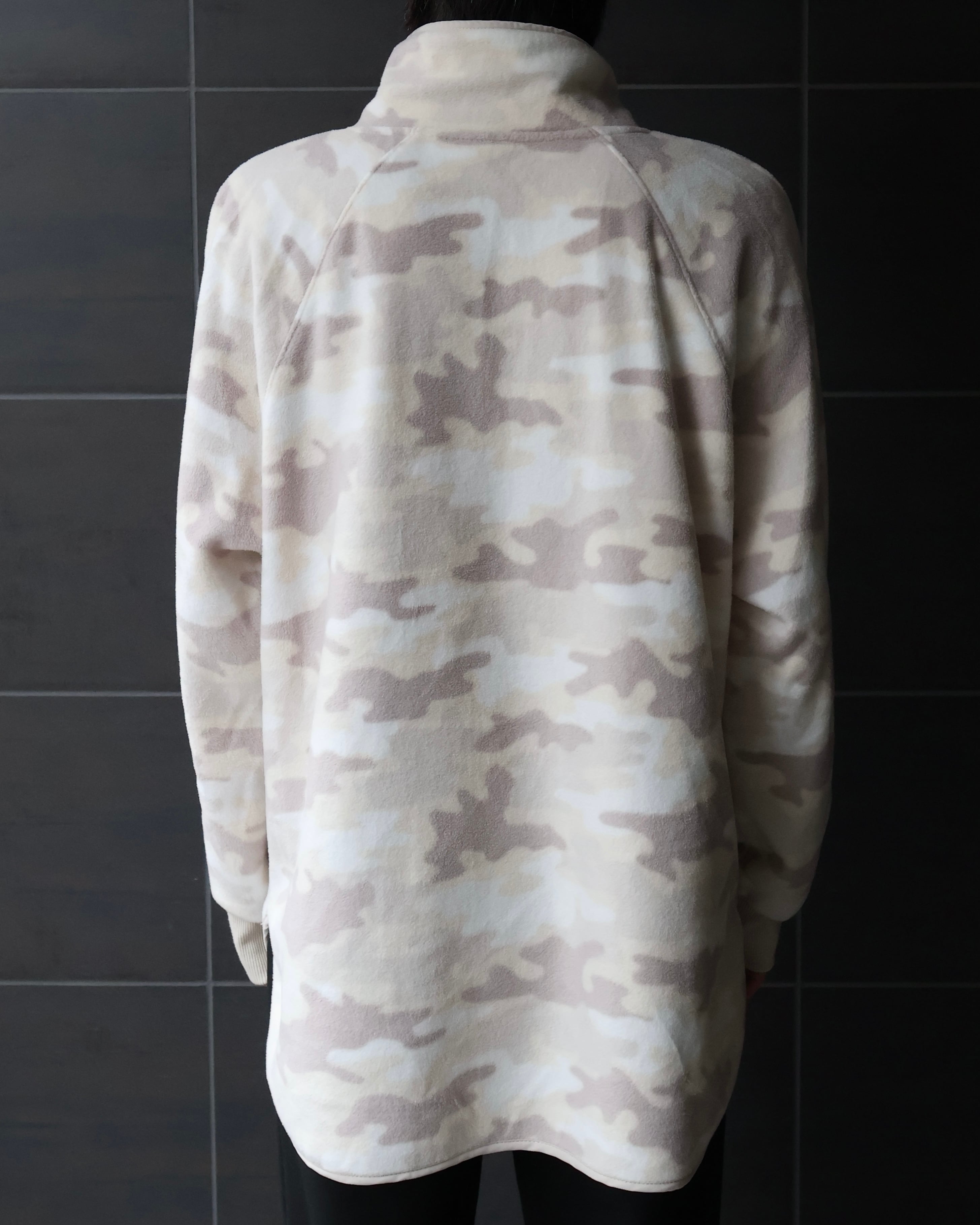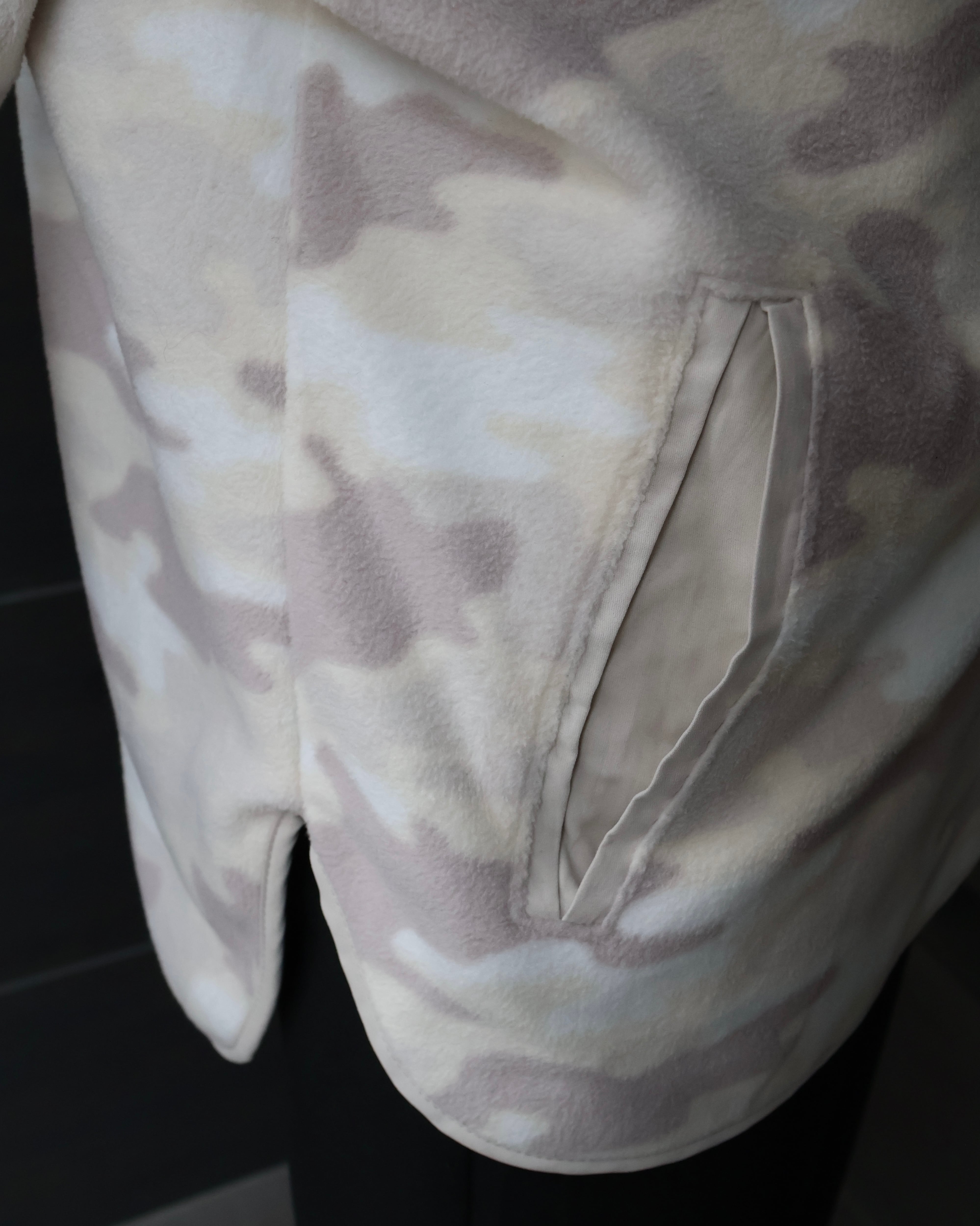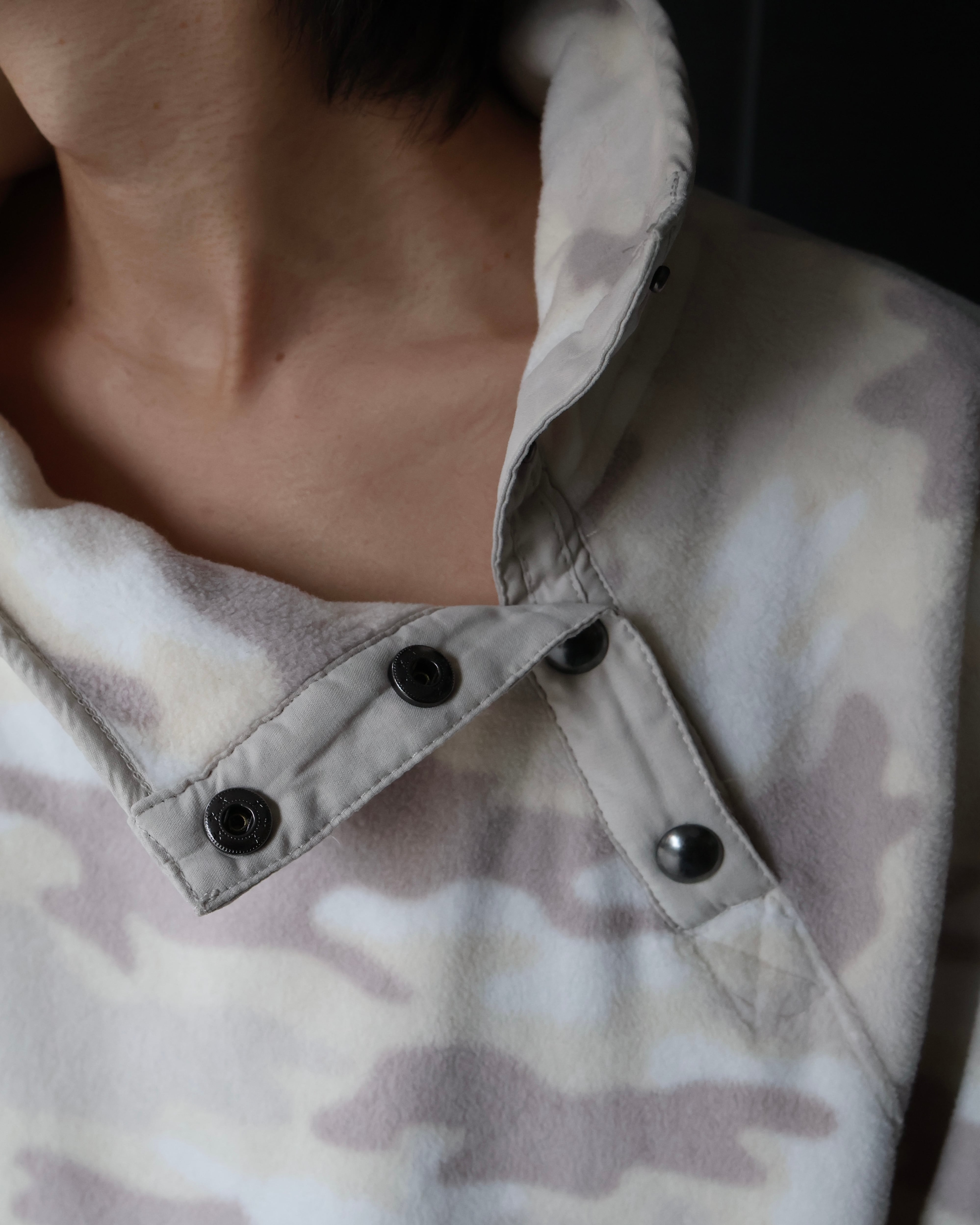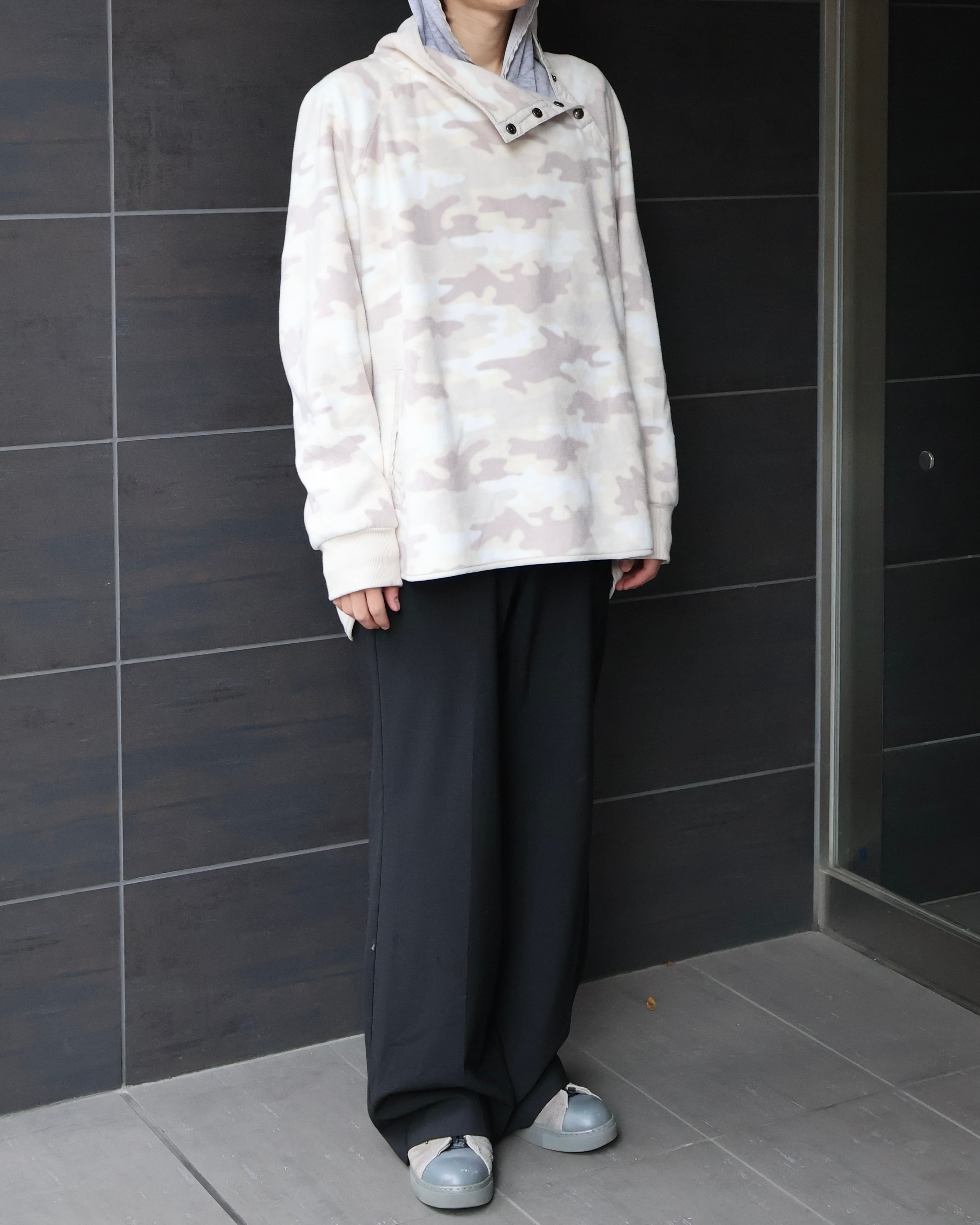 ベージュとホワイトを基調にした淡いカモフラージュ柄が、ミリタリー感を抑えた優しい印象。首元のスナップボタンで開閉できるデザインでシルエットの調整も可能。ゆったりとしたサイズ感で、アウターのインナーとしても一枚着としても使える万能アイテム。