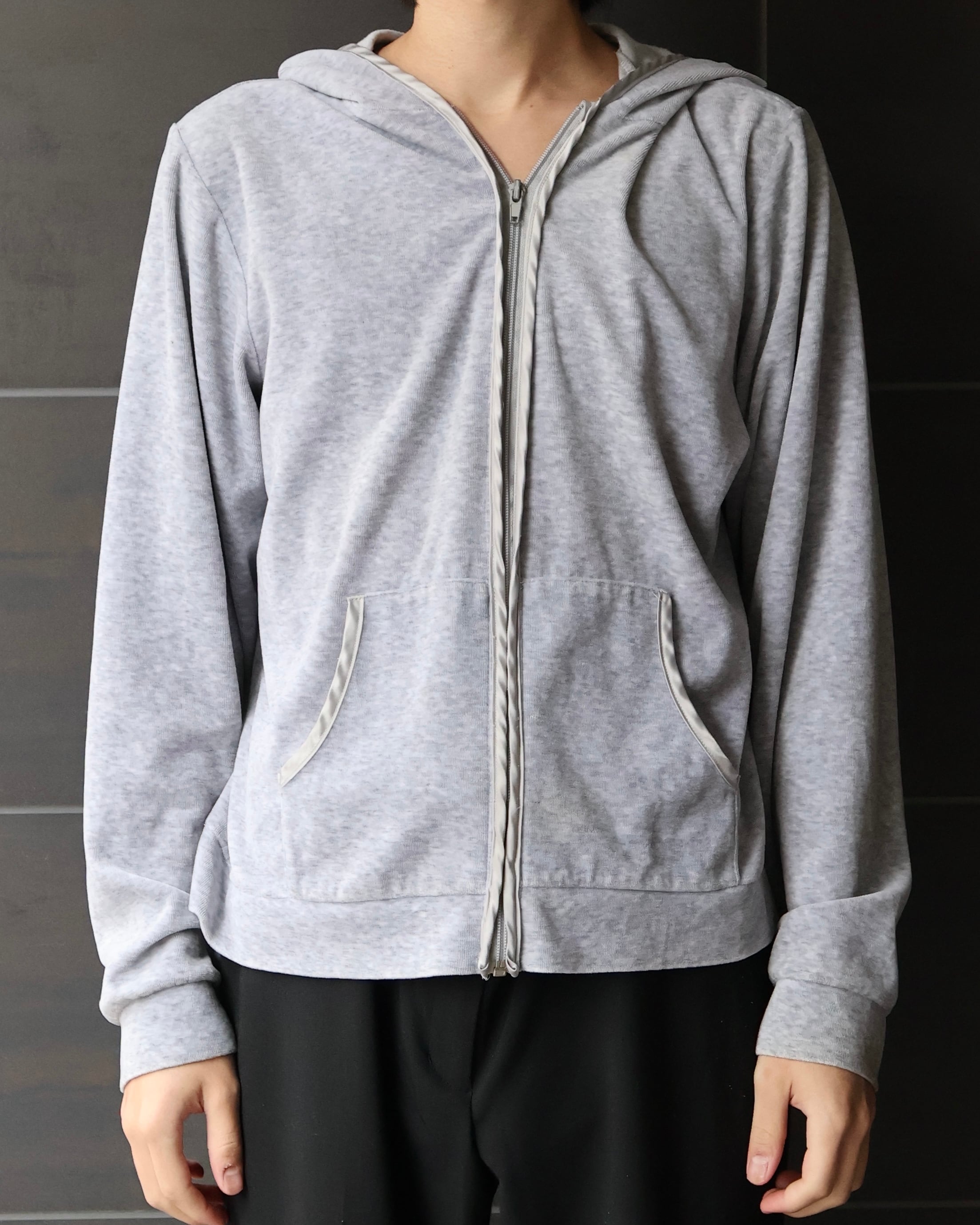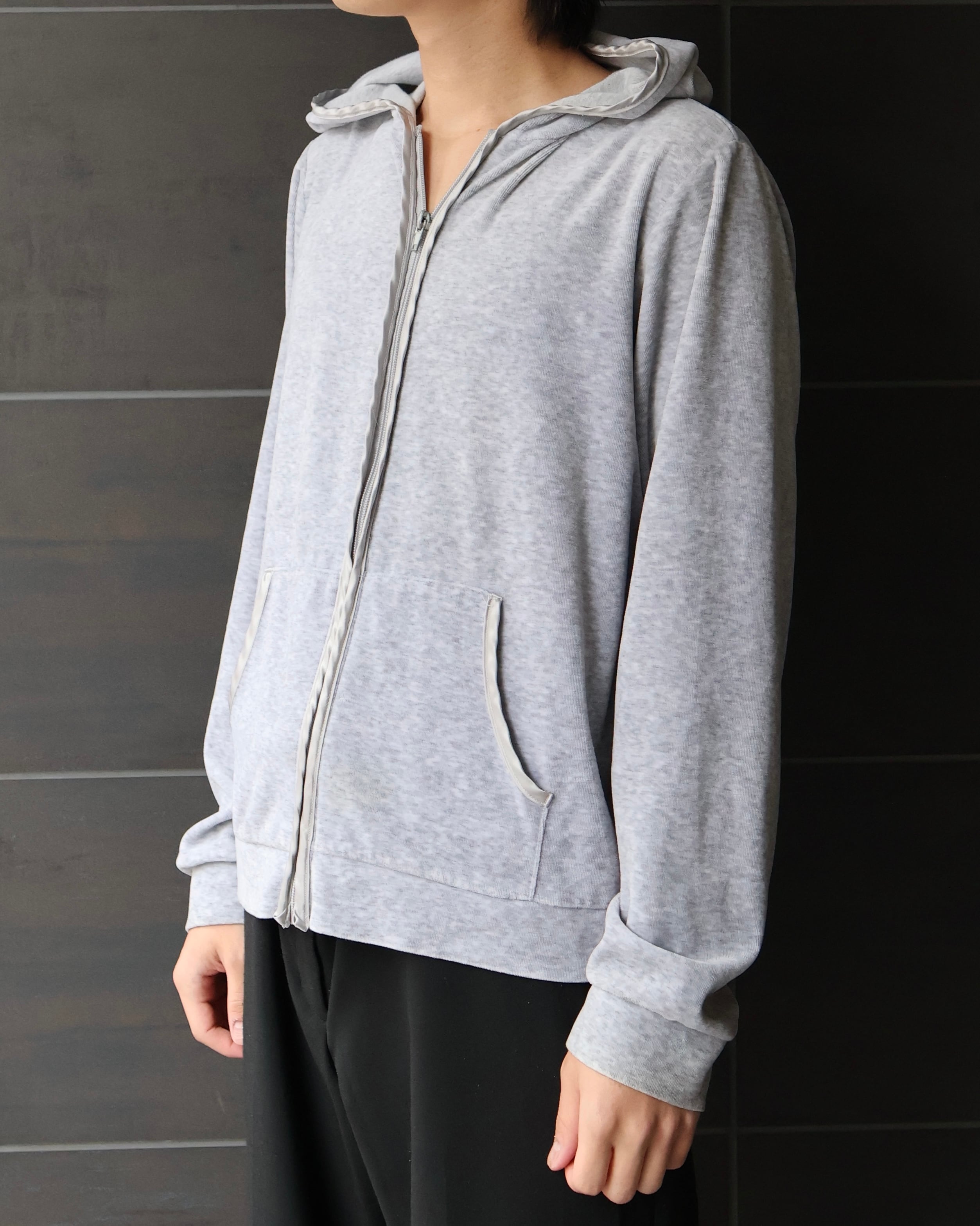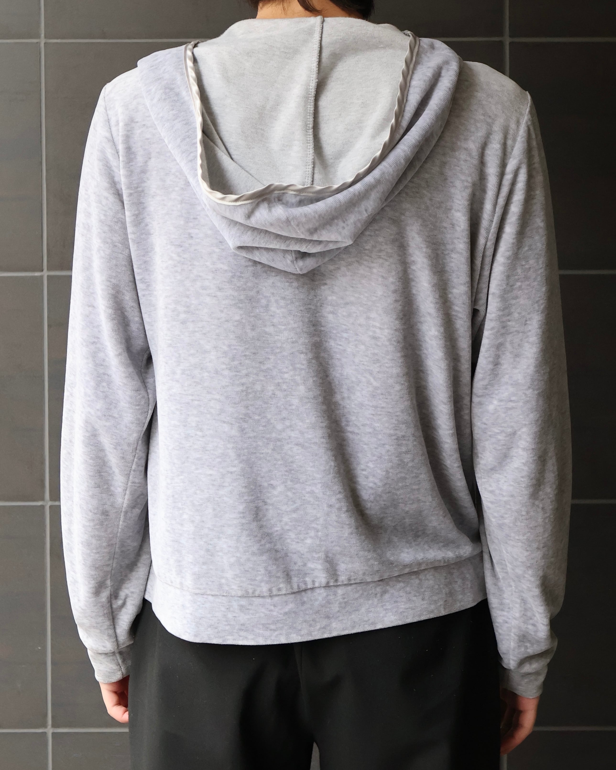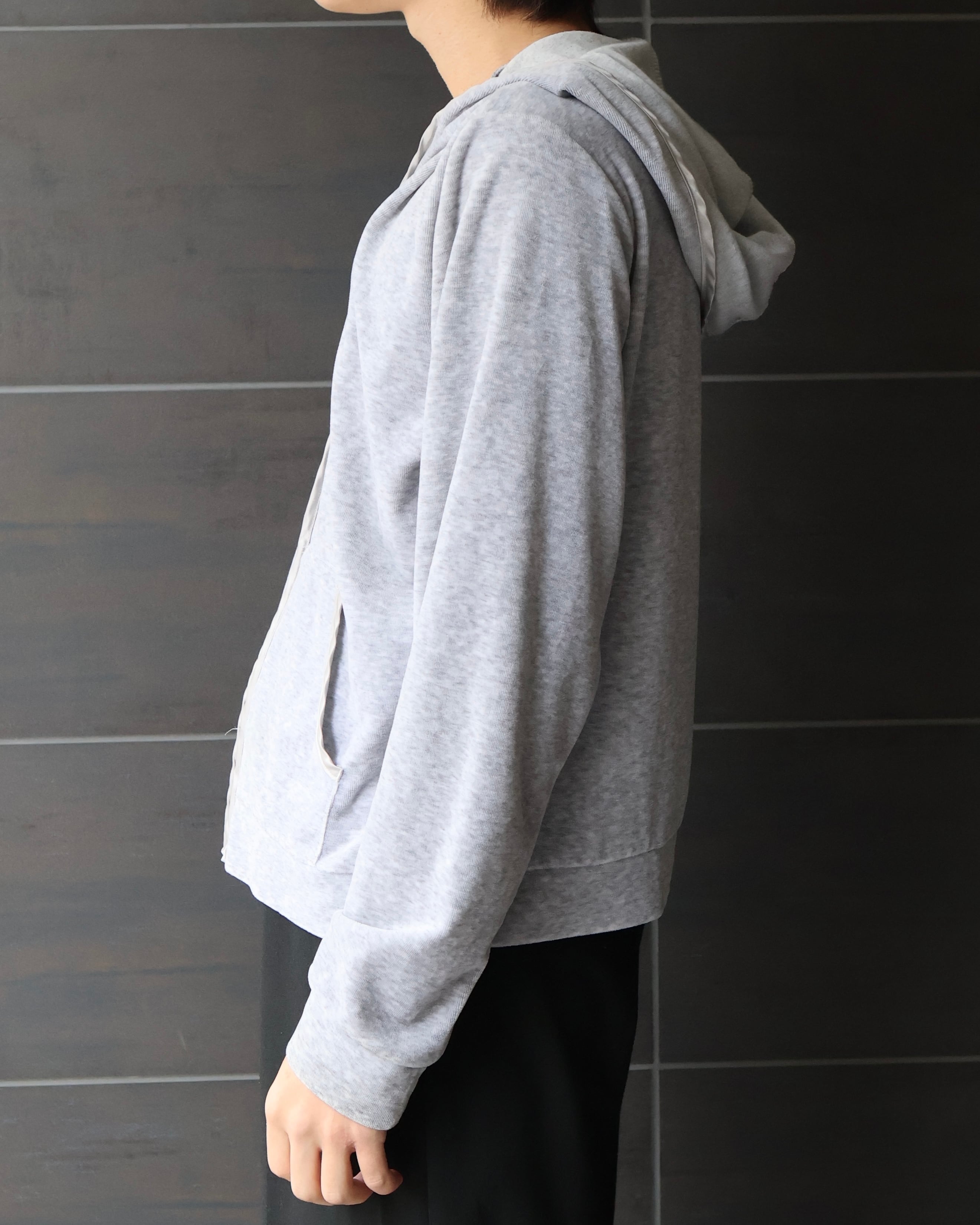 柔らかな素材を使用しており、ほどよい伸縮性とリラックス感のあるフィットが特徴。フロントのジップやポケット口には同系色のトリムが施され、シンプルながらも上品な印象のアイテム。