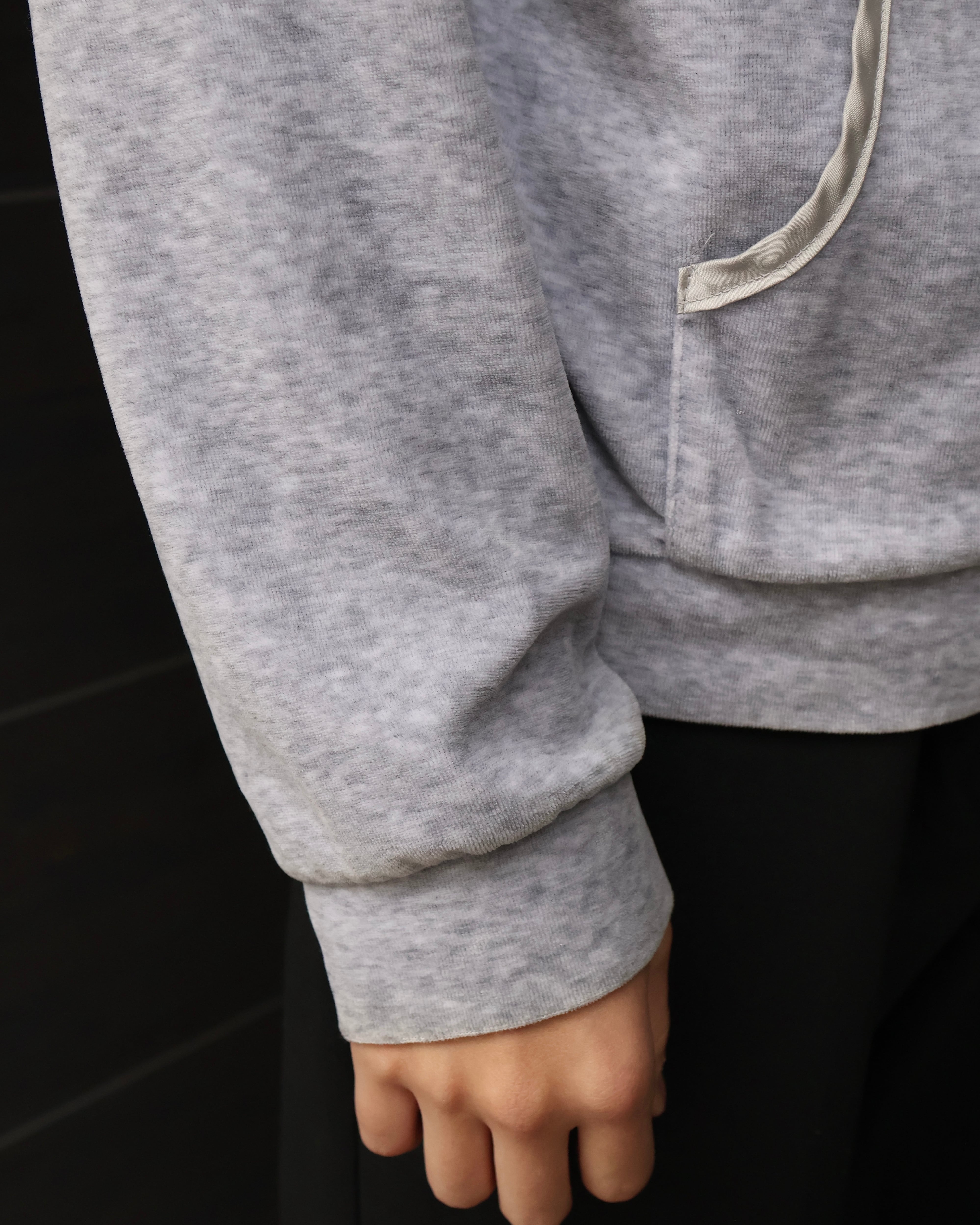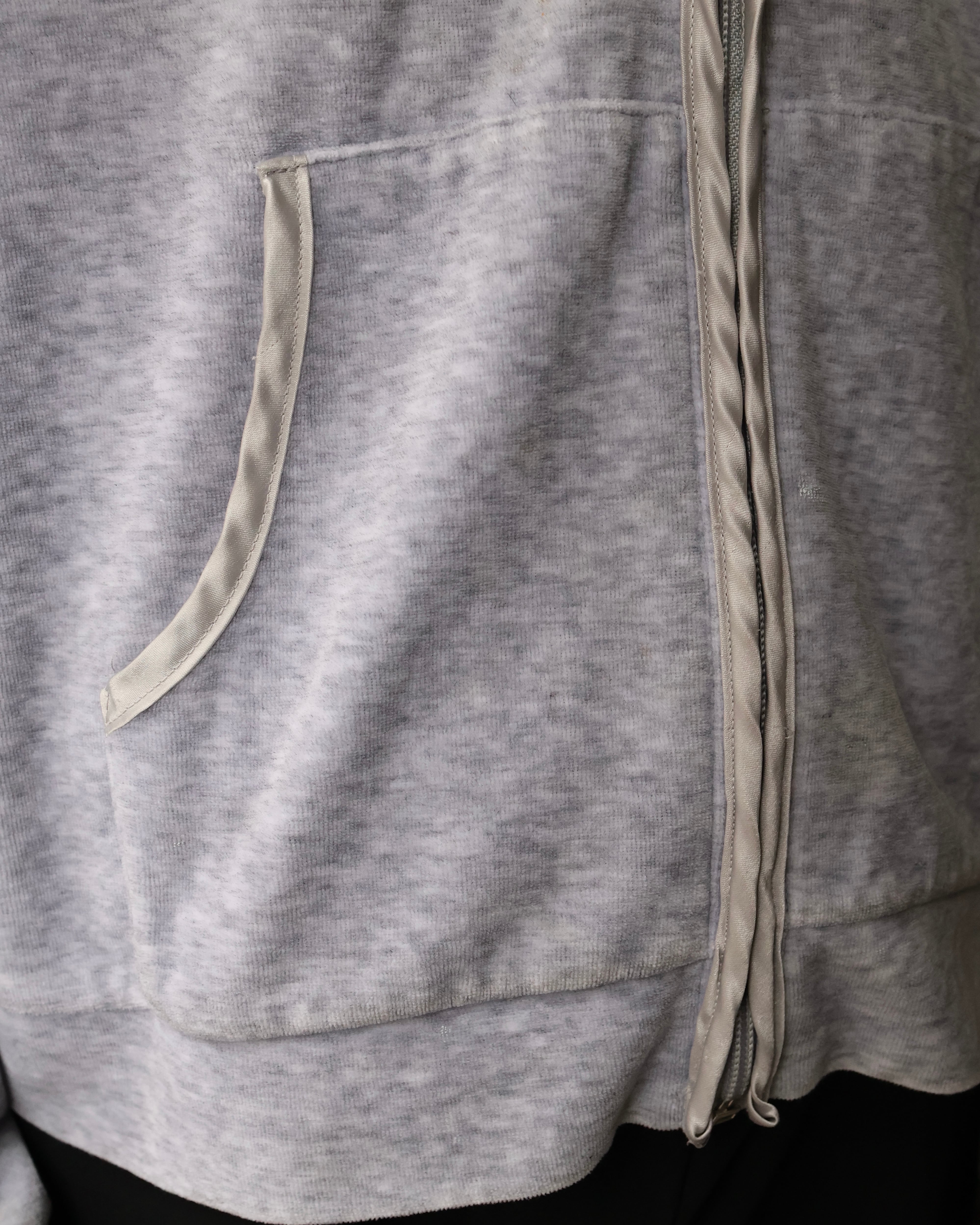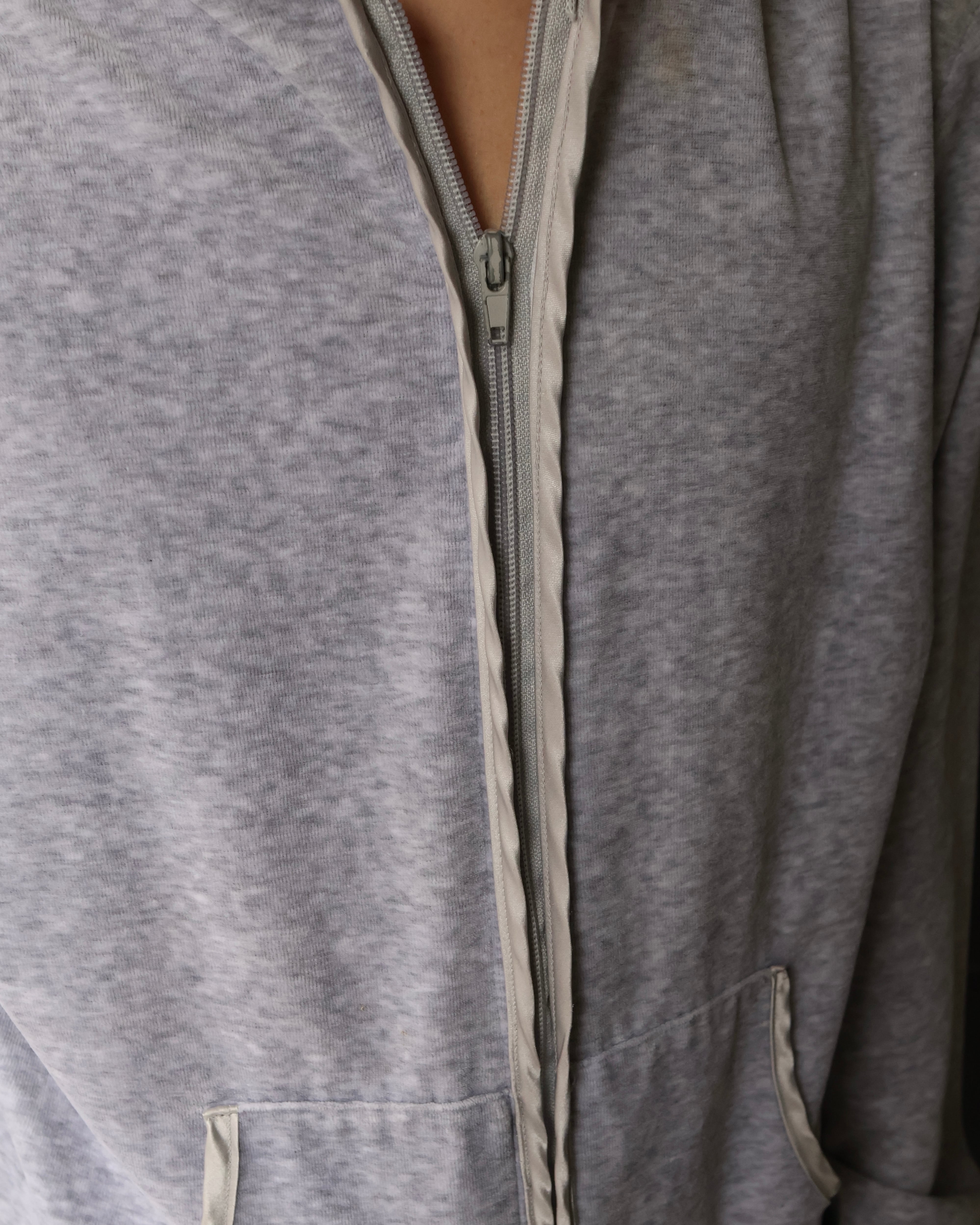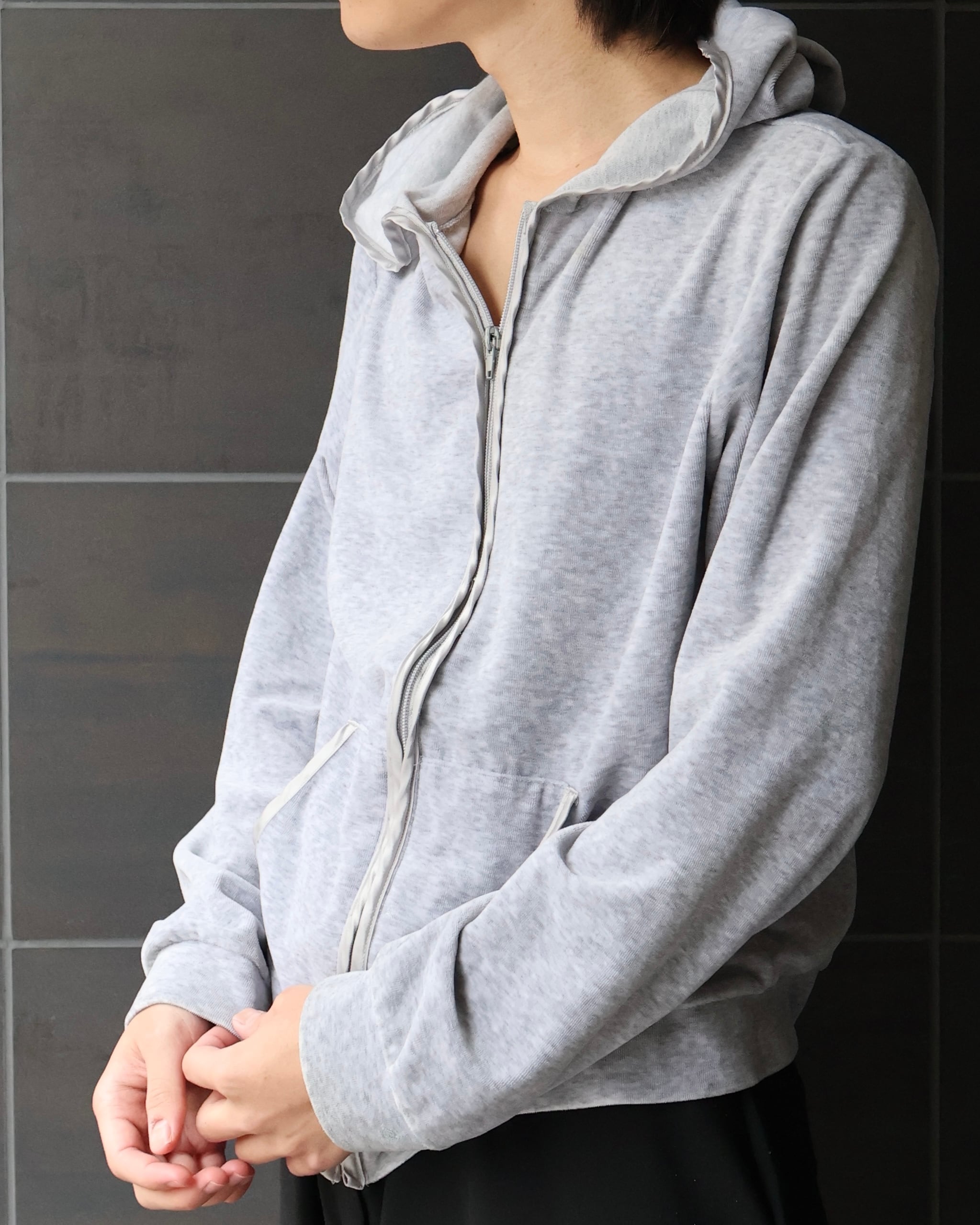 柔らかな素材を使用しており、ほどよい伸縮性とリラックス感のあるフィットが特徴。フロントのジップやポケット口には同系色のトリムが施され、シンプルながらも上品な印象のアイテム。