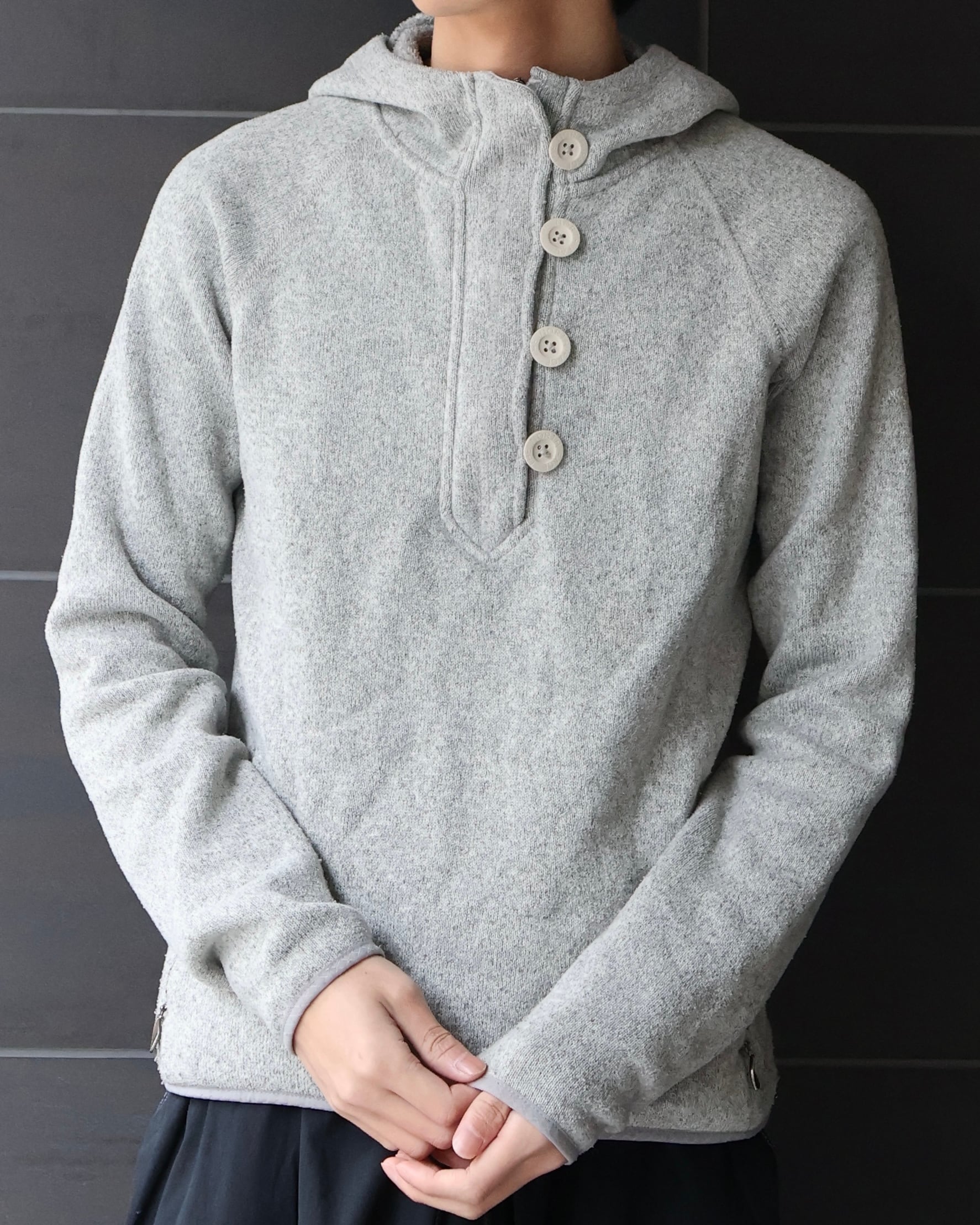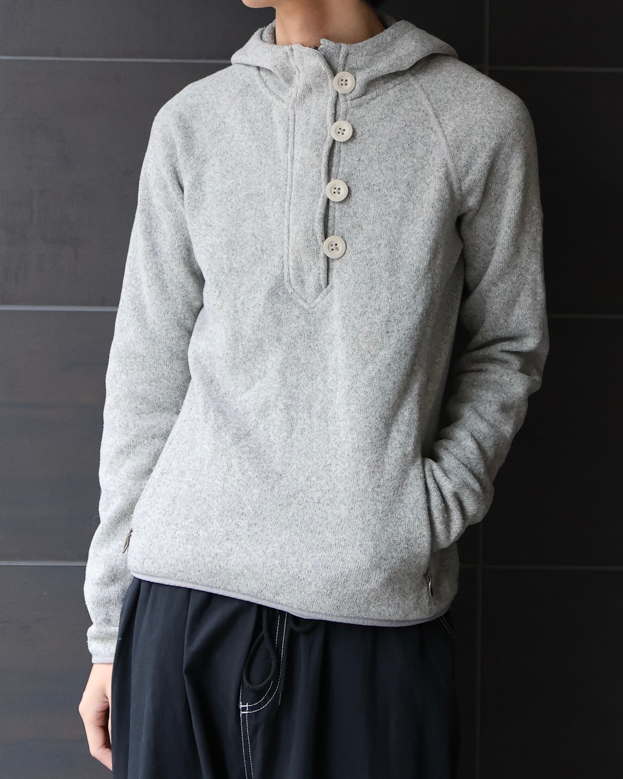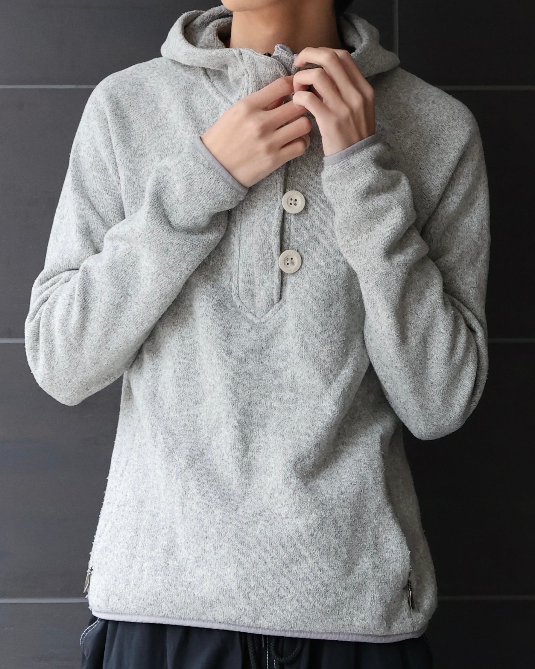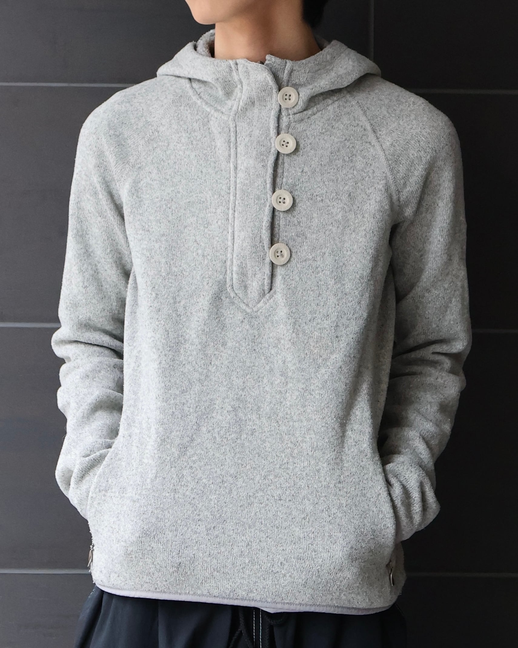 首元に配された4つの大ぶりなボタンが特徴で、開け方によって印象を変えられるデザイン。軽量で保温性が高く、秋冬のレイヤードスタイルに最適。アウトドアシーンはもちろん、タウンユースにも馴染む一着。