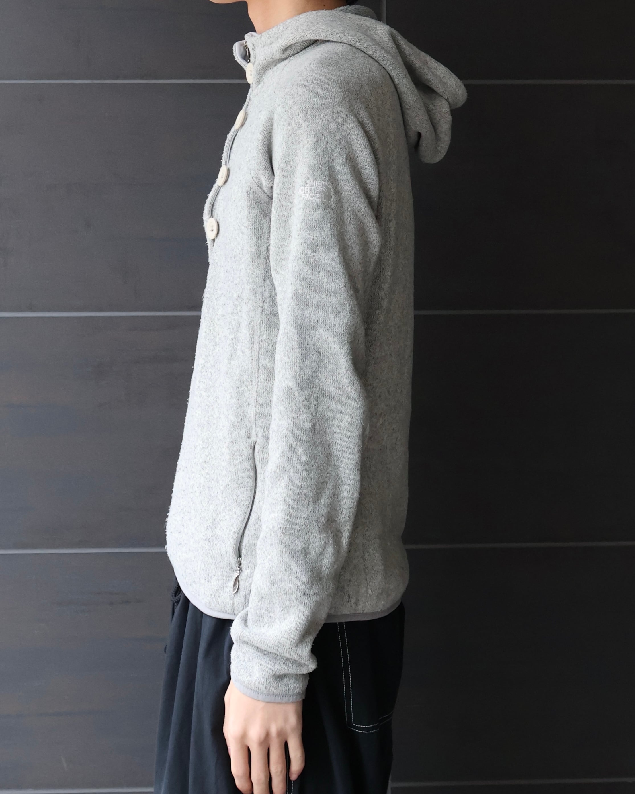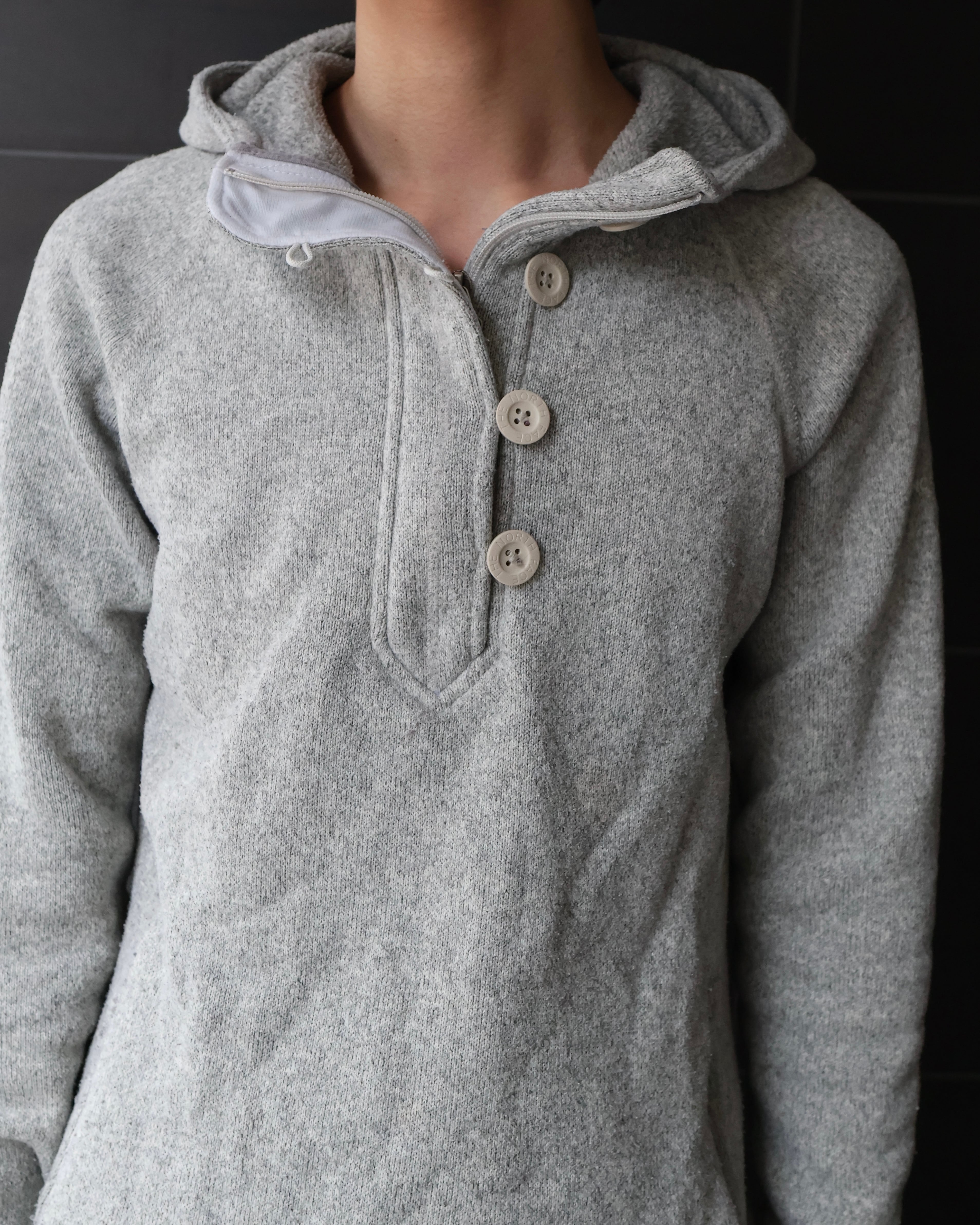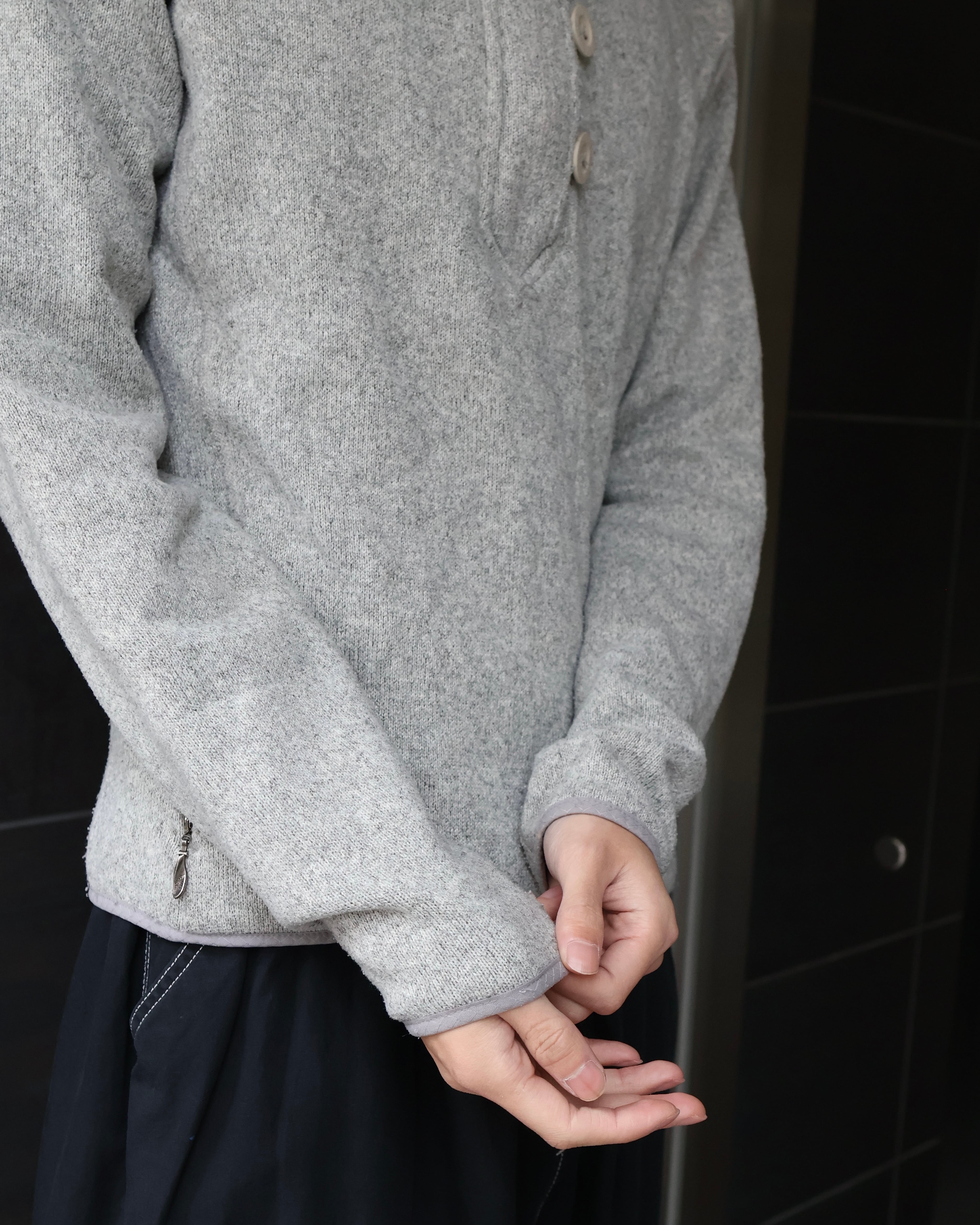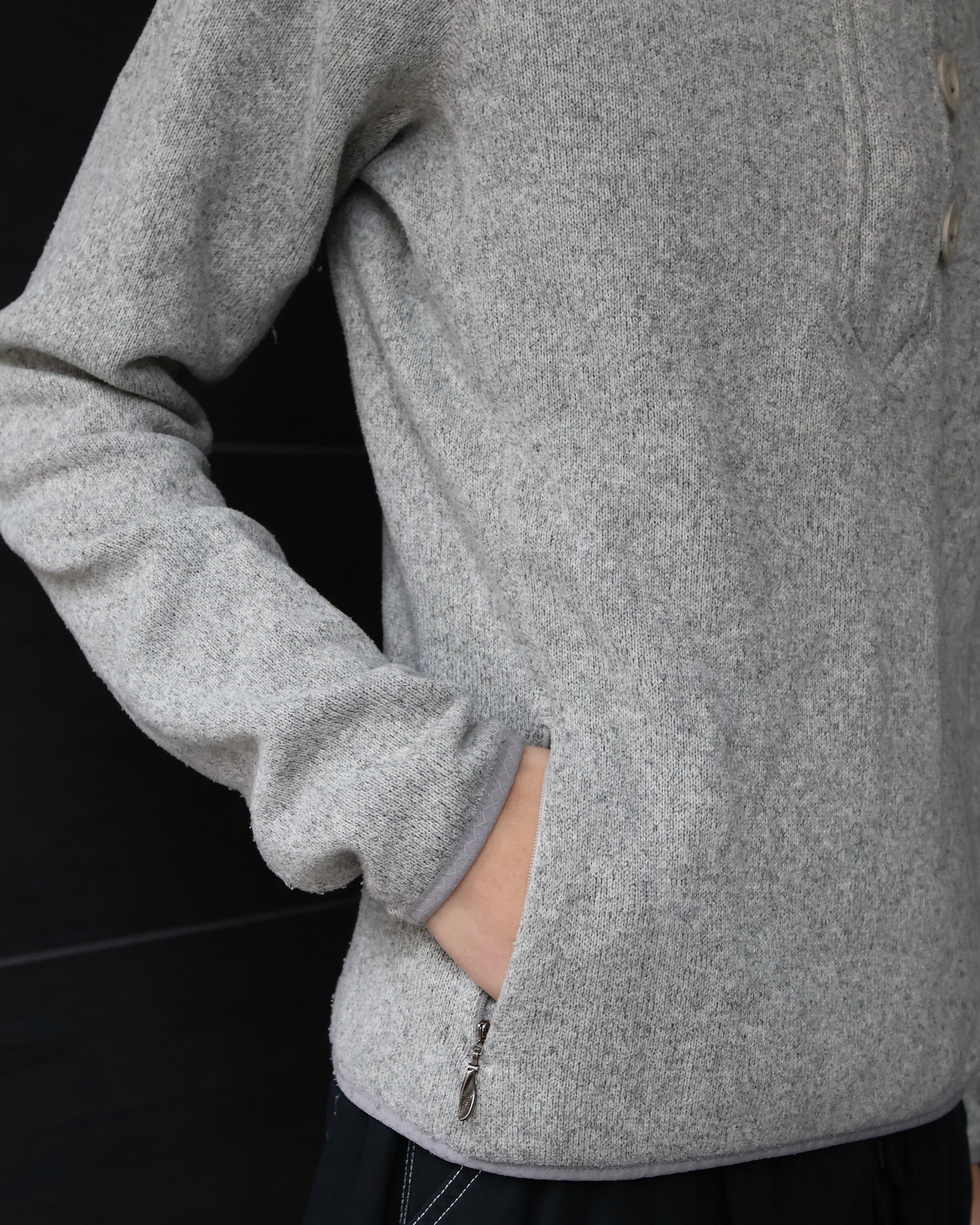 首元に配された4つの大ぶりなボタンが特徴で、開け方によって印象を変えられるデザイン。軽量で保温性が高く、秋冬のレイヤードスタイルに最適。アウトドアシーンはもちろん、タウンユースにも馴染む一着。