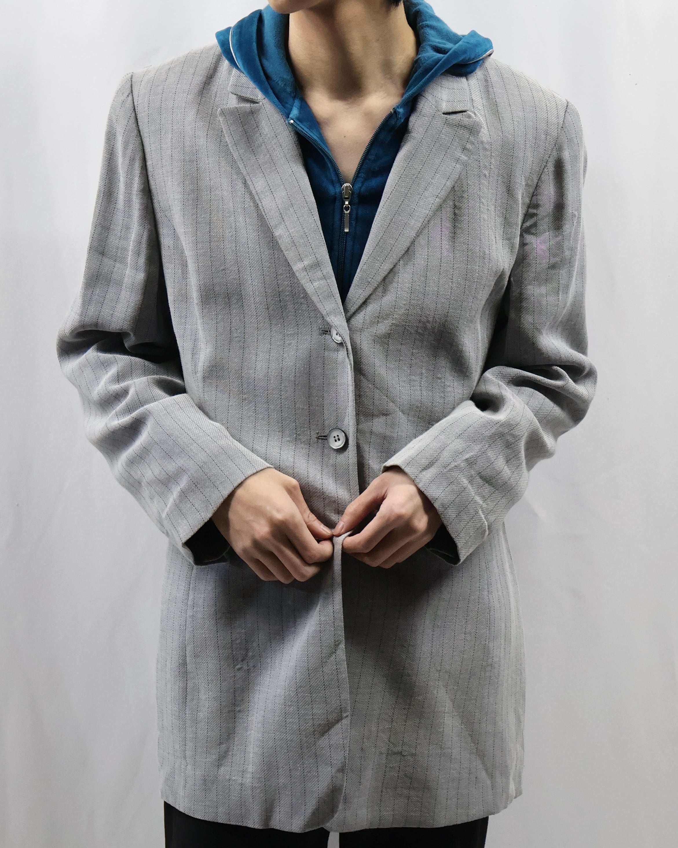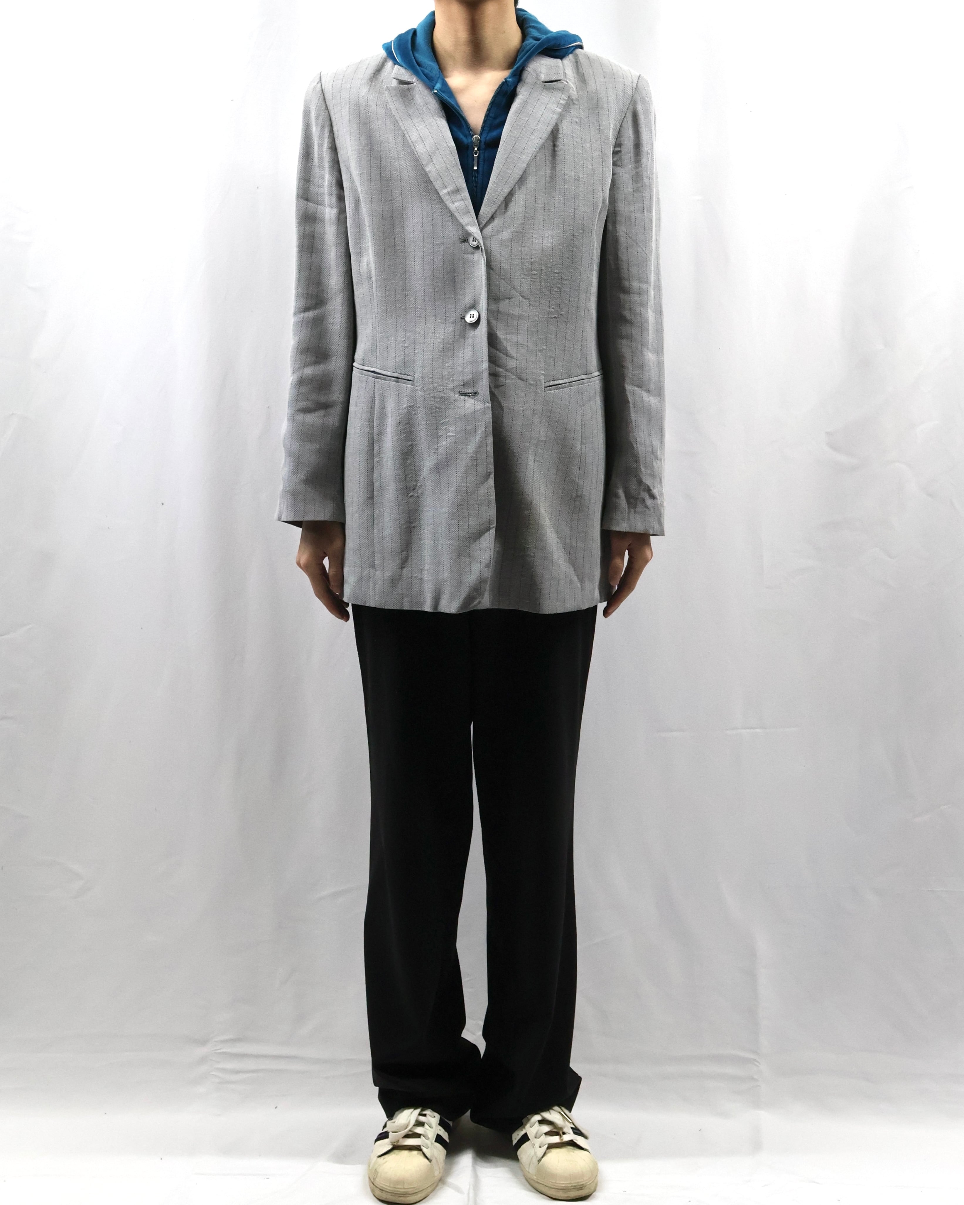 縦にすっと落ちるシルエットが特徴のピンストライプ3ボタンシングルテーラードジャケット