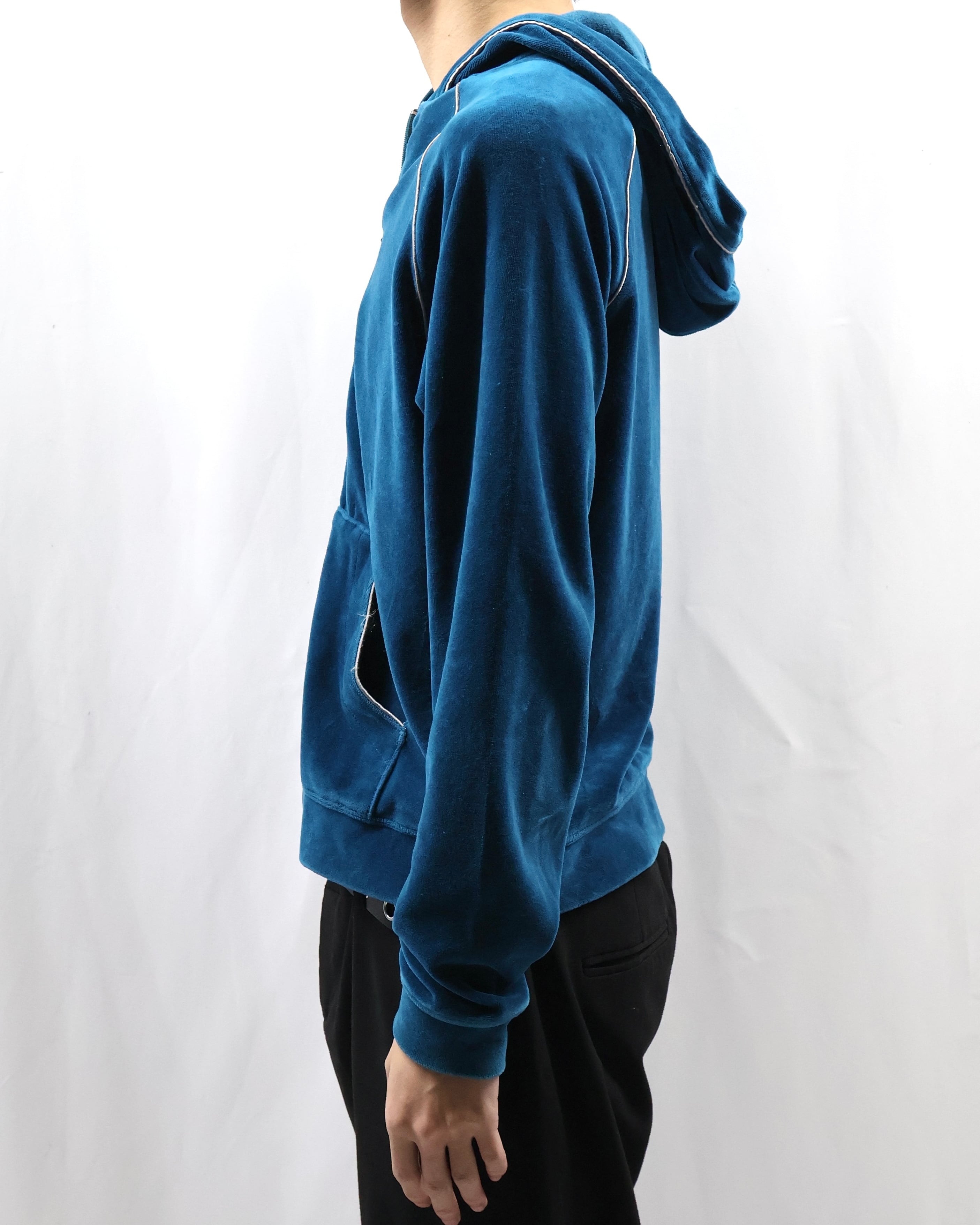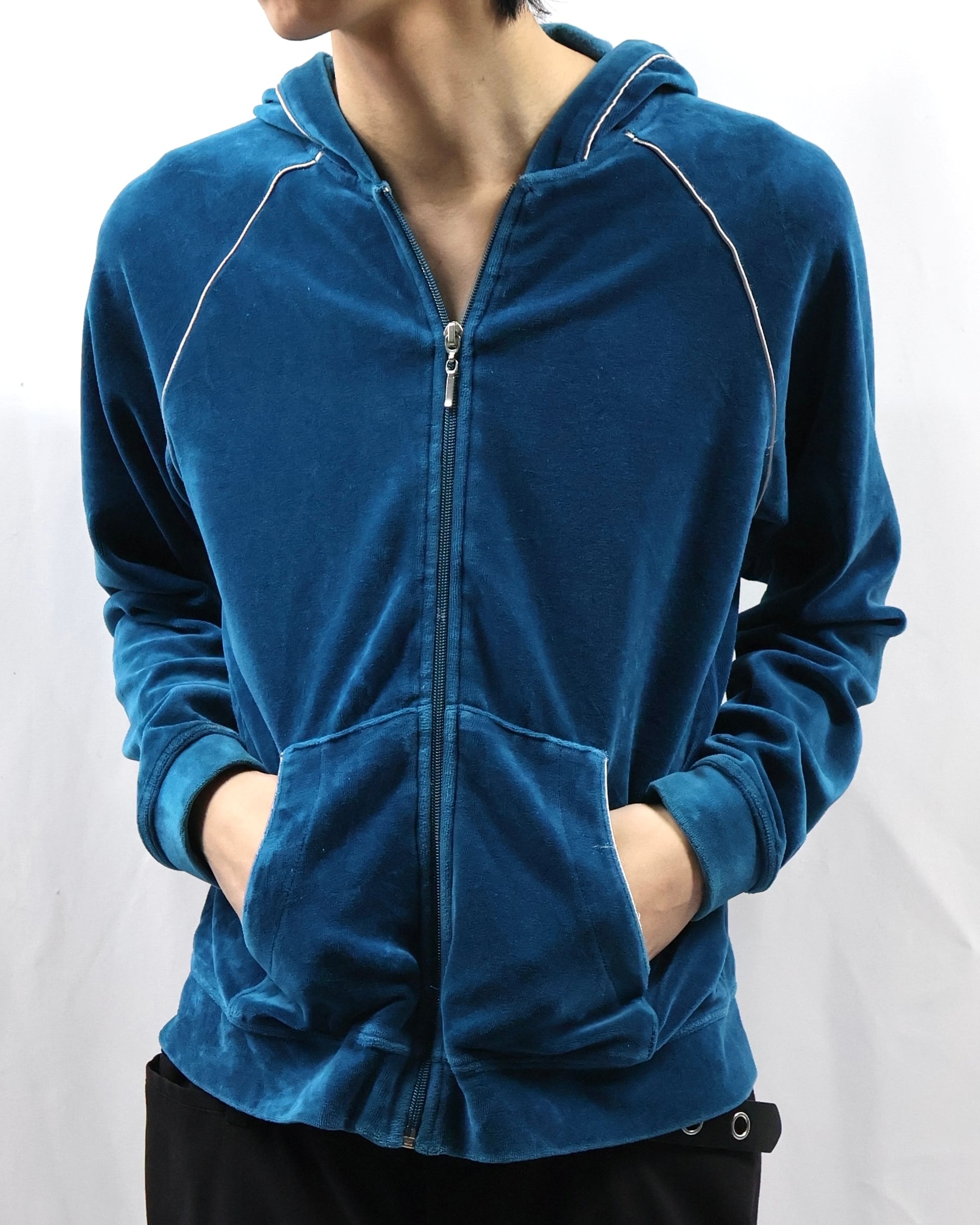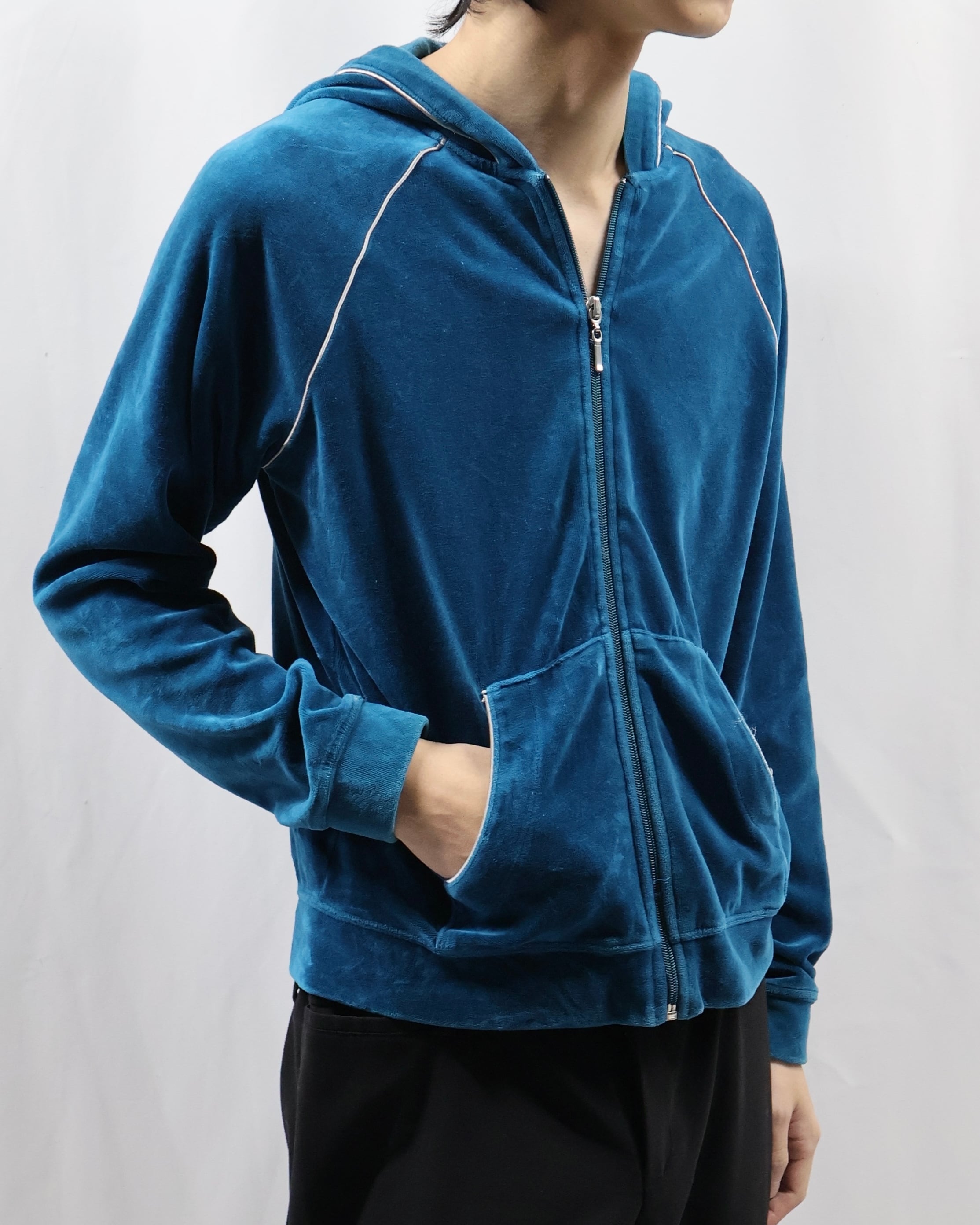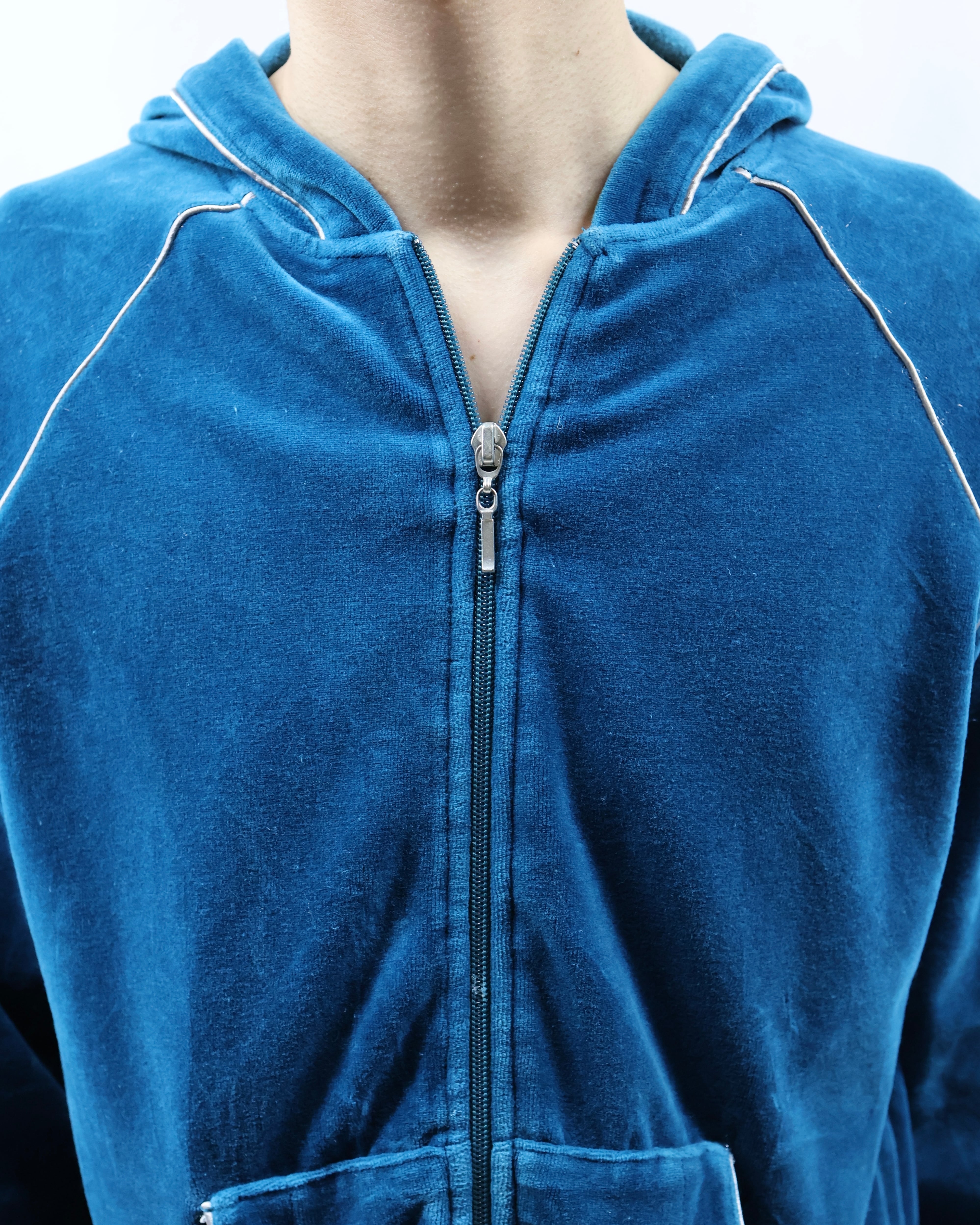 ベルベット素材特有の光沢感と深いブルーのカラーリングが特徴のジップアップフーディ