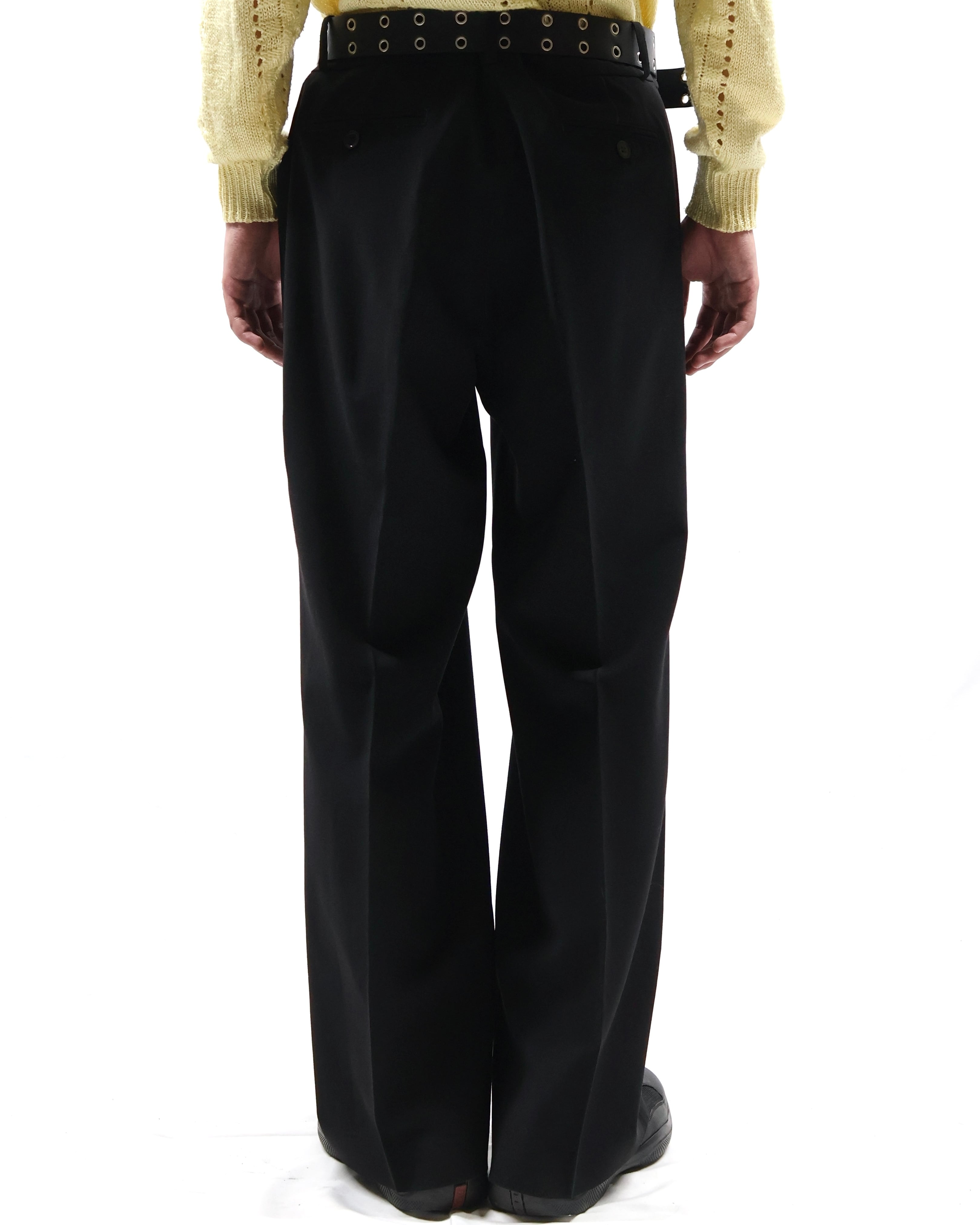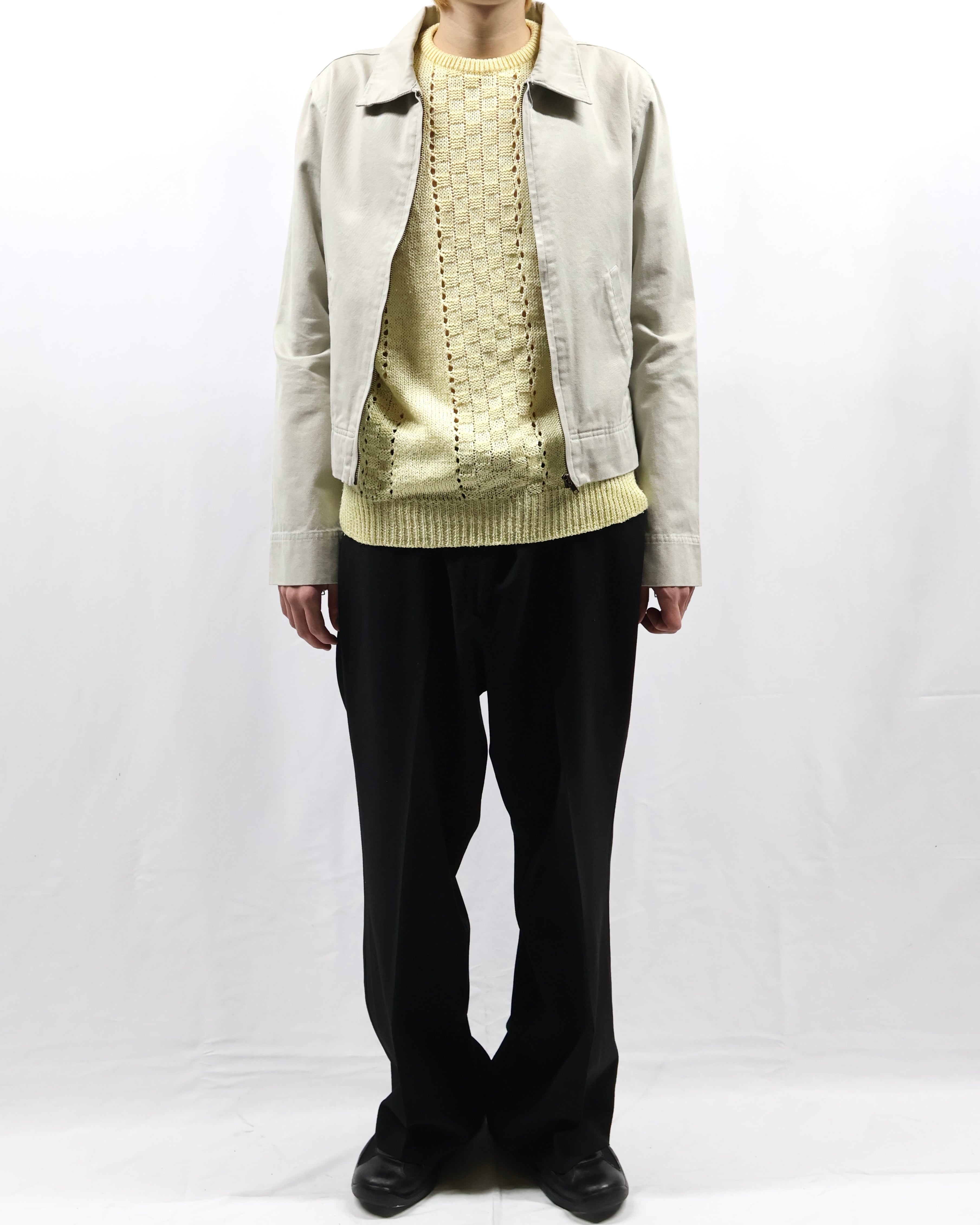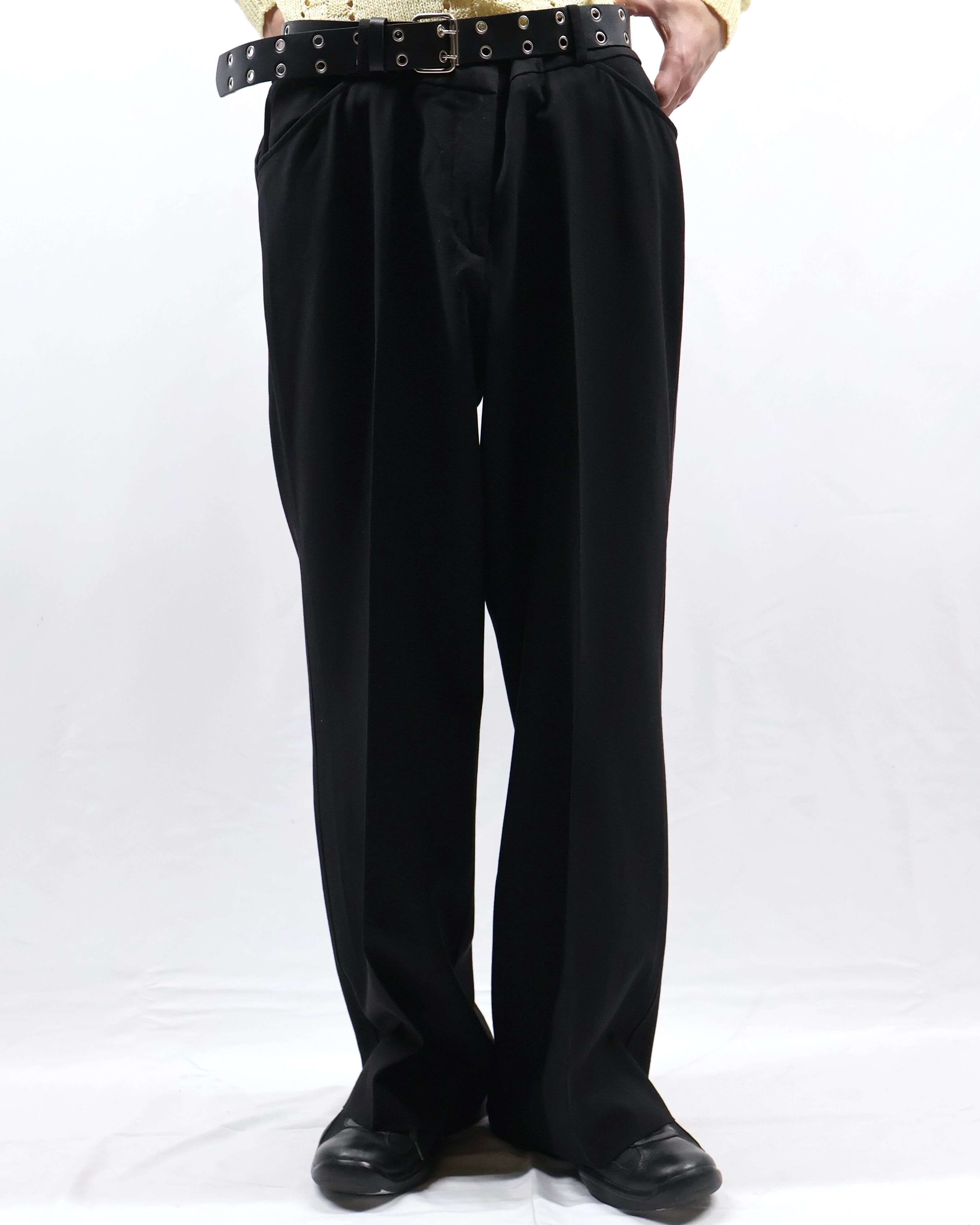 しっかりとした落ち感のある生地でセンタープレスも入っているため履いた時のシルエットが綺麗に出る一本。太すぎず細すぎないサイズ感でどんなトップスにも合わせやすいアイテム。