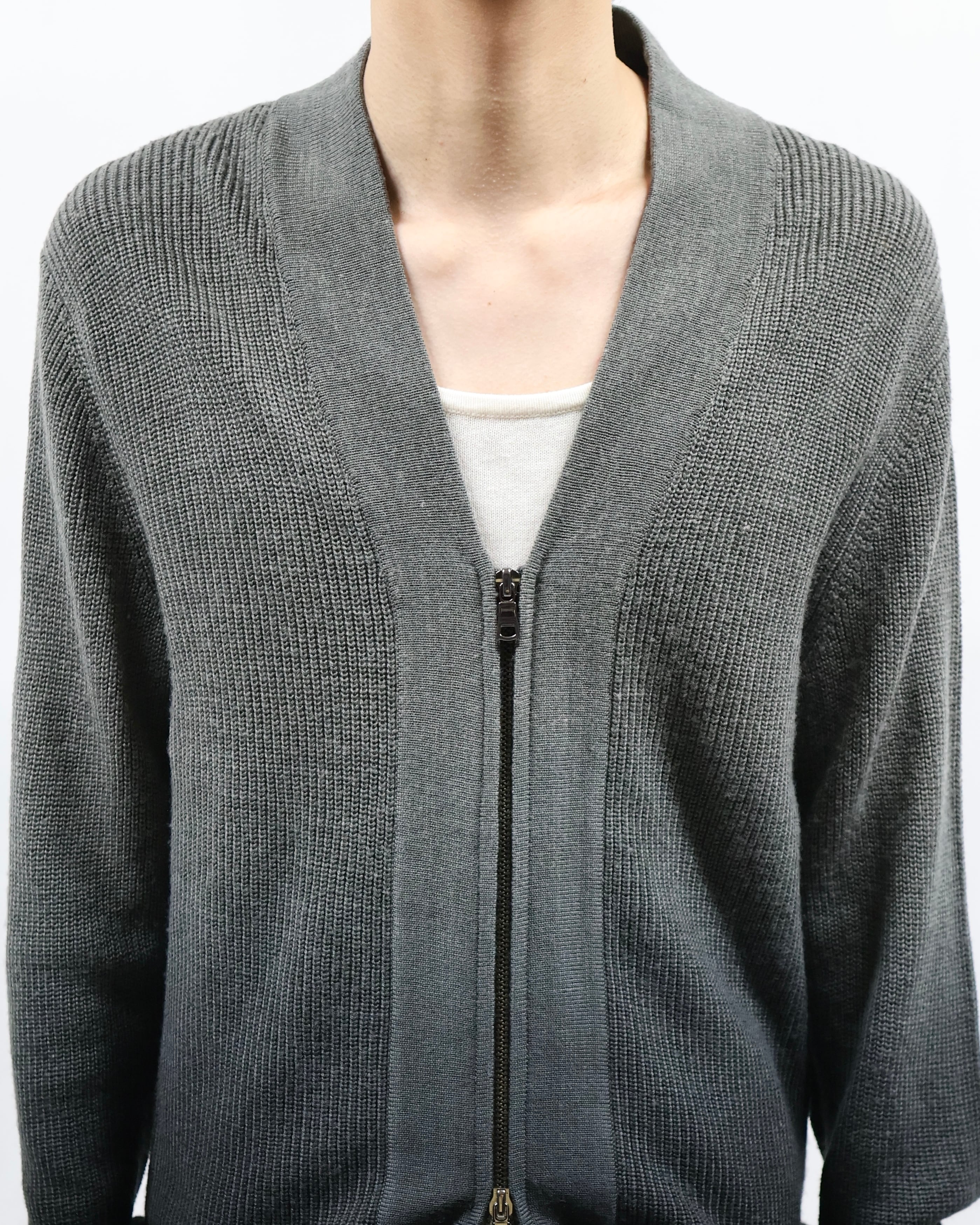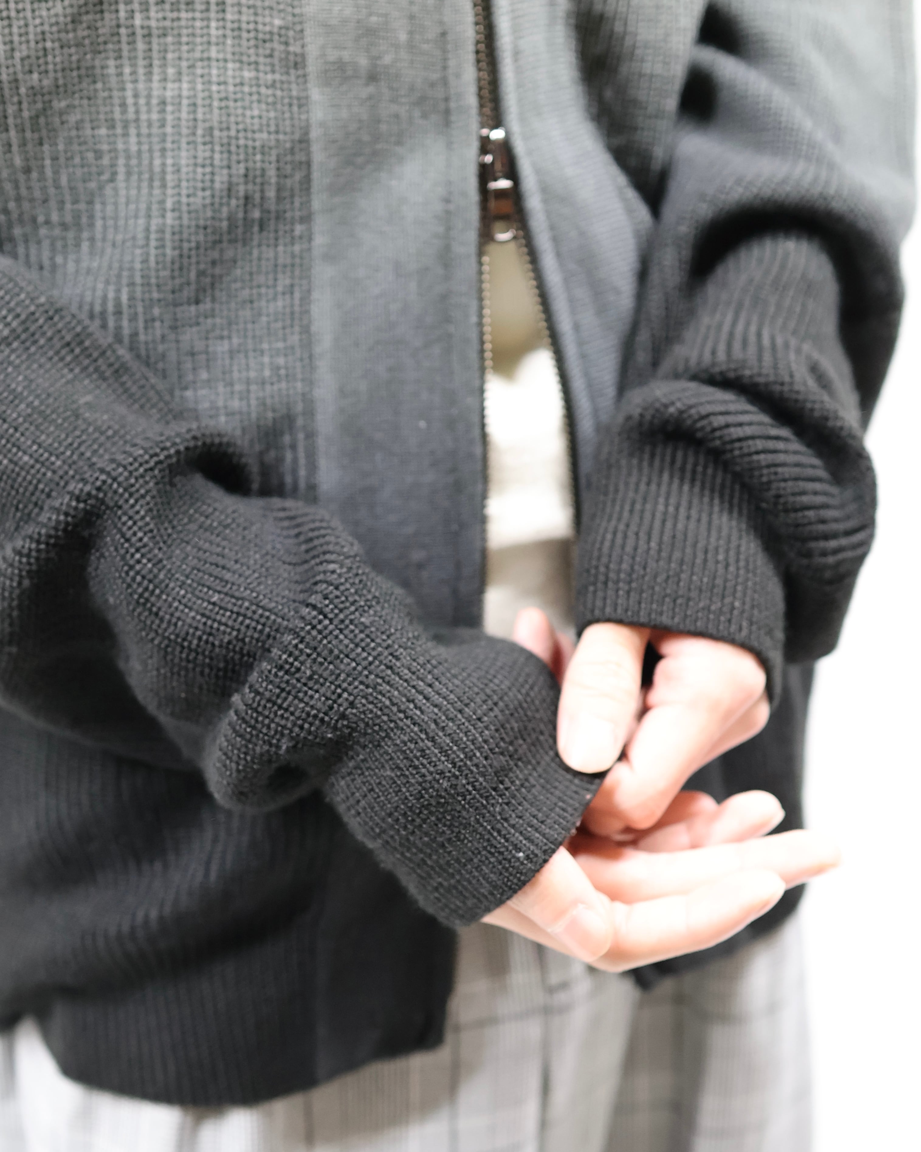 チャコールからブラックへ移り変わるグラデーションが特徴でシンプルながら存在感のある一枚。フロントはダブルジップ仕様で、着こなしに合わせてシルエット調整が可能。