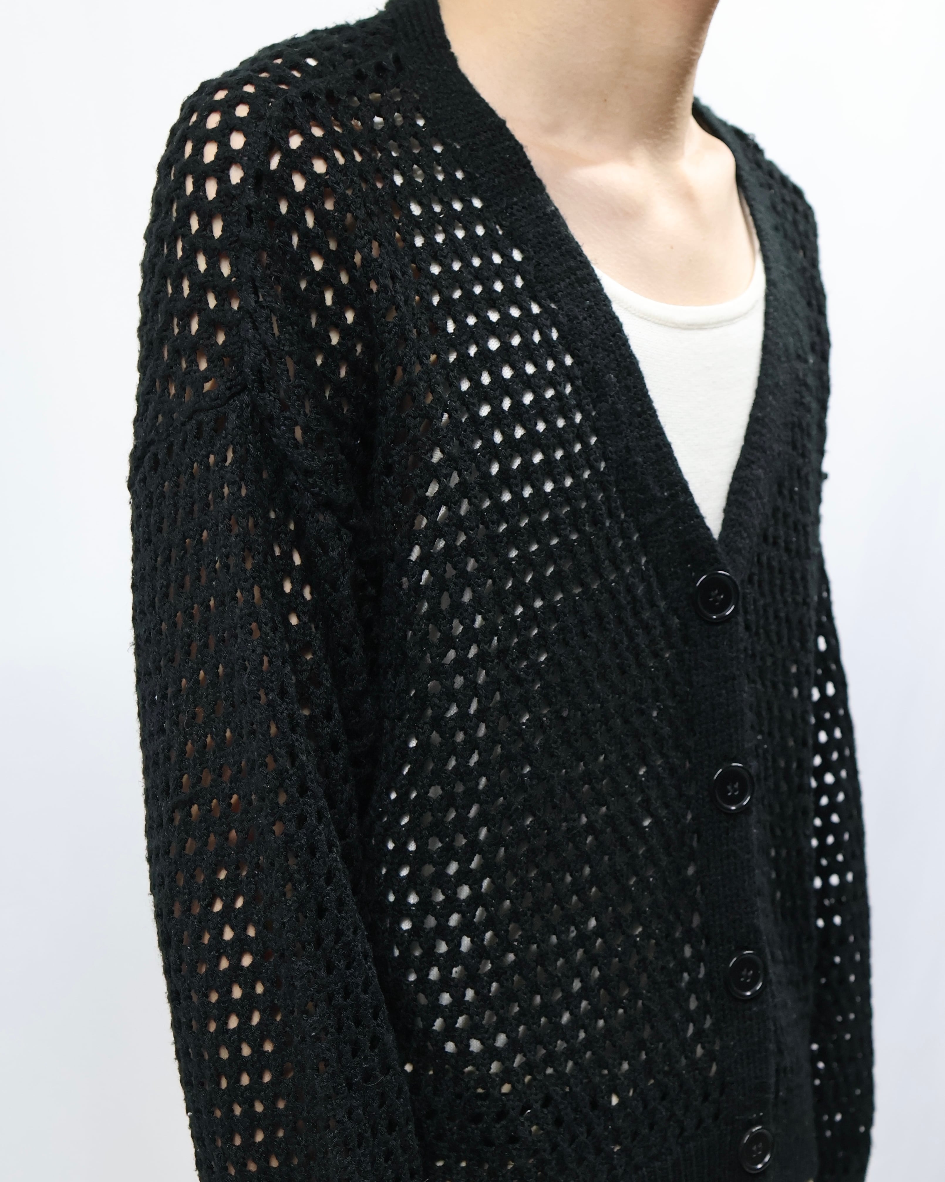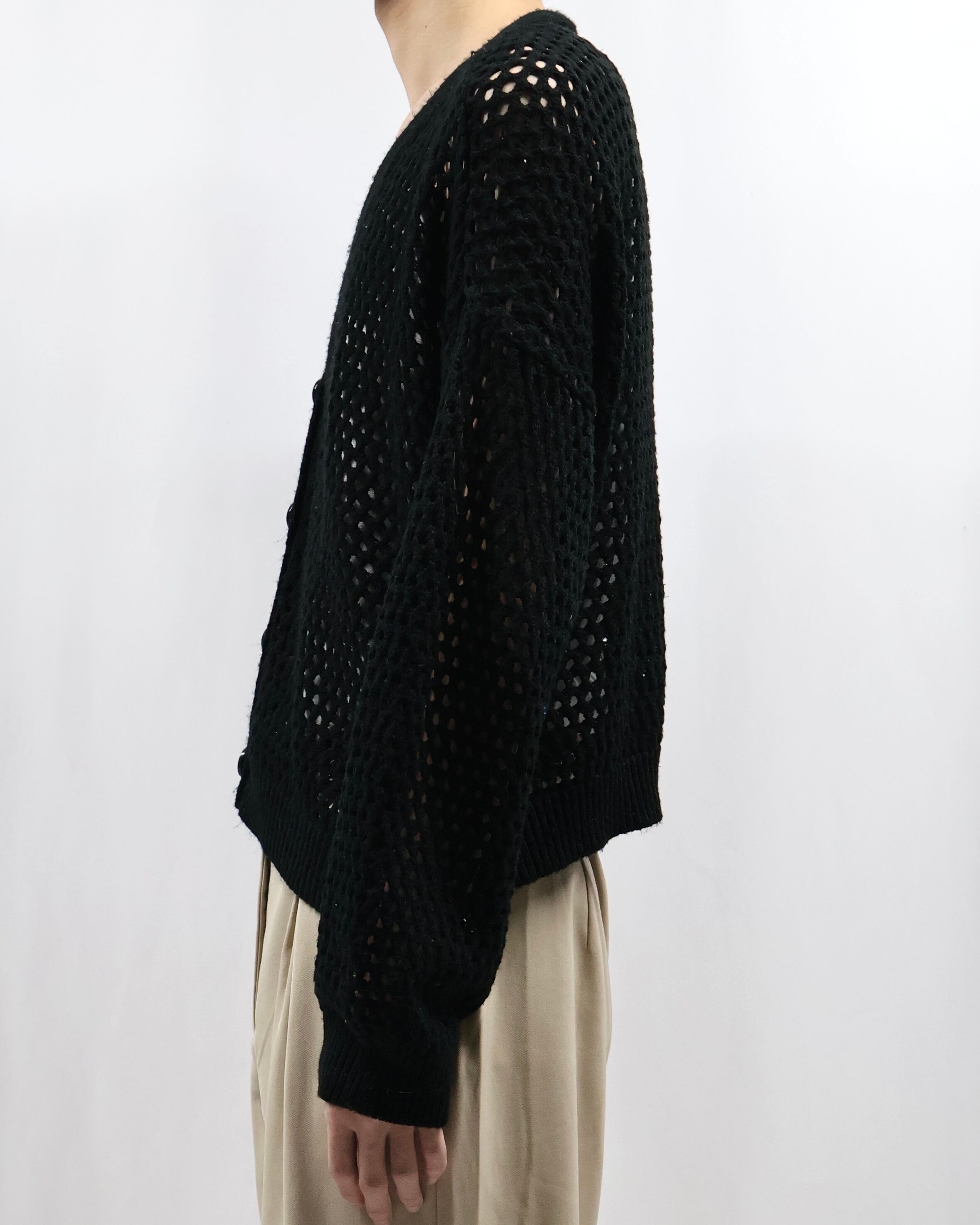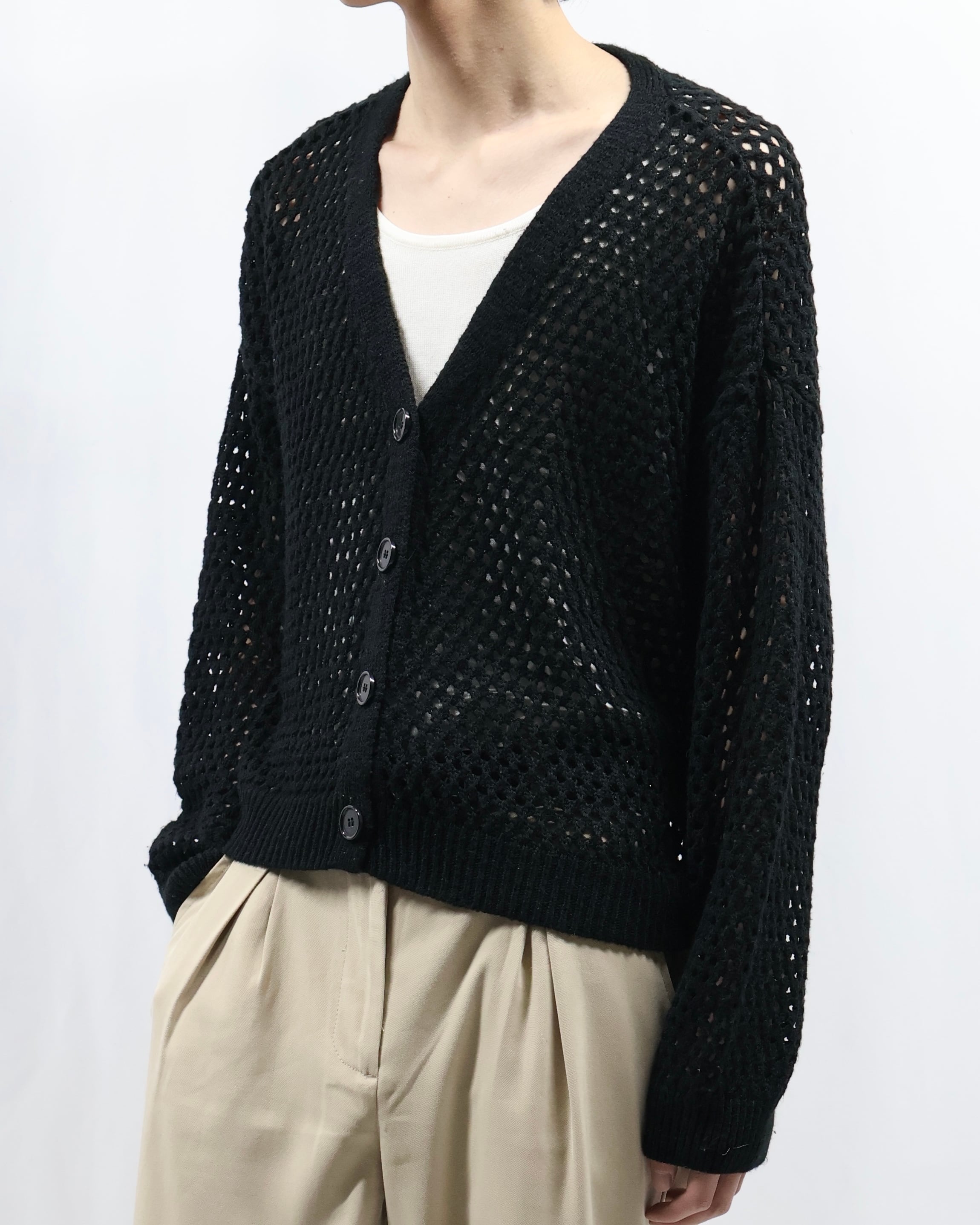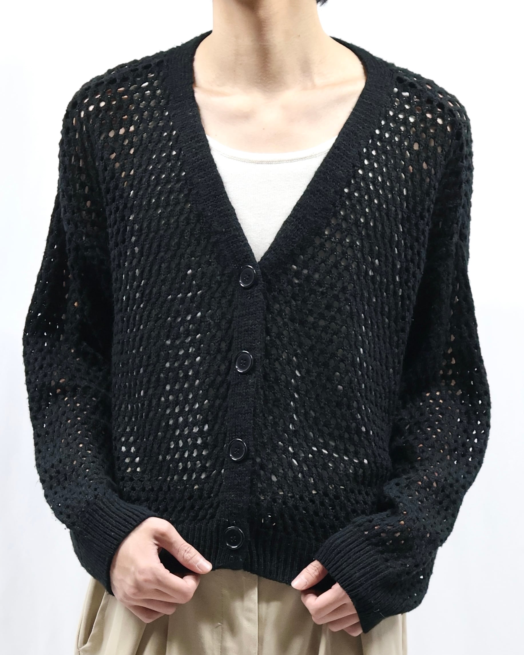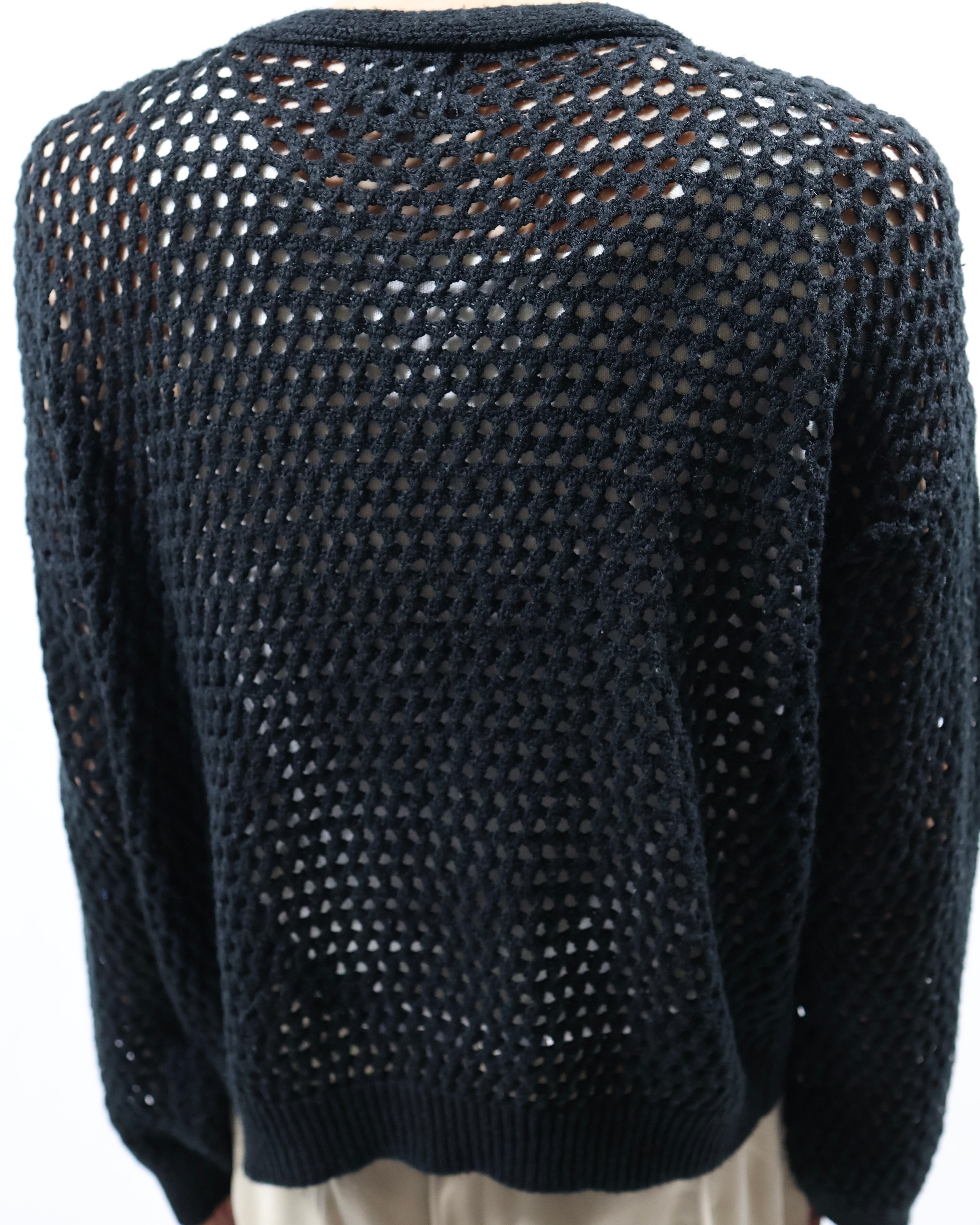 透け感のある編み地がスタイリングに抜けを与え、レイヤードを楽しめる一着。ゆったりとしたシルエットながら、着丈はコンパクトにまとめられており、カットソーやタンクトップ、シャツなど幅広いインナーとも合わせられるアイテム。