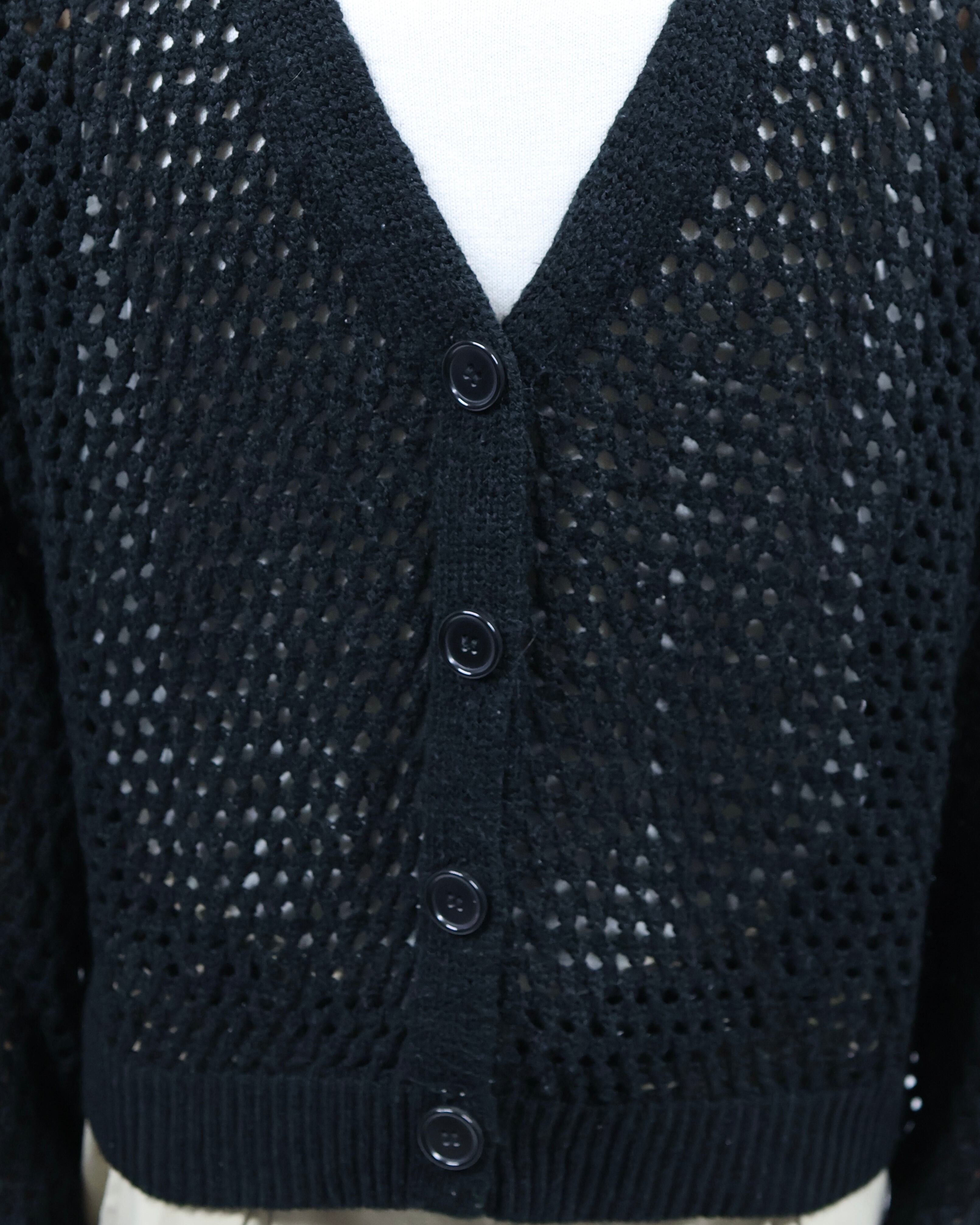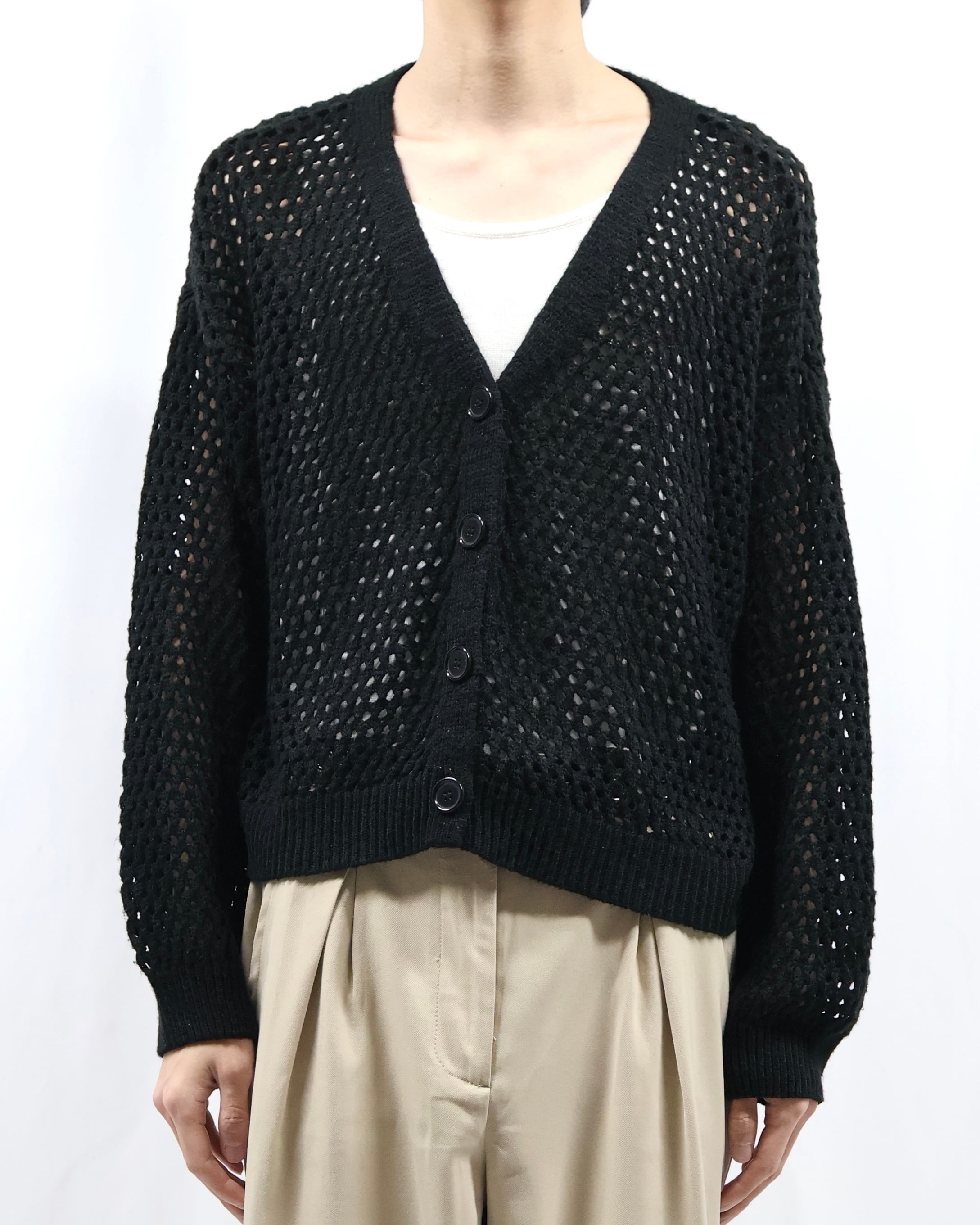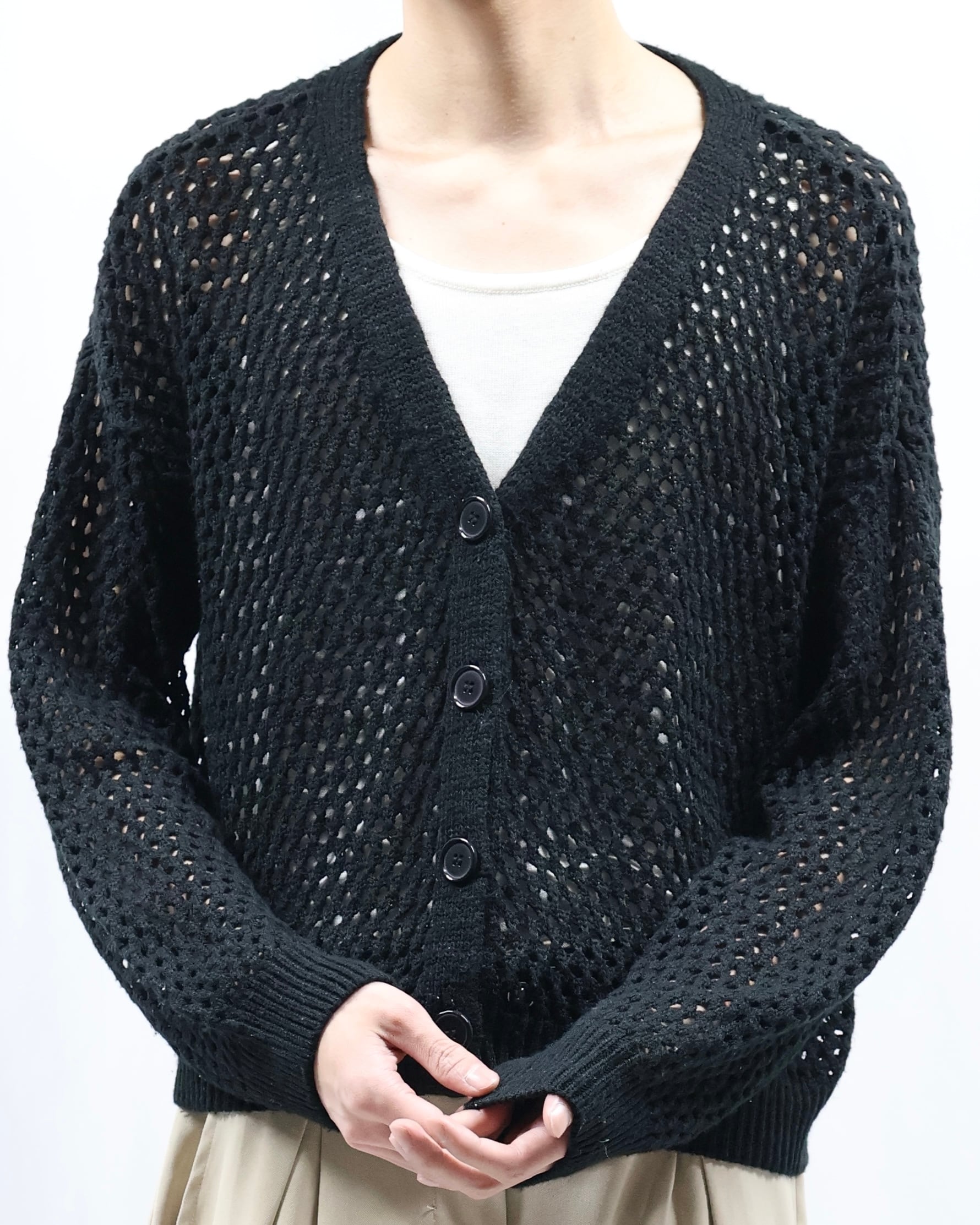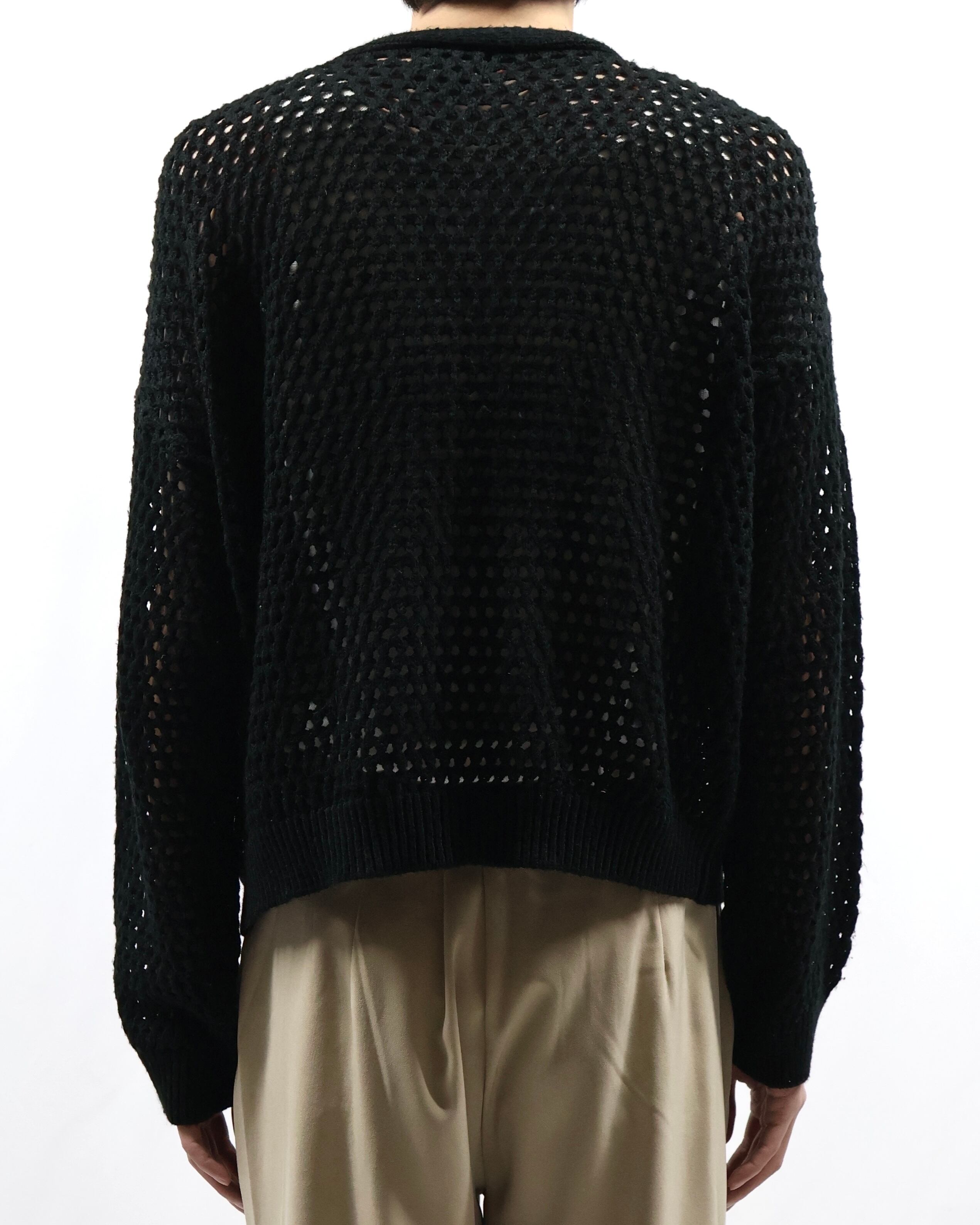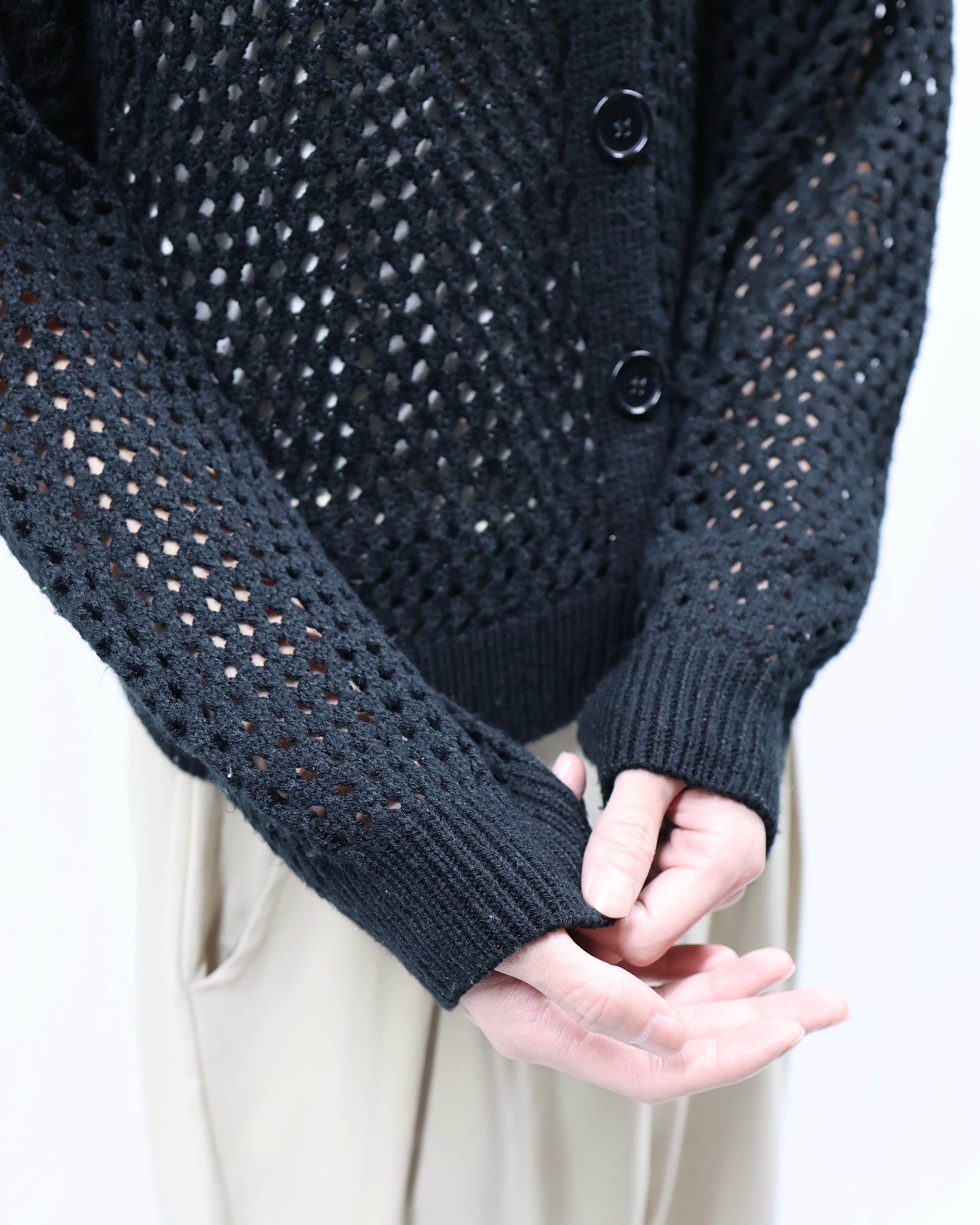 透け感のある編み地がスタイリングに抜けを与え、レイヤードを楽しめる一着。ゆったりとしたシルエットながら、着丈はコンパクトにまとめられており、カットソーやタンクトップ、シャツなど幅広いインナーとも合わせられるアイテム。