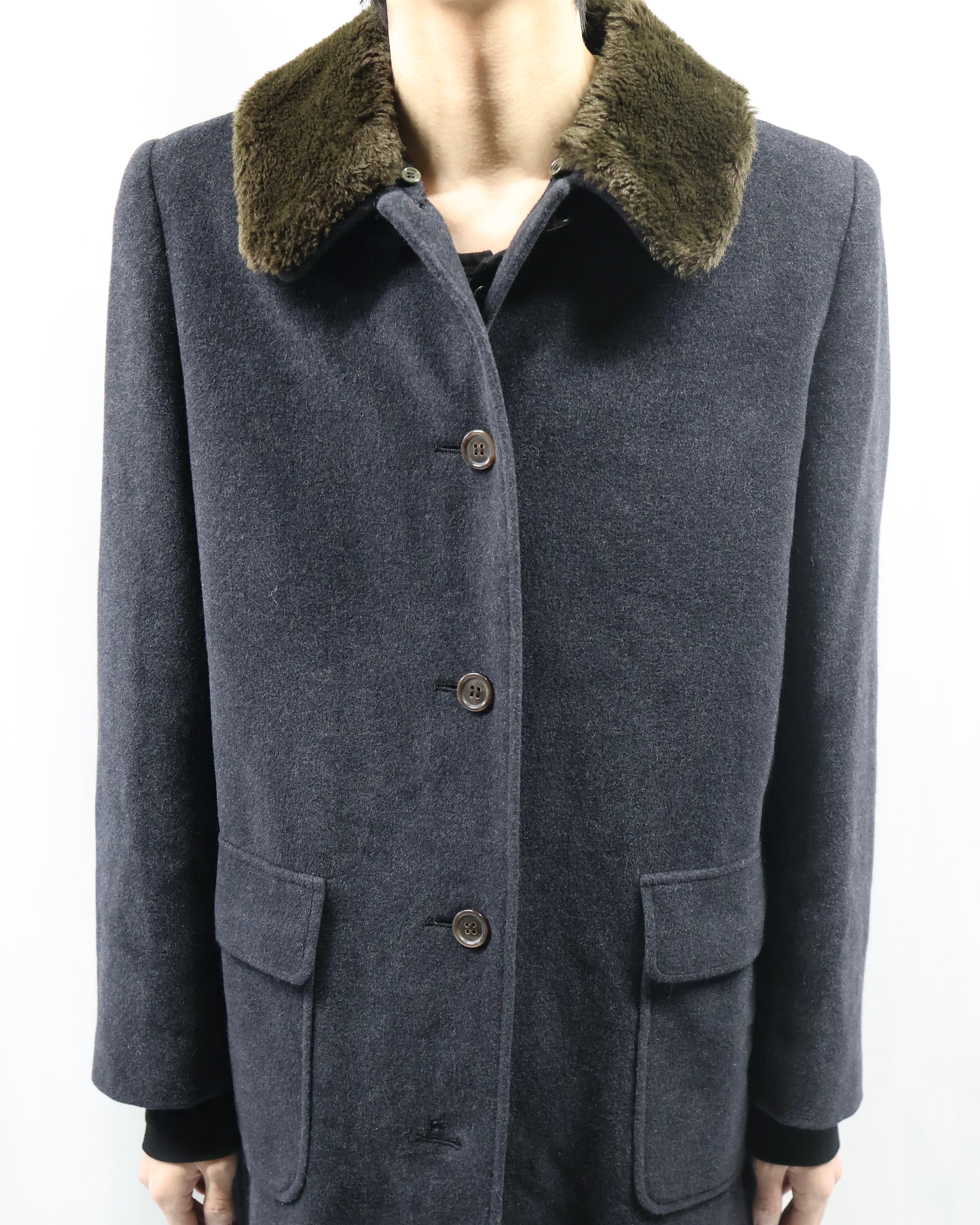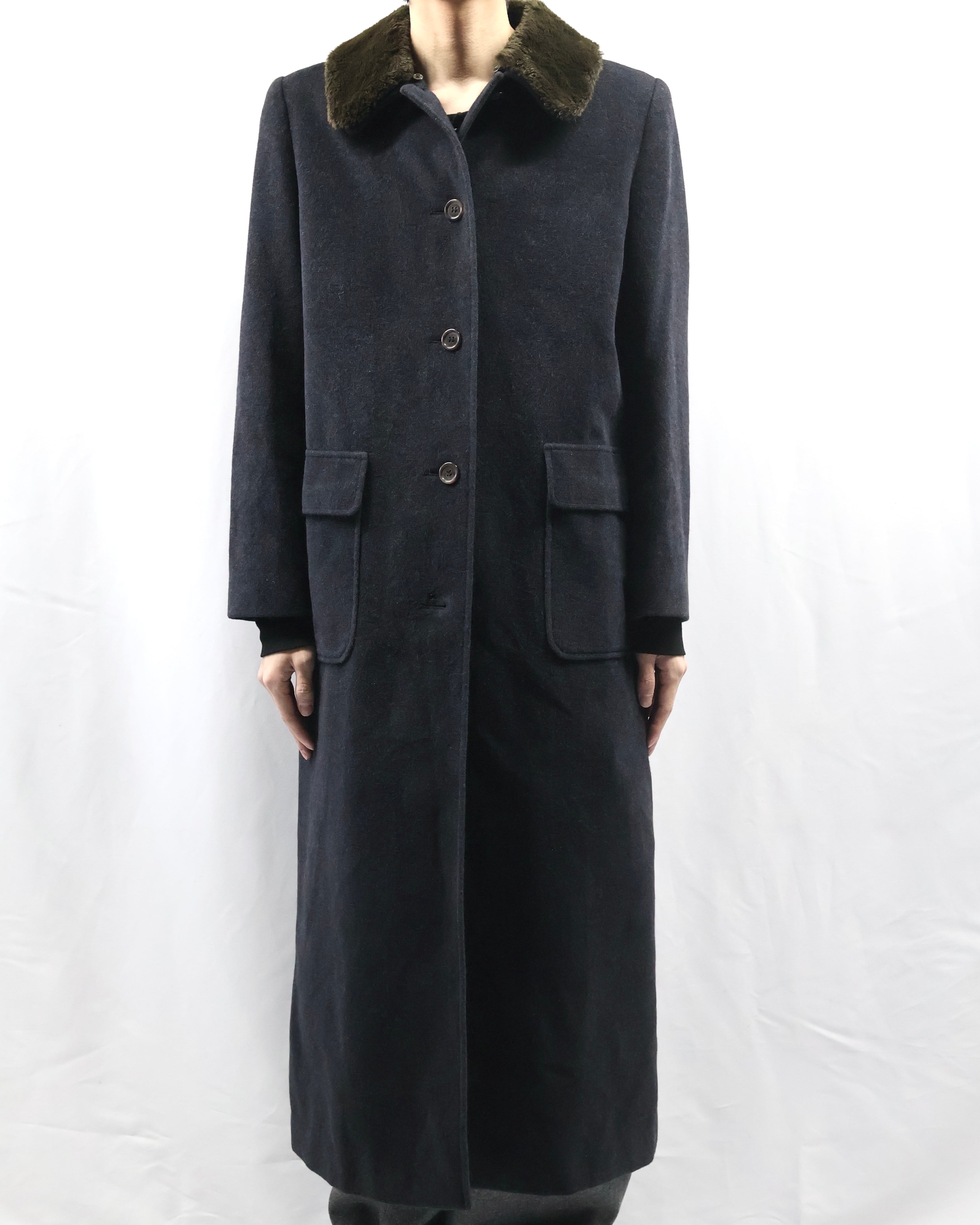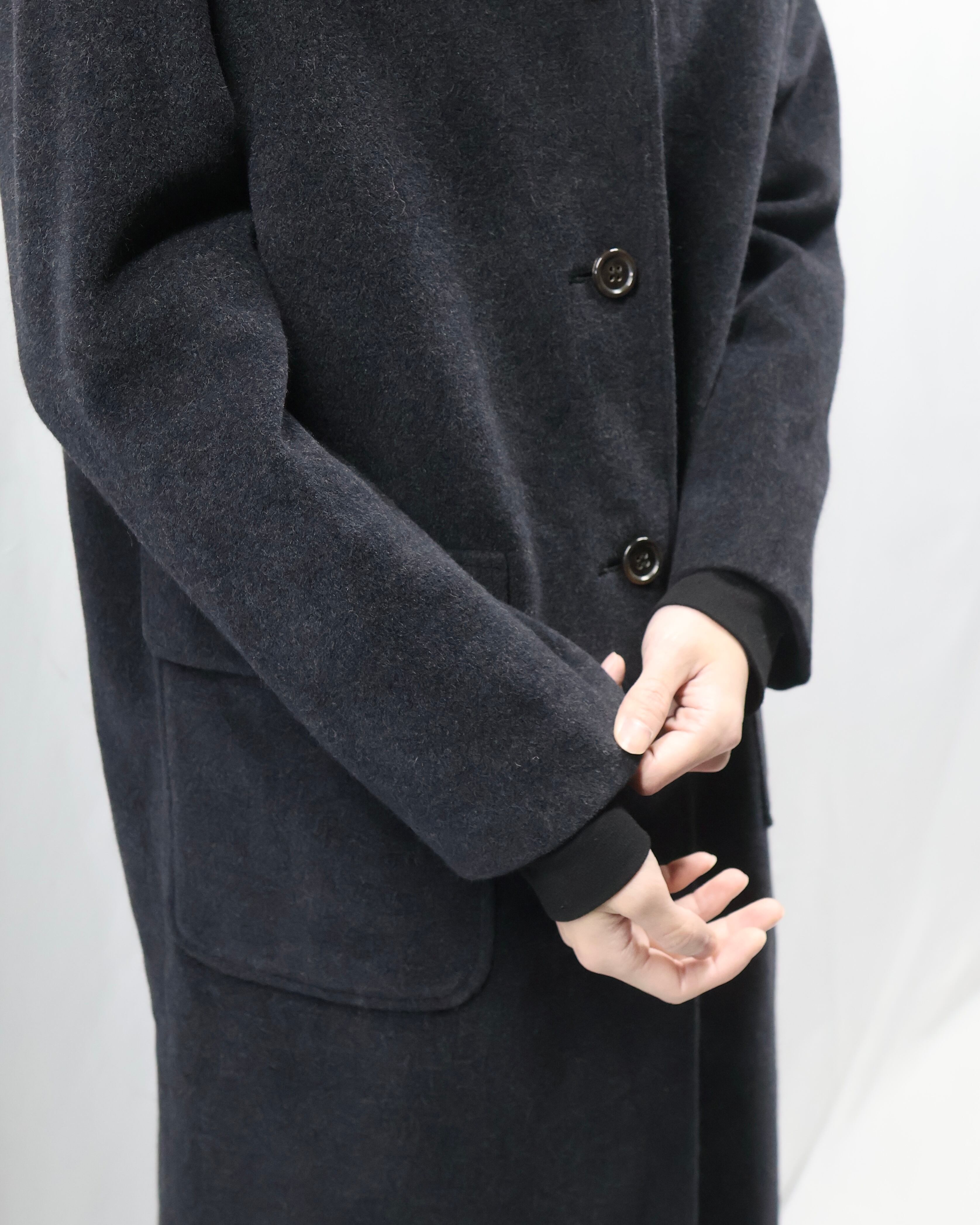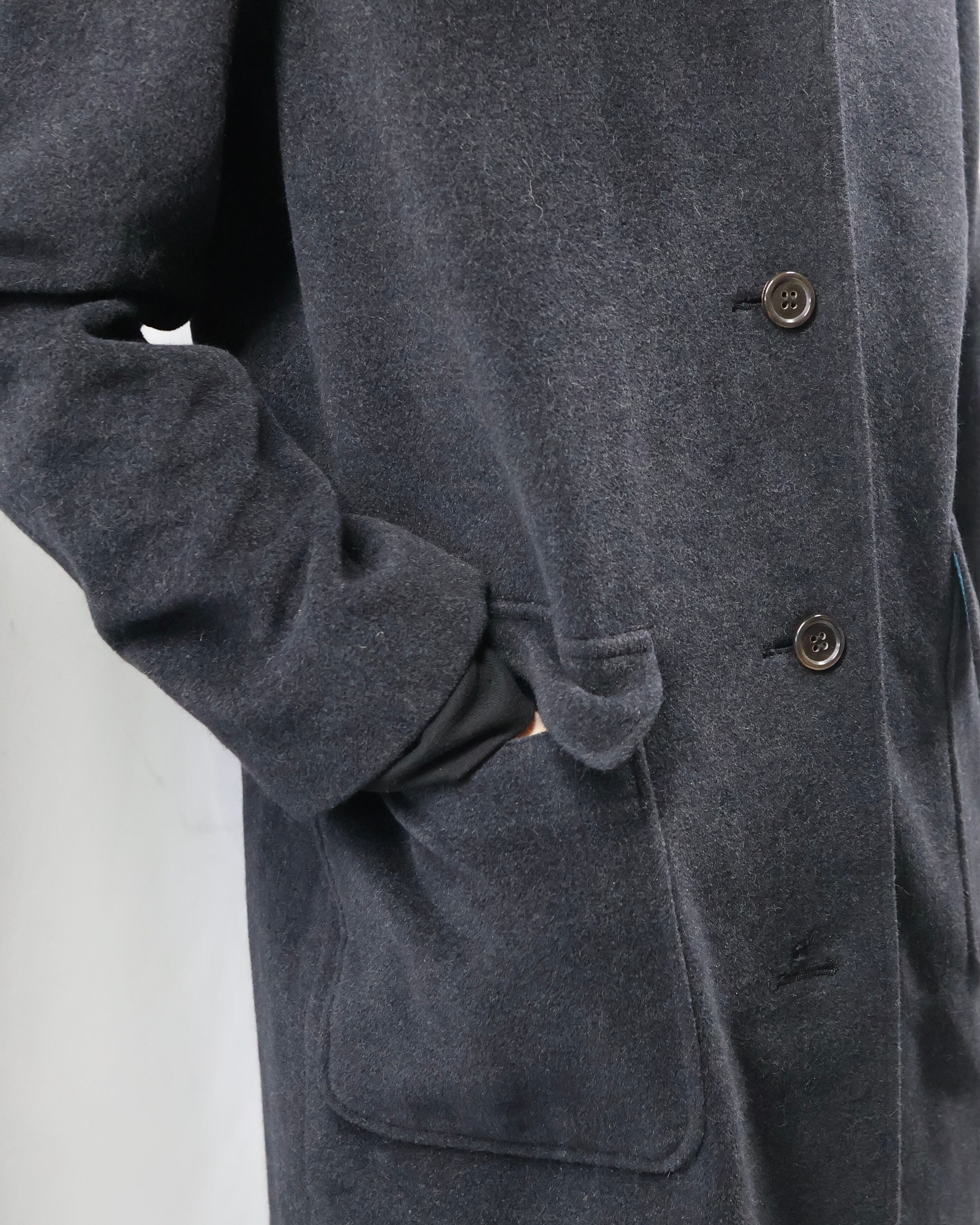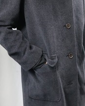 落ち着いた深みのあるグレーカラーと長めの着丈、襟元に取り外し可能なファーを組み合わせることで、クラシックながらもアクセントの効いたデザイン。羽織るだけで様になるコート。