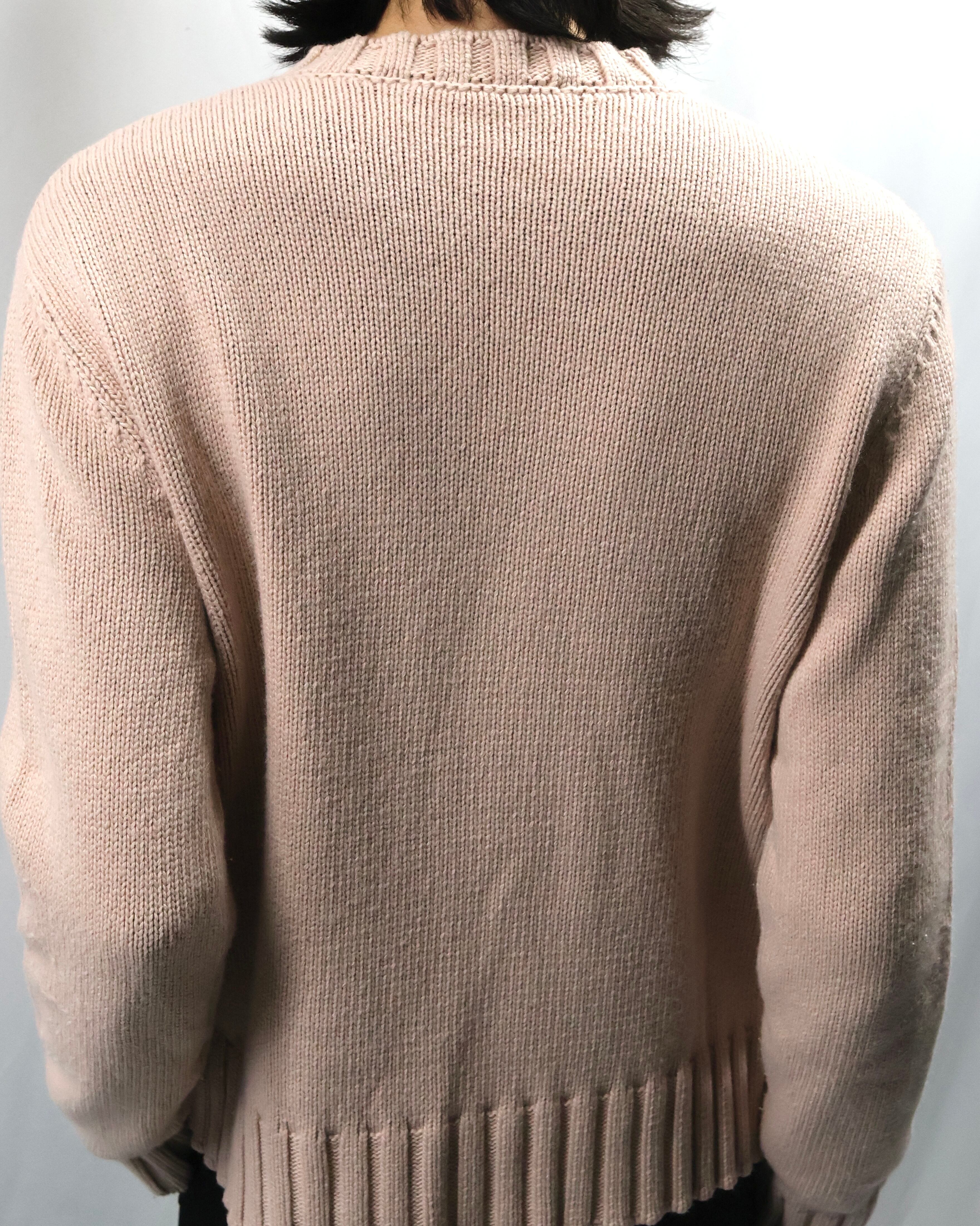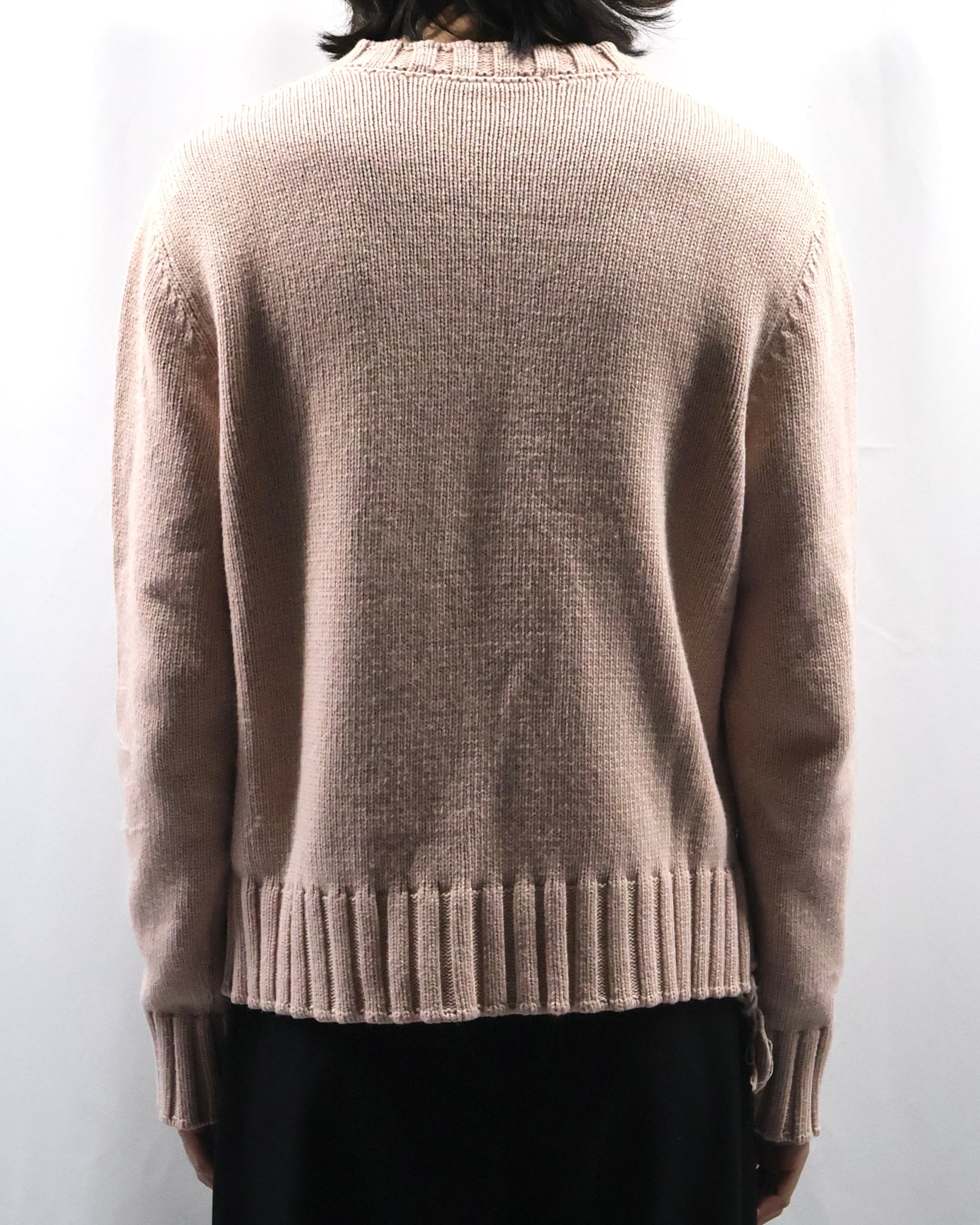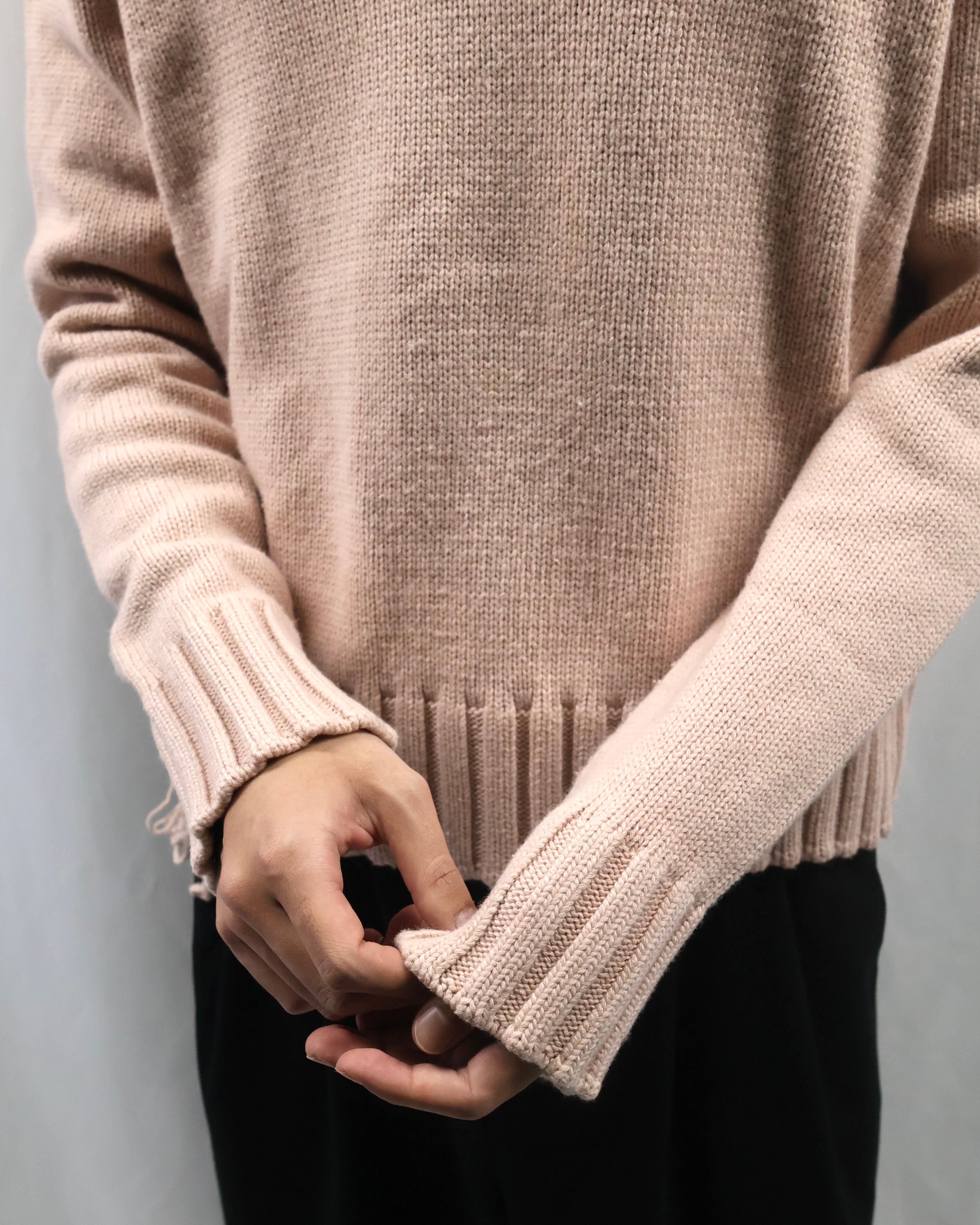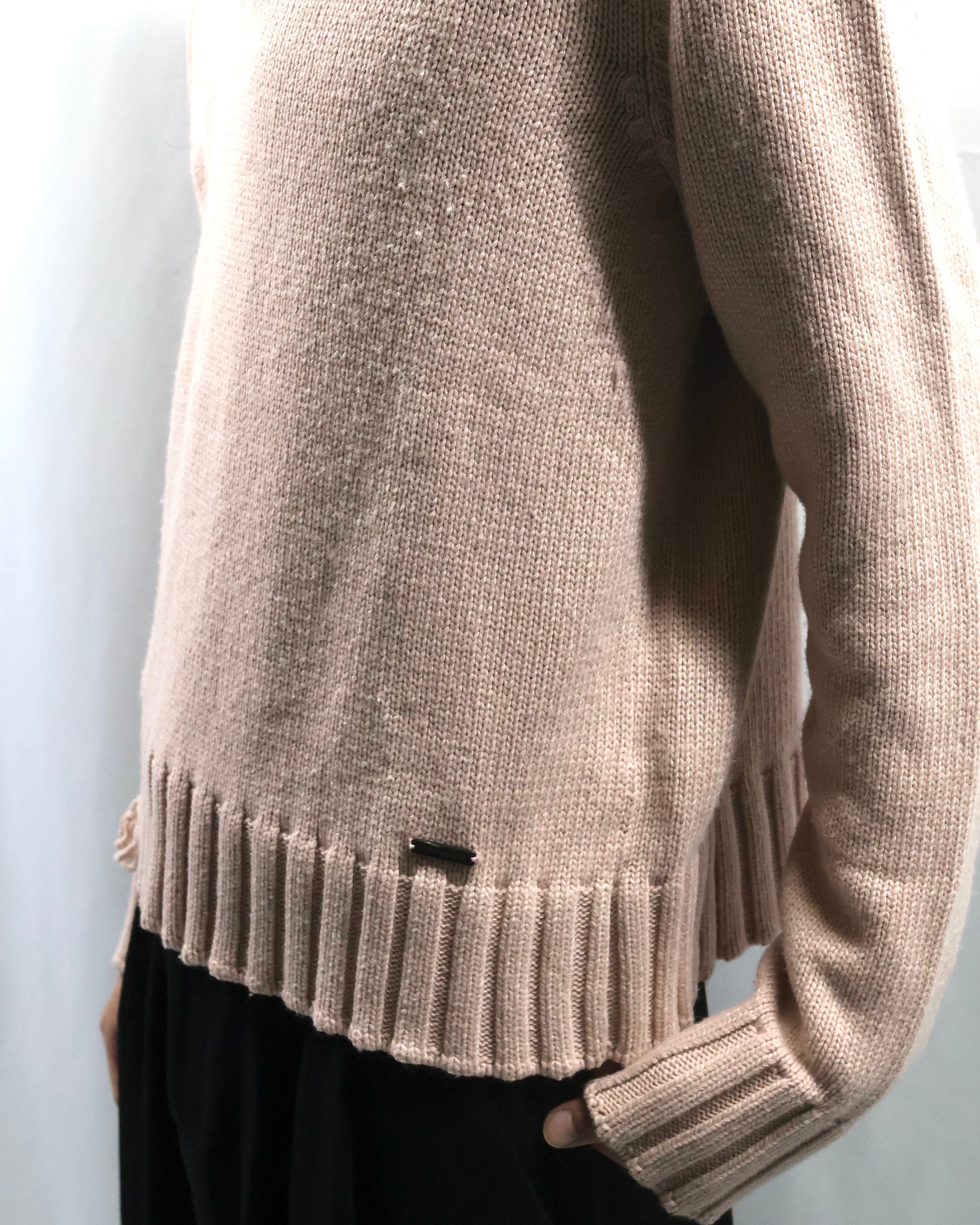 ざっくりとした編み地とリラックスしたシルエットで抜け感もありつつ、ダメージ部分の表情が、シンプルなスタイリングをモードに引き上げる一枚。