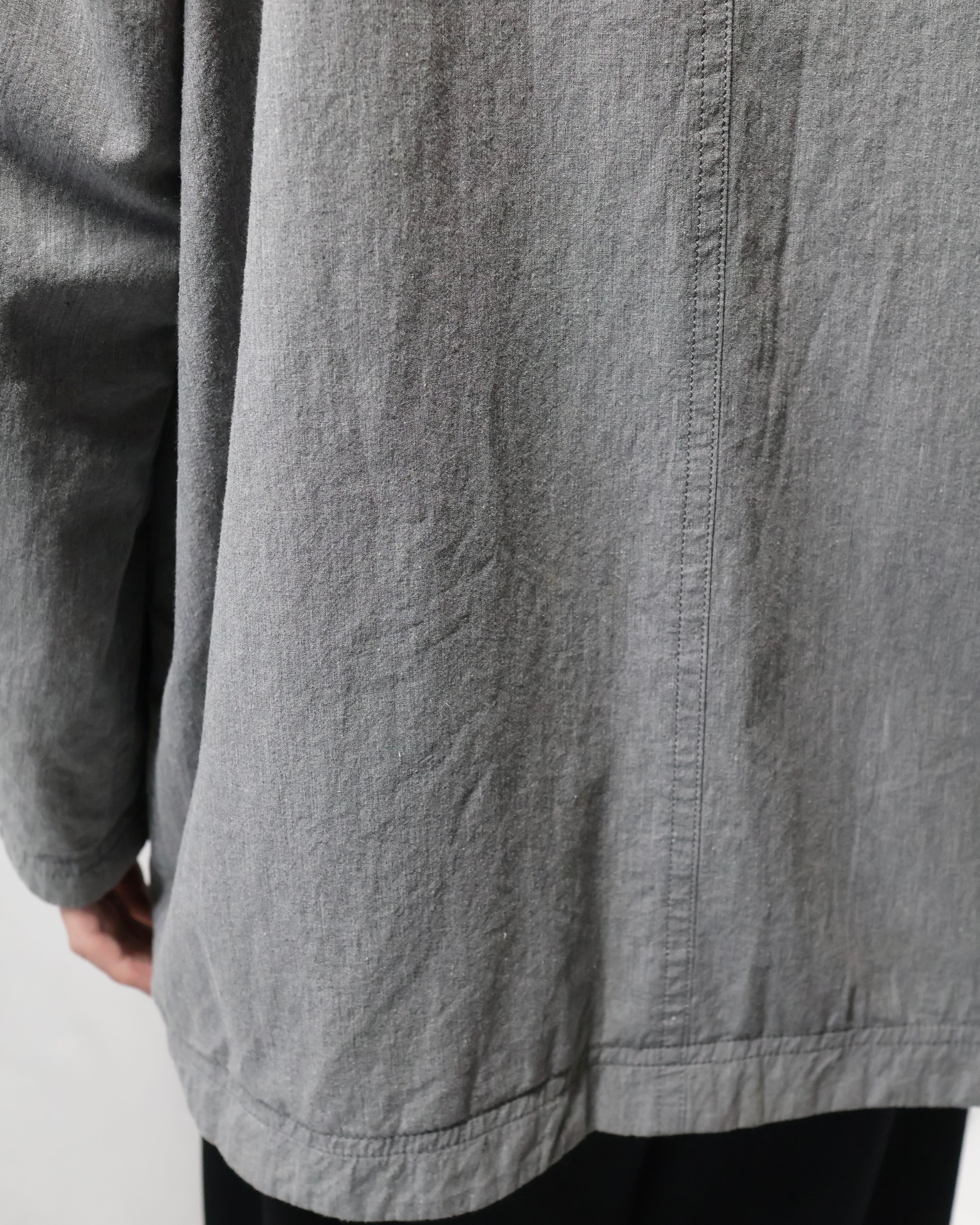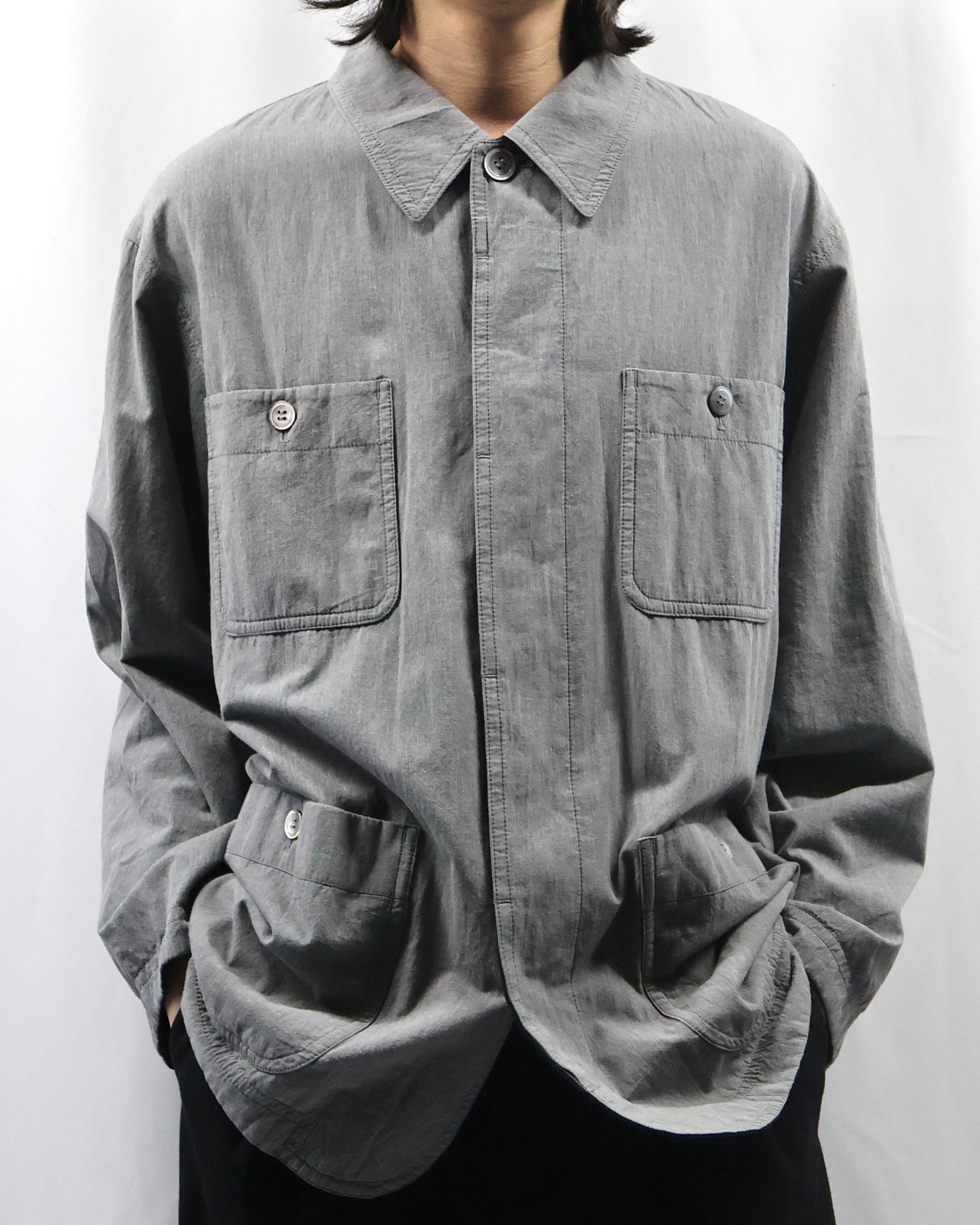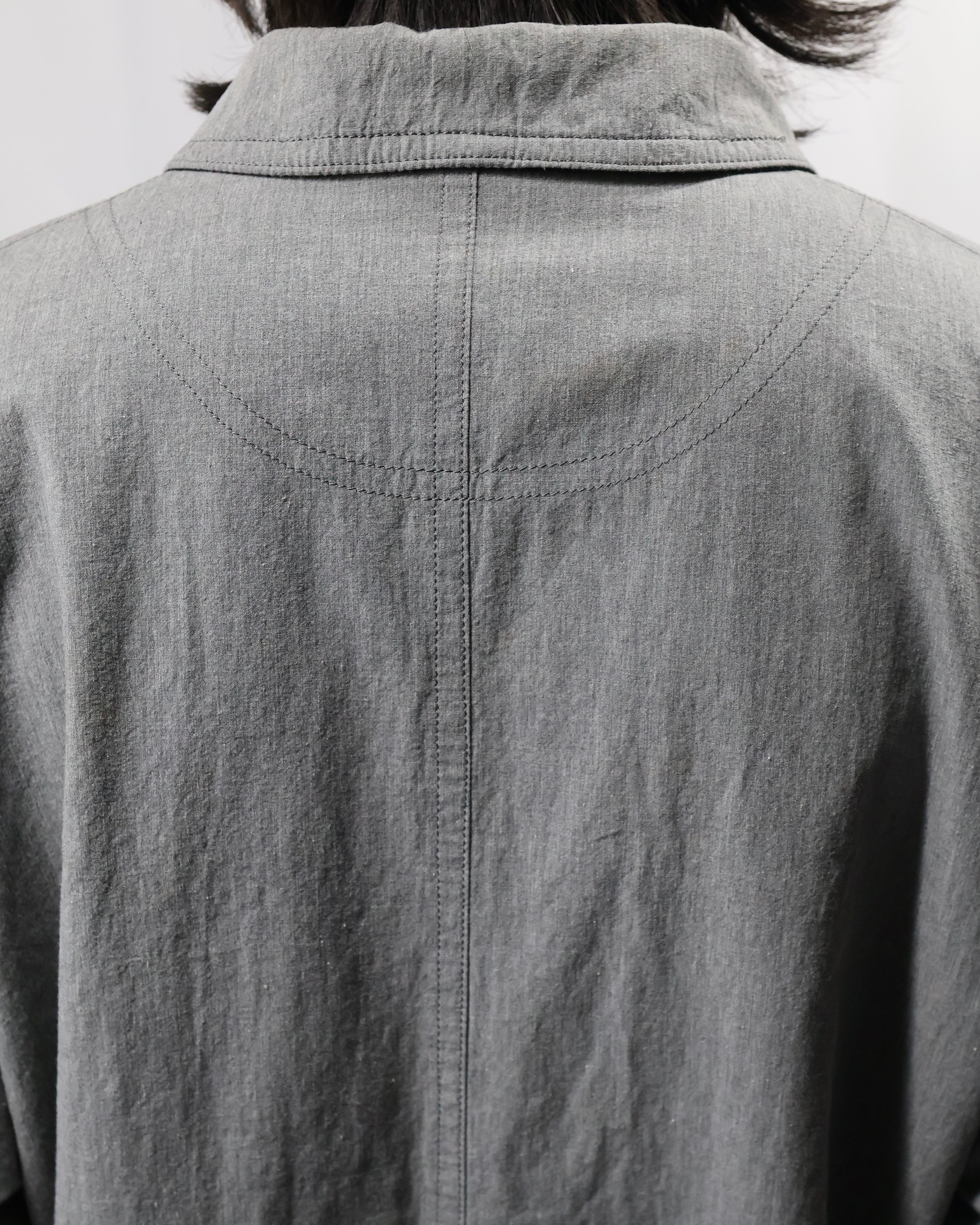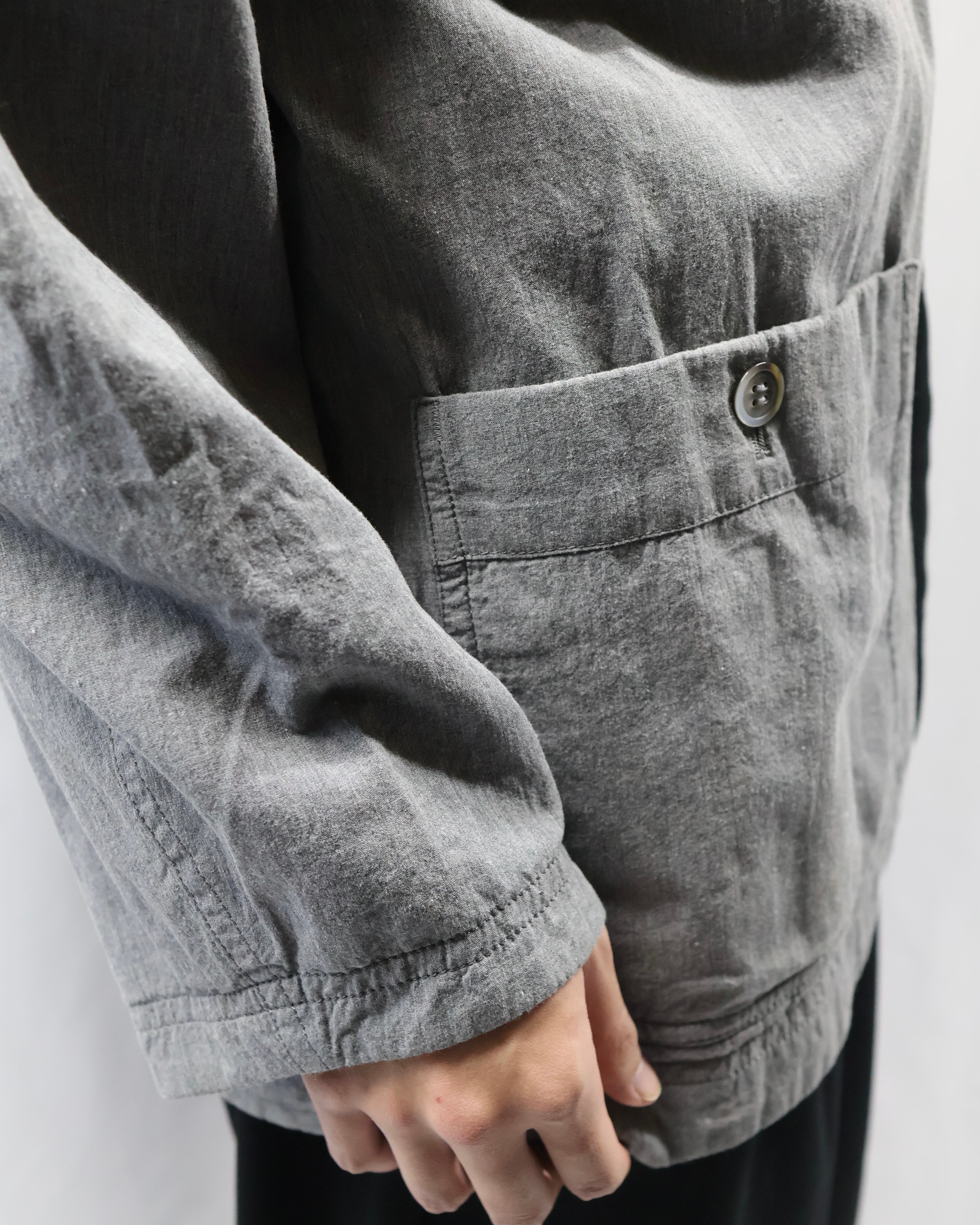 ミニマルなデザインが特徴で、程よく洗いのかかったグレートーンのコットン生地が柔らかい風合いとヴィンテージな雰囲気もあるアイテム。リラックスしたサイズ感でシーズンレスで着用出来る一着。