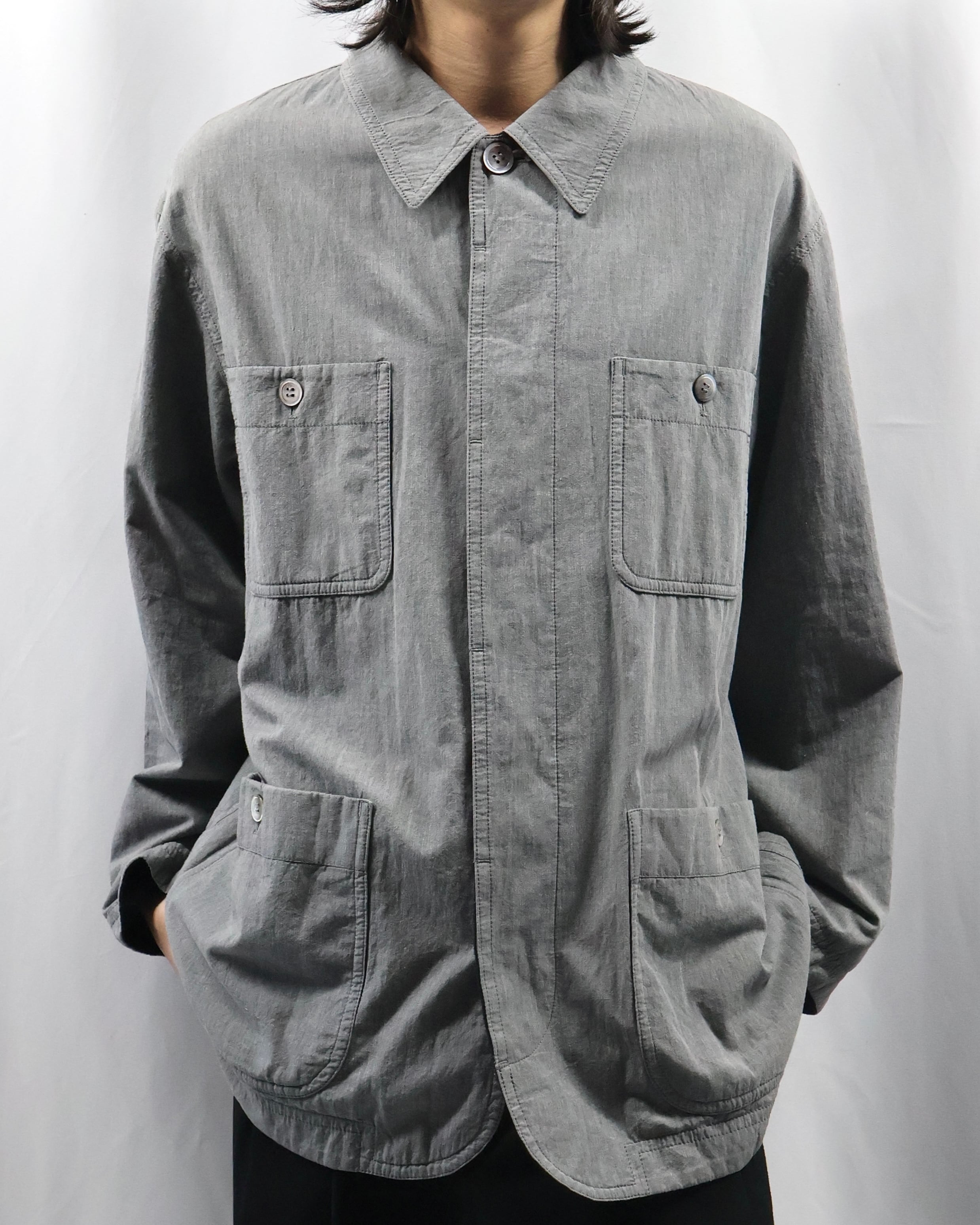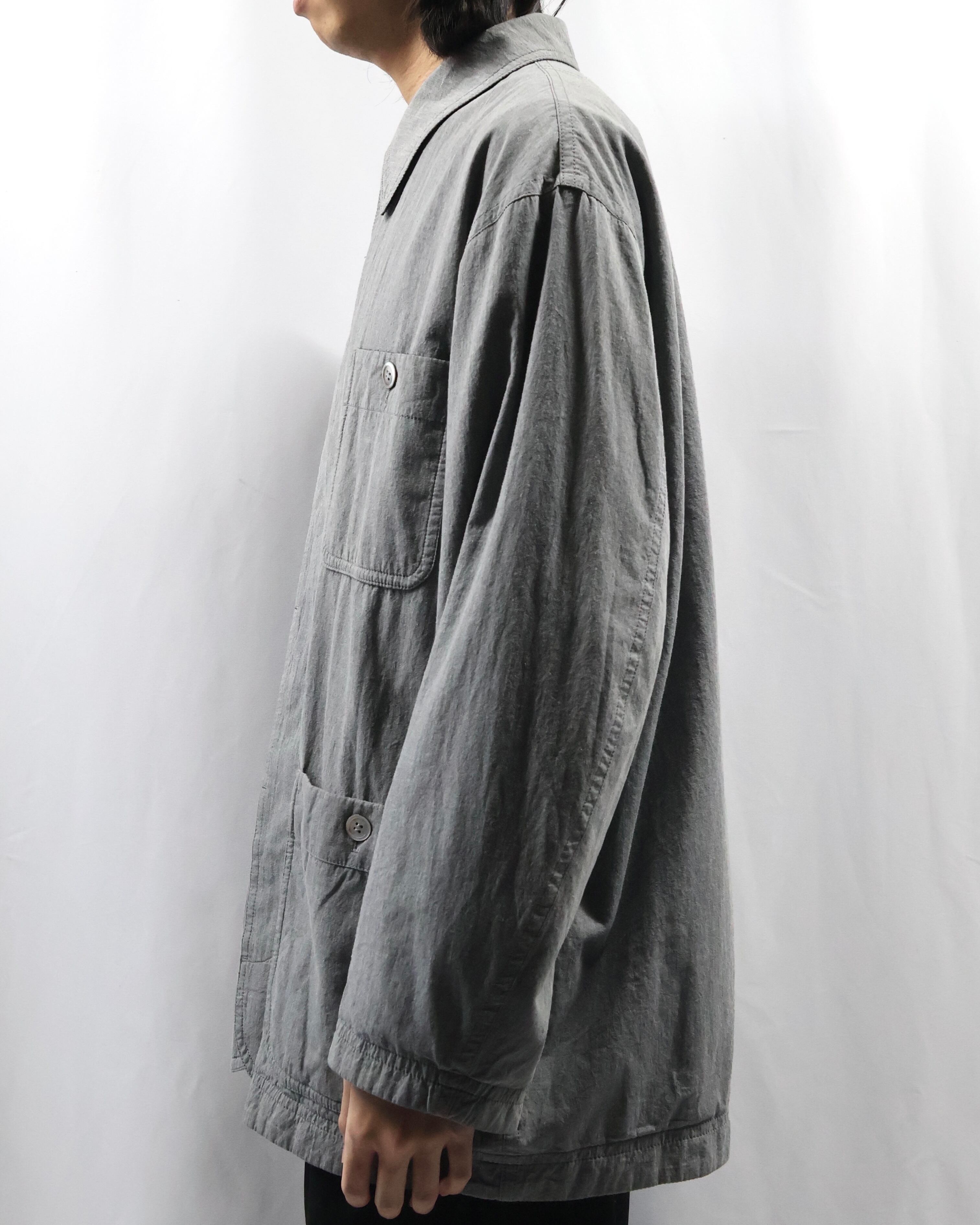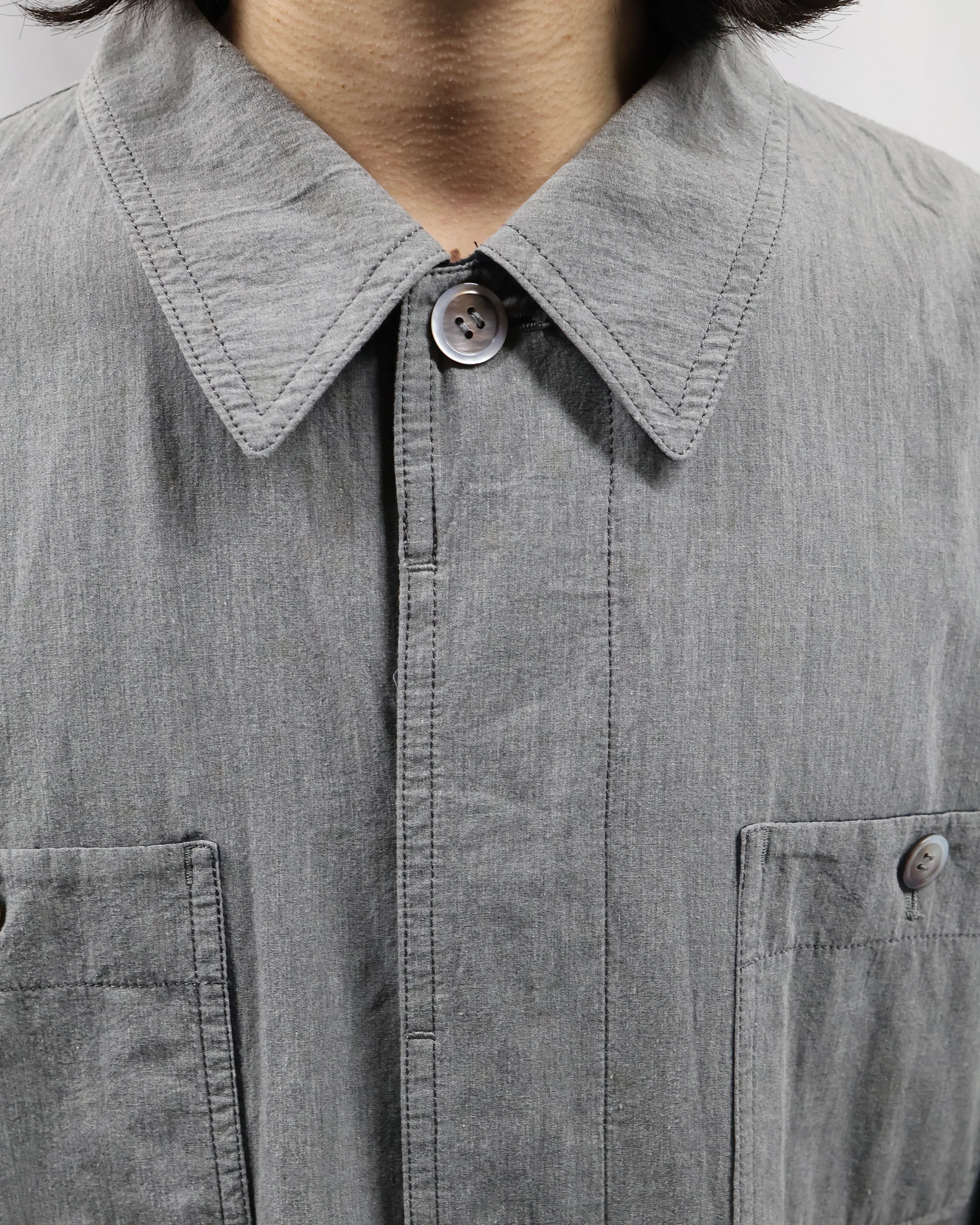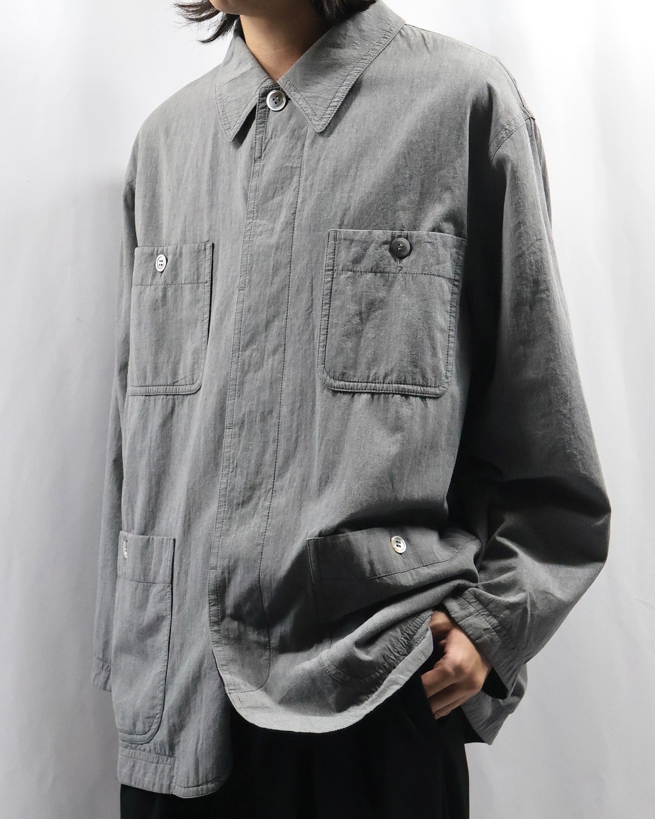 ミニマルなデザインが特徴で、程よく洗いのかかったグレートーンのコットン生地が柔らかい風合いとヴィンテージな雰囲気もあるアイテム。リラックスしたサイズ感でシーズンレスで着用出来る一着。