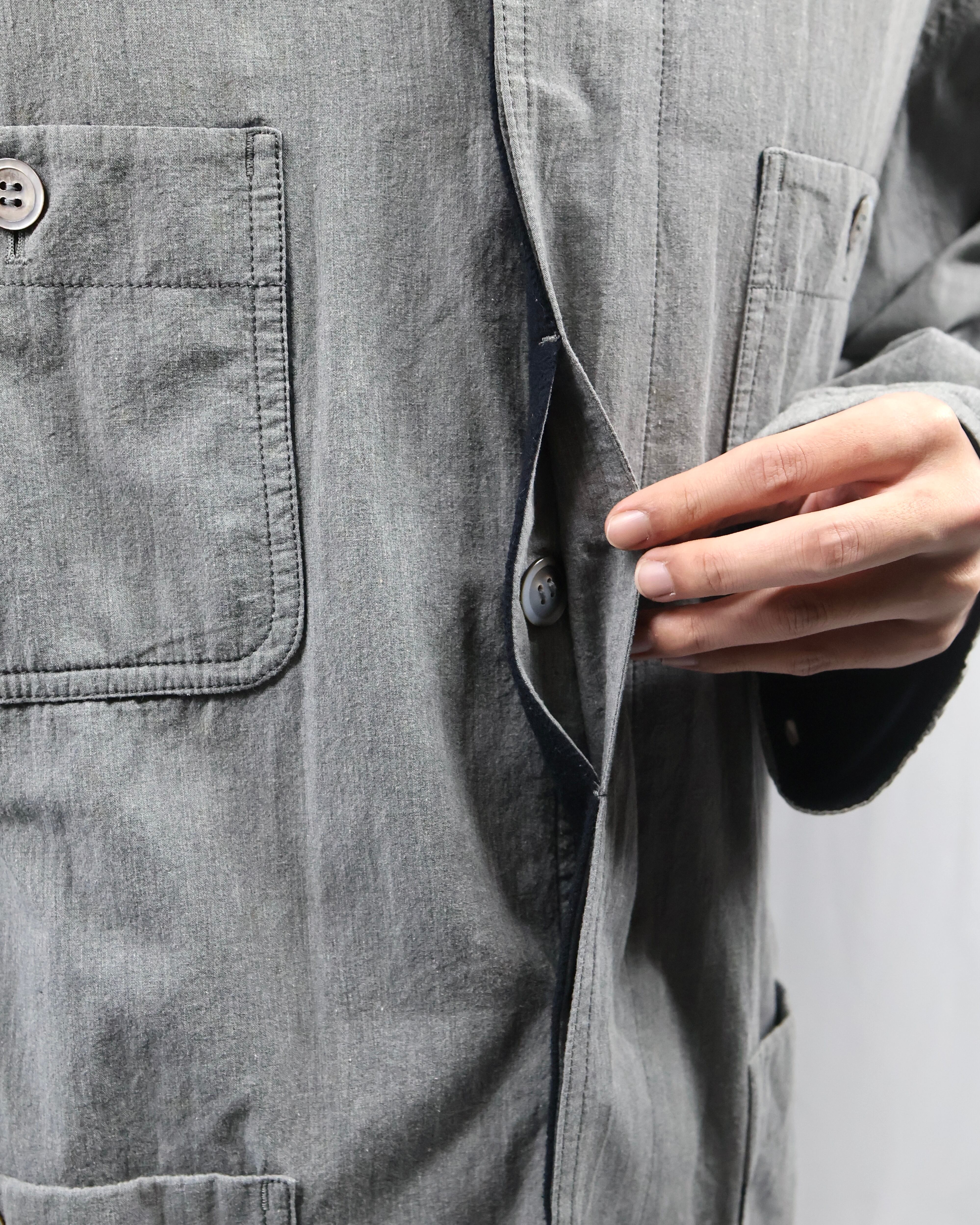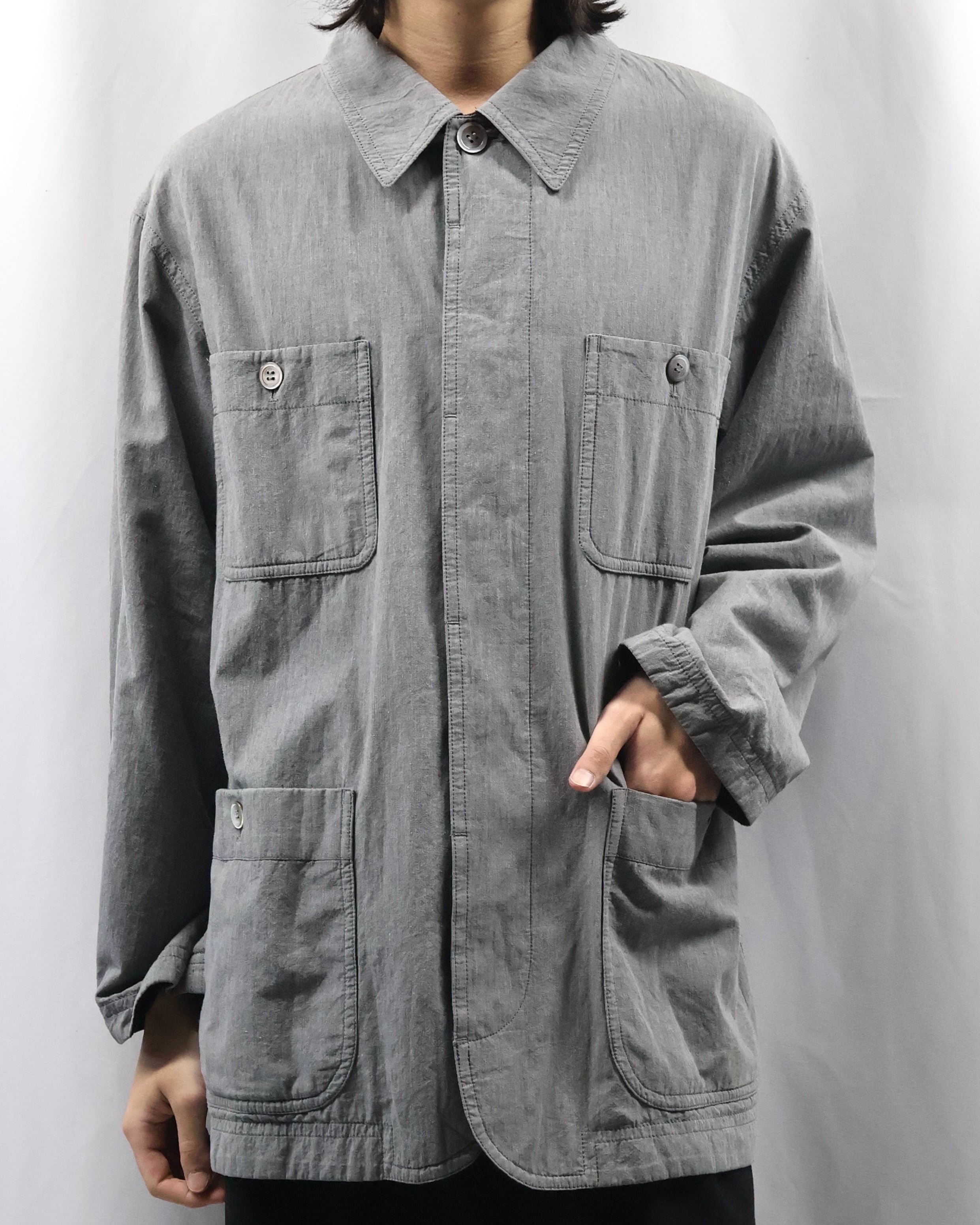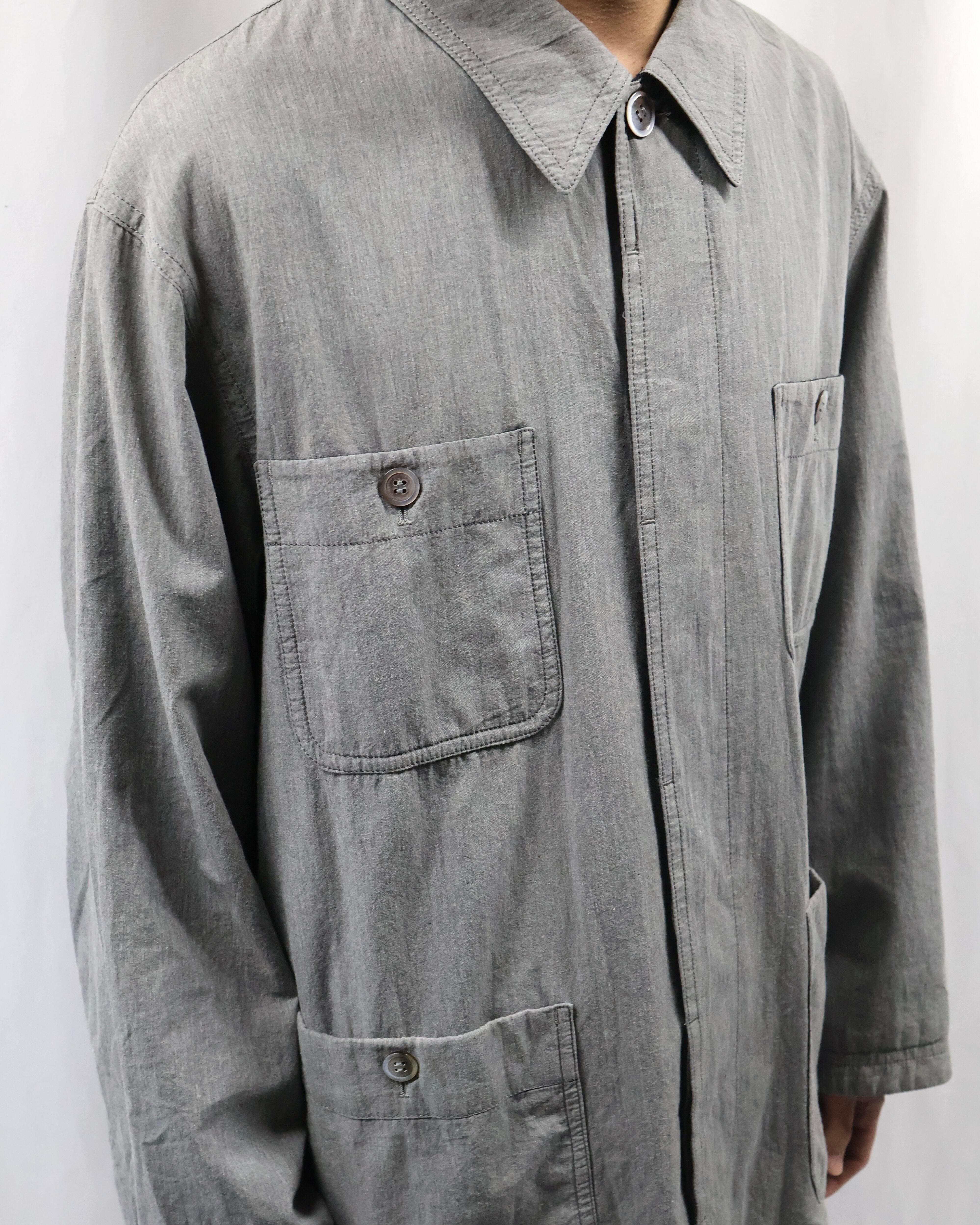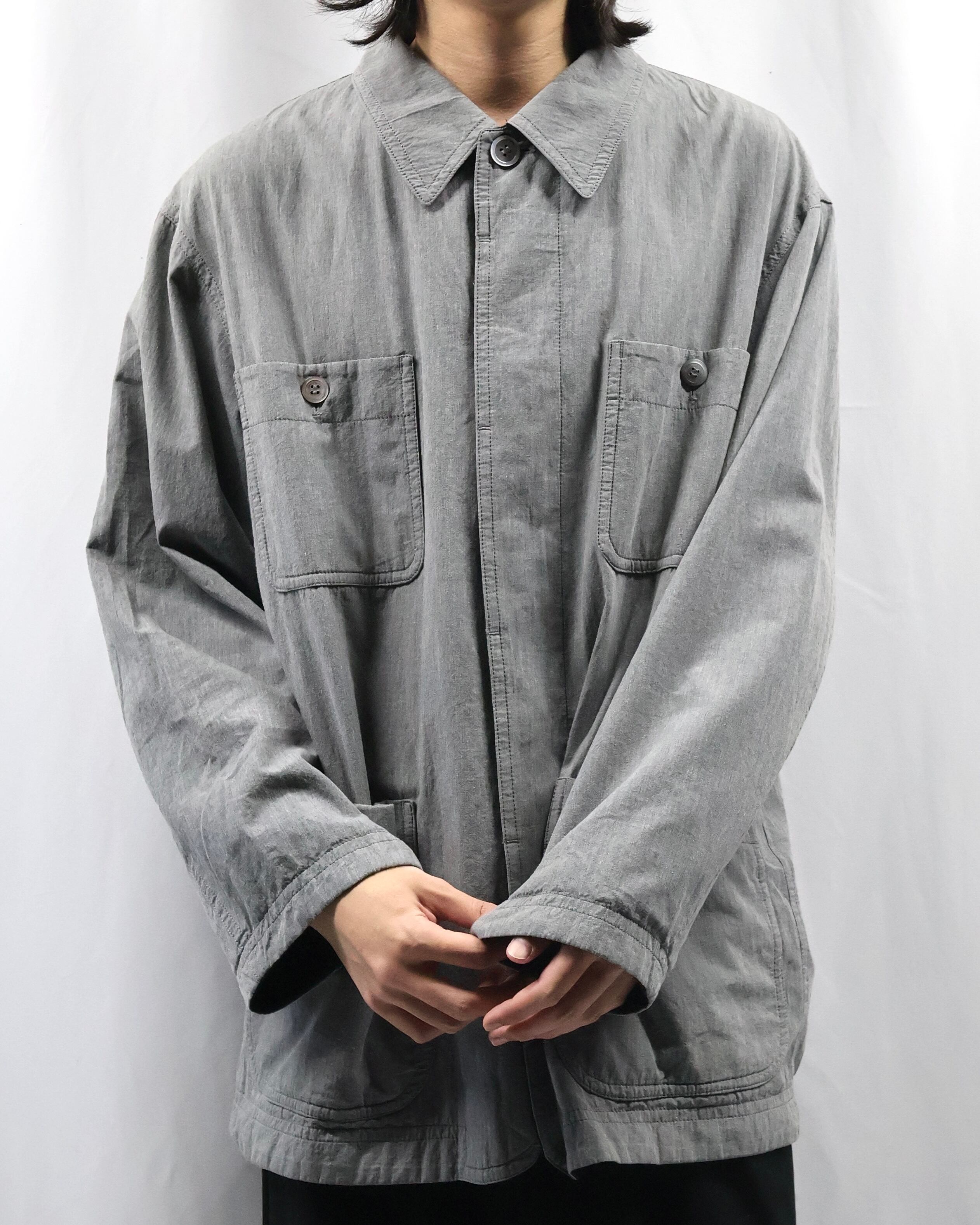 ミニマルなデザインが特徴で、程よく洗いのかかったグレートーンのコットン生地が柔らかい風合いとヴィンテージな雰囲気もあるアイテム。リラックスしたサイズ感でシーズンレスで着用出来る一着。