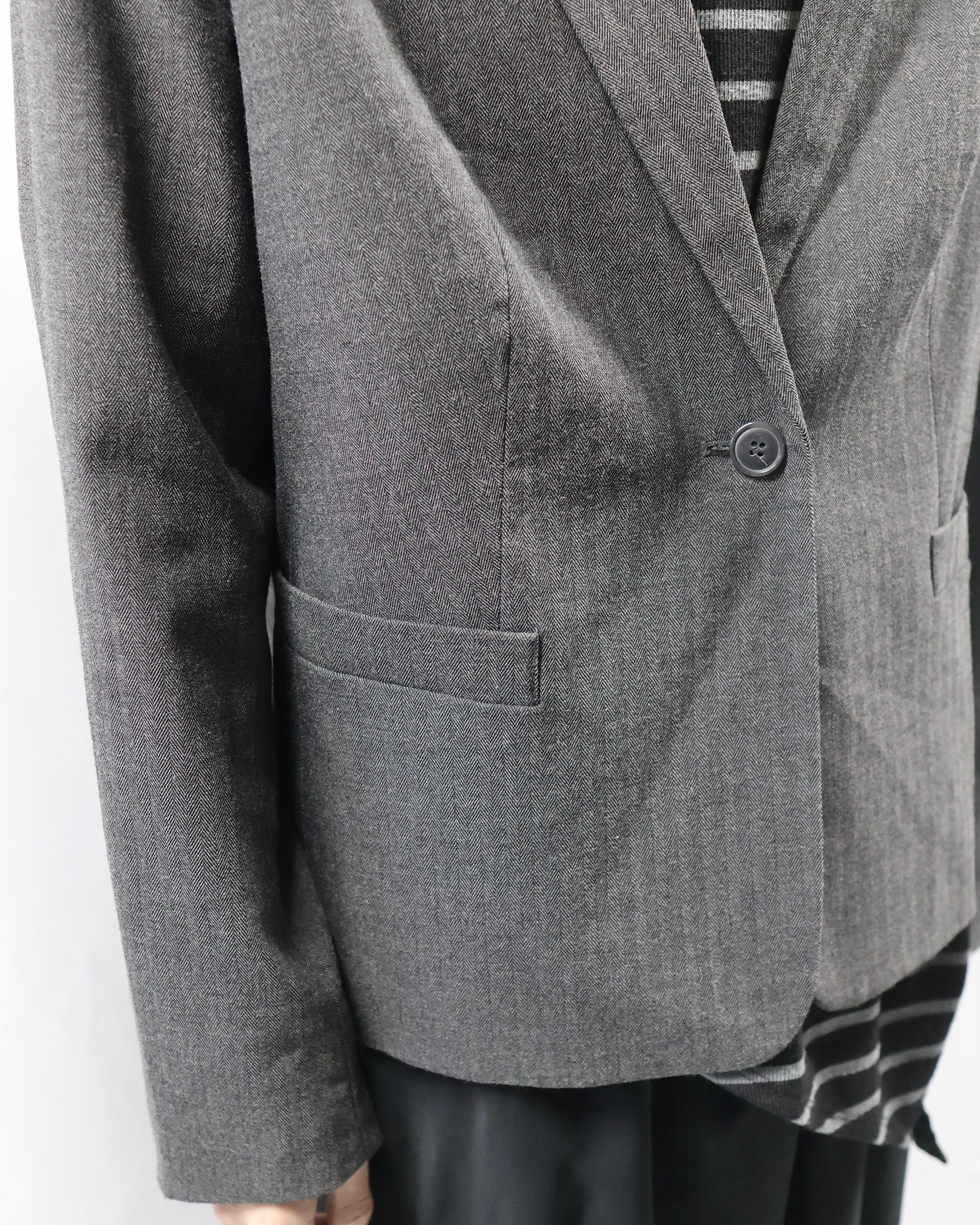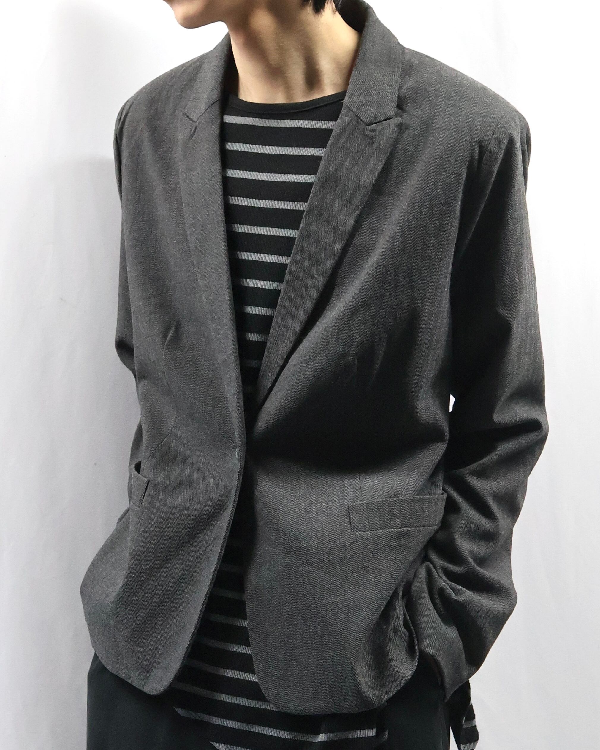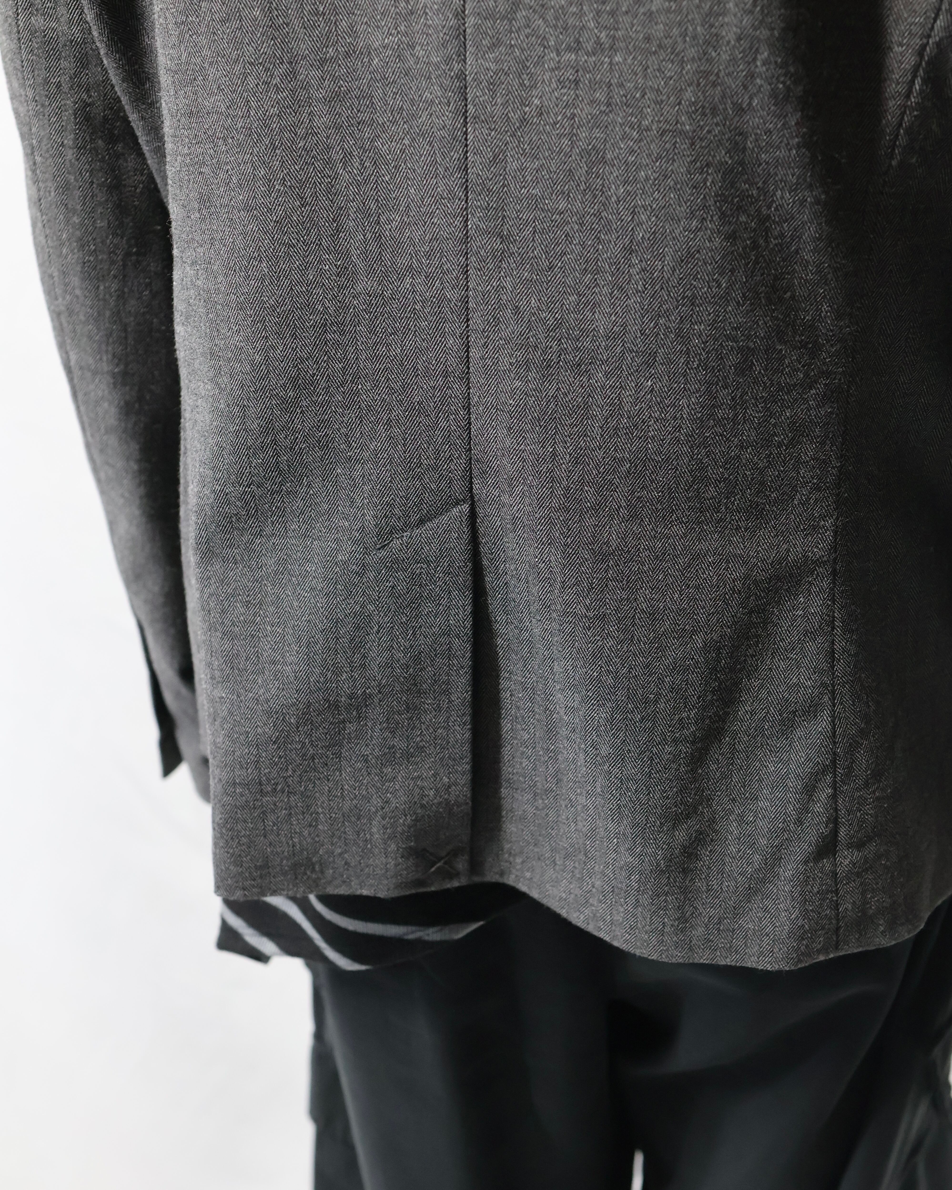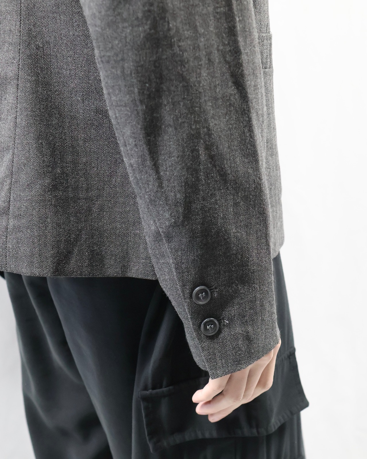 チャコールグレーのヘリンボーン生地が上品で、ビジネスからデイリーまで幅広く対応する万能な一着。