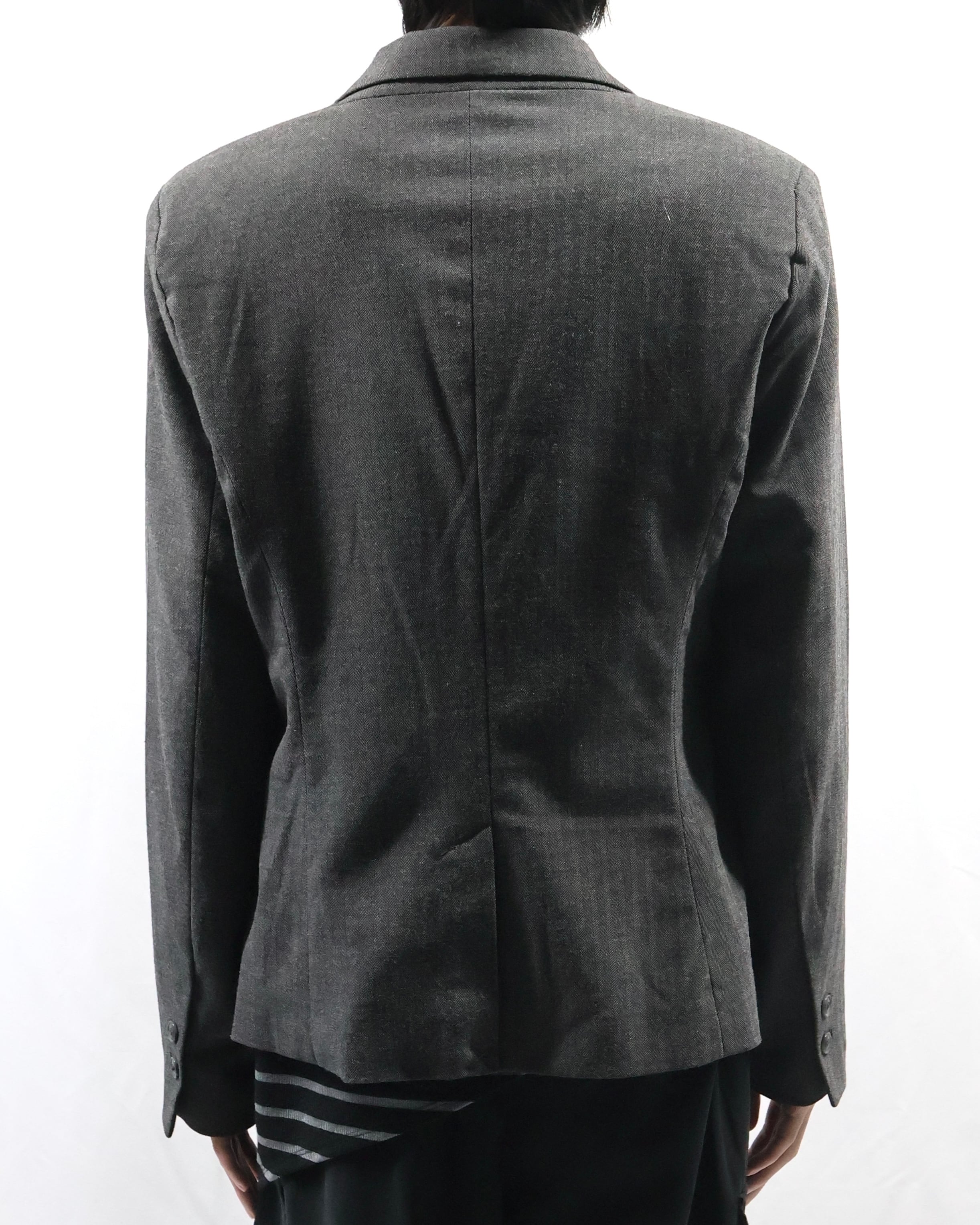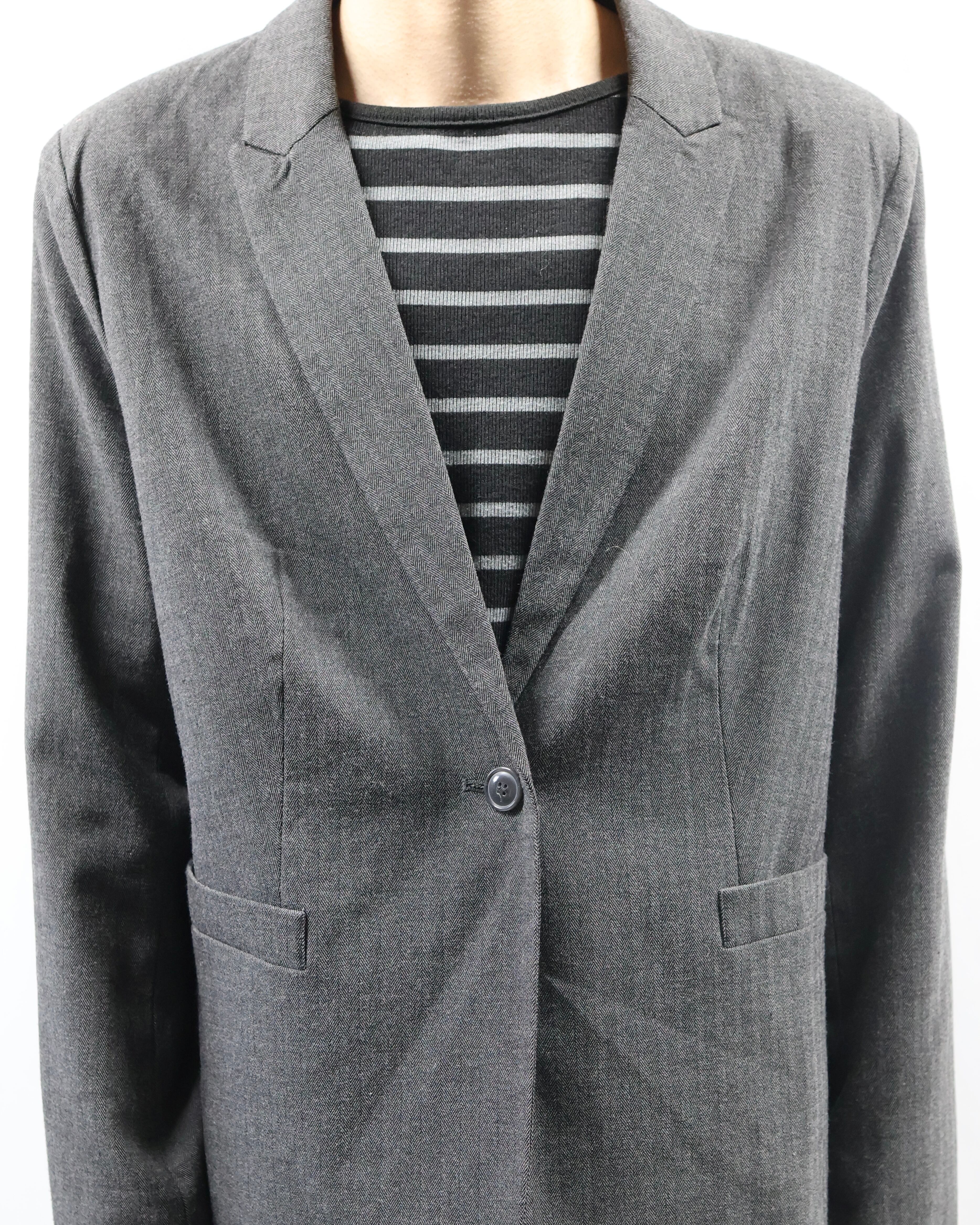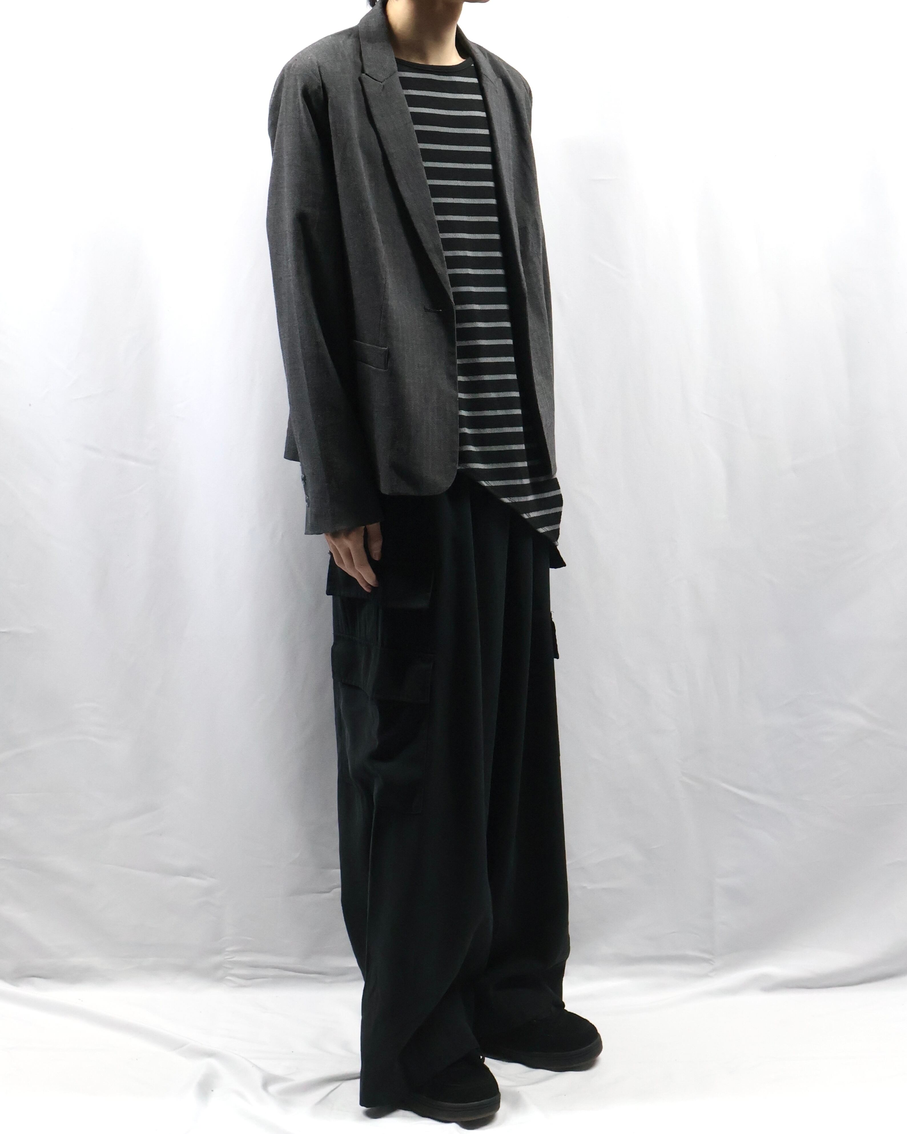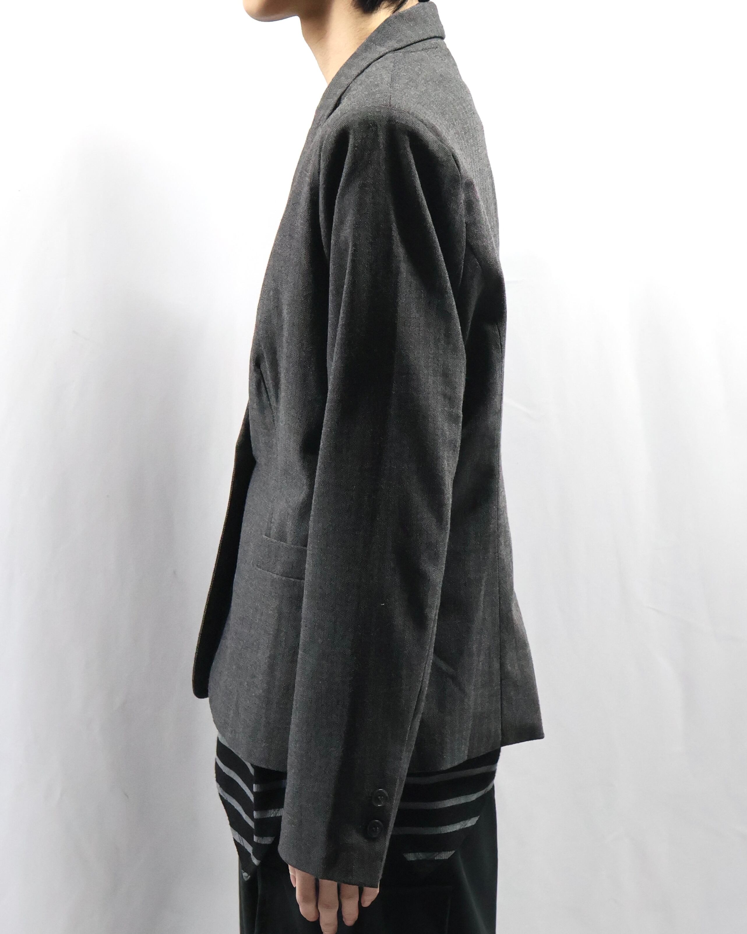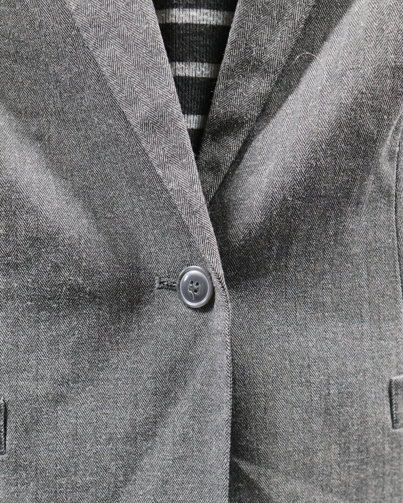 チャコールグレーのヘリンボーン生地が上品で、ビジネスからデイリーまで幅広く対応する万能な一着。