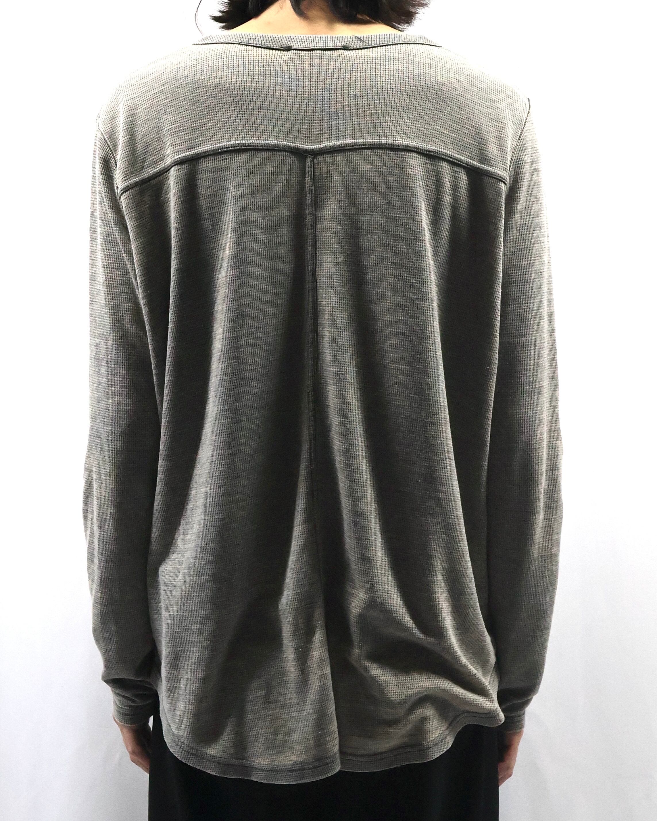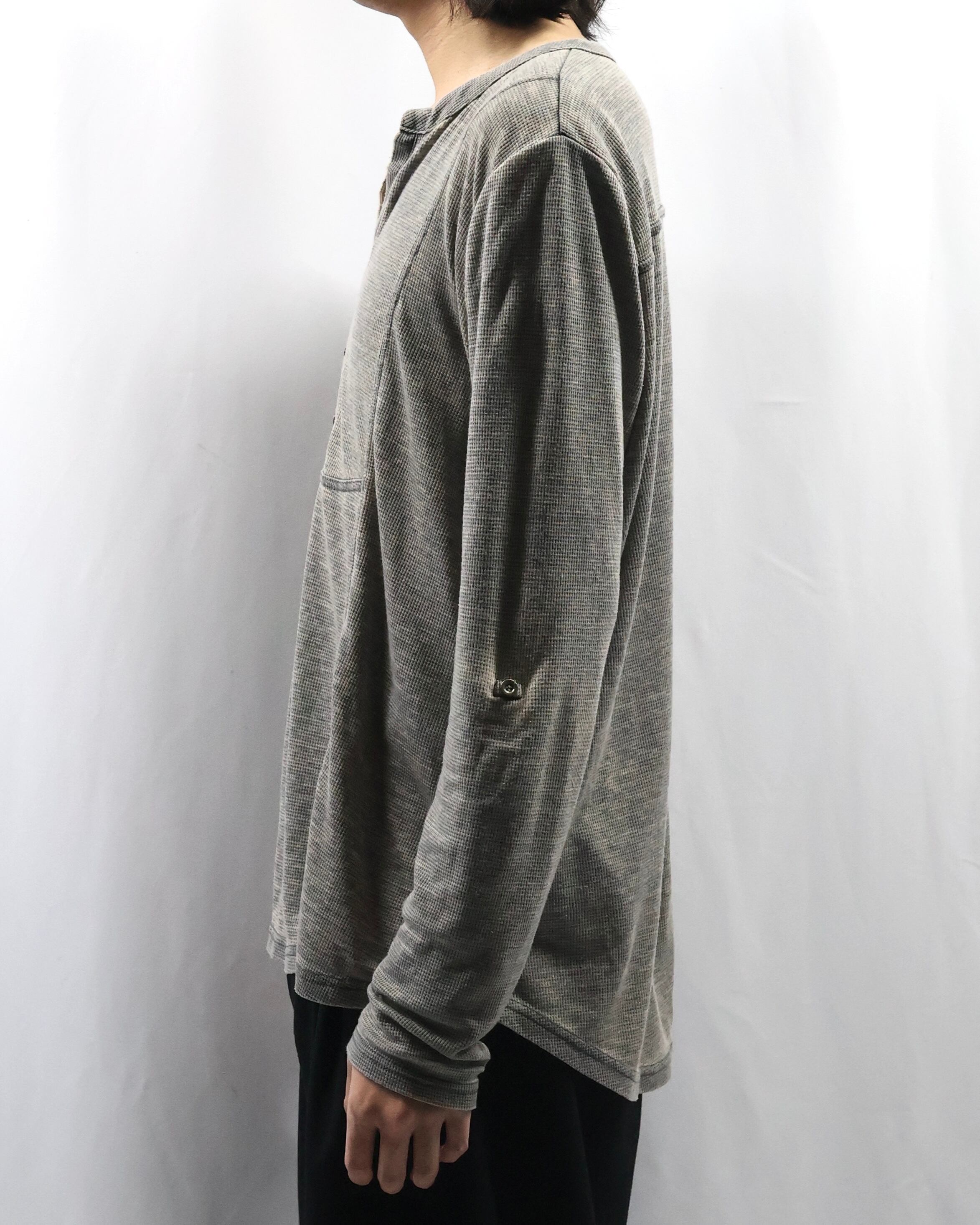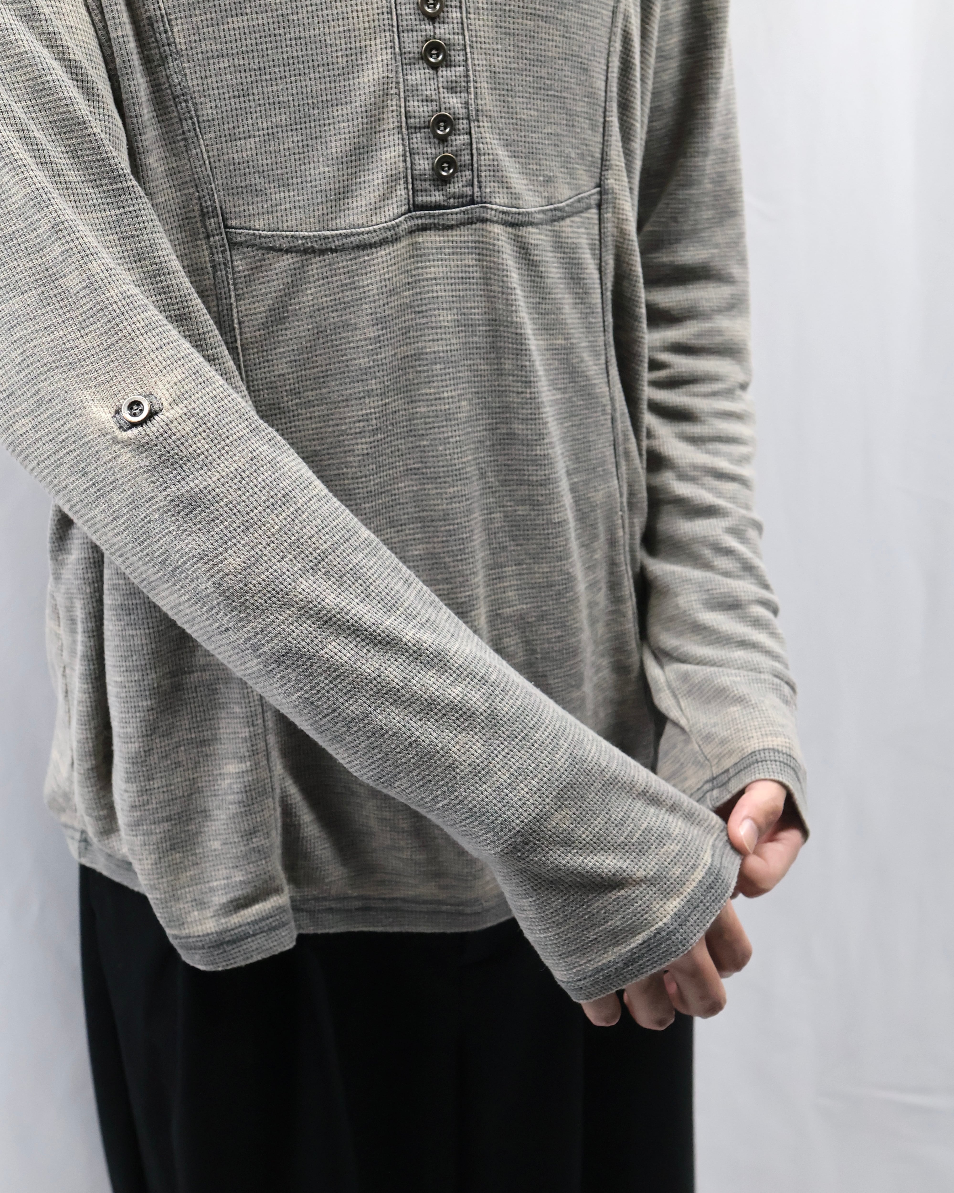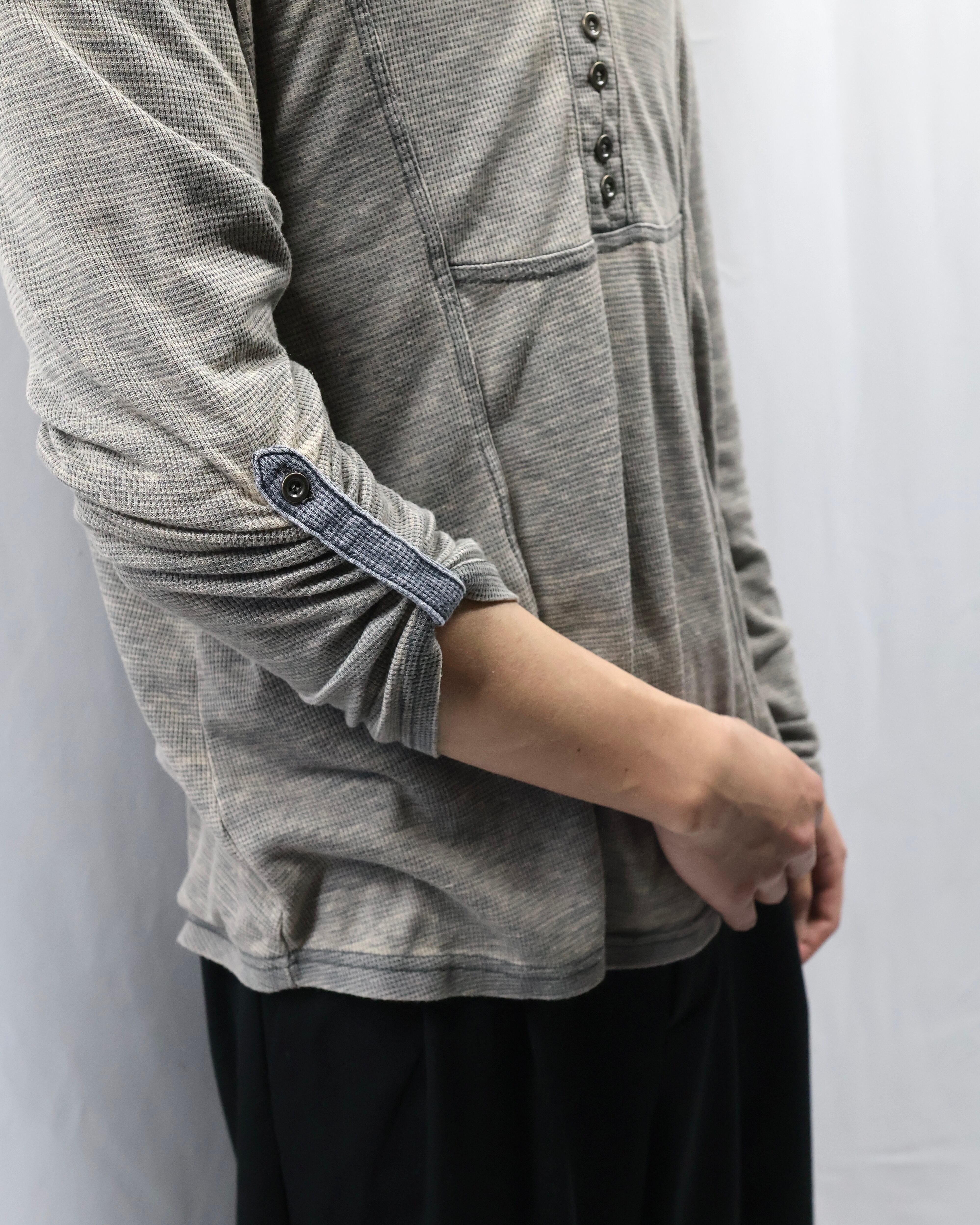 細かなワッフル調の生地が立体感を生み、シンプルながら表情のある一枚。袖口にはボタンタブが付き、ロールアップしての着用も可能。