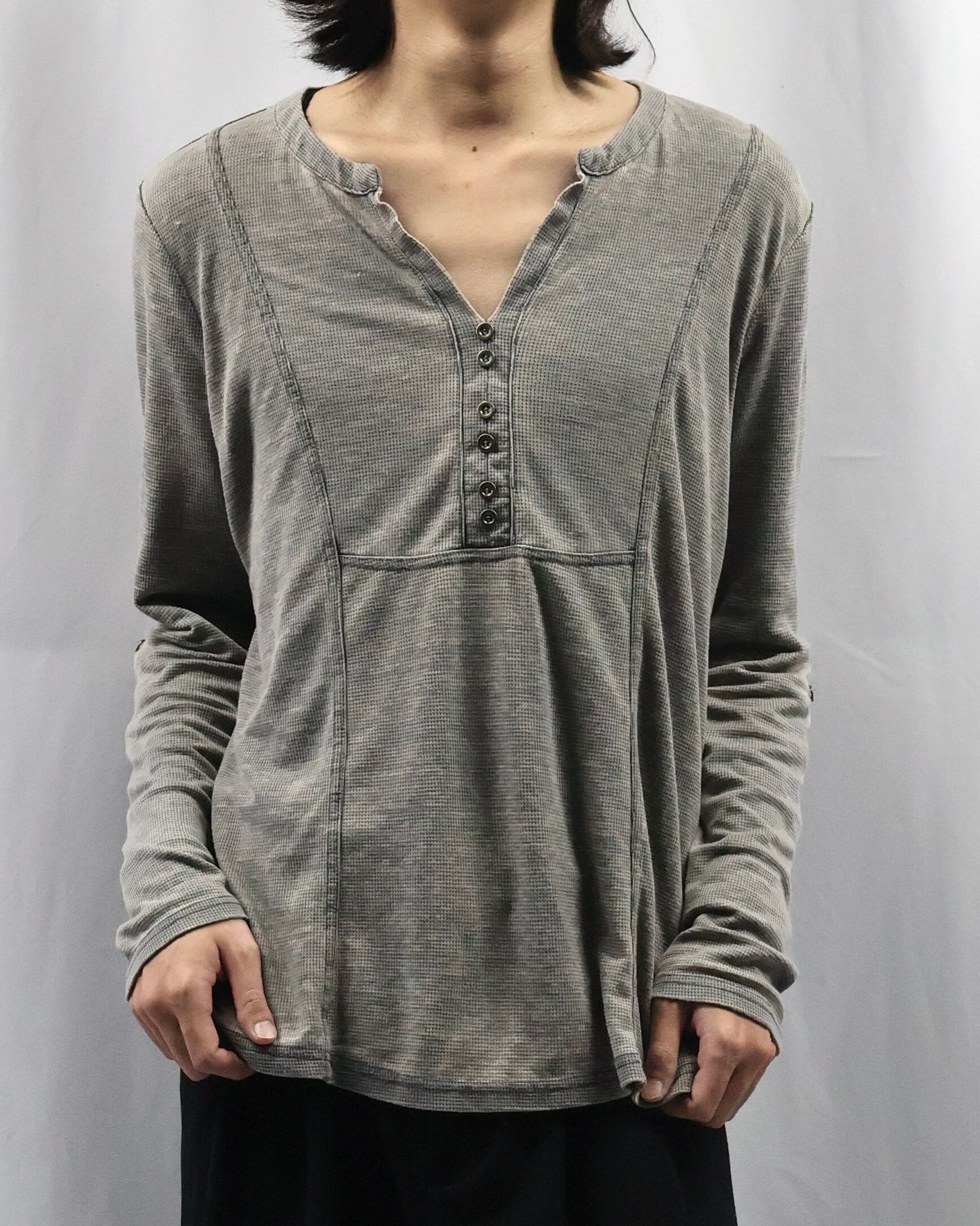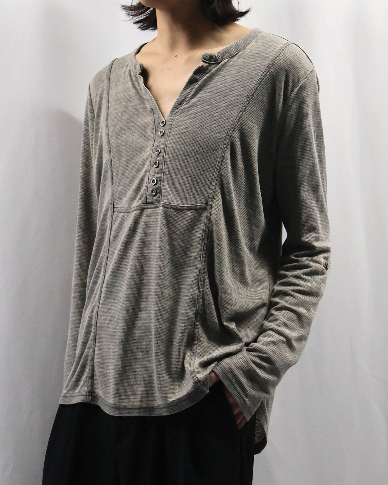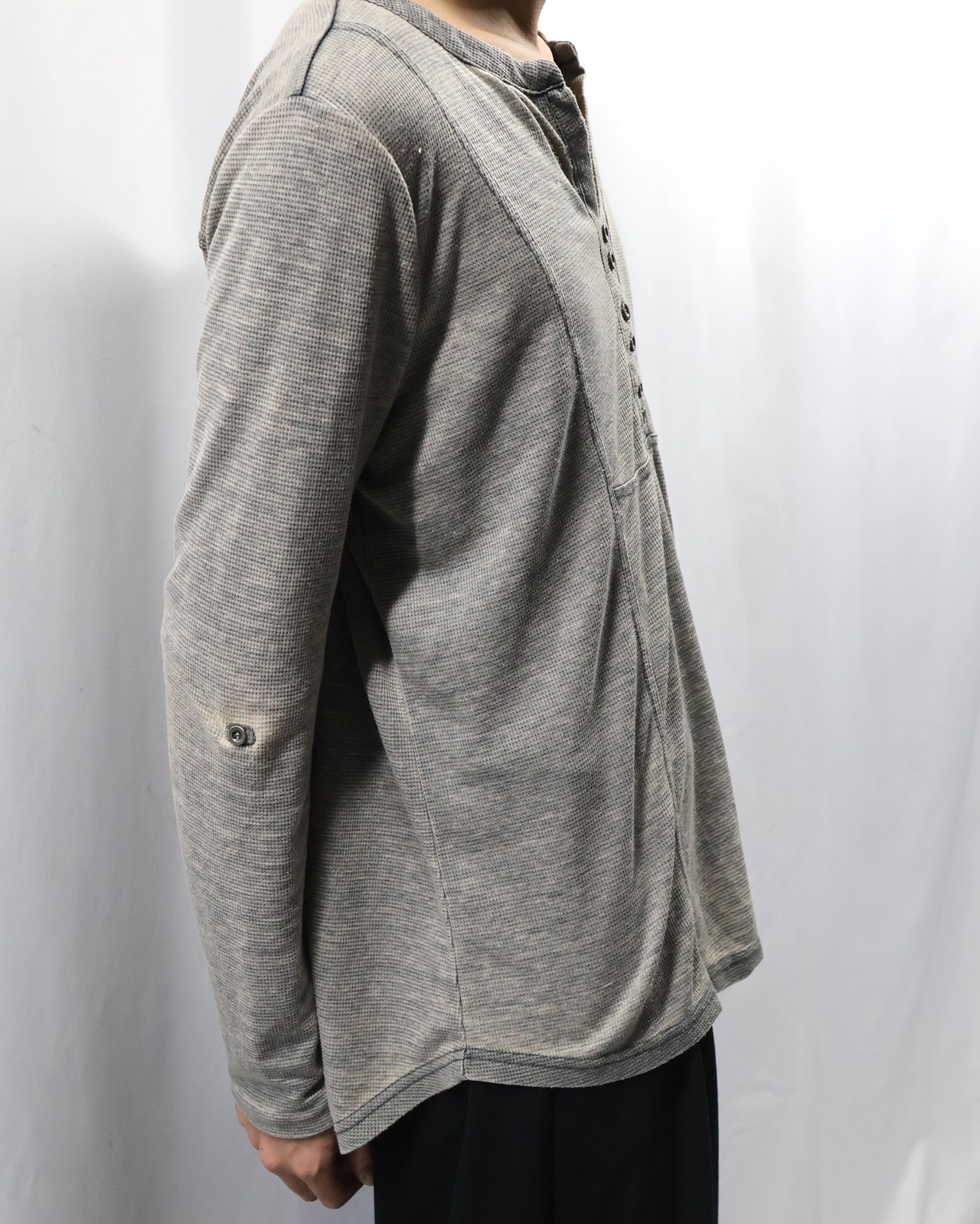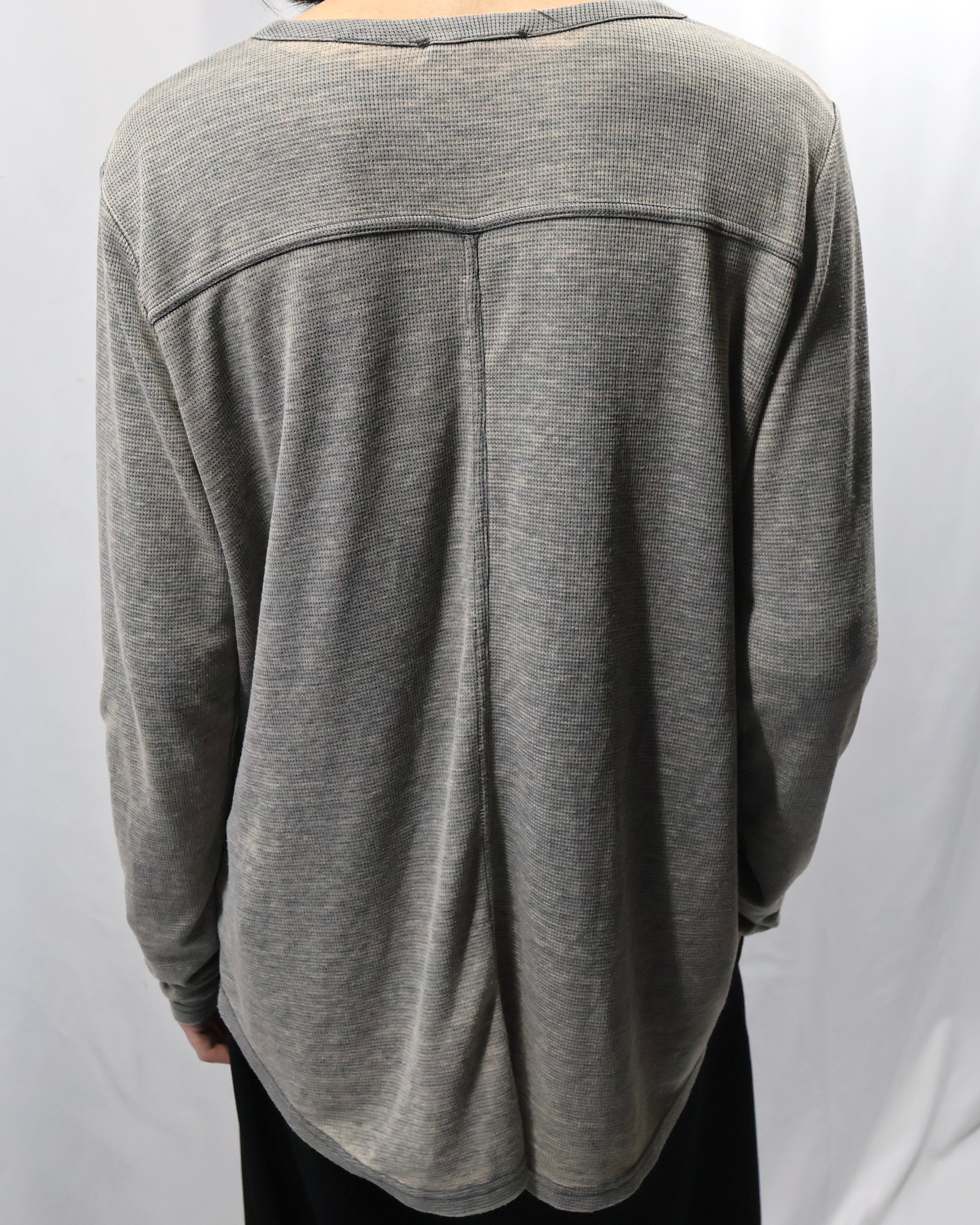細かなワッフル調の生地が立体感を生み、シンプルながら表情のある一枚。袖口にはボタンタブが付き、ロールアップしての着用も可能。