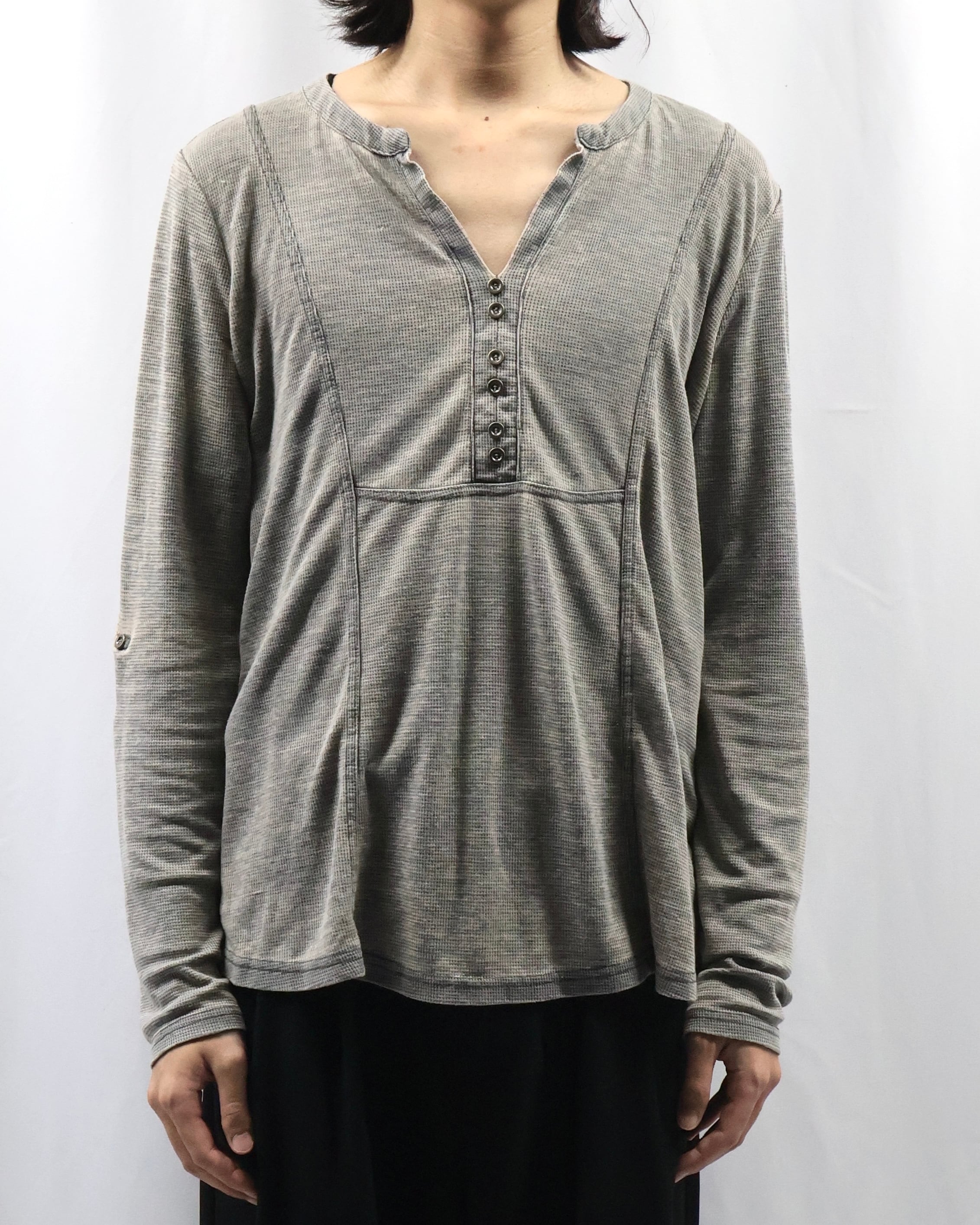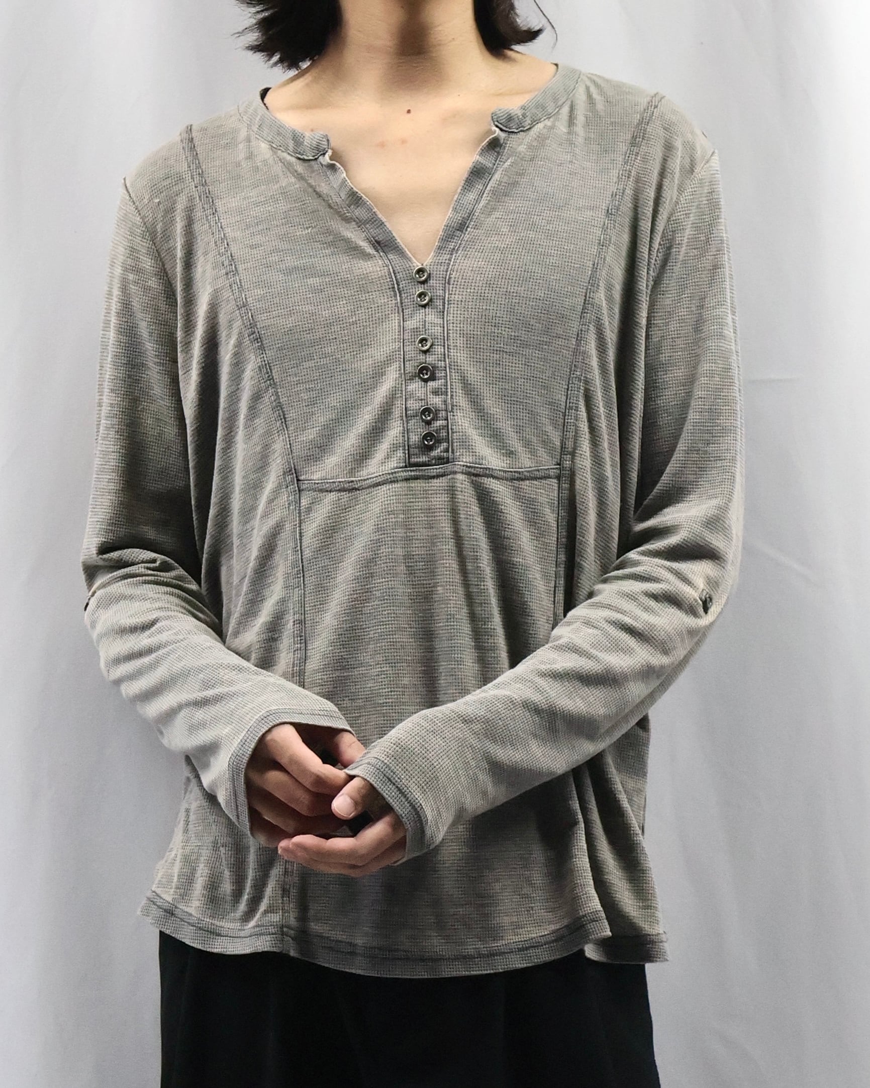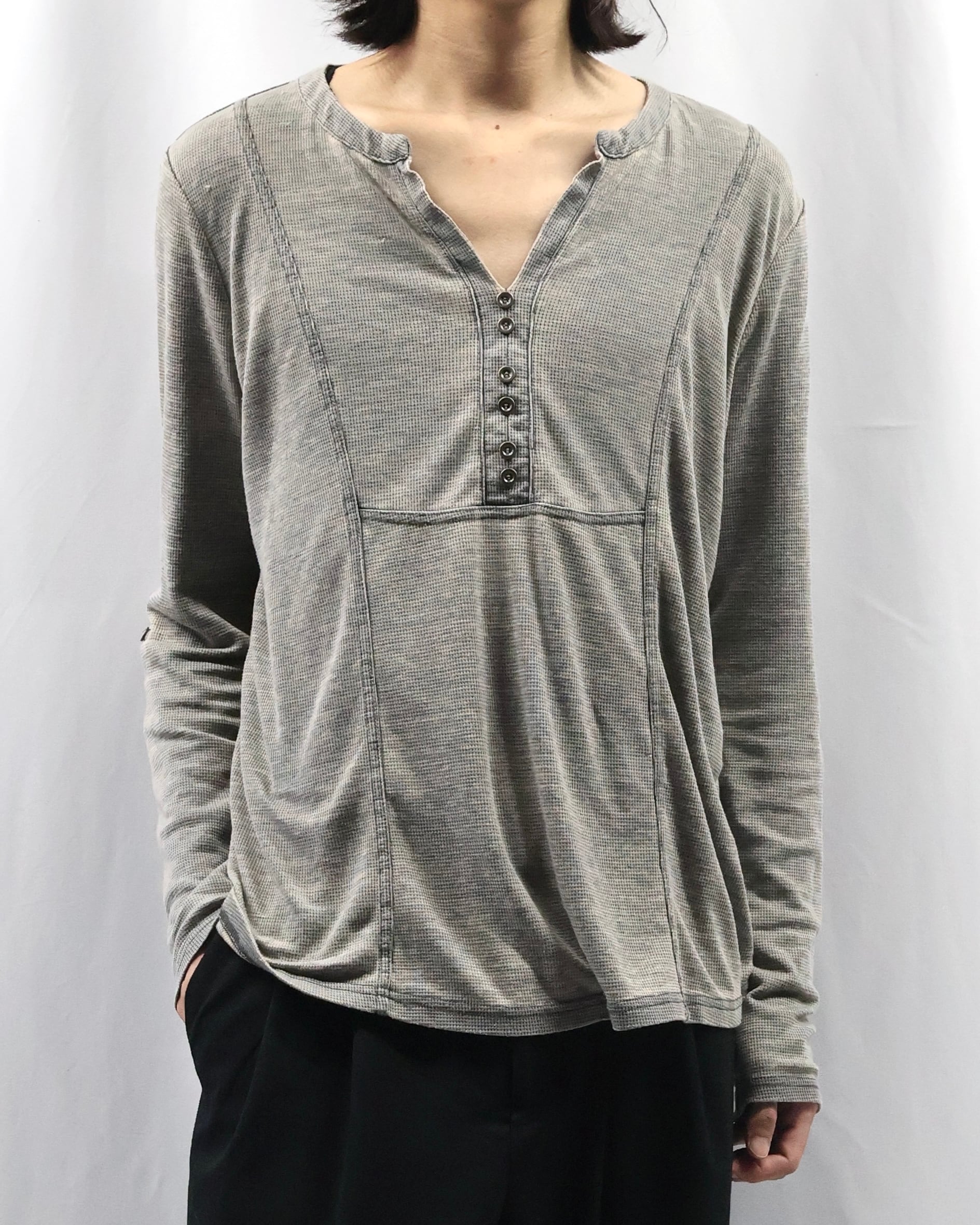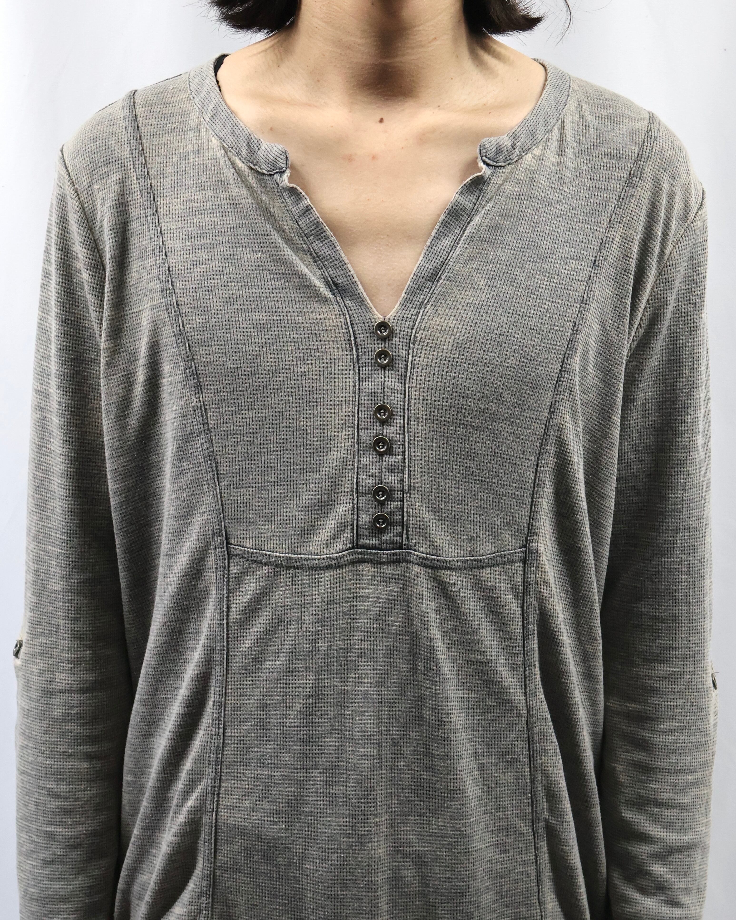細かなワッフル調の生地が立体感を生み、シンプルながら表情のある一枚。袖口にはボタンタブが付き、ロールアップしての着用も可能。