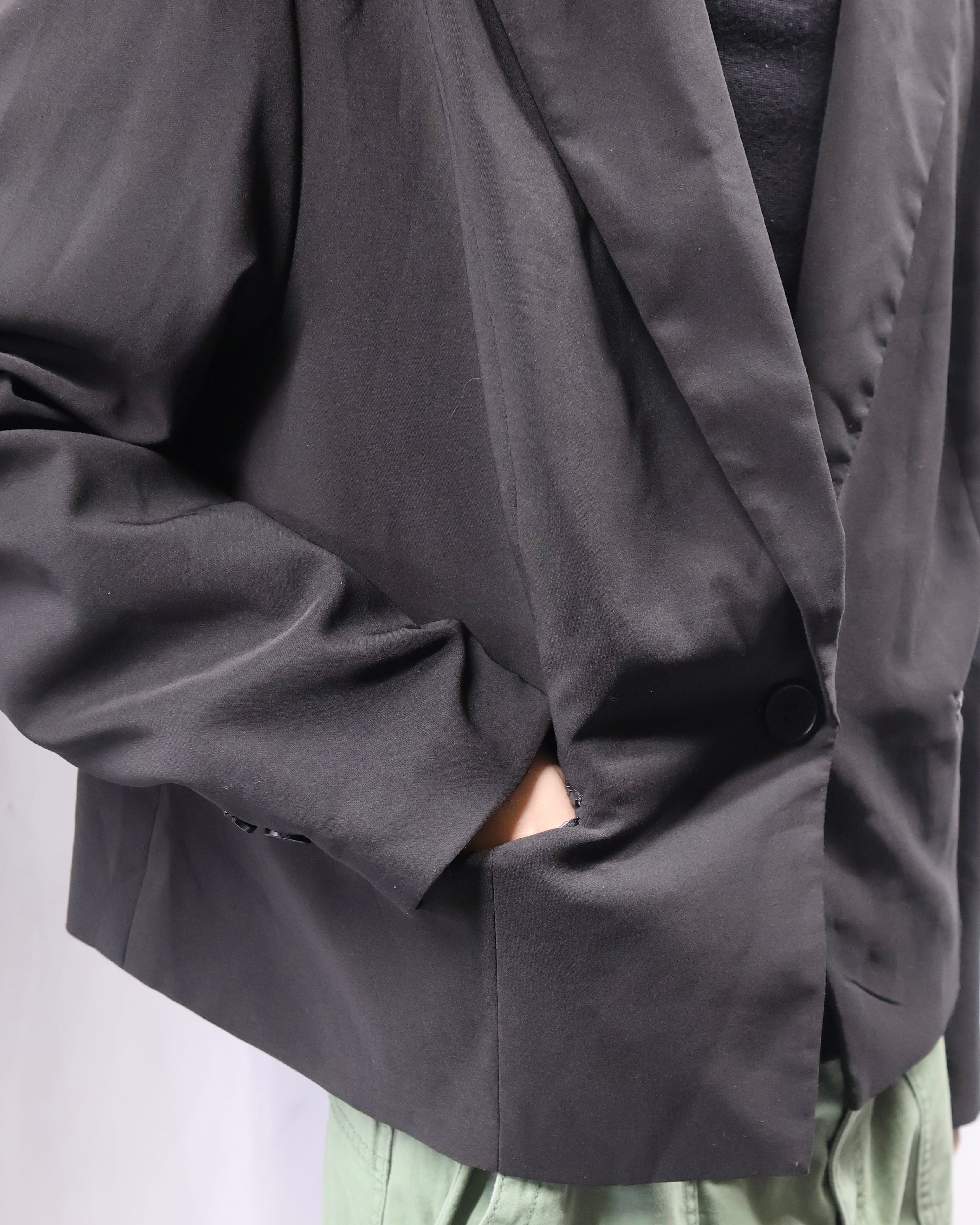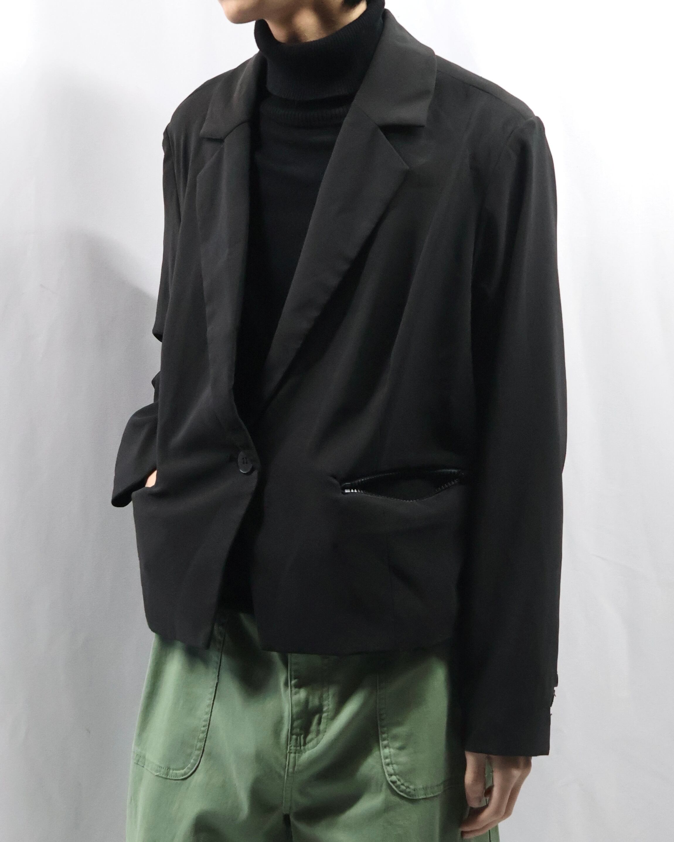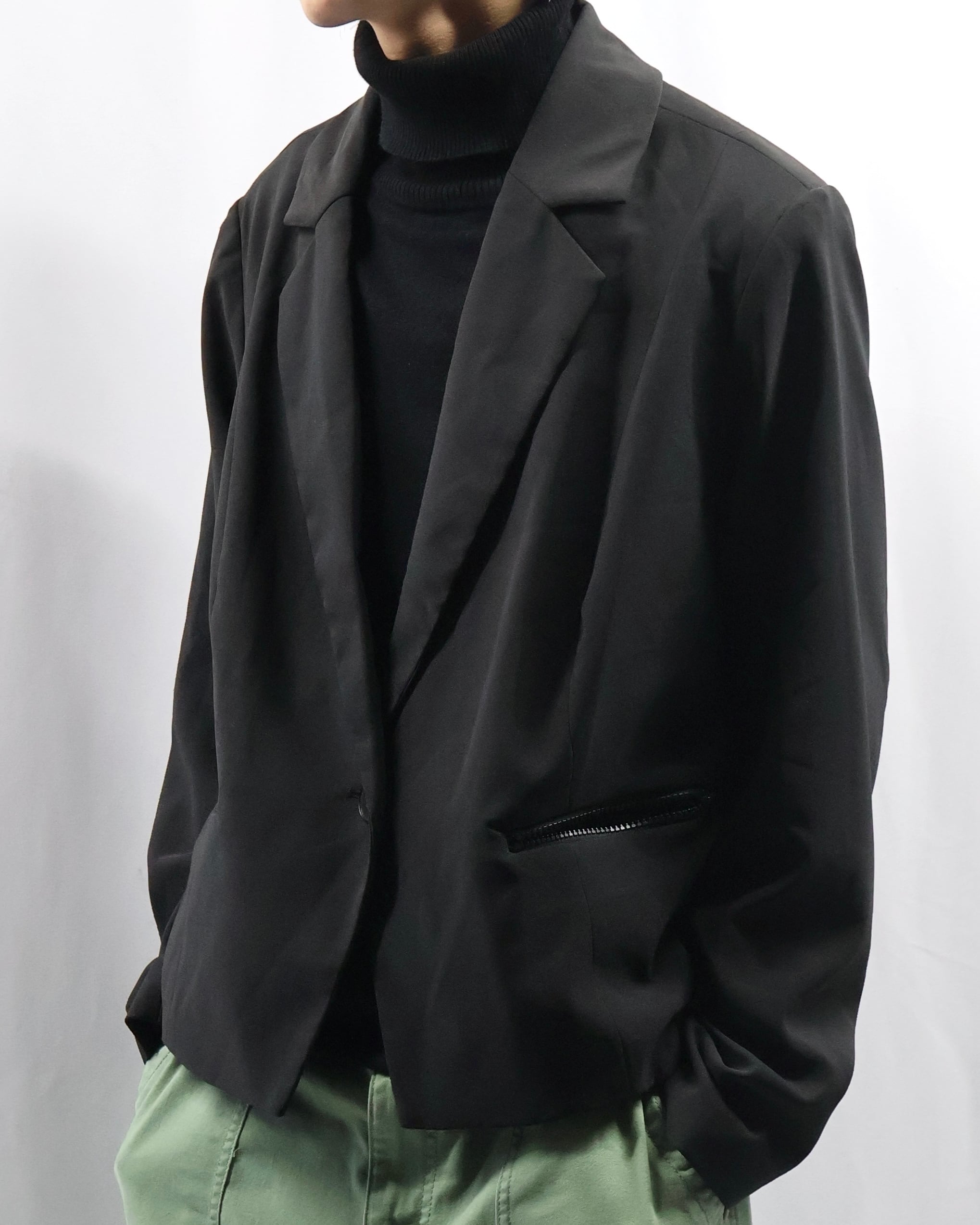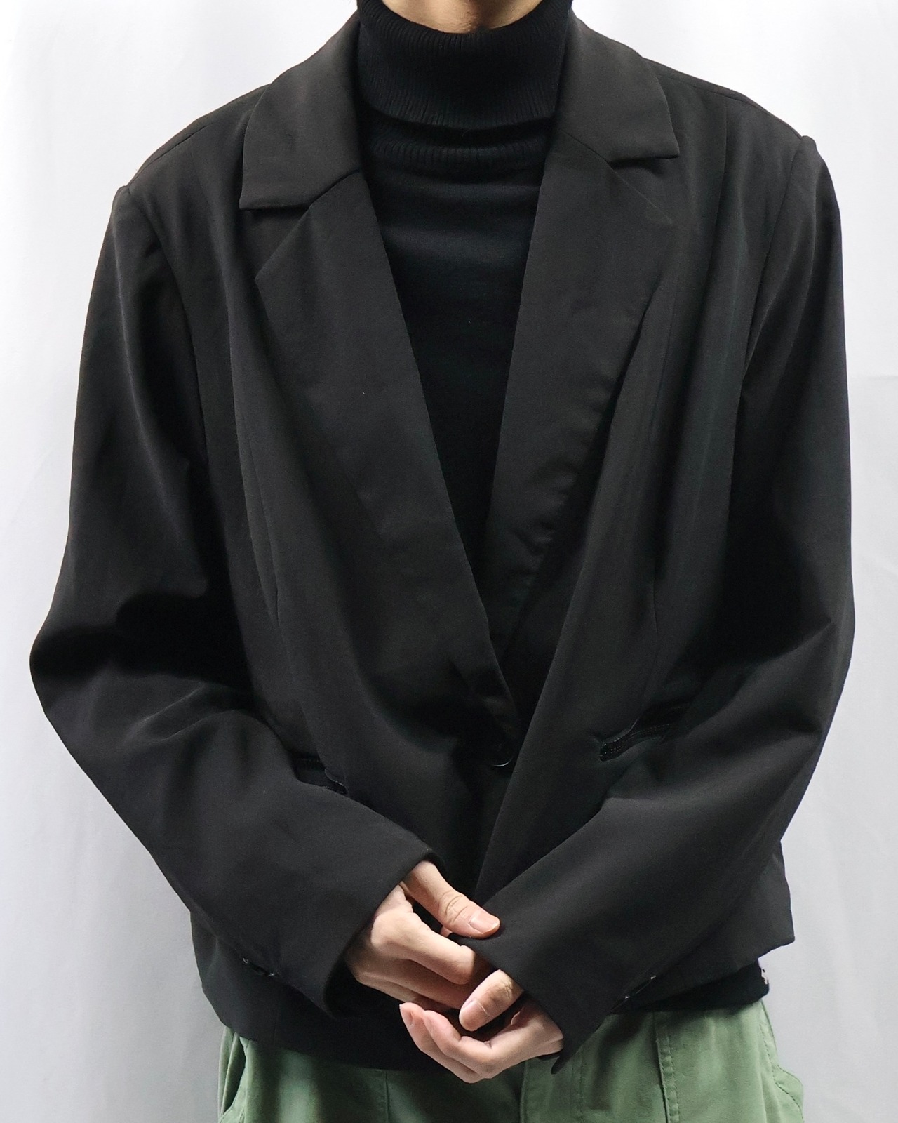 フロントは1ボタンで、サイドのジップポケットが程よいアクセントに。リラックスしたサイズ感でインナーを選ばず着用可能。