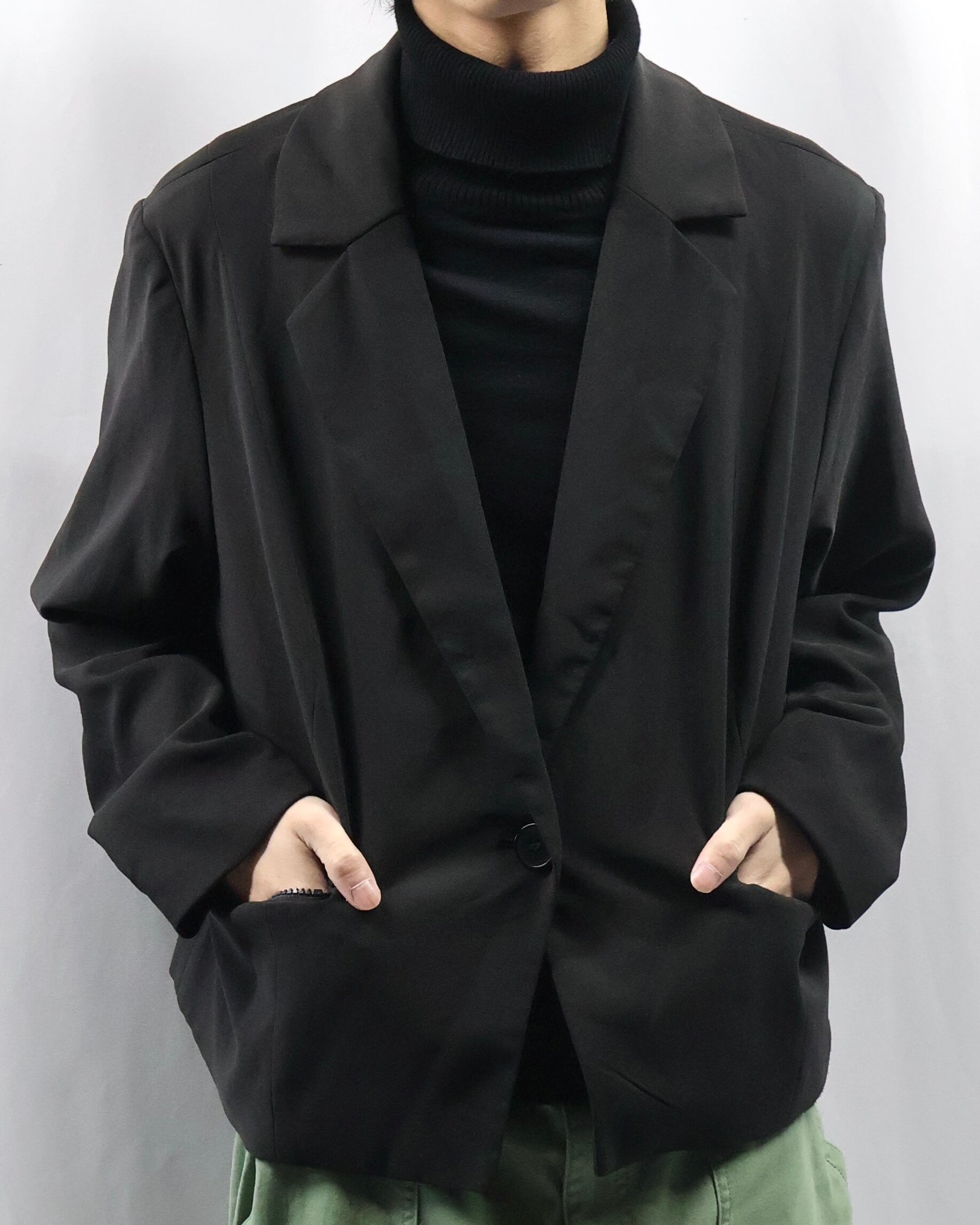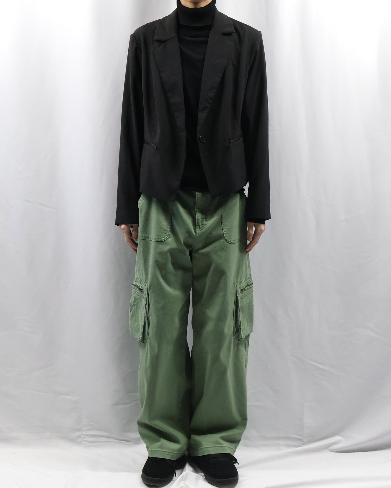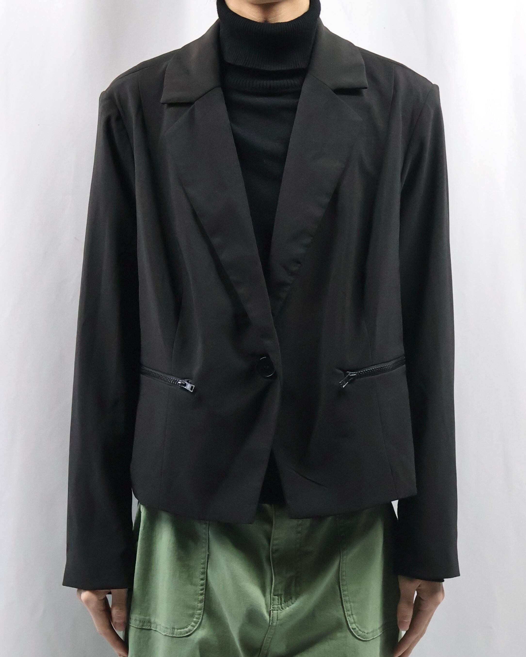 フロントは1ボタンで、サイドのジップポケットが程よいアクセントに。リラックスしたサイズ感でインナーを選ばず着用可能。