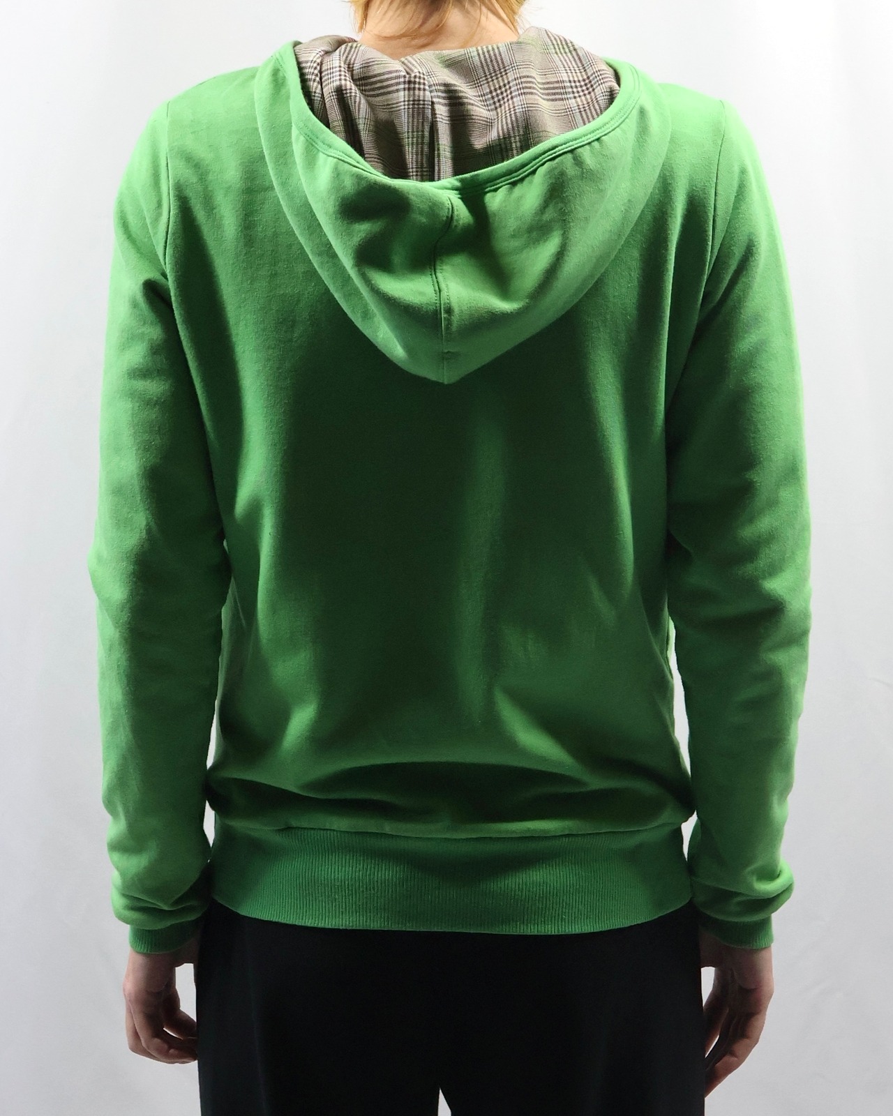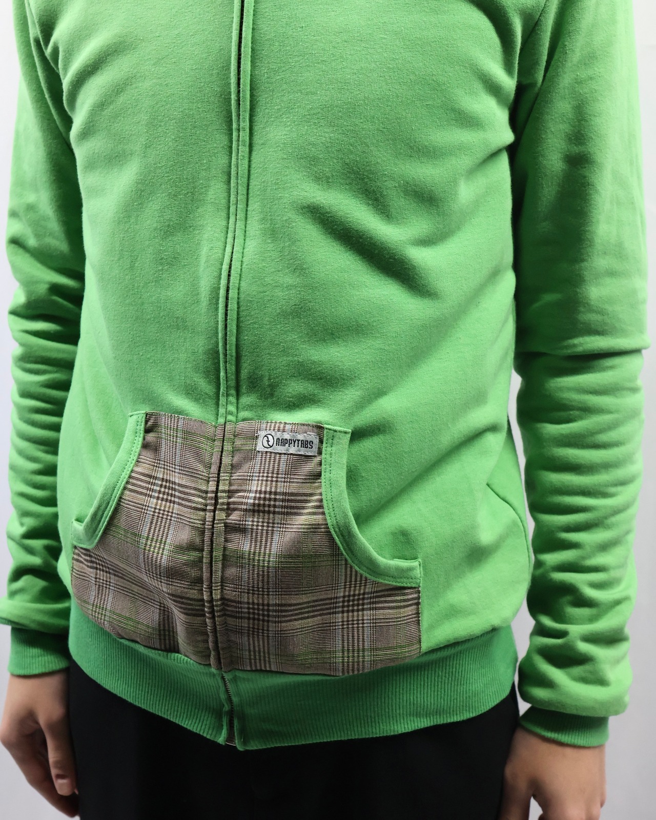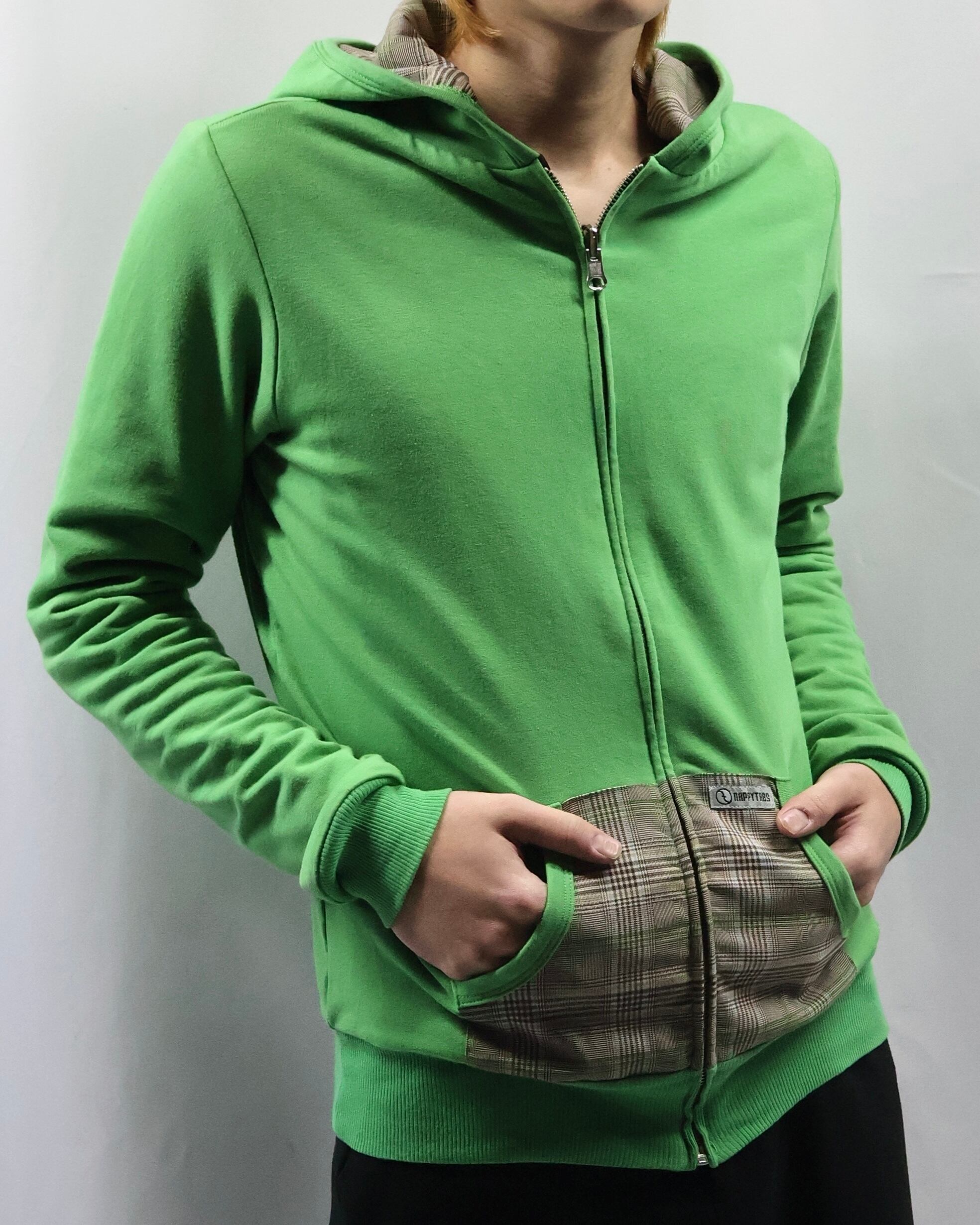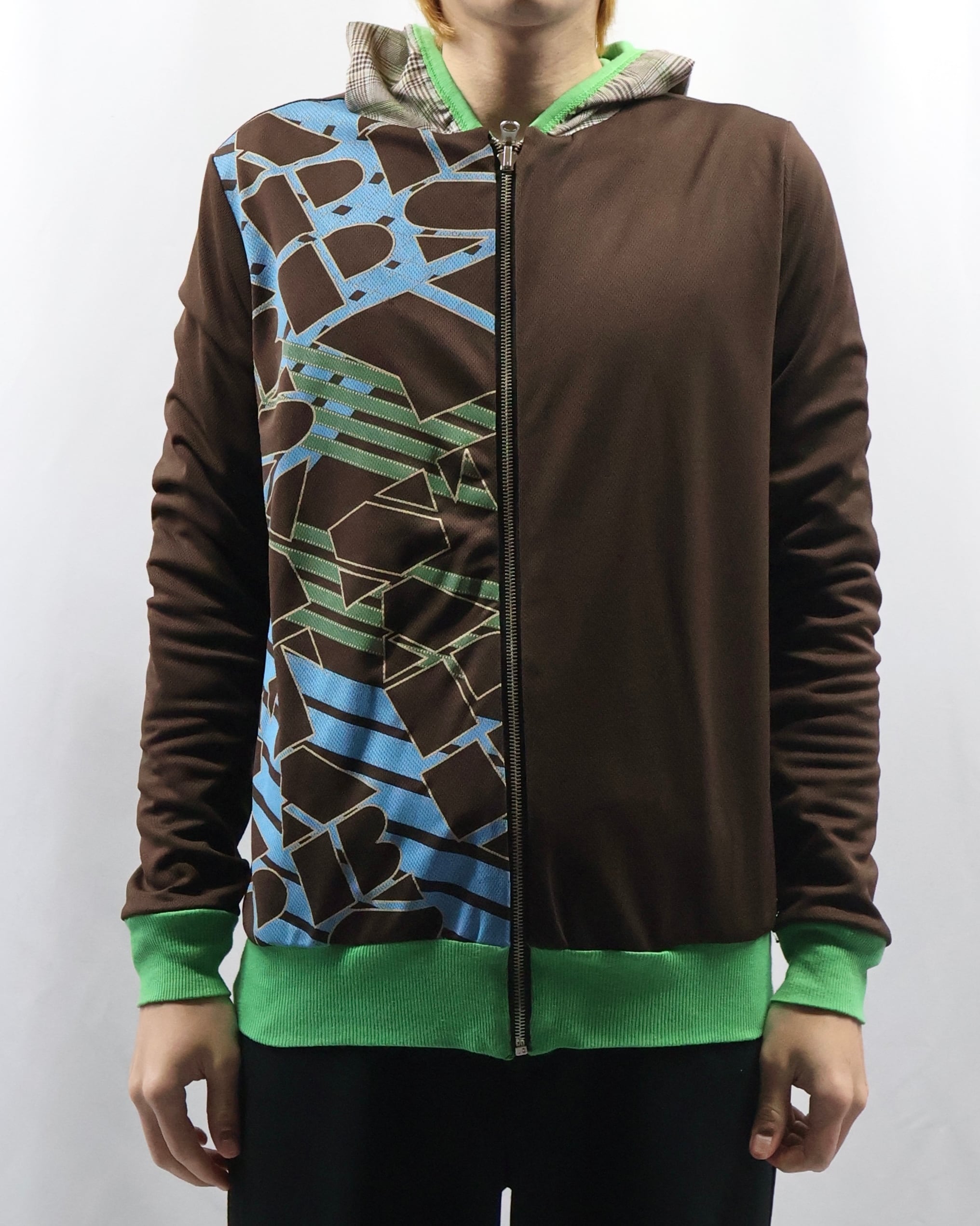 表はライトグリーンのボディにチェック柄のカンガルーポケットを配した柔らかな雰囲気で、裏面はブラウンを基調にブルーとグリーンのグラフィックを大胆にあしらった存在感のあるデザイン。気分やスタイリングに合わせて2WAYで着用できる万能フーディ。