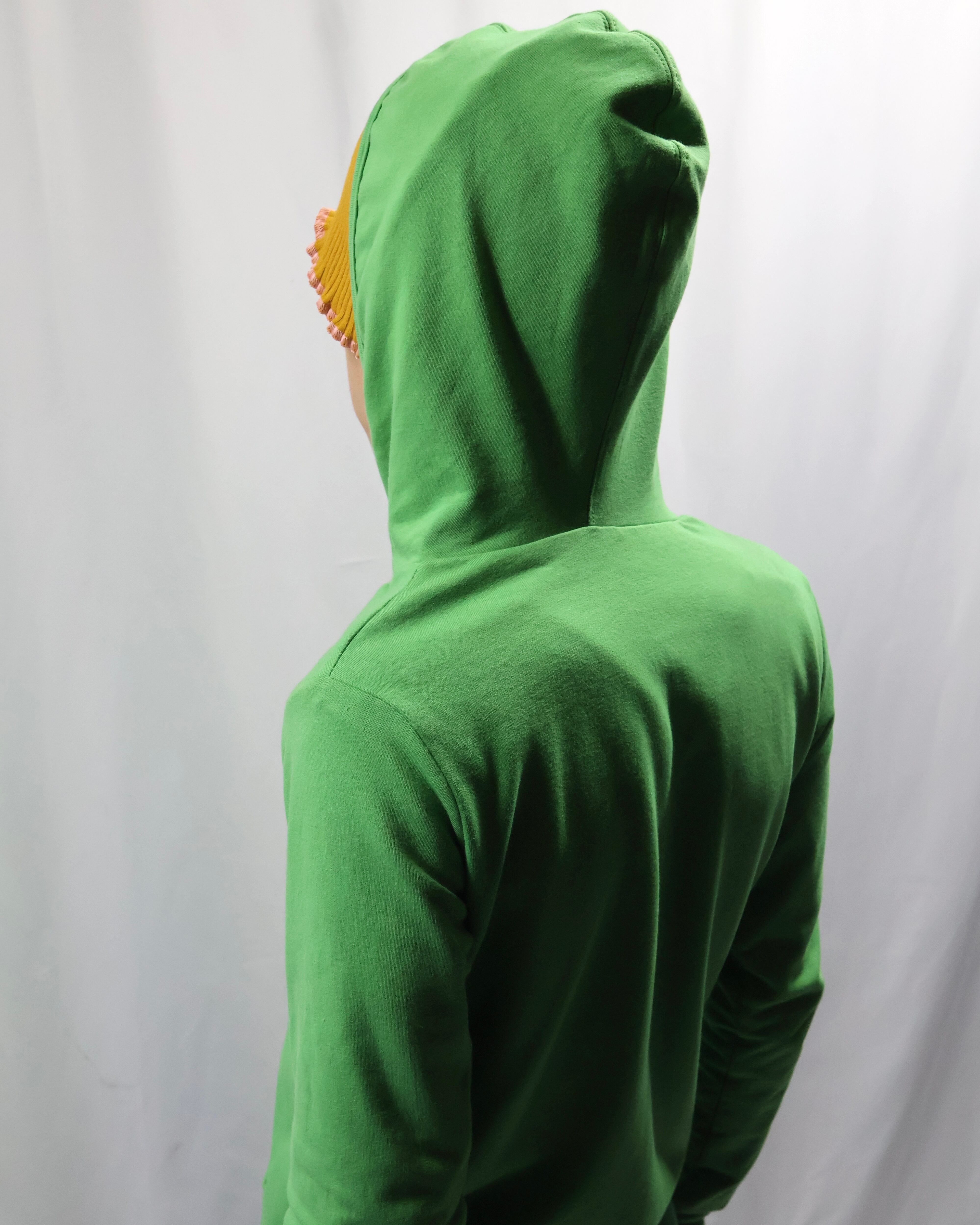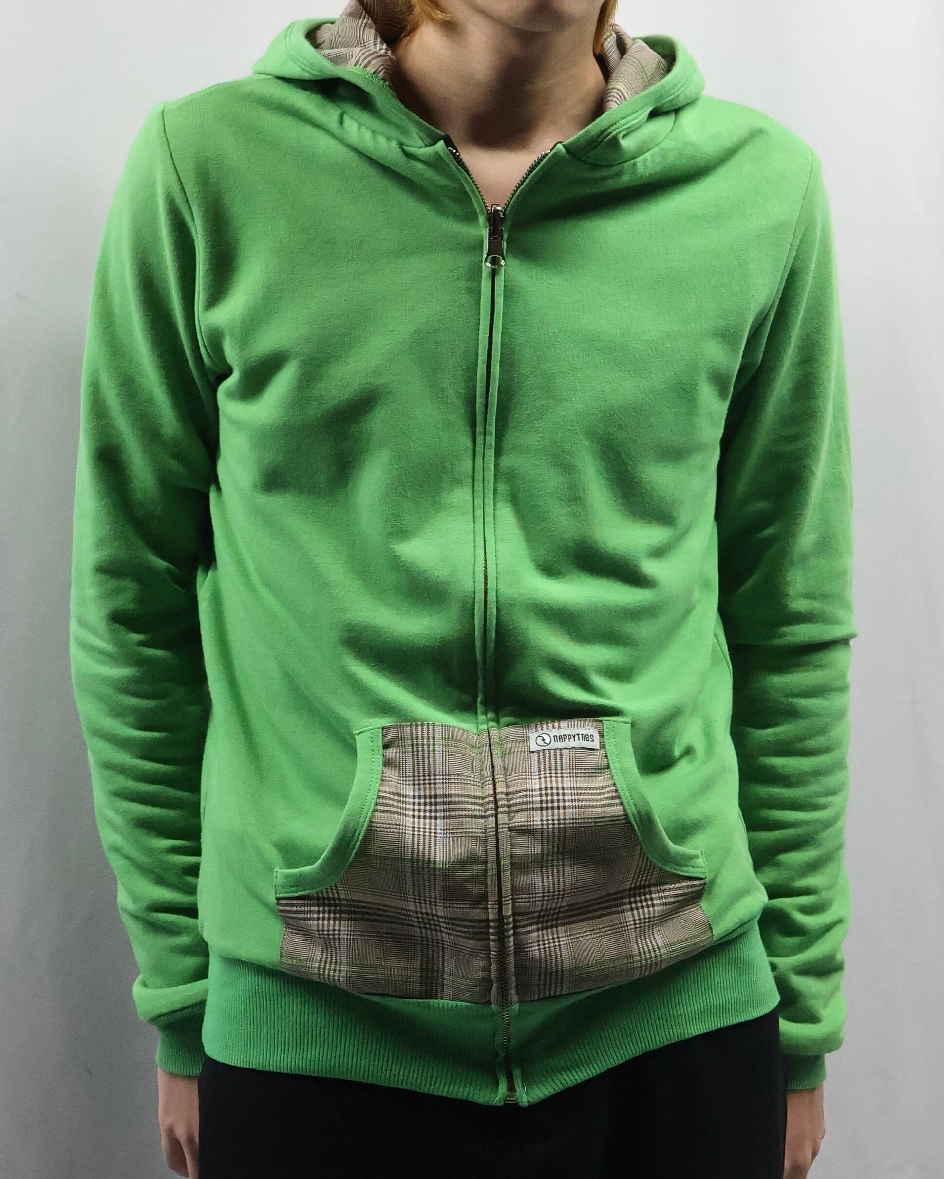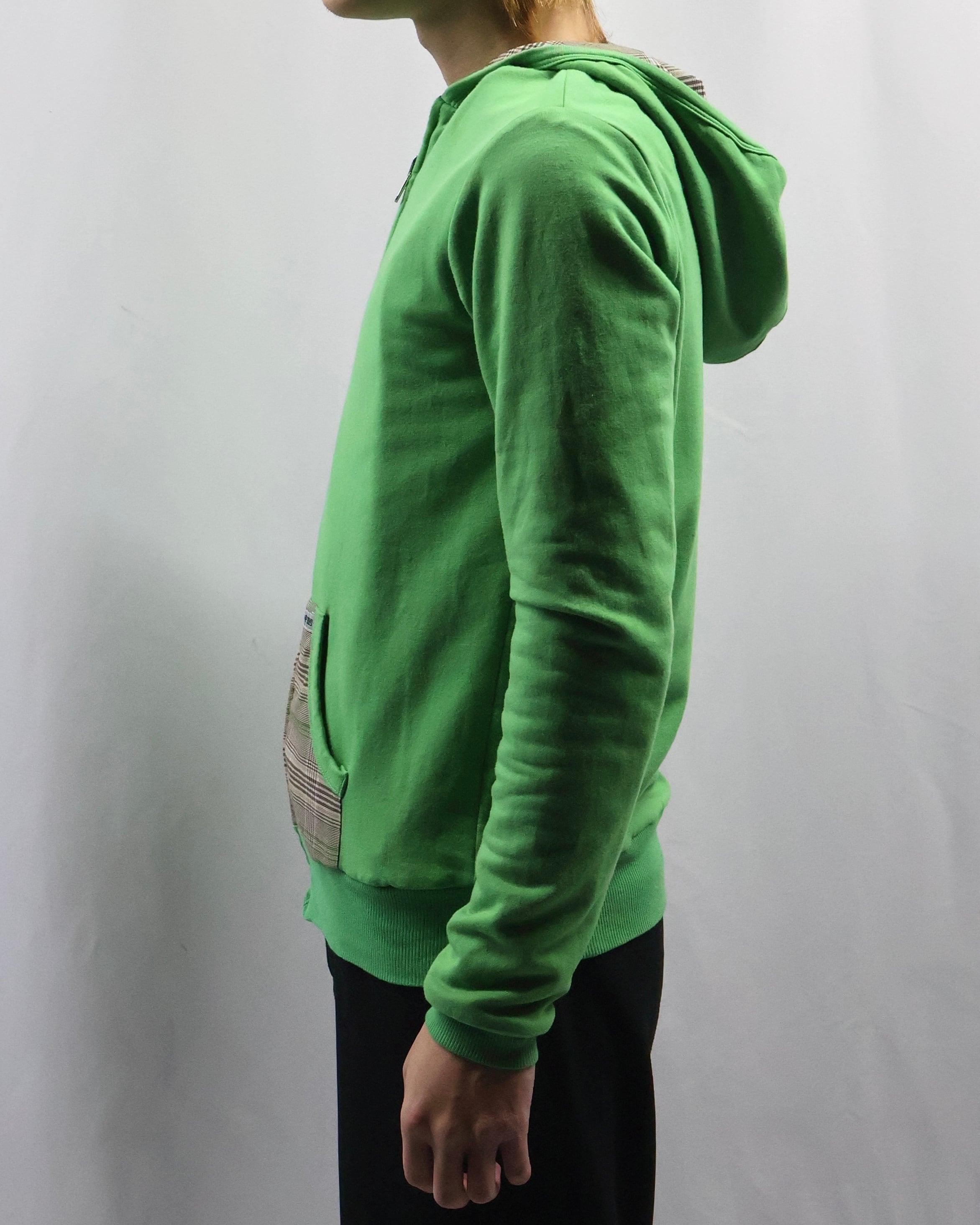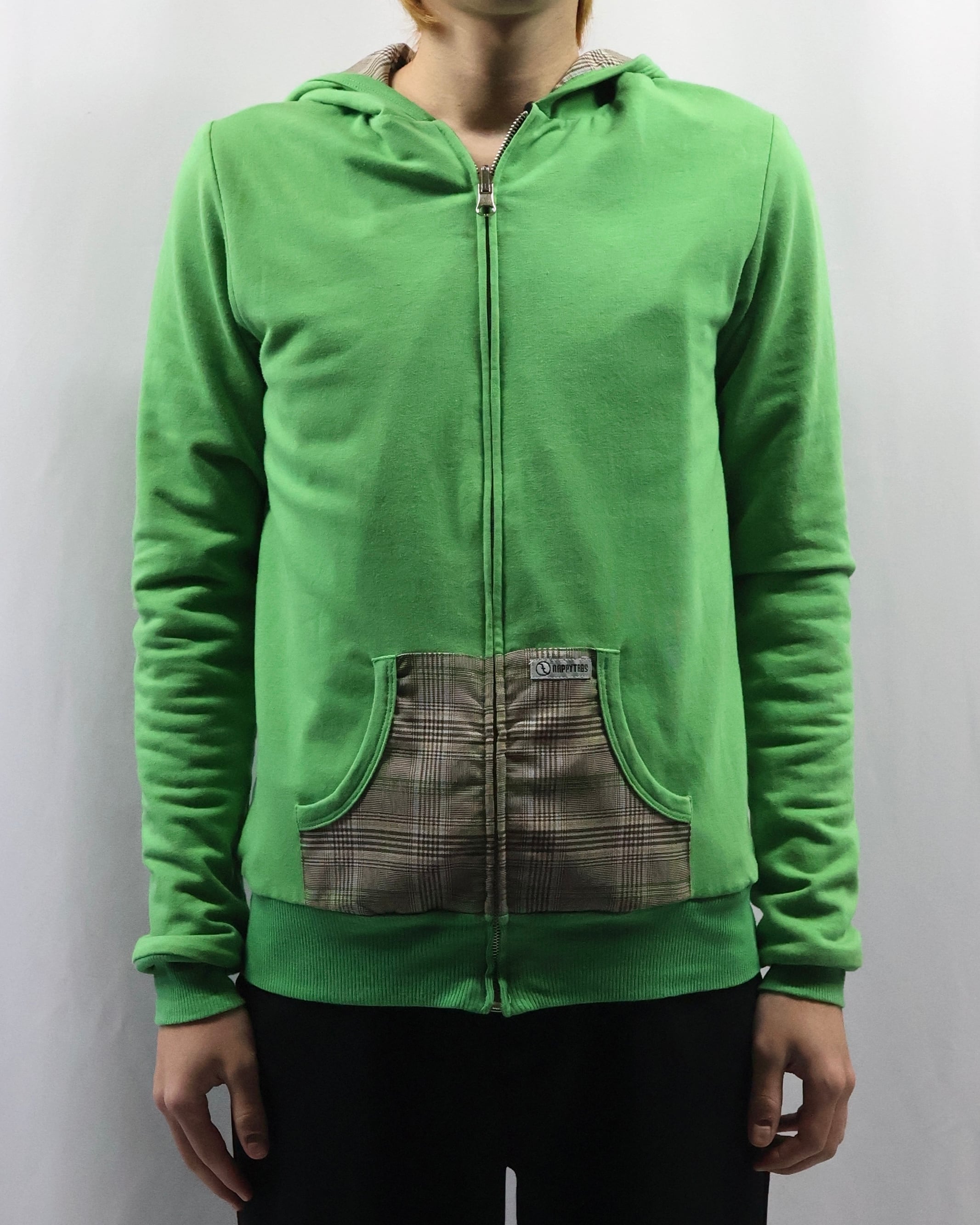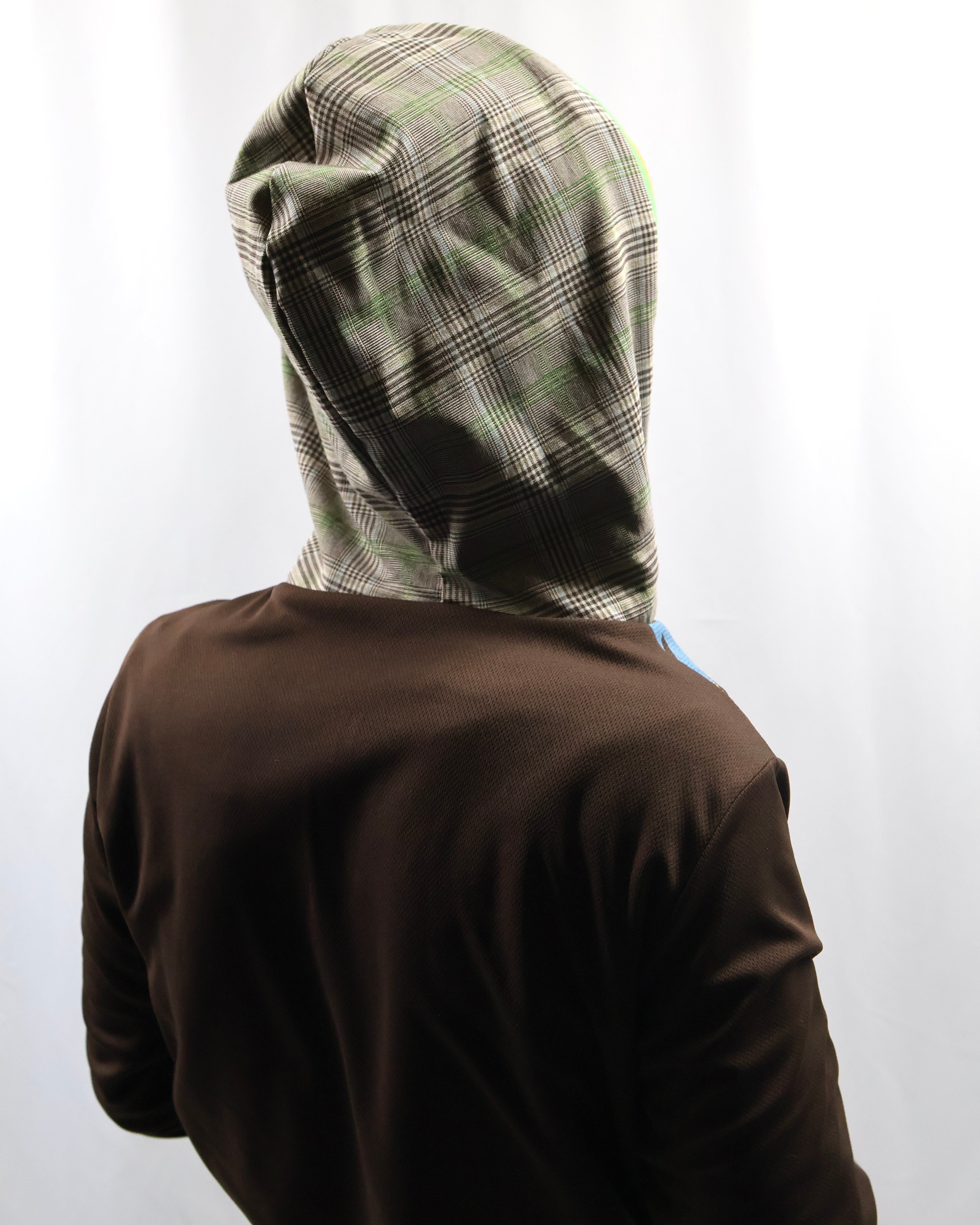 表はライトグリーンのボディにチェック柄のカンガルーポケットを配した柔らかな雰囲気で、裏面はブラウンを基調にブルーとグリーンのグラフィックを大胆にあしらった存在感のあるデザイン。気分やスタイリングに合わせて2WAYで着用できる万能フーディ。