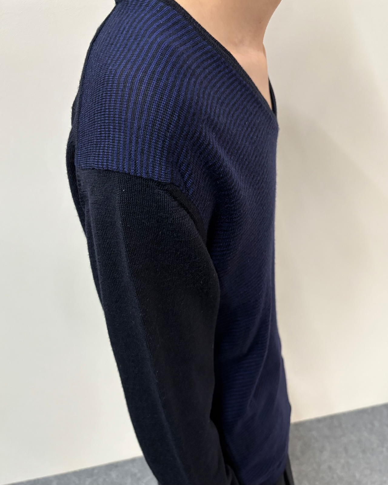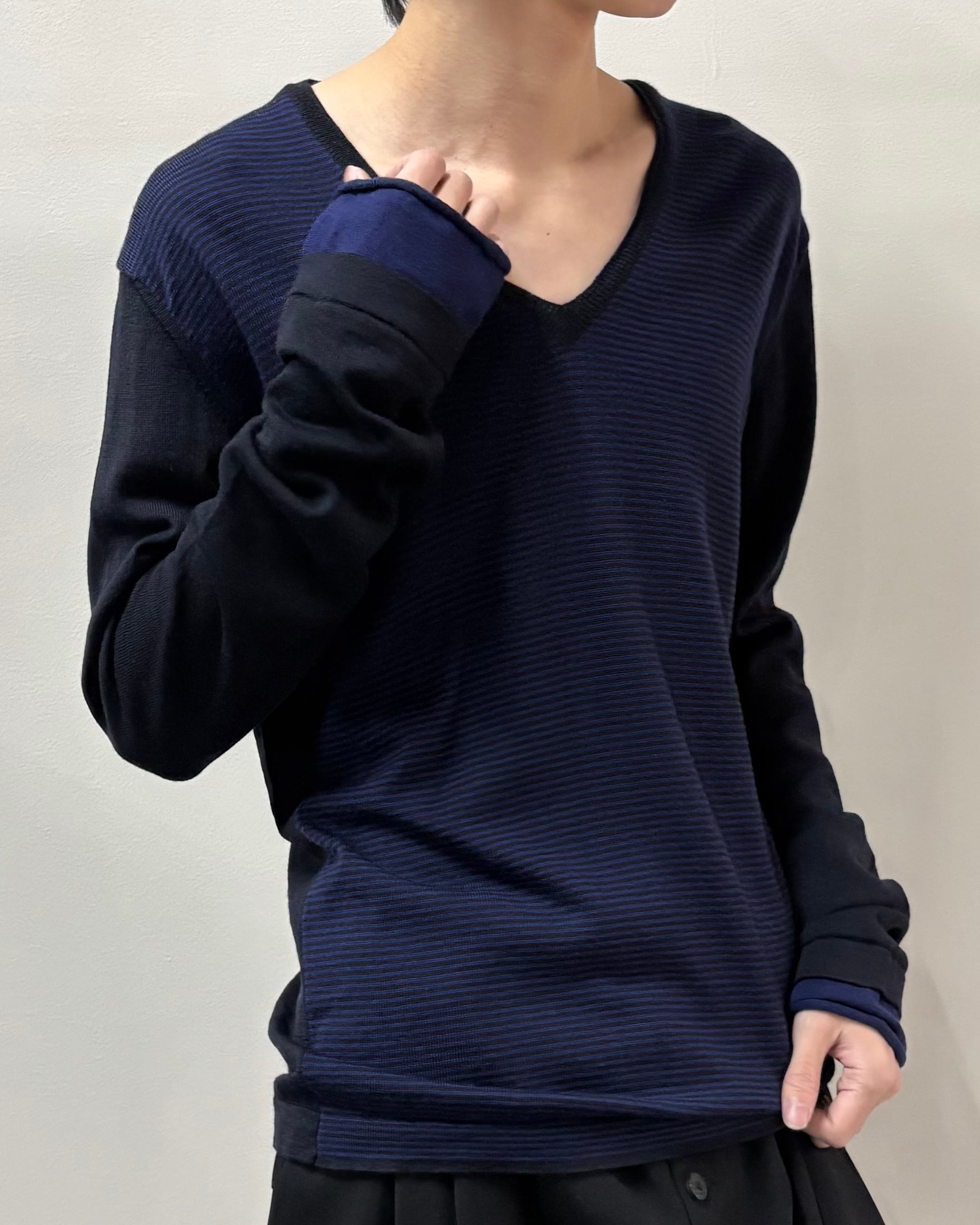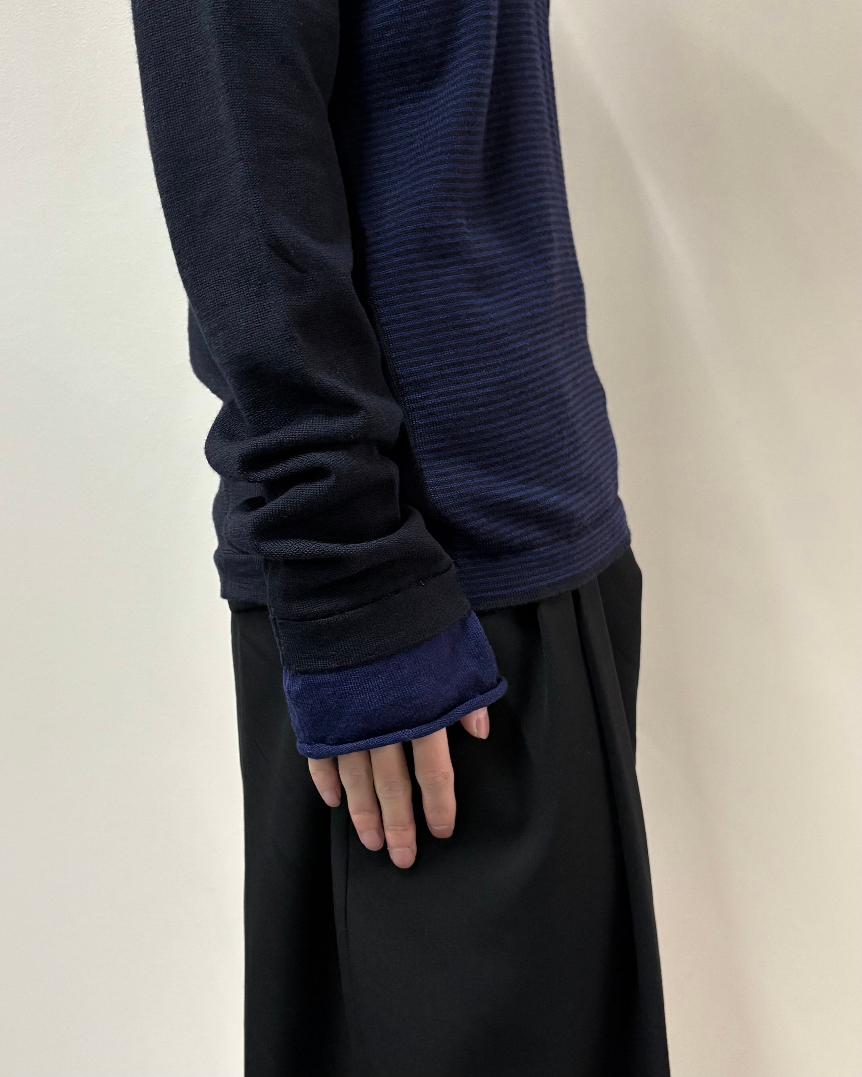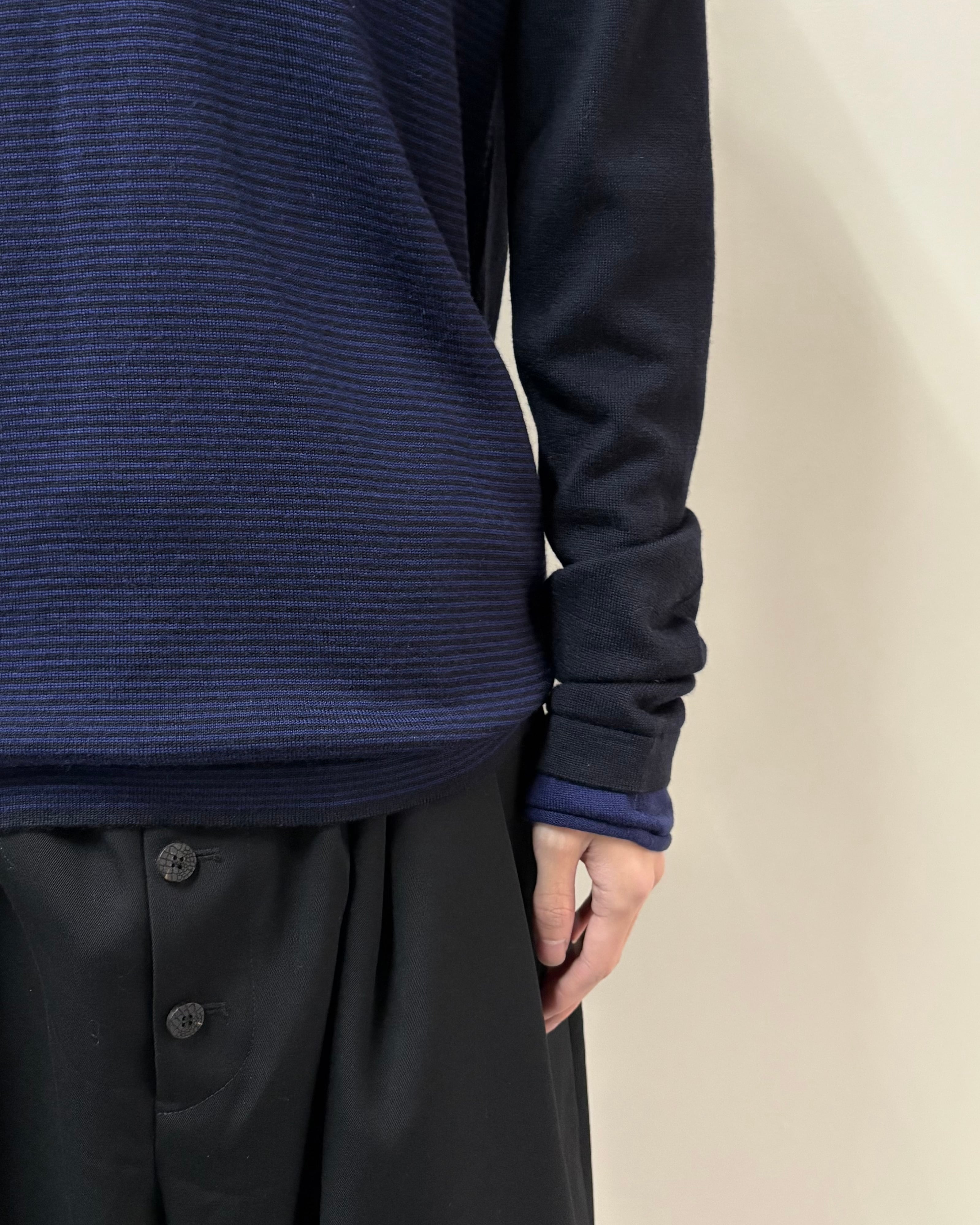 フロントのダーク配色のボーダーデザインが特徴的。深みのある色味をしているので、1枚でも様に着用でき、モードなスタイルにも活躍できる1着。