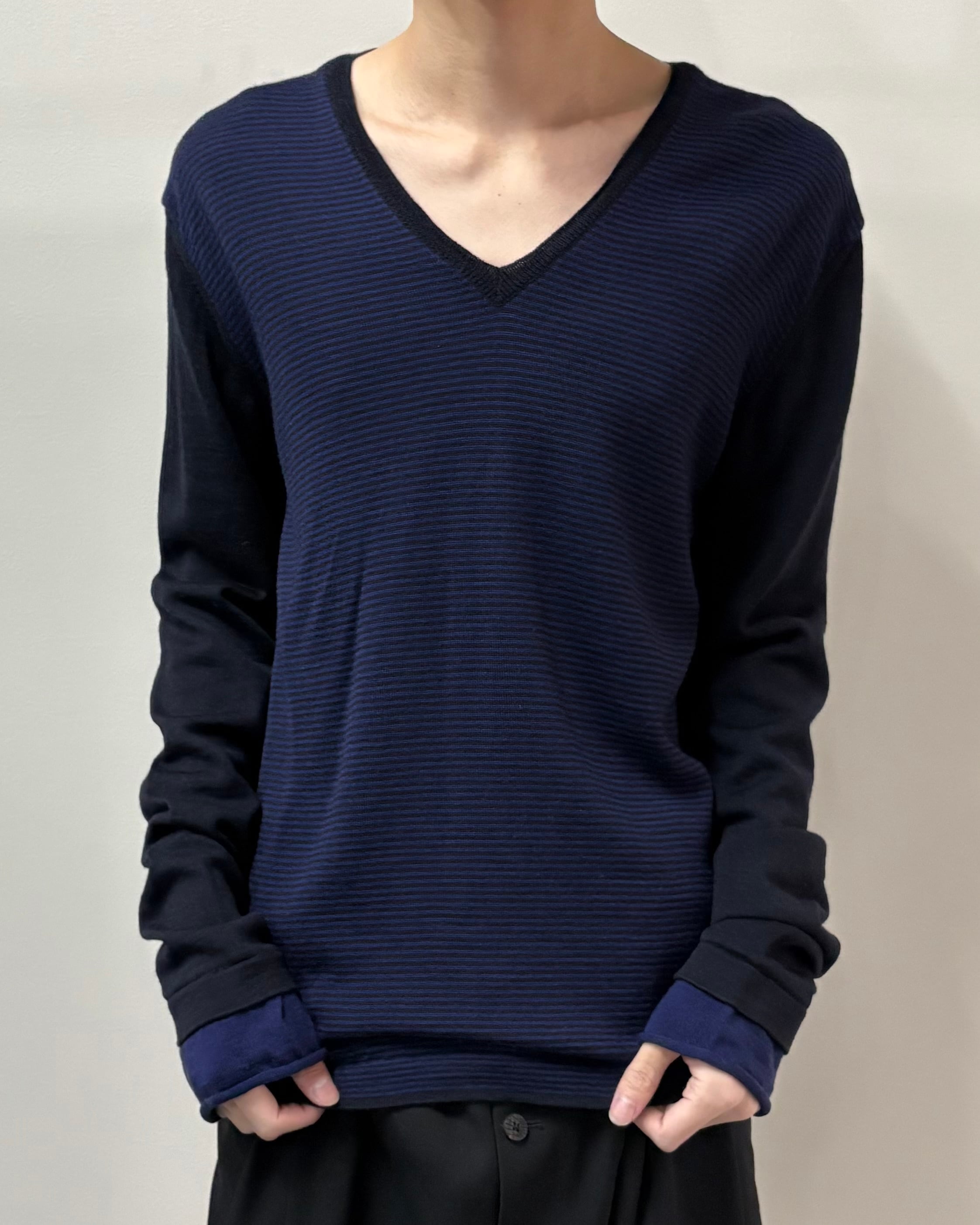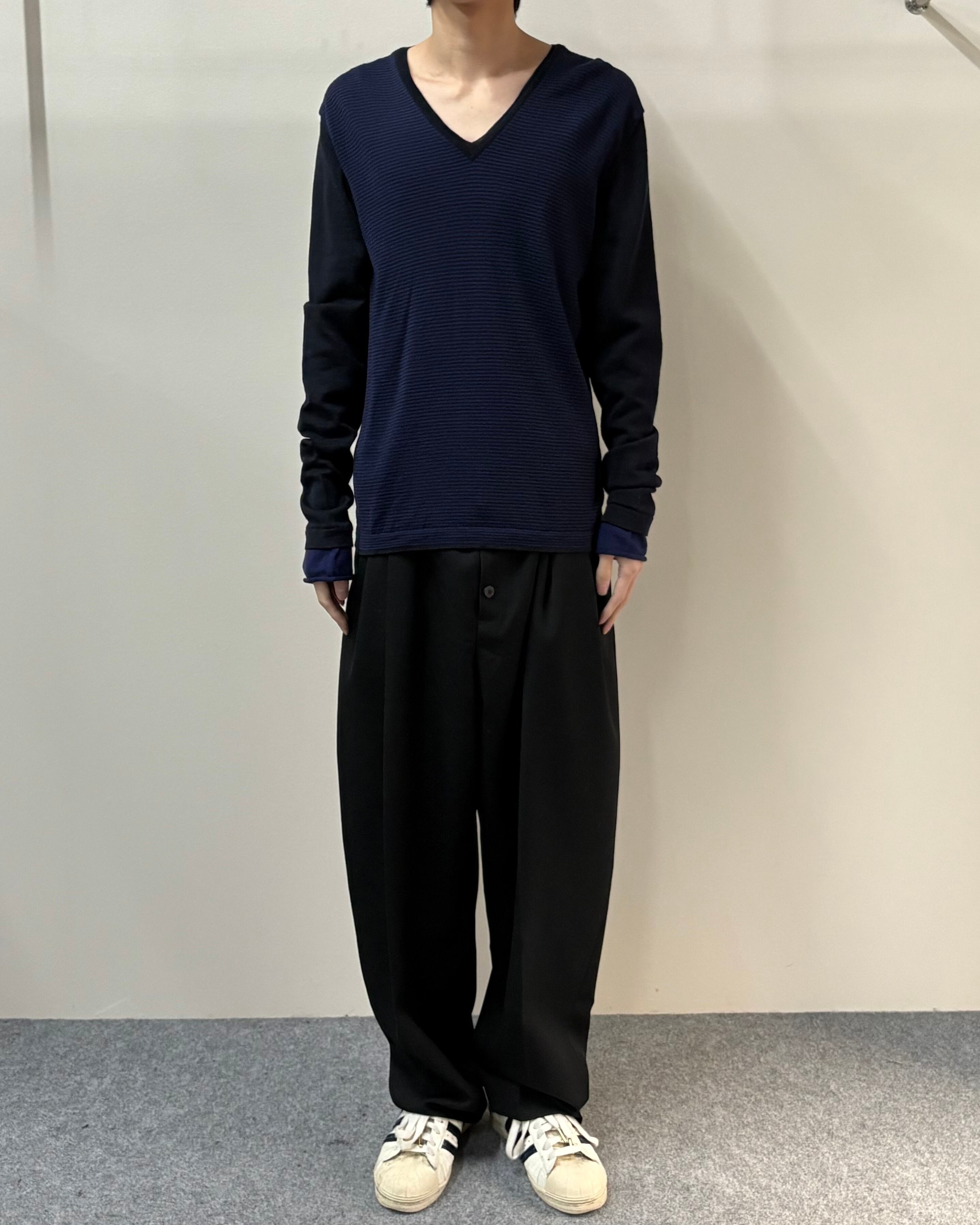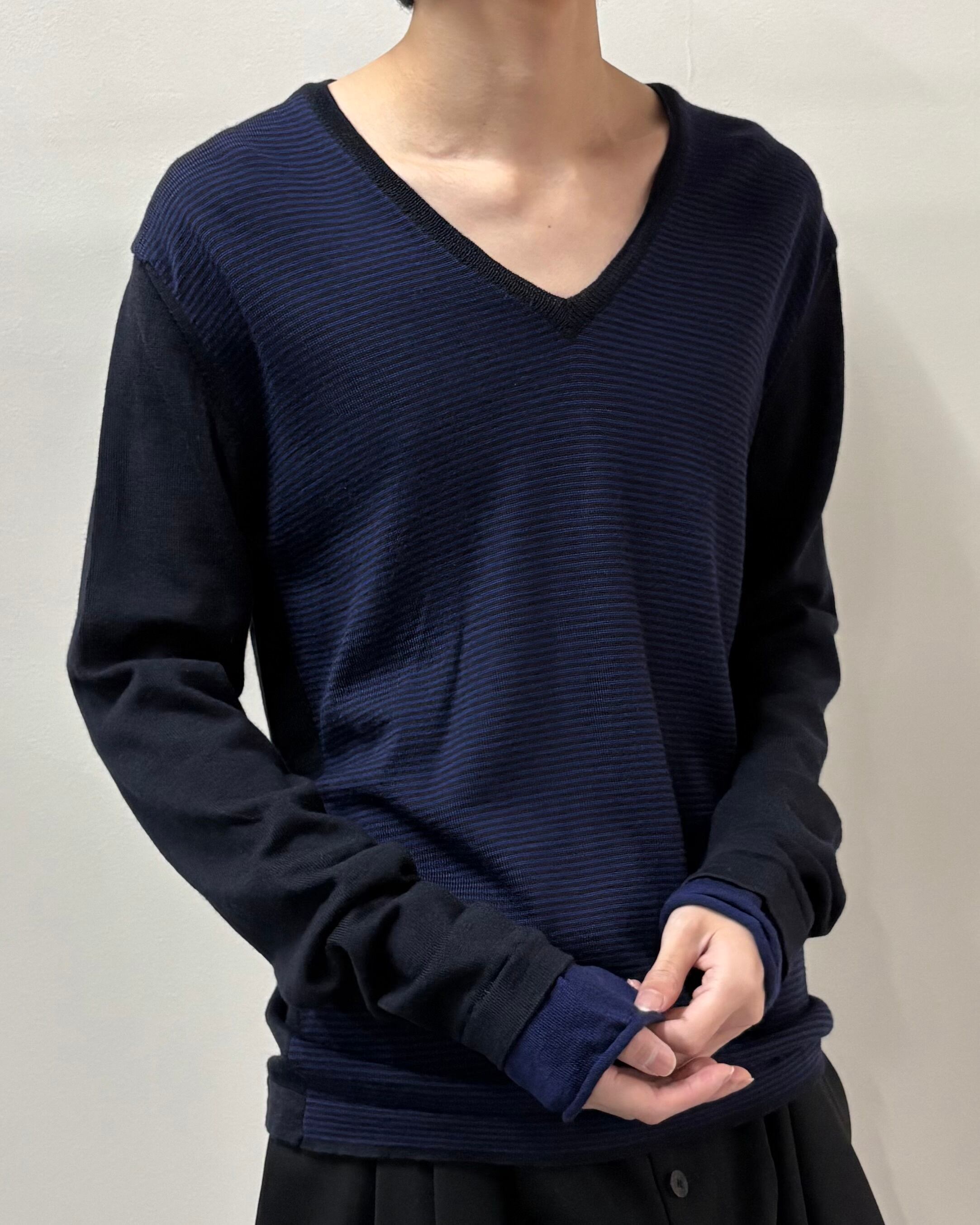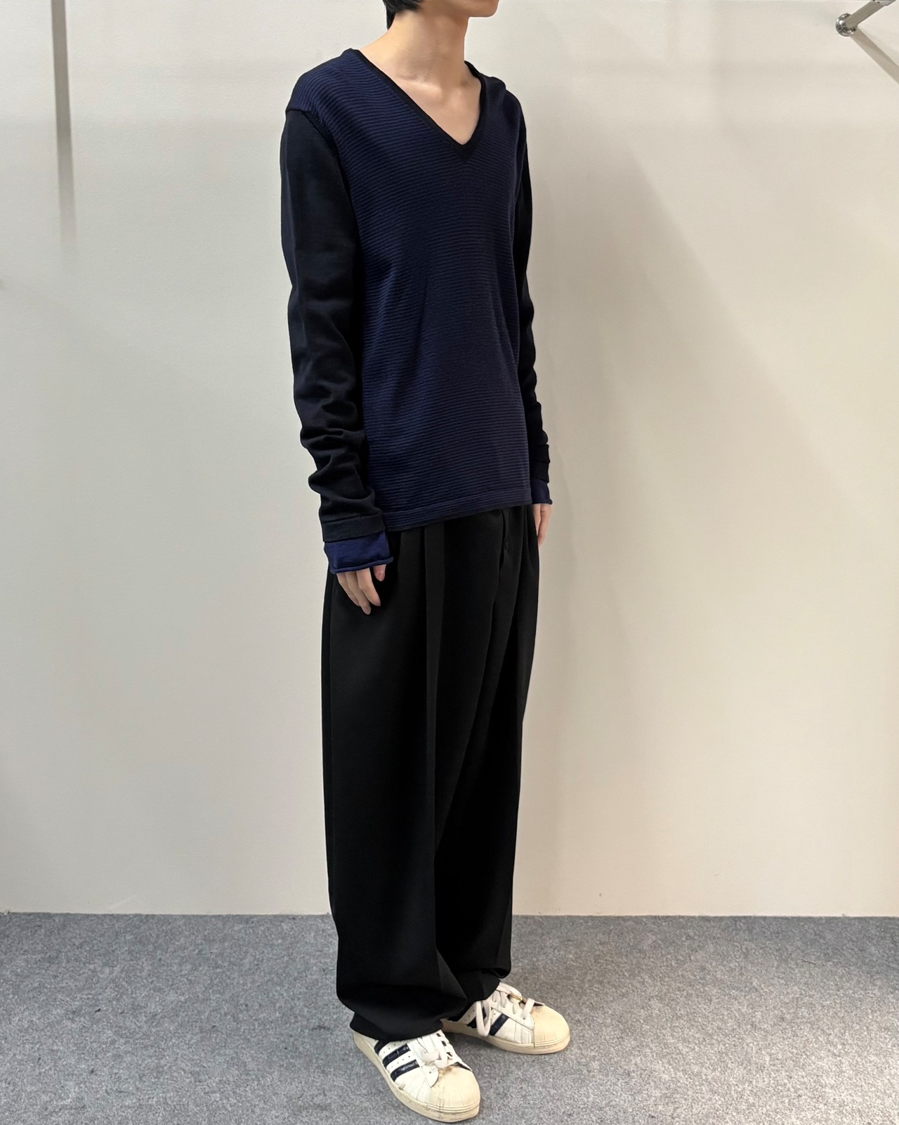 フロントのダーク配色のボーダーデザインが特徴的。深みのある色味をしているので、1枚でも様に着用でき、モードなスタイルにも活躍できる1着。