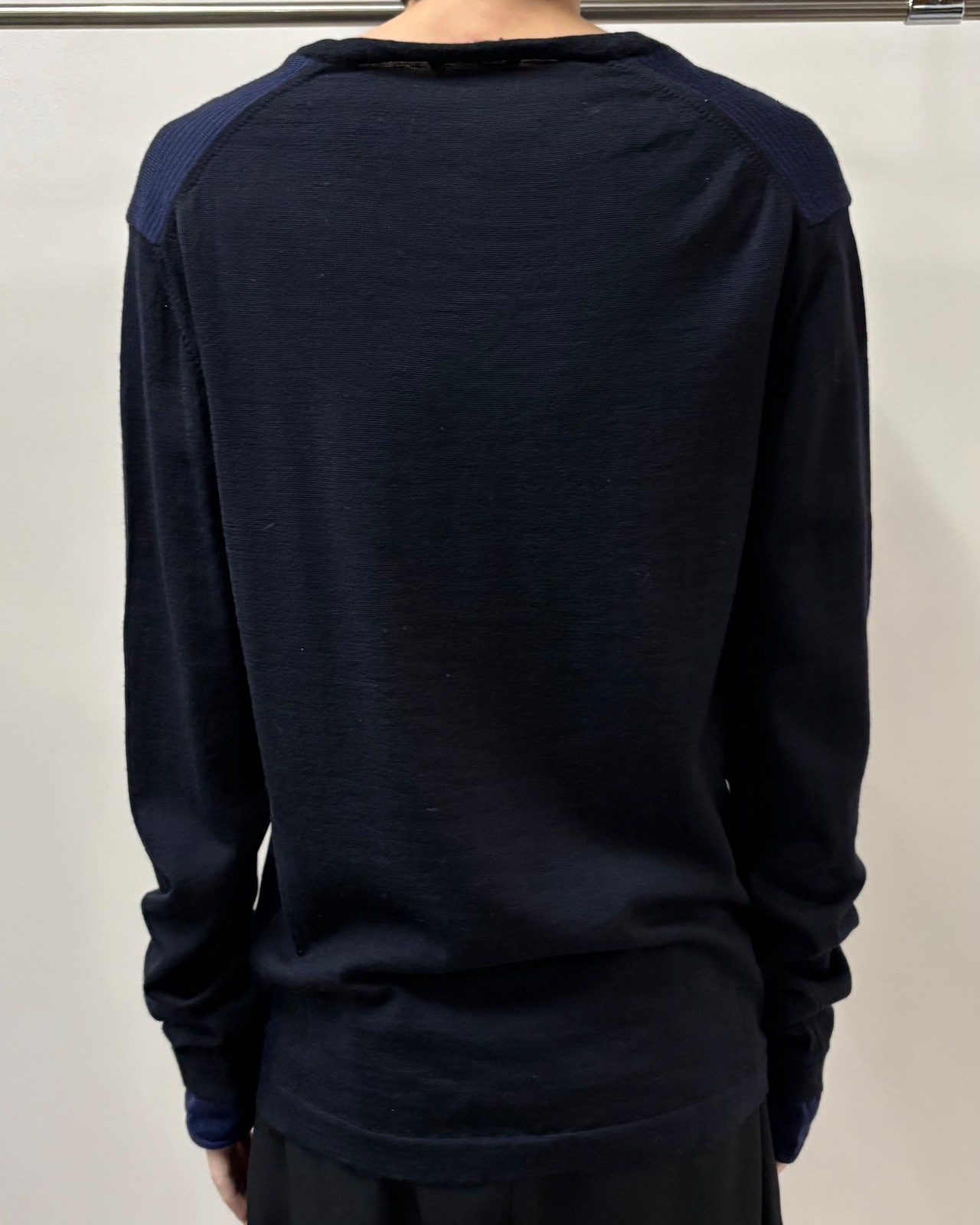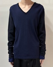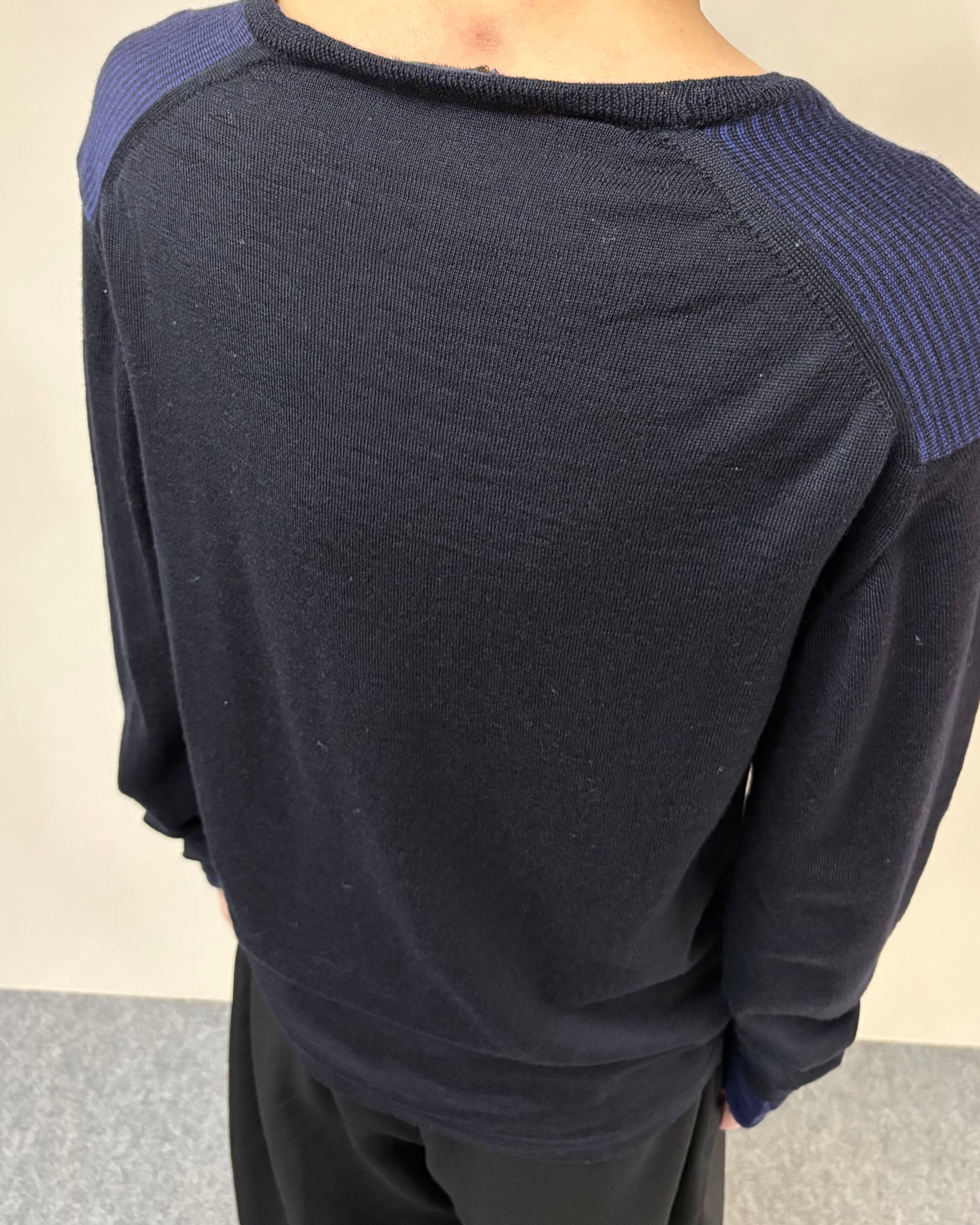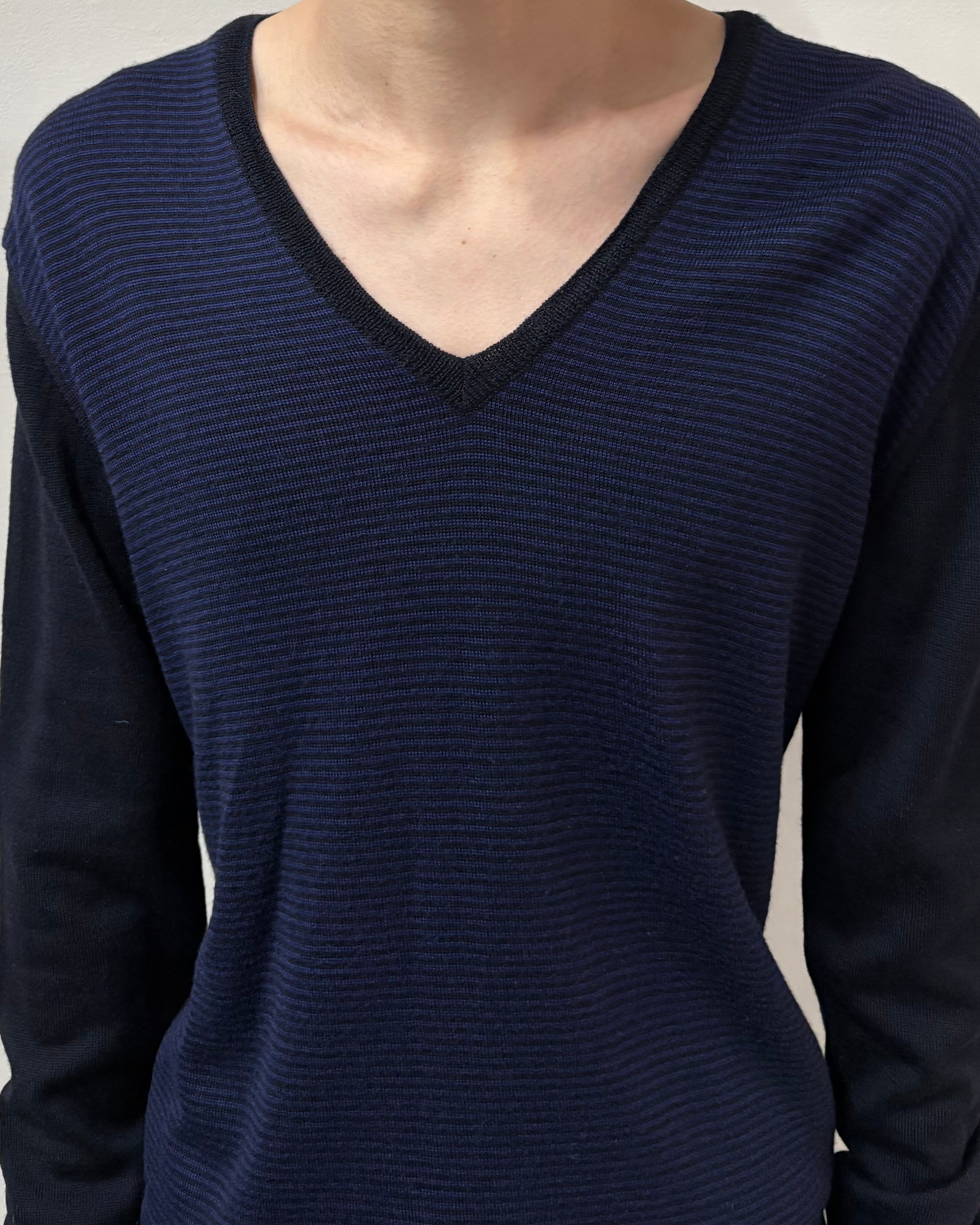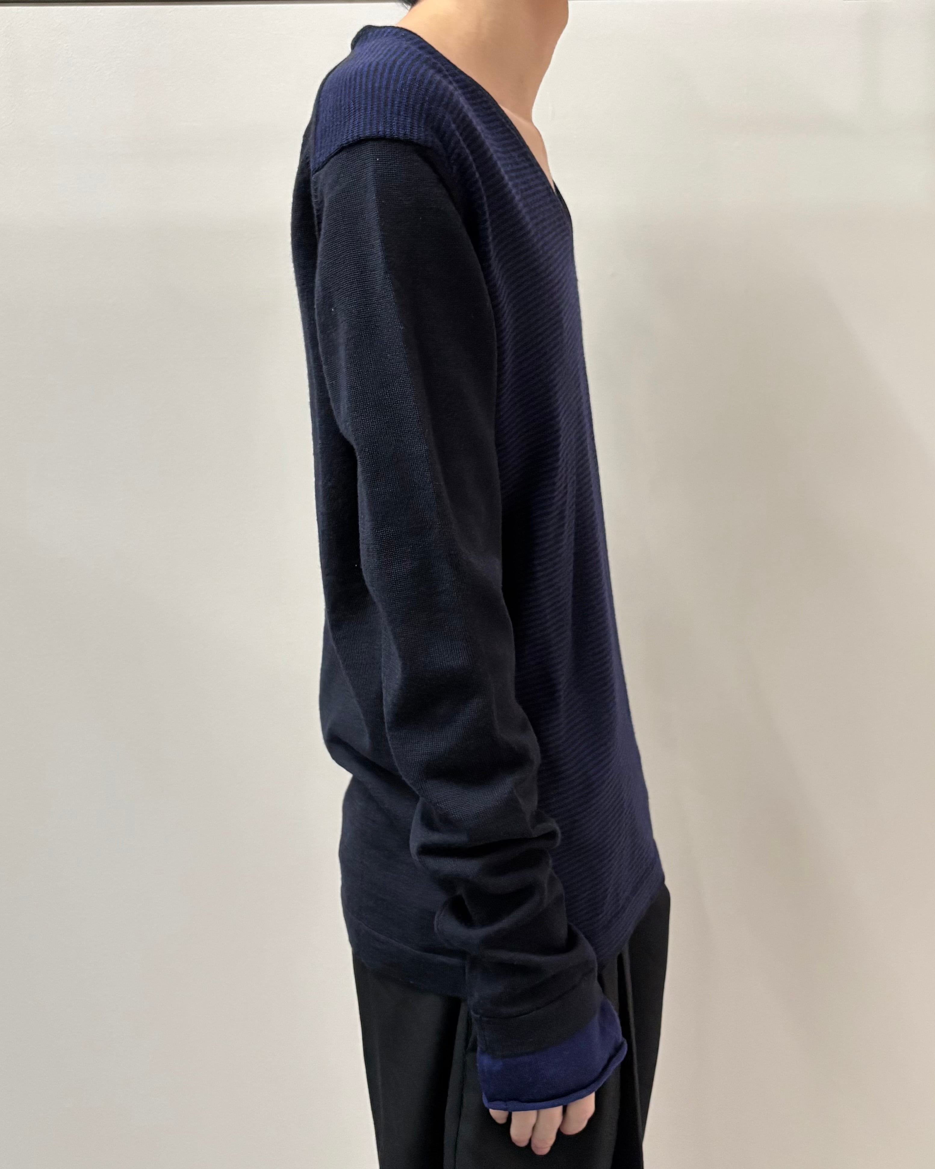 フロントのダーク配色のボーダーデザインが特徴的。深みのある色味をしているので、1枚でも様に着用でき、モードなスタイルにも活躍できる1着。