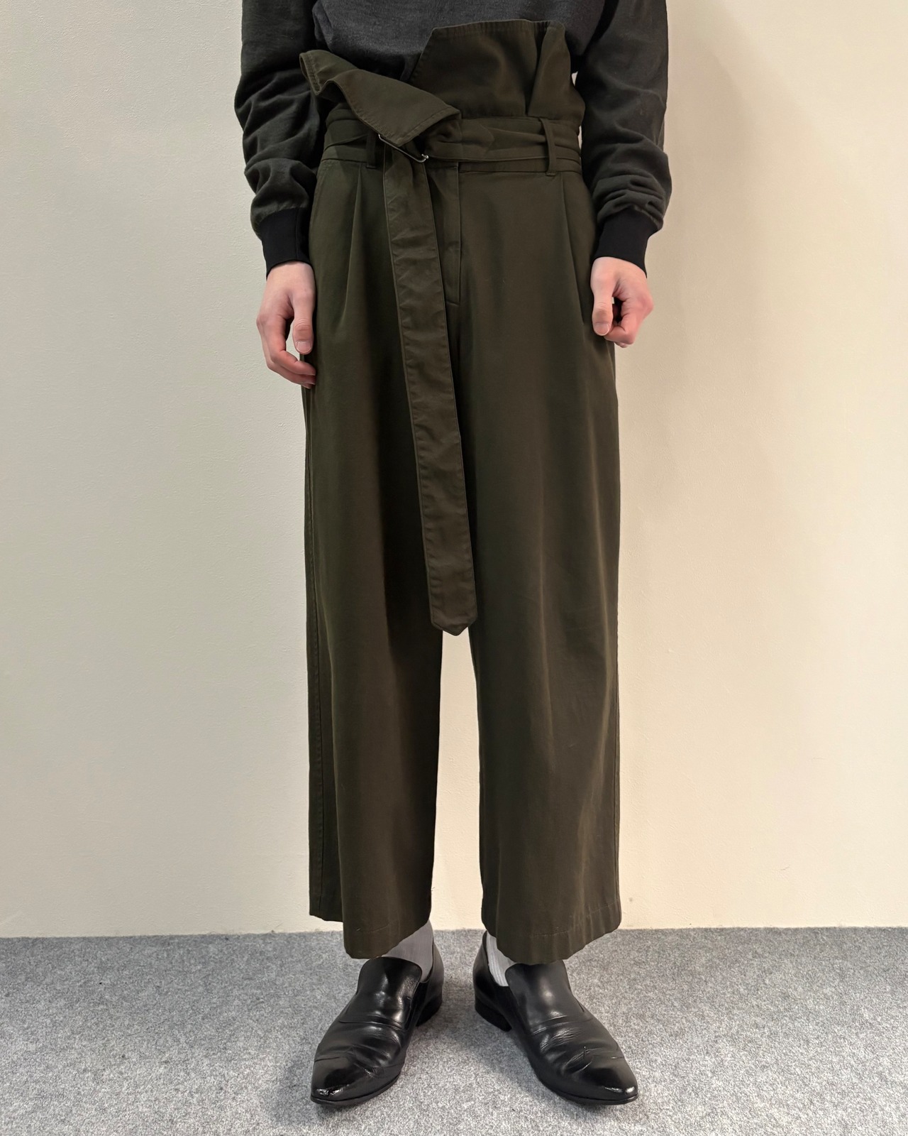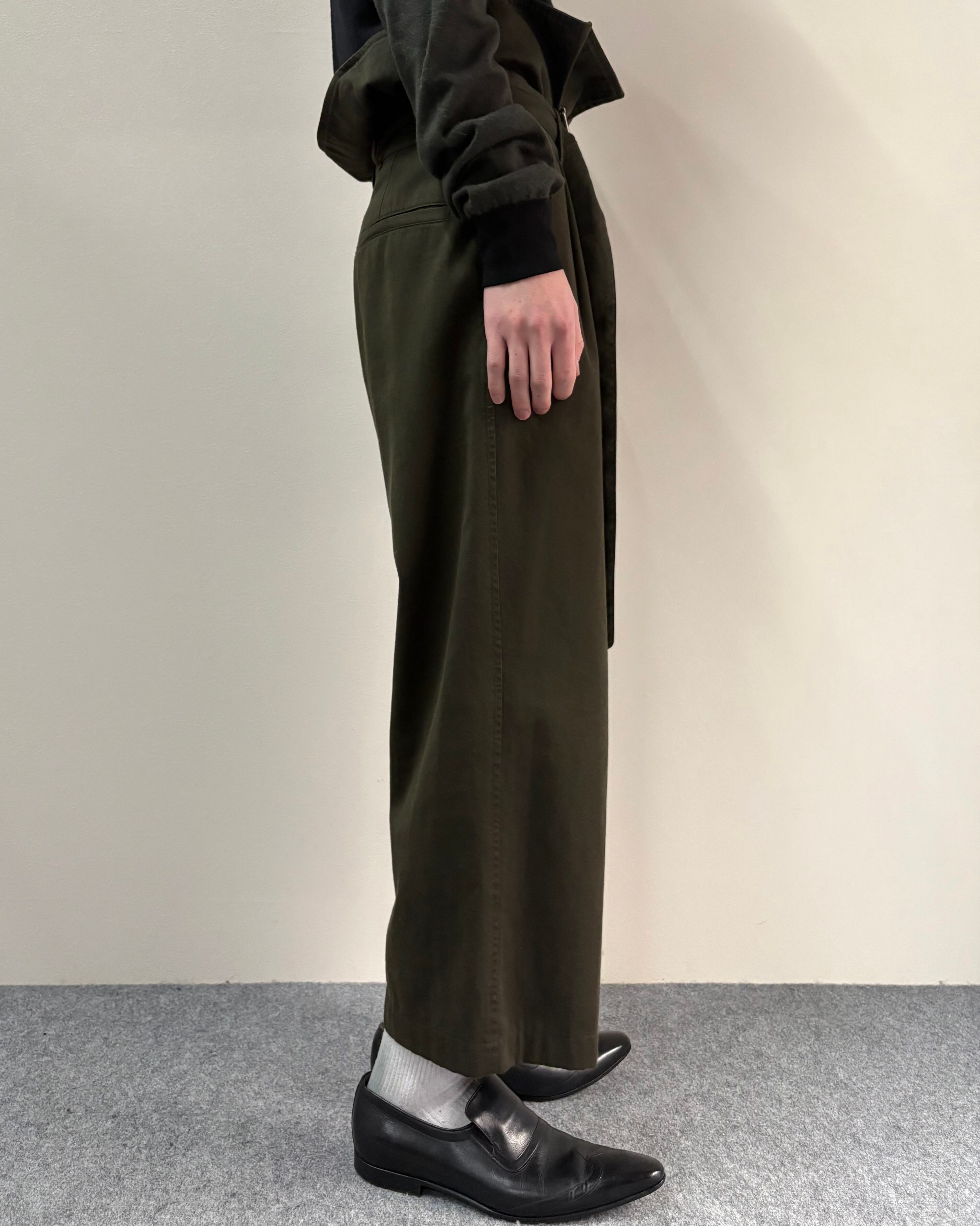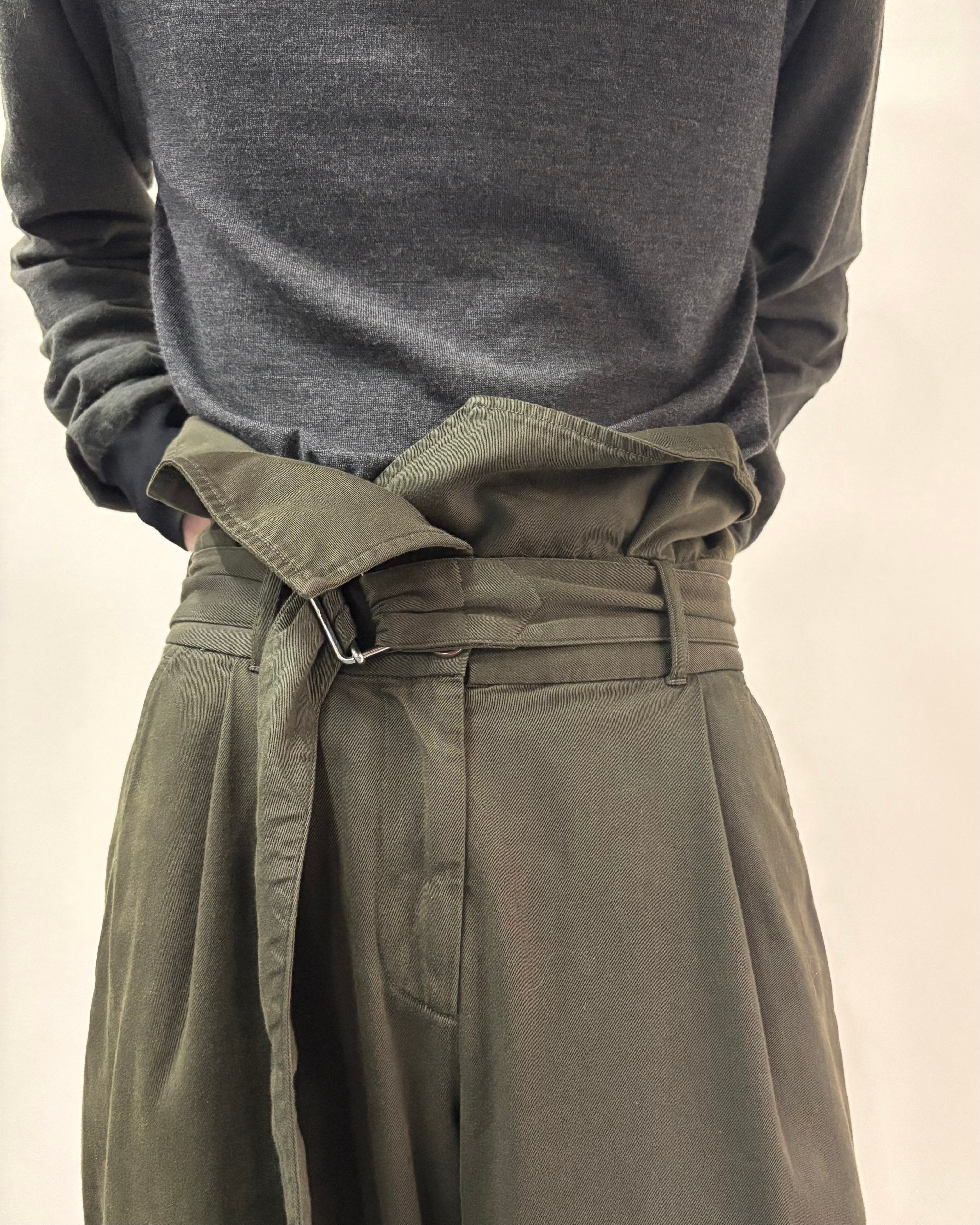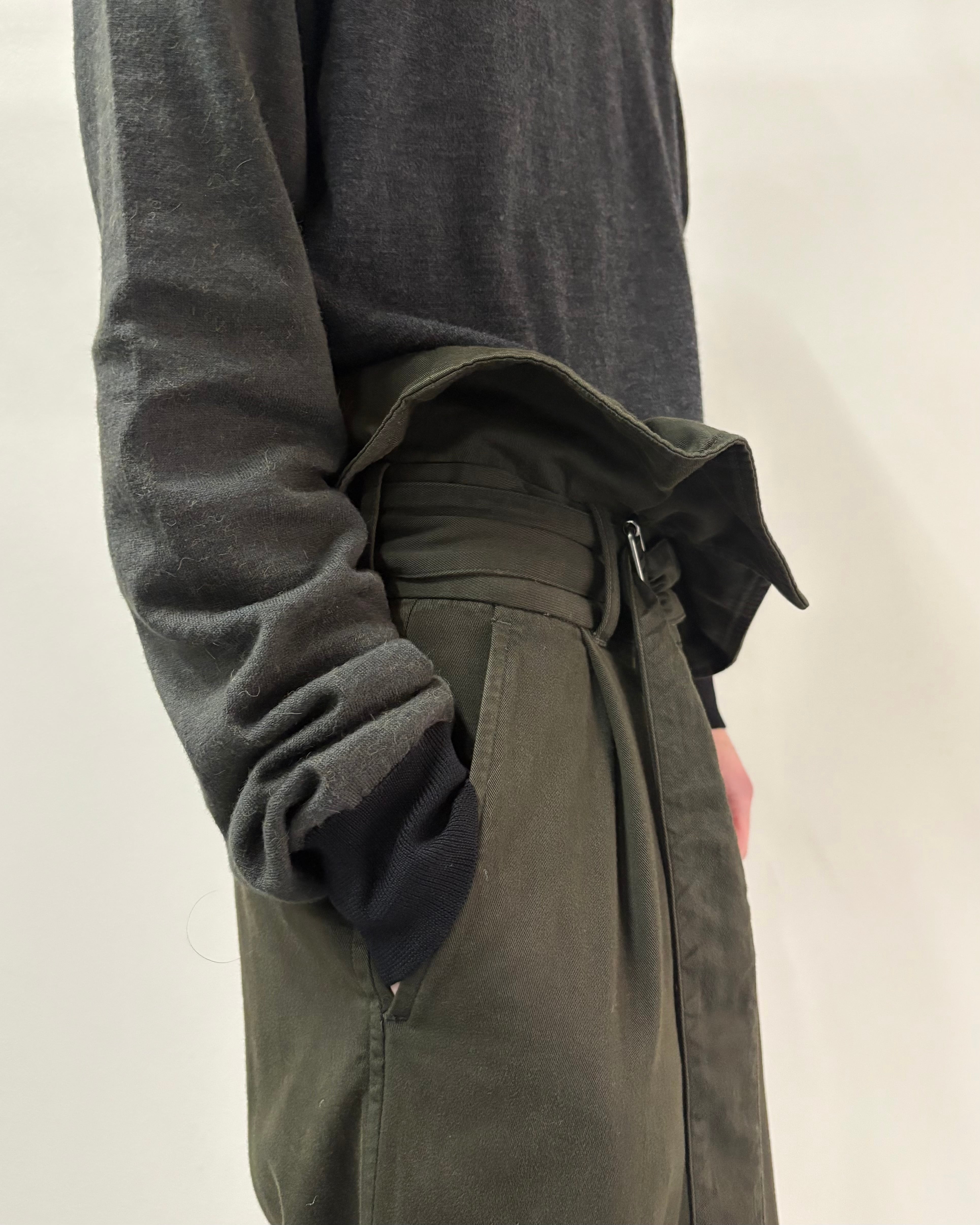 深みのあるカーキ色、絶妙な丈感、ベルデットデザインによりシックな印象を引き出しつつ無骨なミリタリーな雰囲気をも作り出せる唯一無二な1着。