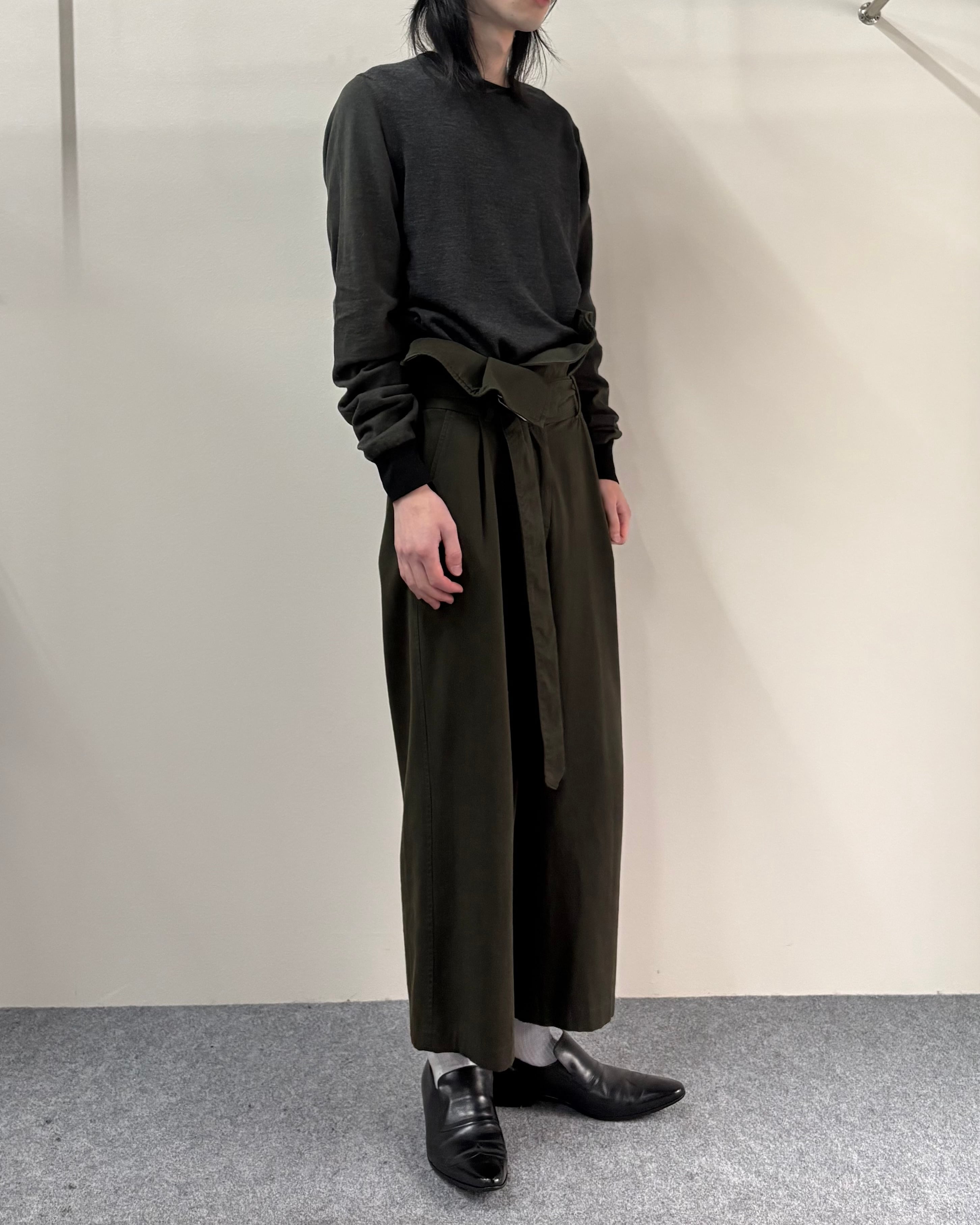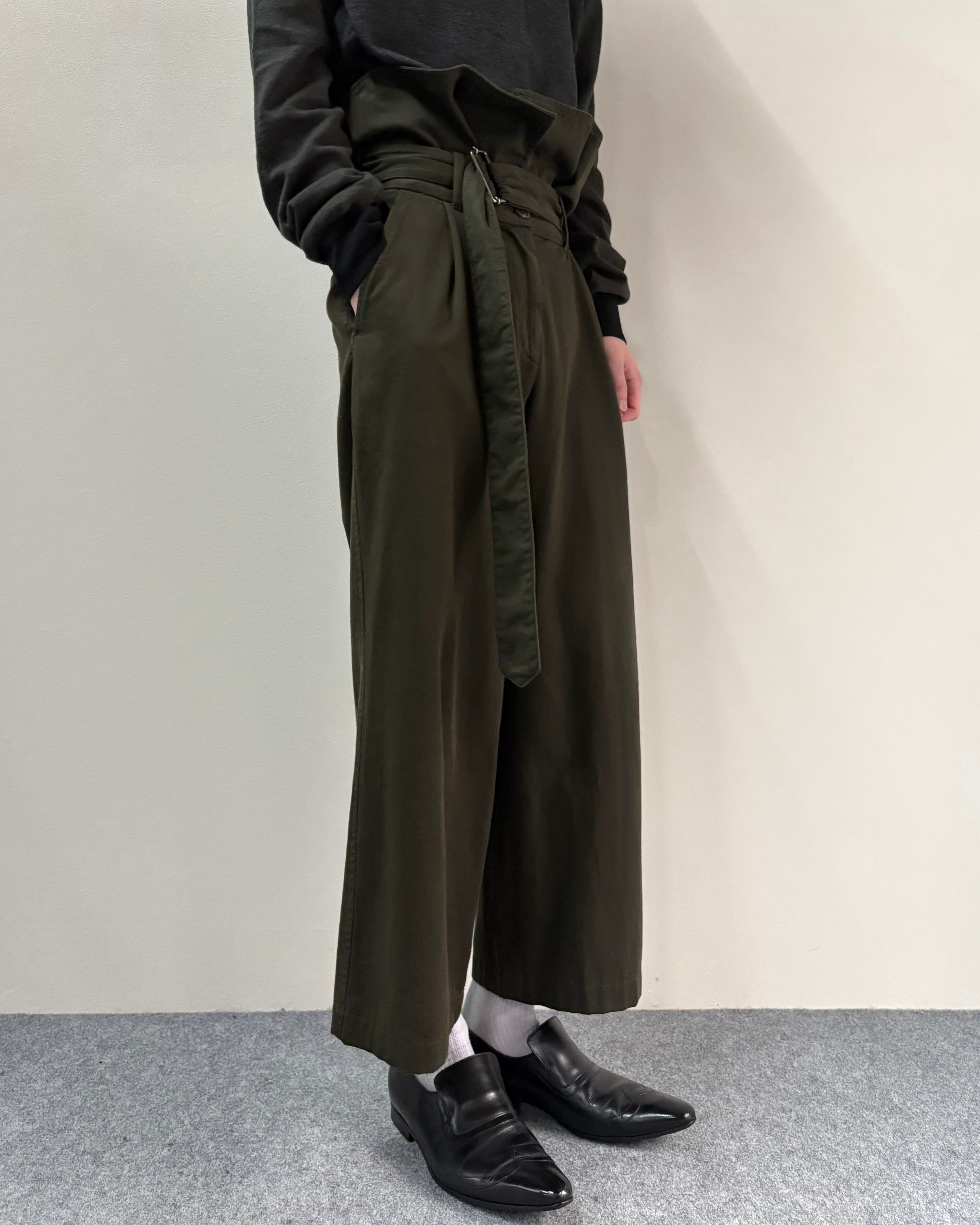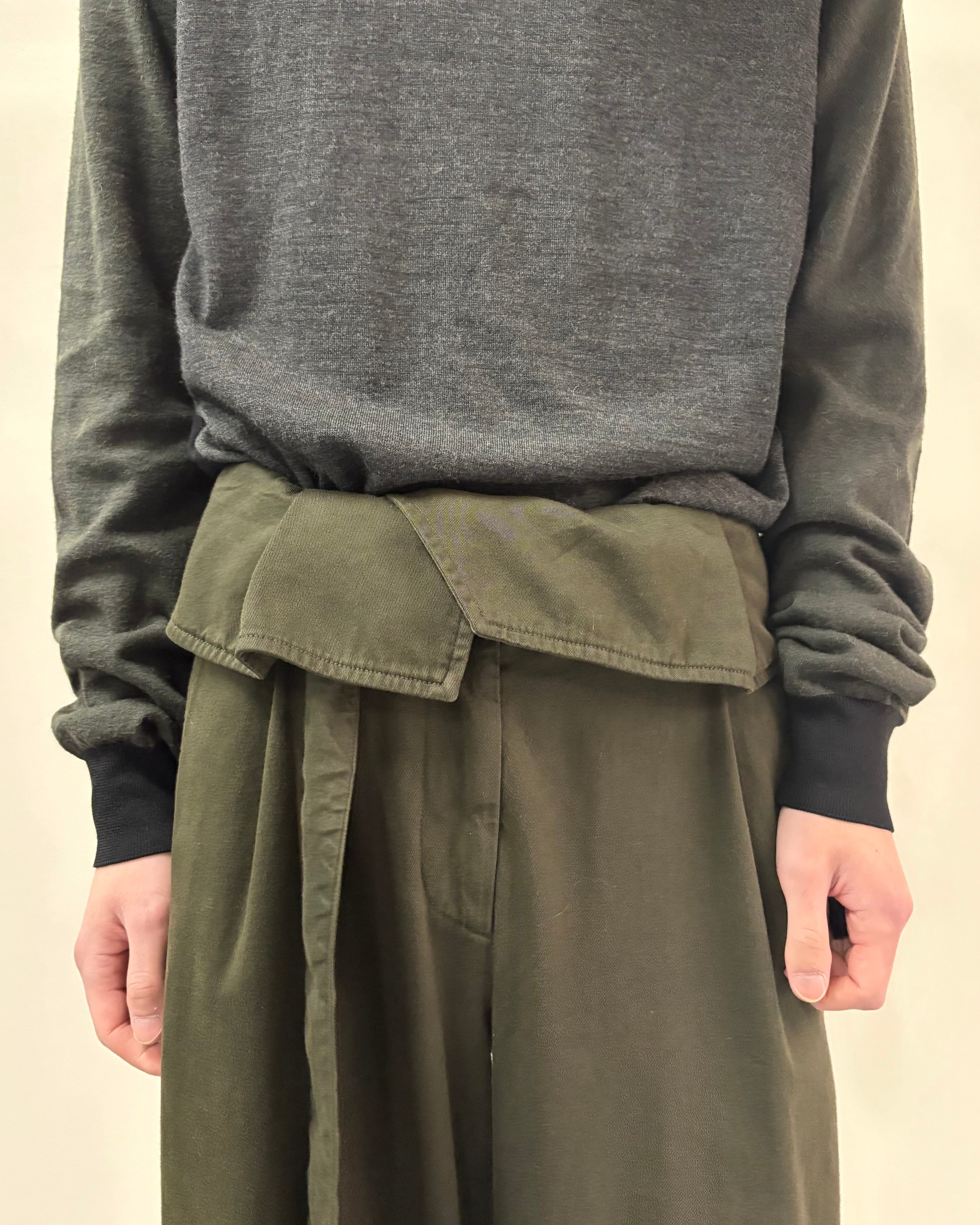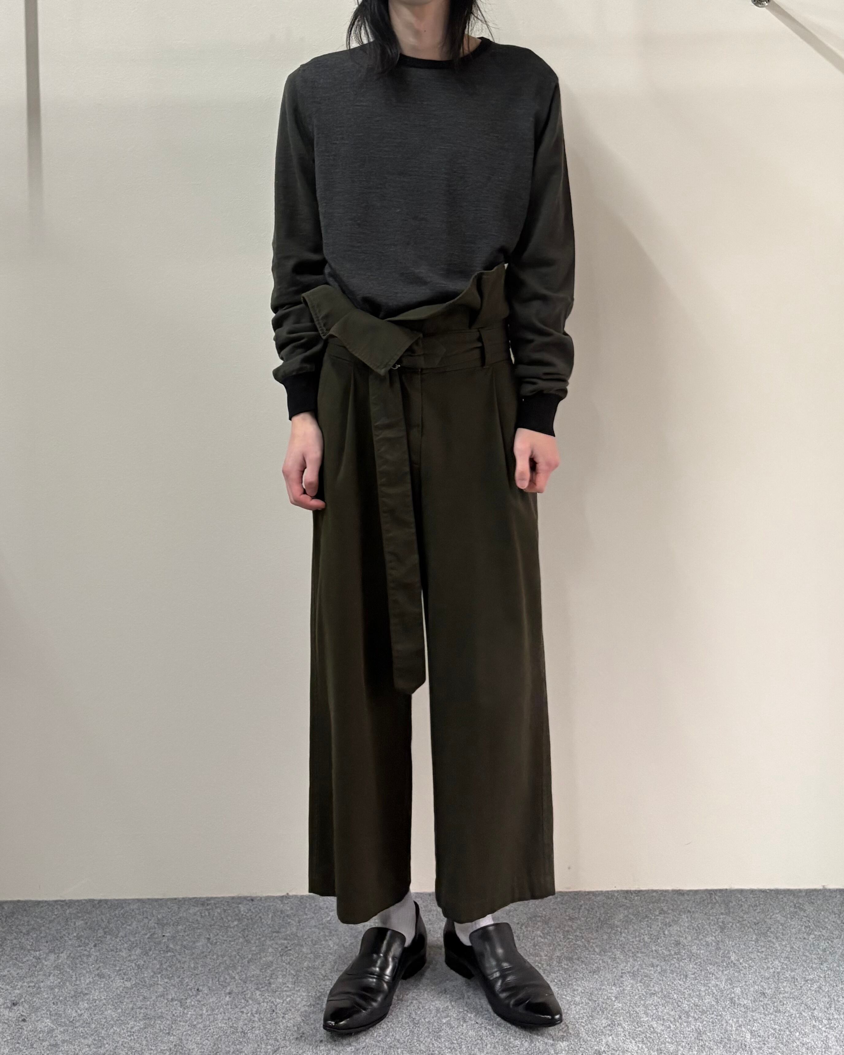 深みのあるカーキ色、絶妙な丈感、ベルデットデザインによりシックな印象を引き出しつつ無骨なミリタリーな雰囲気をも作り出せる唯一無二な1着。