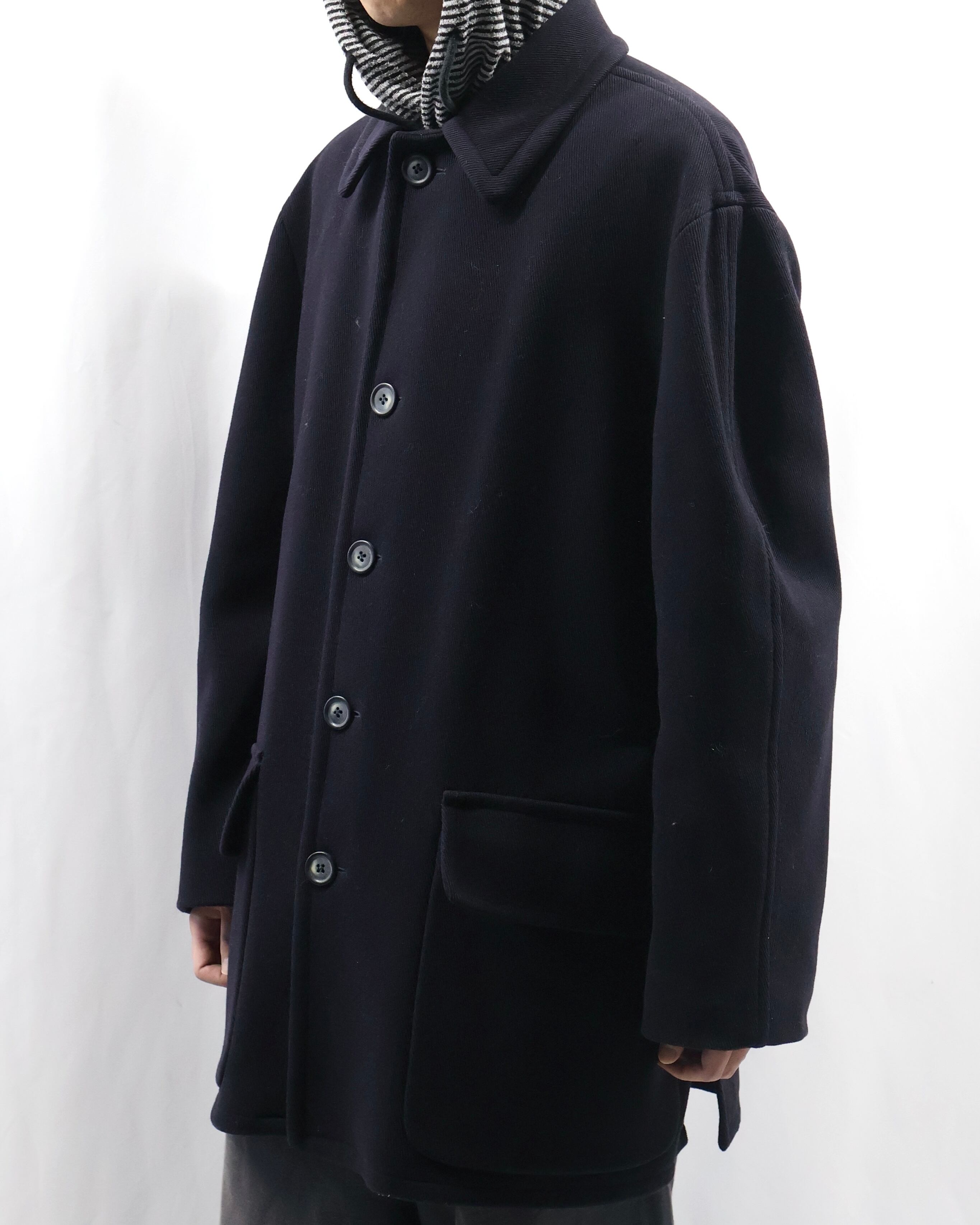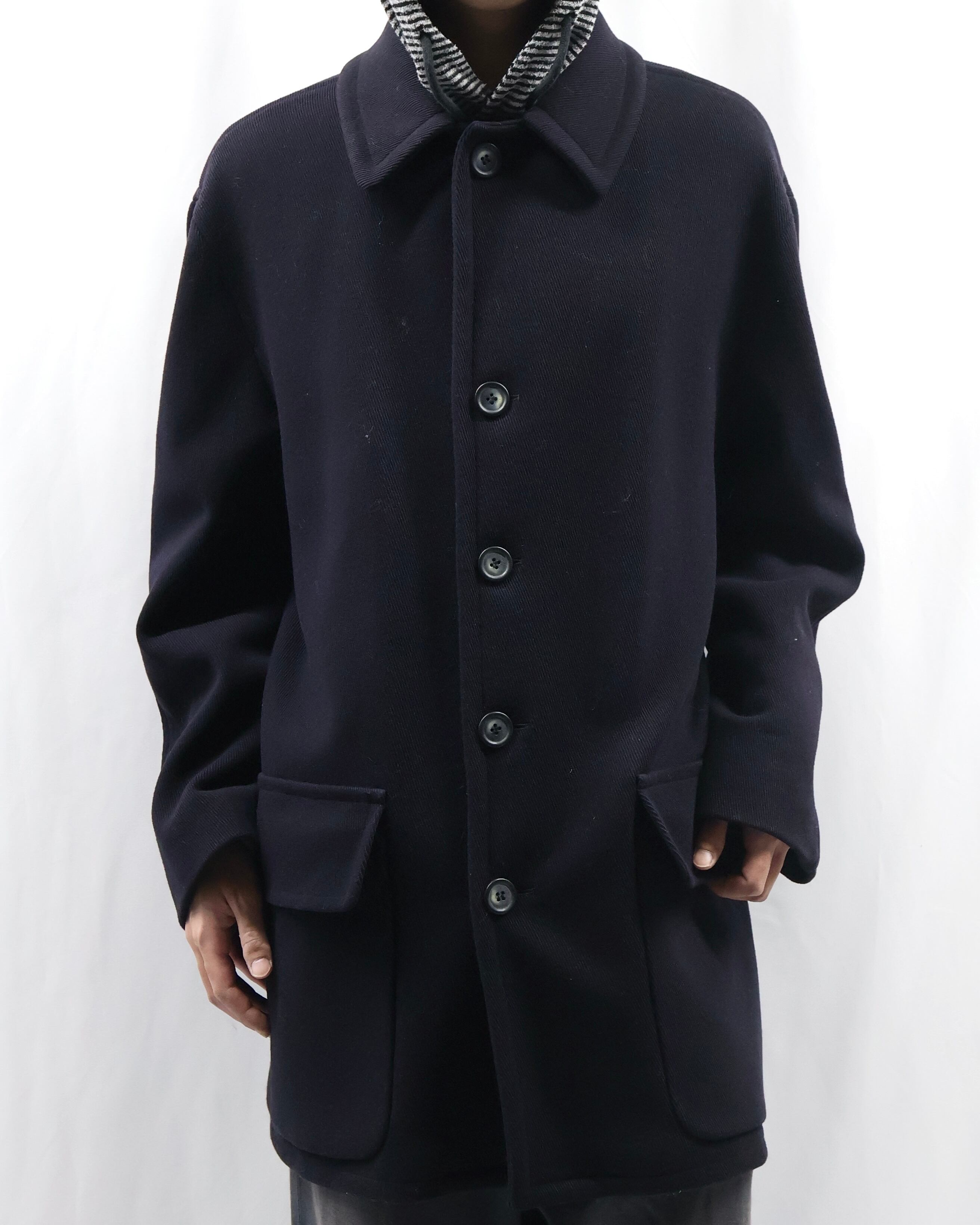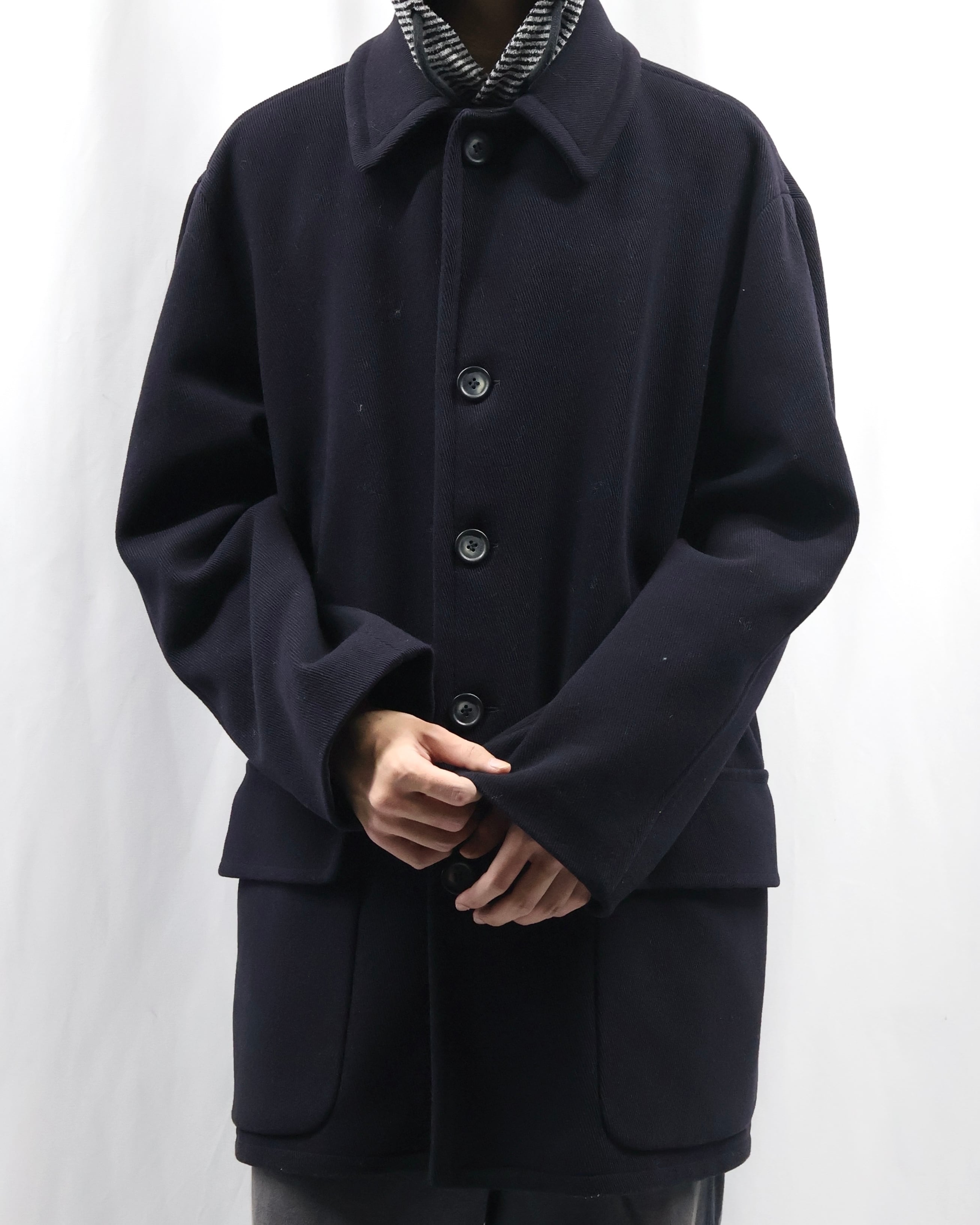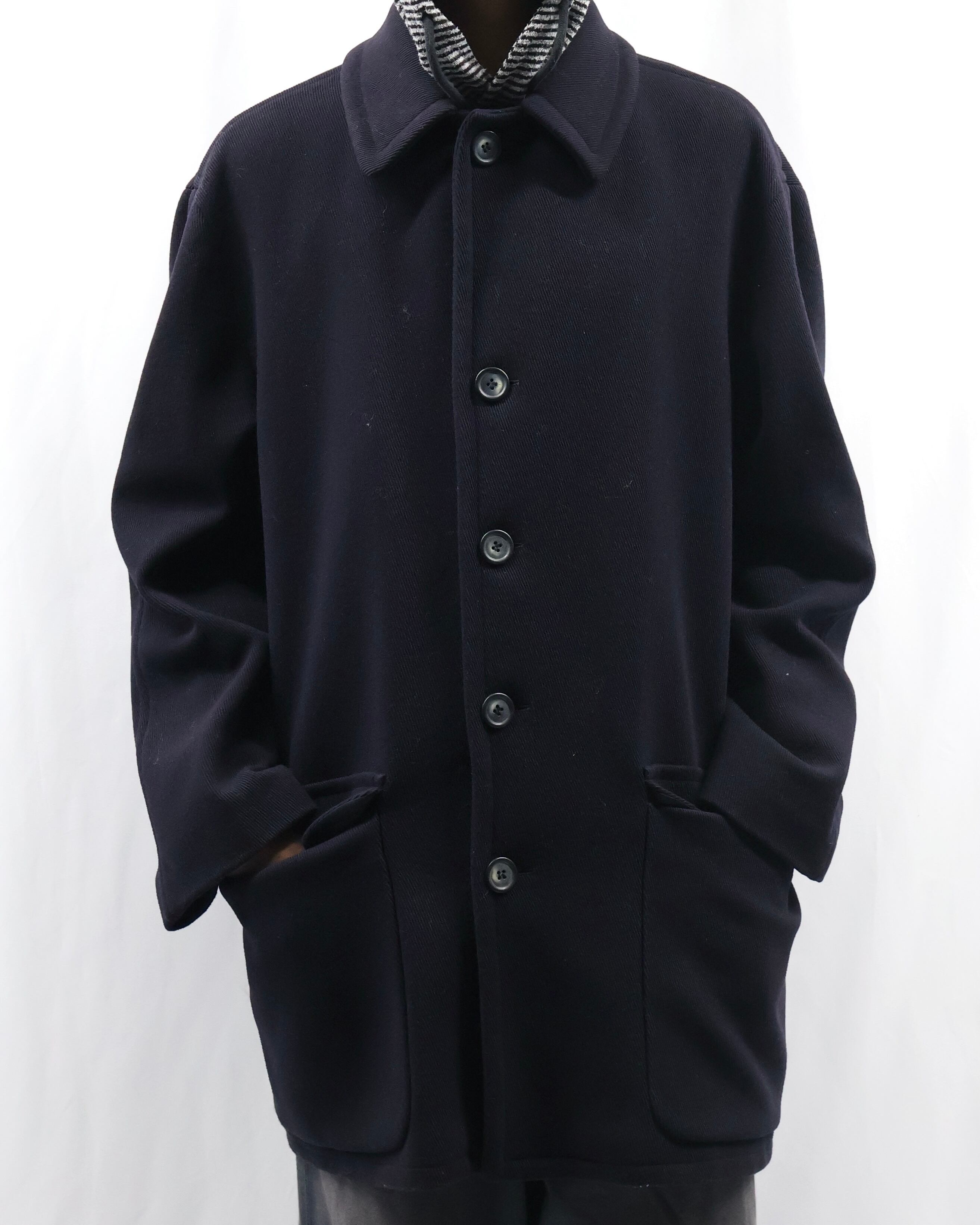 落ち着いたネイビーの色味と、ミニマルなデザインが特徴のウールハーフコート。程よくゆとりのあるシルエットでインナーを選ばず着用可能。