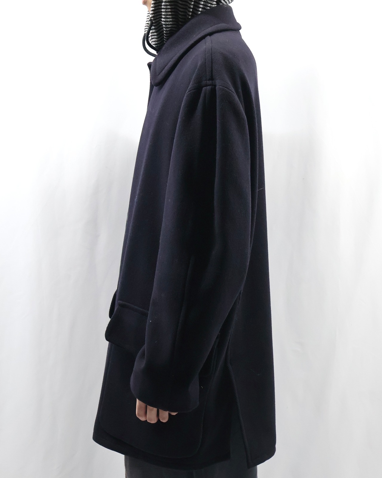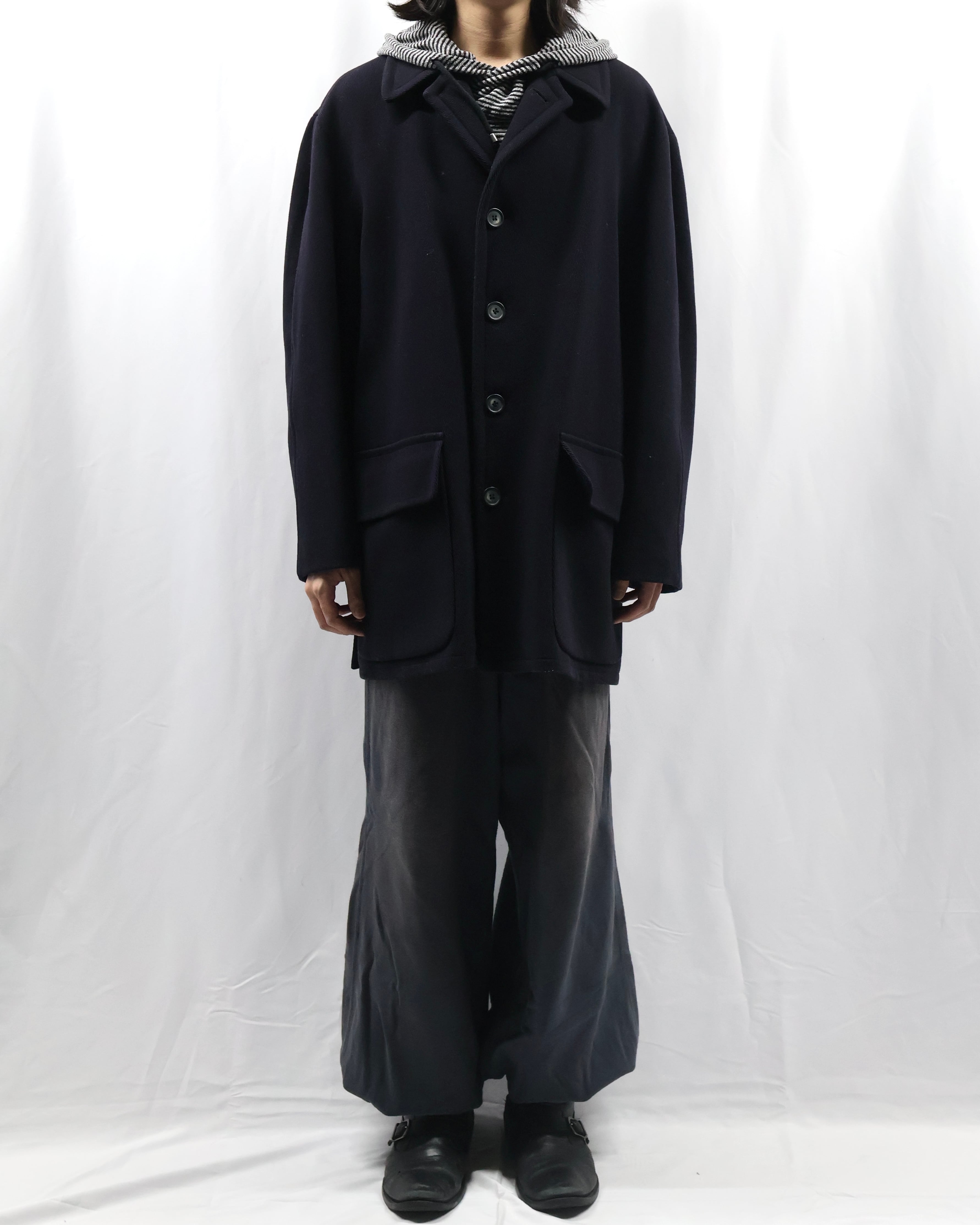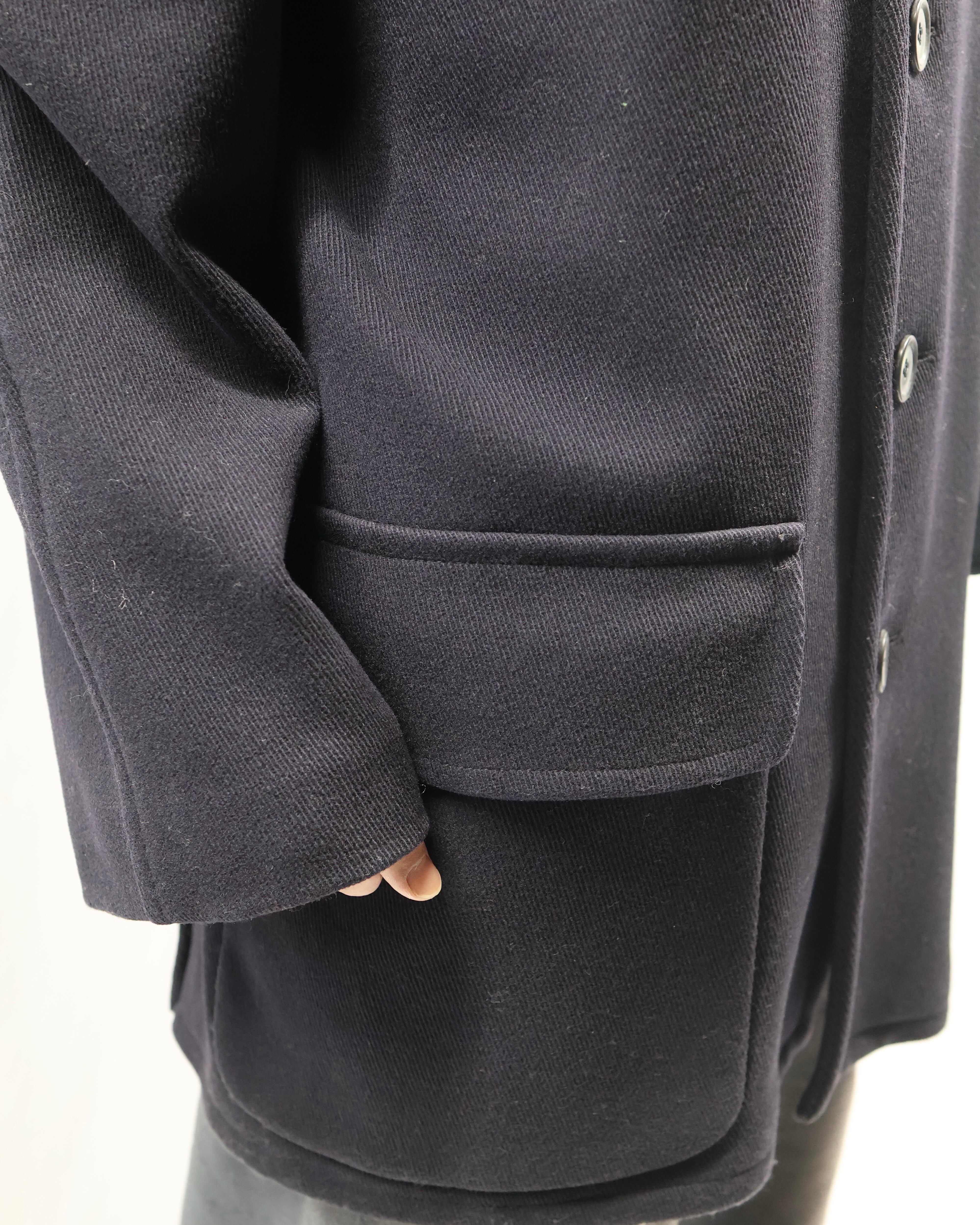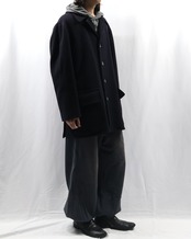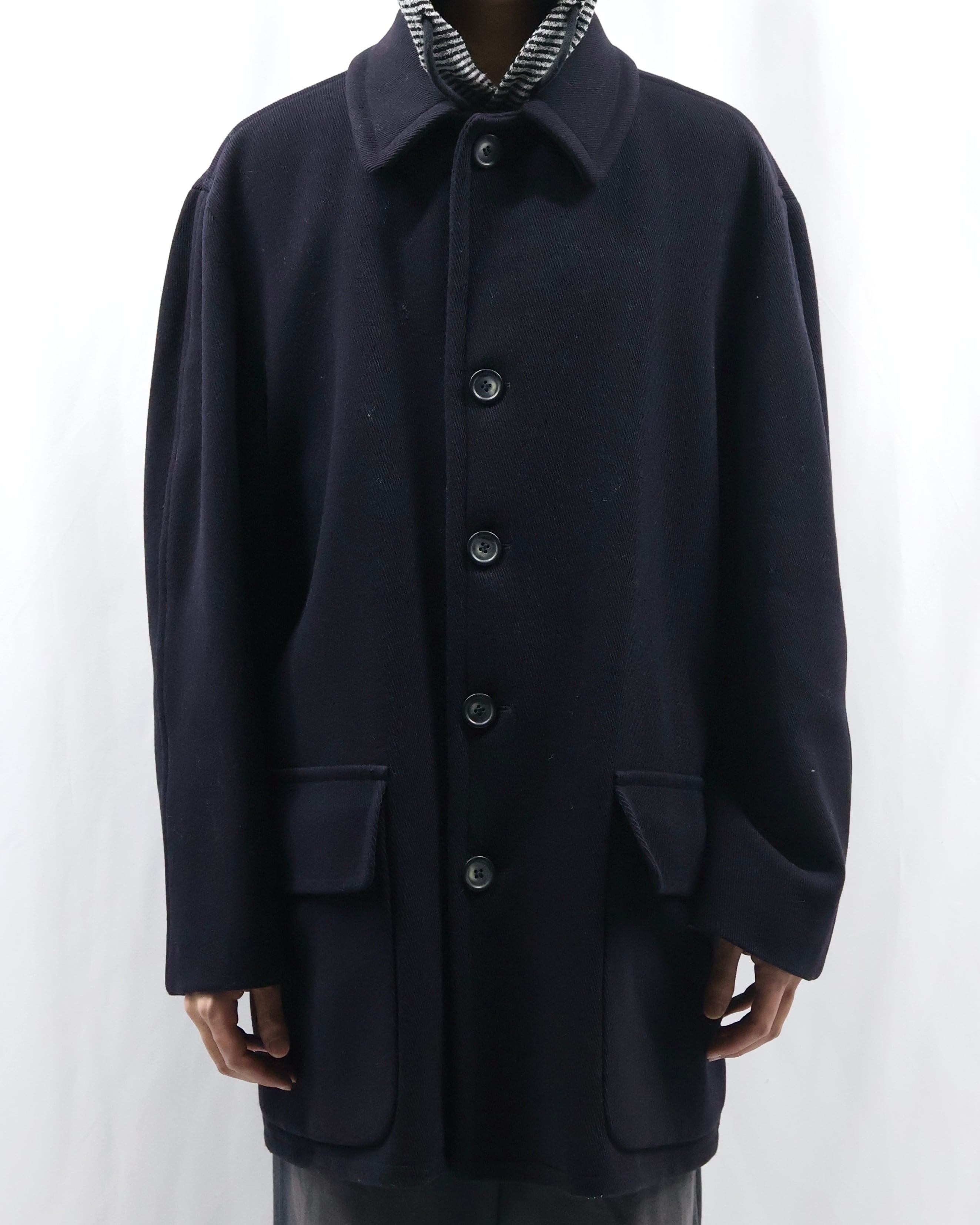 落ち着いたネイビーの色味と、ミニマルなデザインが特徴のウールハーフコート。程よくゆとりのあるシルエットでインナーを選ばず着用可能。