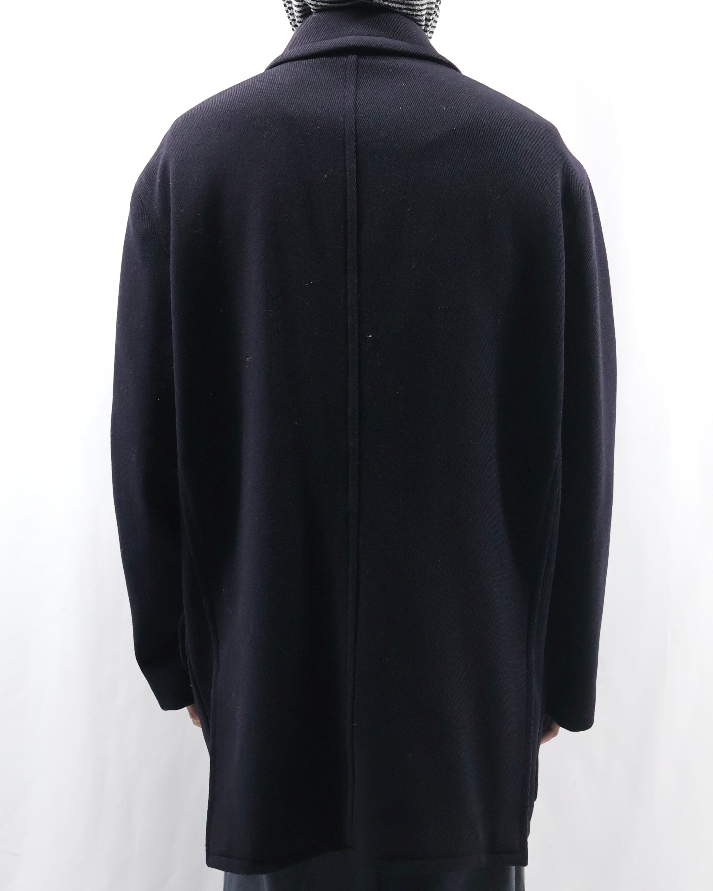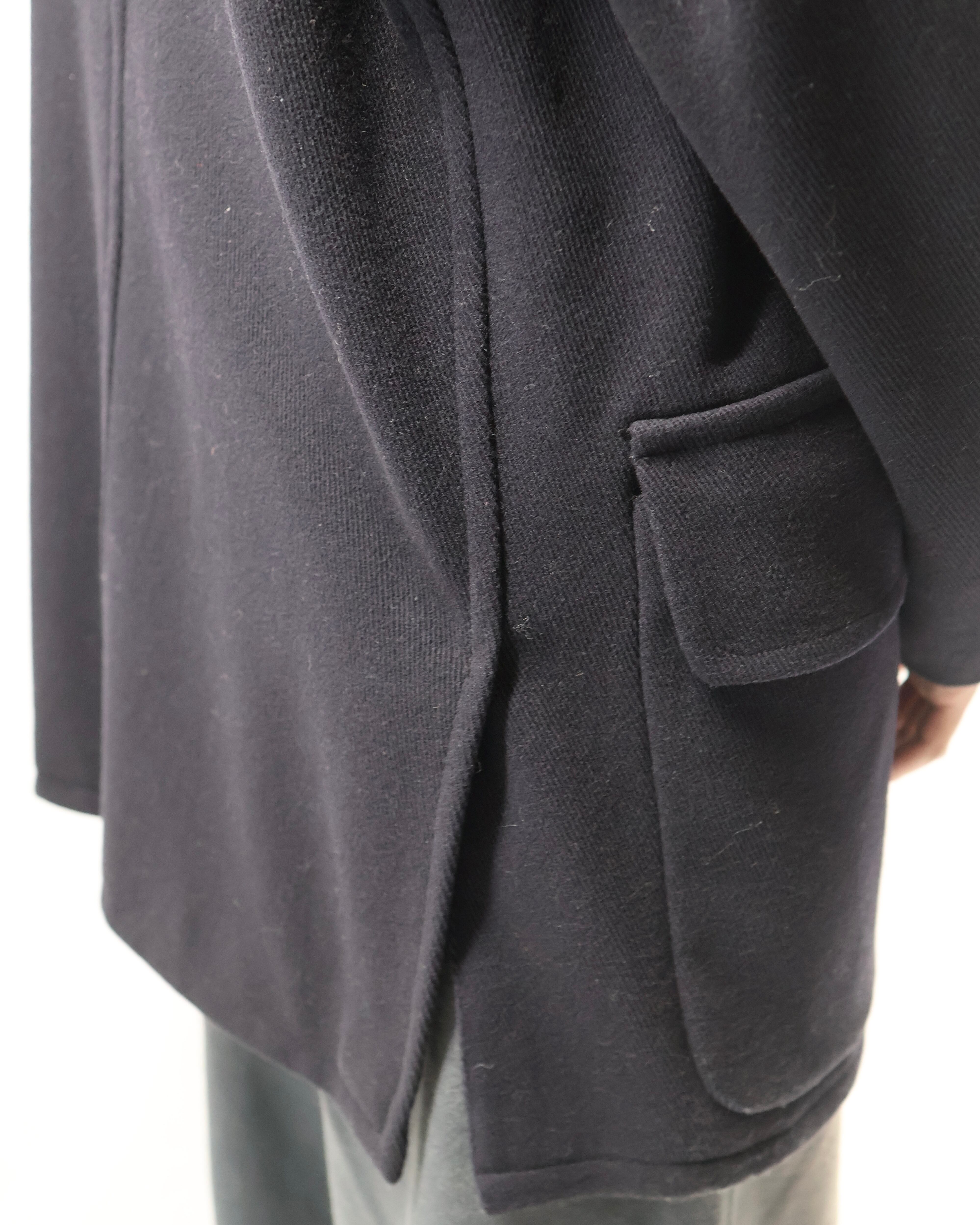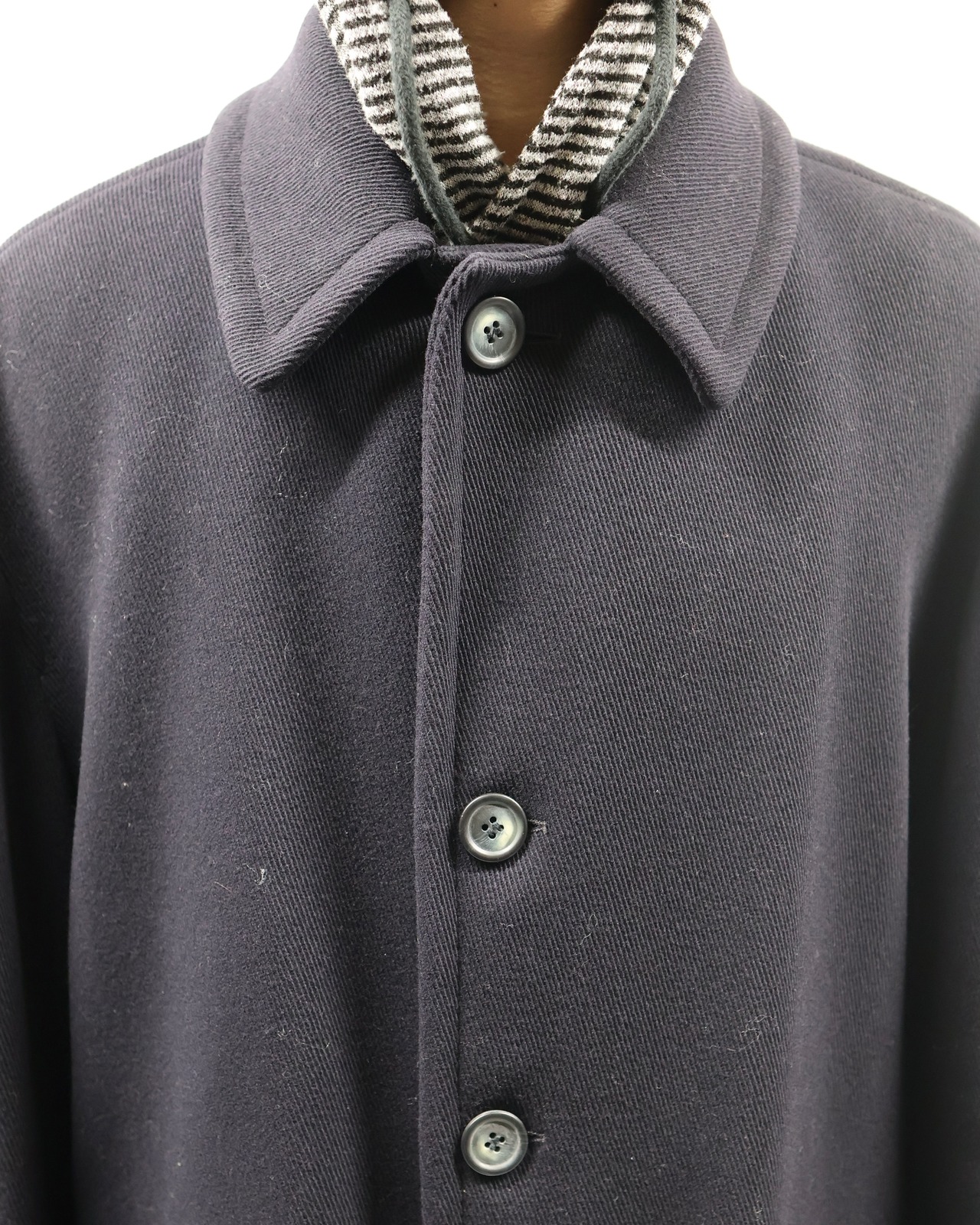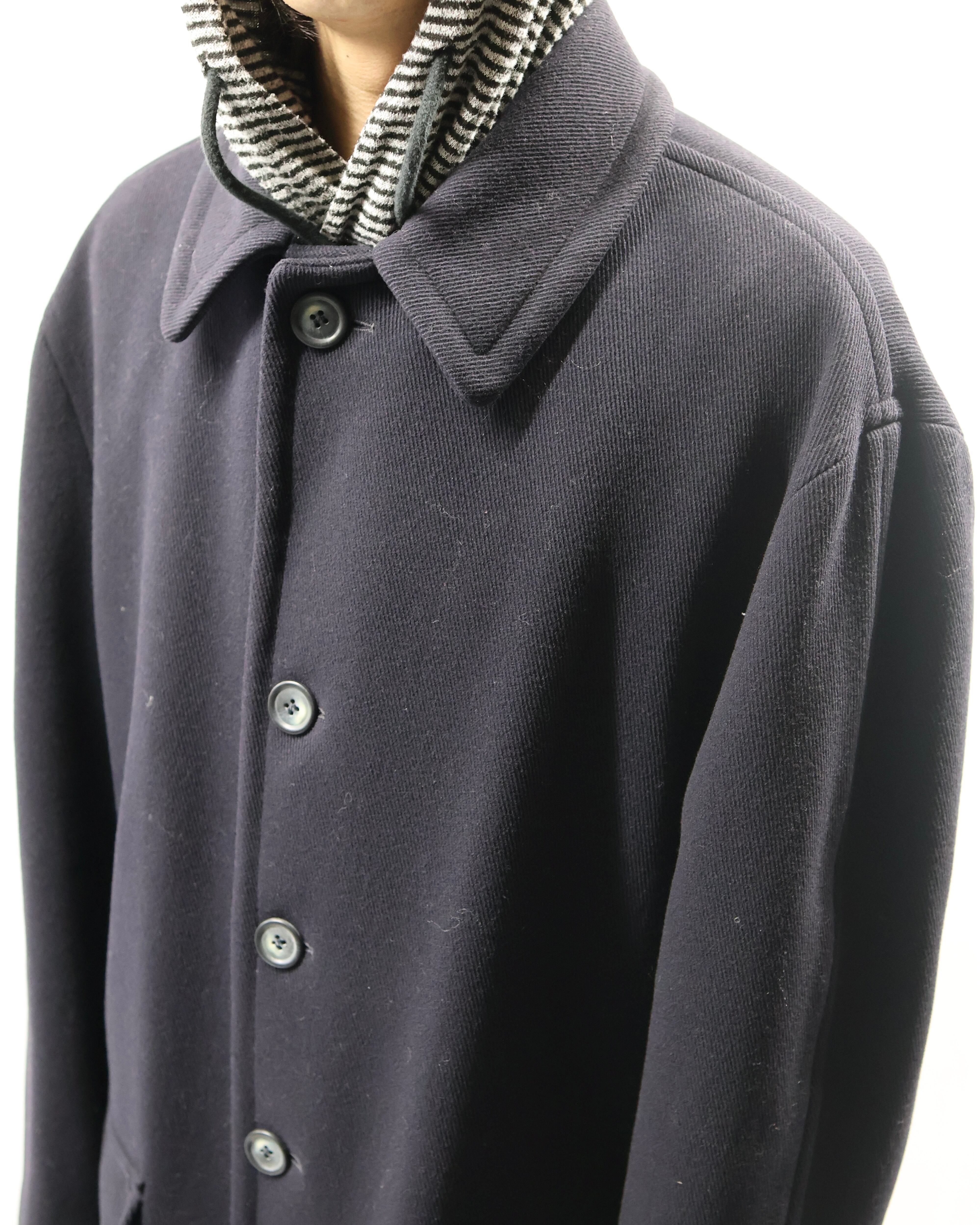 落ち着いたネイビーの色味と、ミニマルなデザインが特徴のウールハーフコート。程よくゆとりのあるシルエットでインナーを選ばず着用可能。
